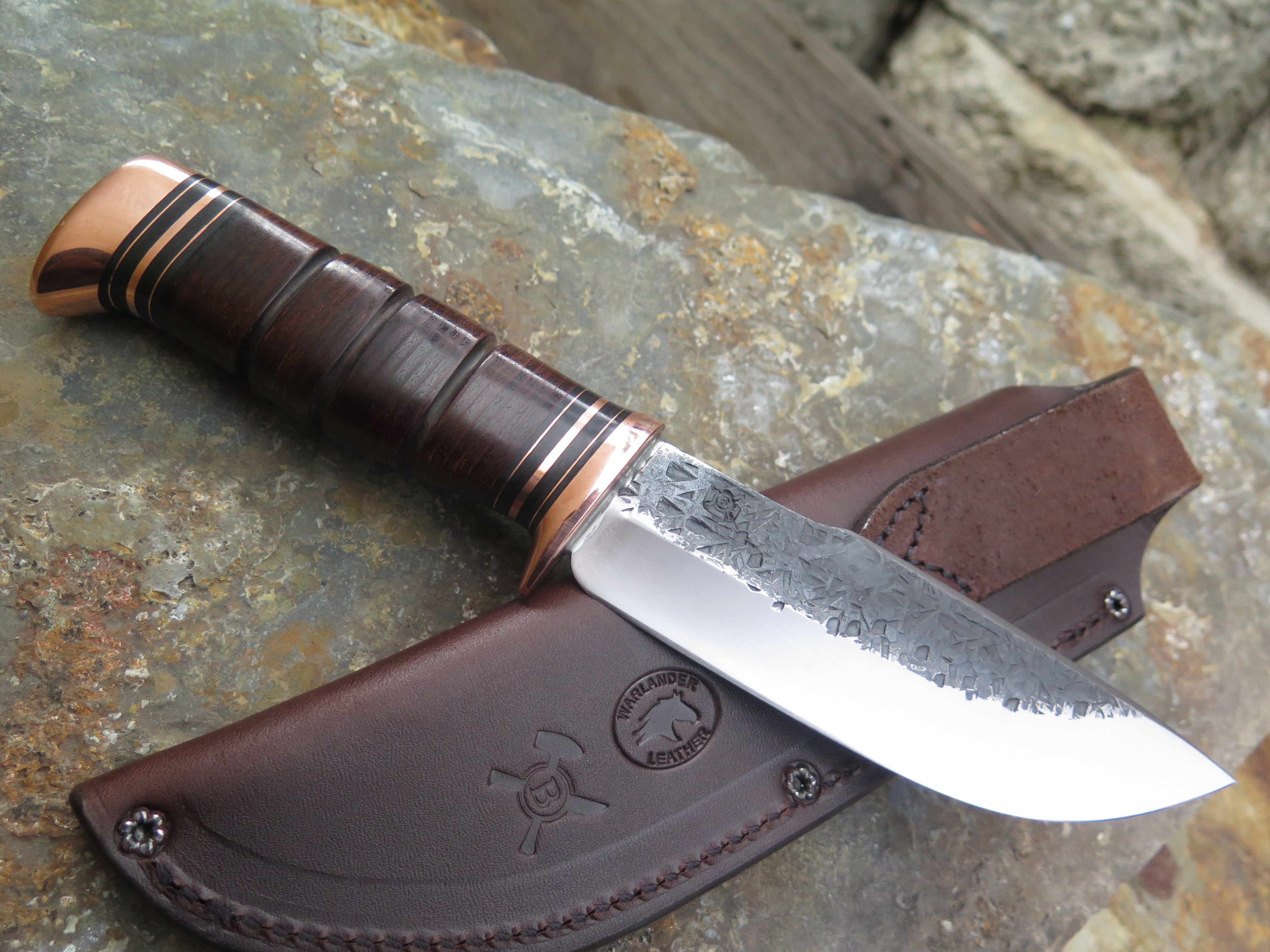 This drop point blade is hand forged from 3/16" thick high carbon 01 tool steel and it measures 5 1/2" from tip to guard with a razor sharp hollow grind and our hammermark finish. The copper guard is soldered in place above black fiber and copper spacers as well as a scalloped stack of horsehide leather and a copper butt that's also pinned through the tang with copper. The overall length measures just over 10" and it comes in a classic leather belt pouch sheath. This knife is made to order. Current lead times are 6 - 8 weeks.