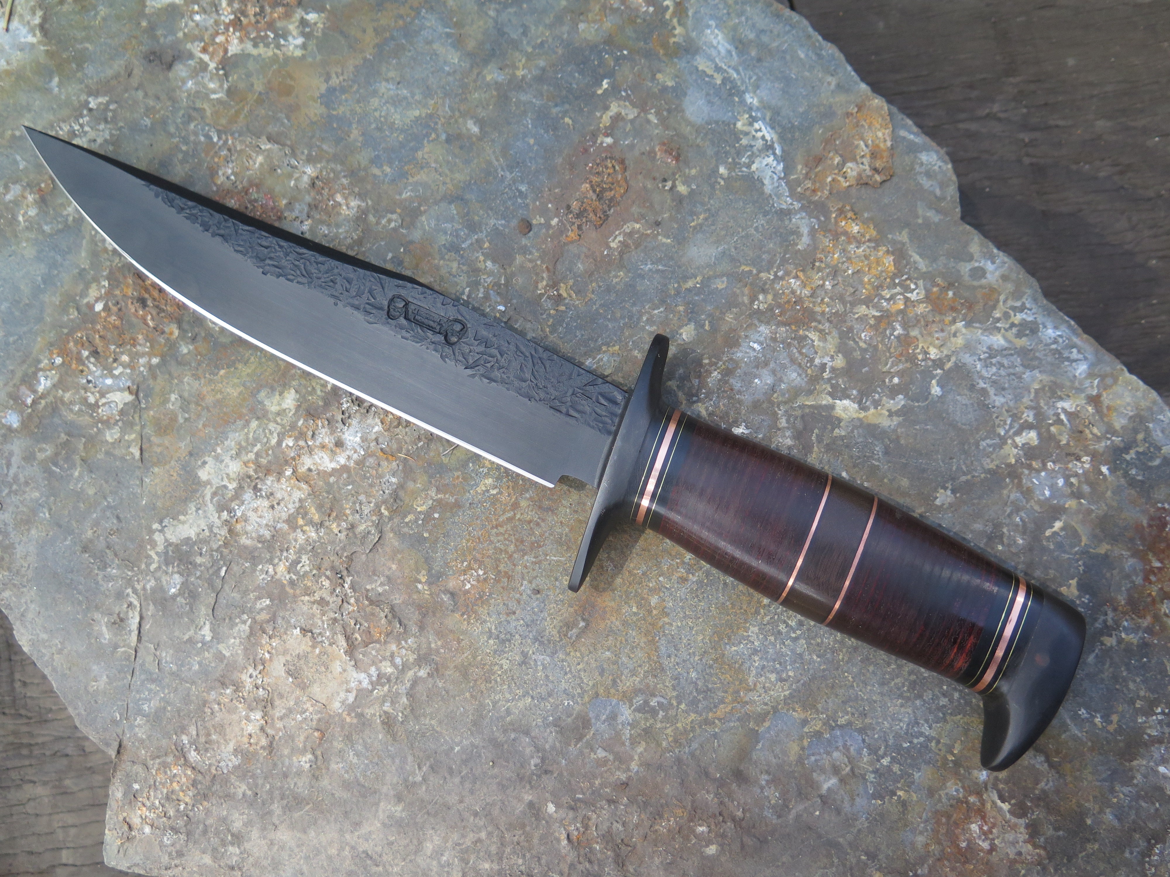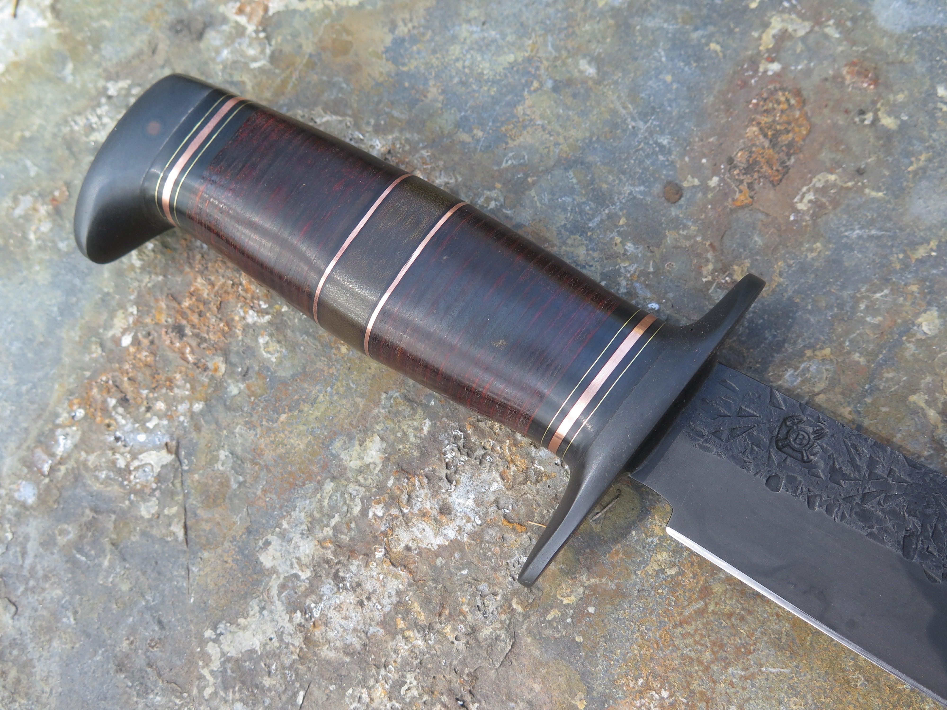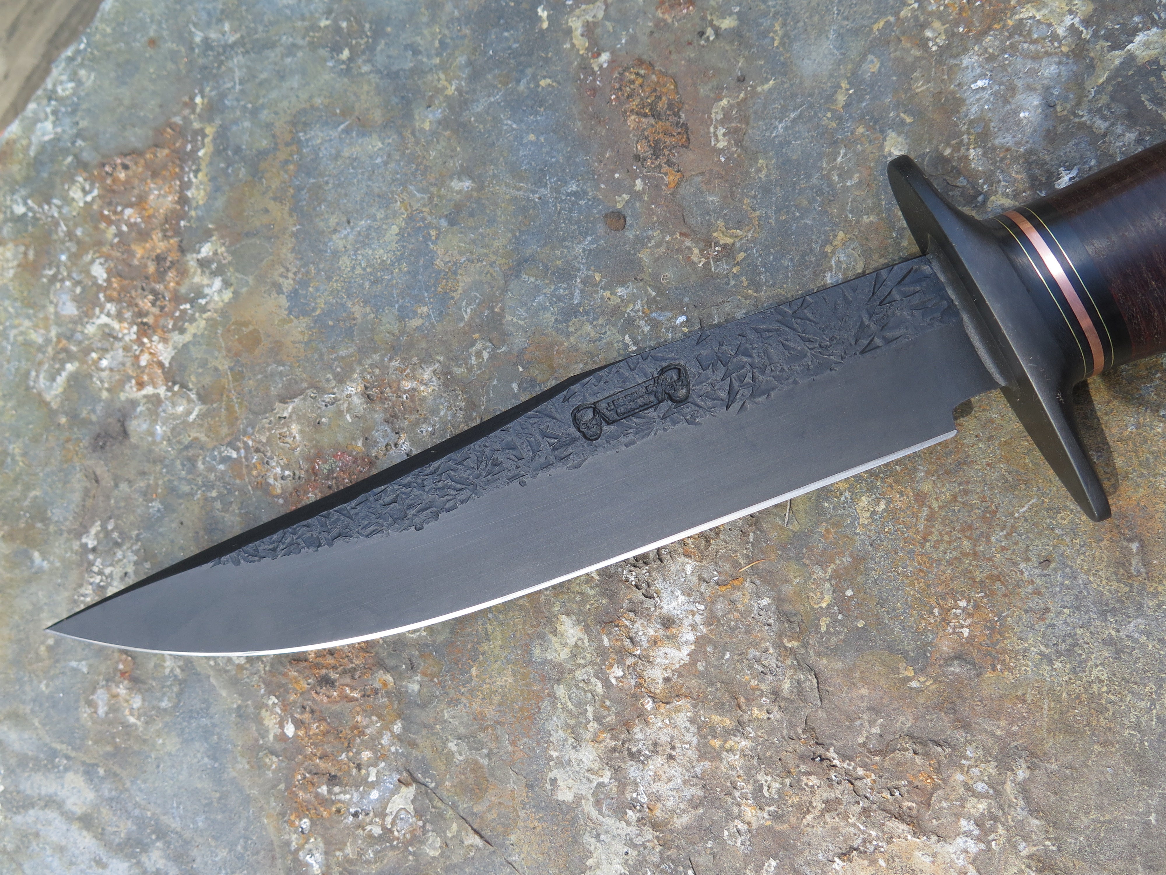 This beastly new Fighter from Behring Made© is hand forged from 3/16" thick 5160 spring steel and it measures 7 1/2" from tip to guard with a razor sharp hollow grind, hammermarks and our forced patina blued finish. The blued steel guard is soldered in place above black fiber, copper, green micarta spacers with a horsehide stack that's capped with blued steel and pinned through the tang with copper. The overall length measures 12 1/2" and it comes in a custom sheath from Warlander Leather.