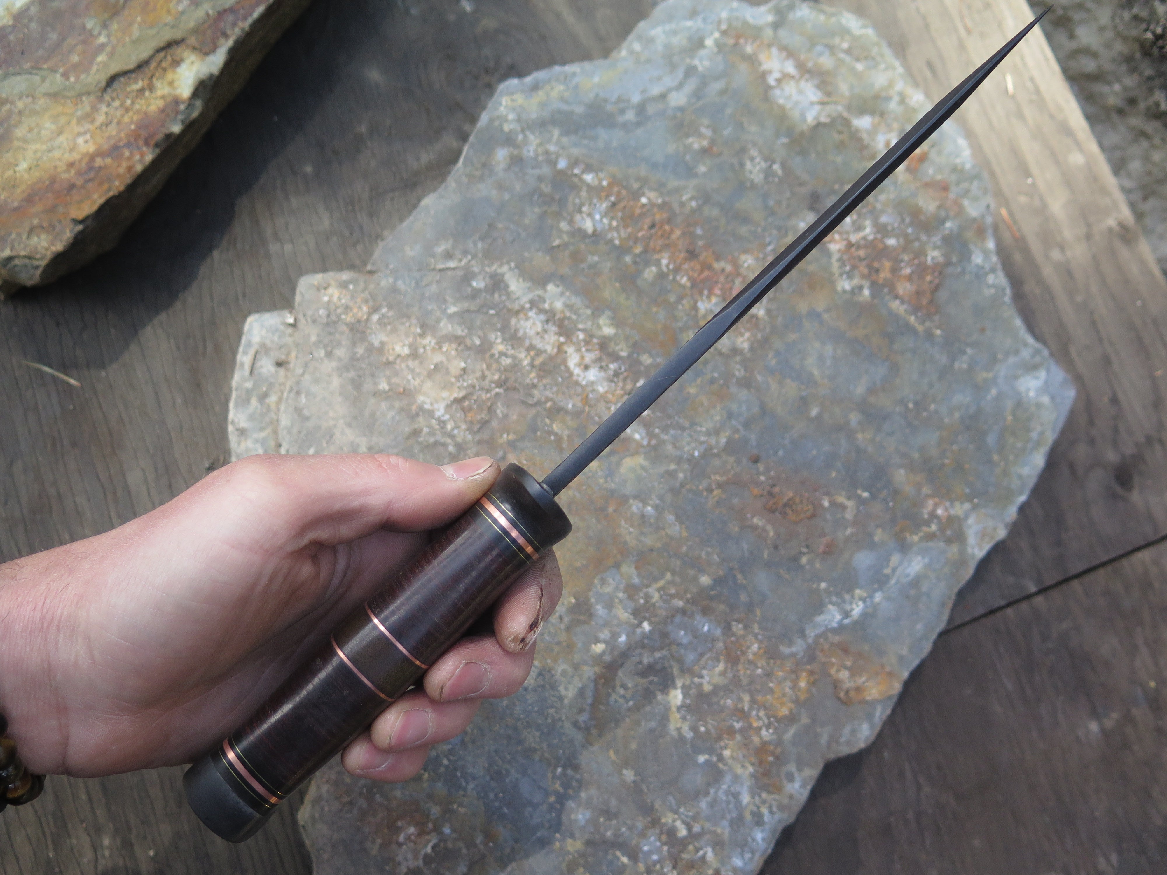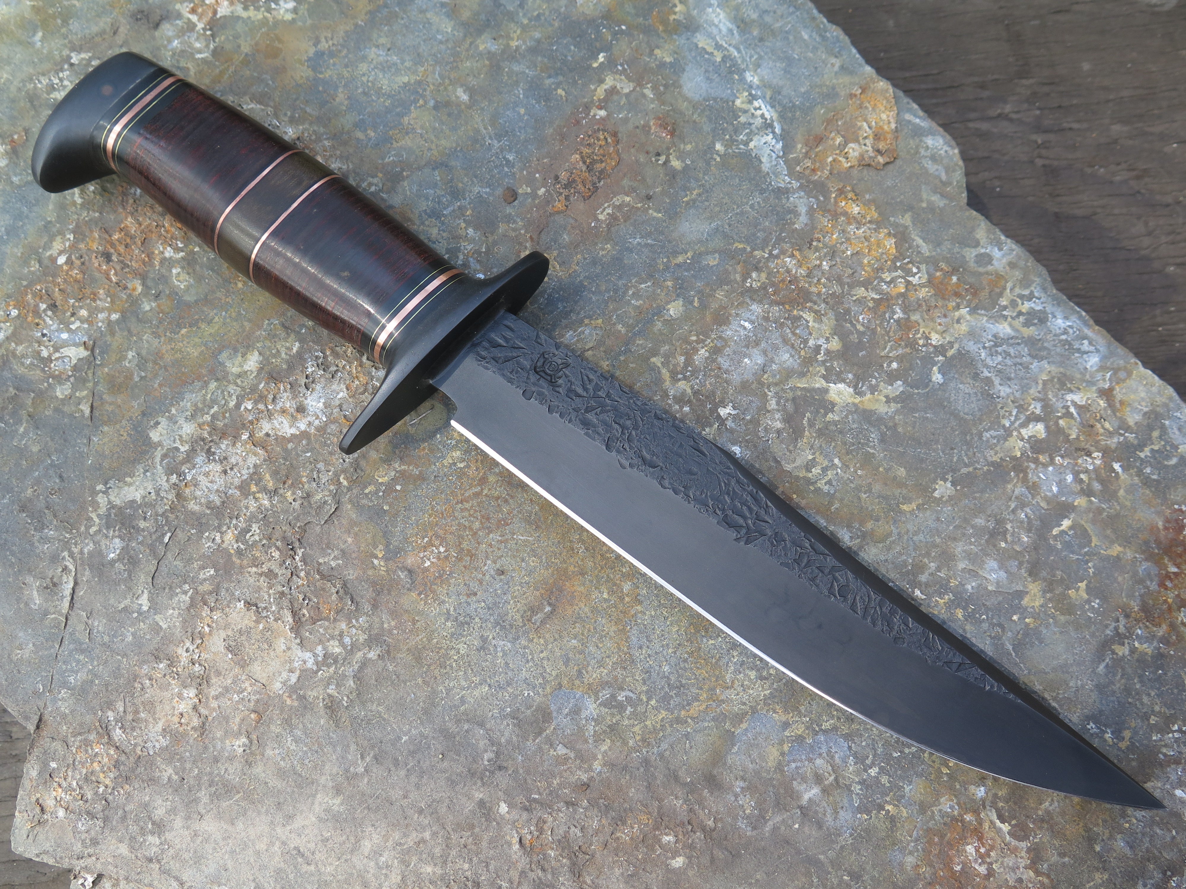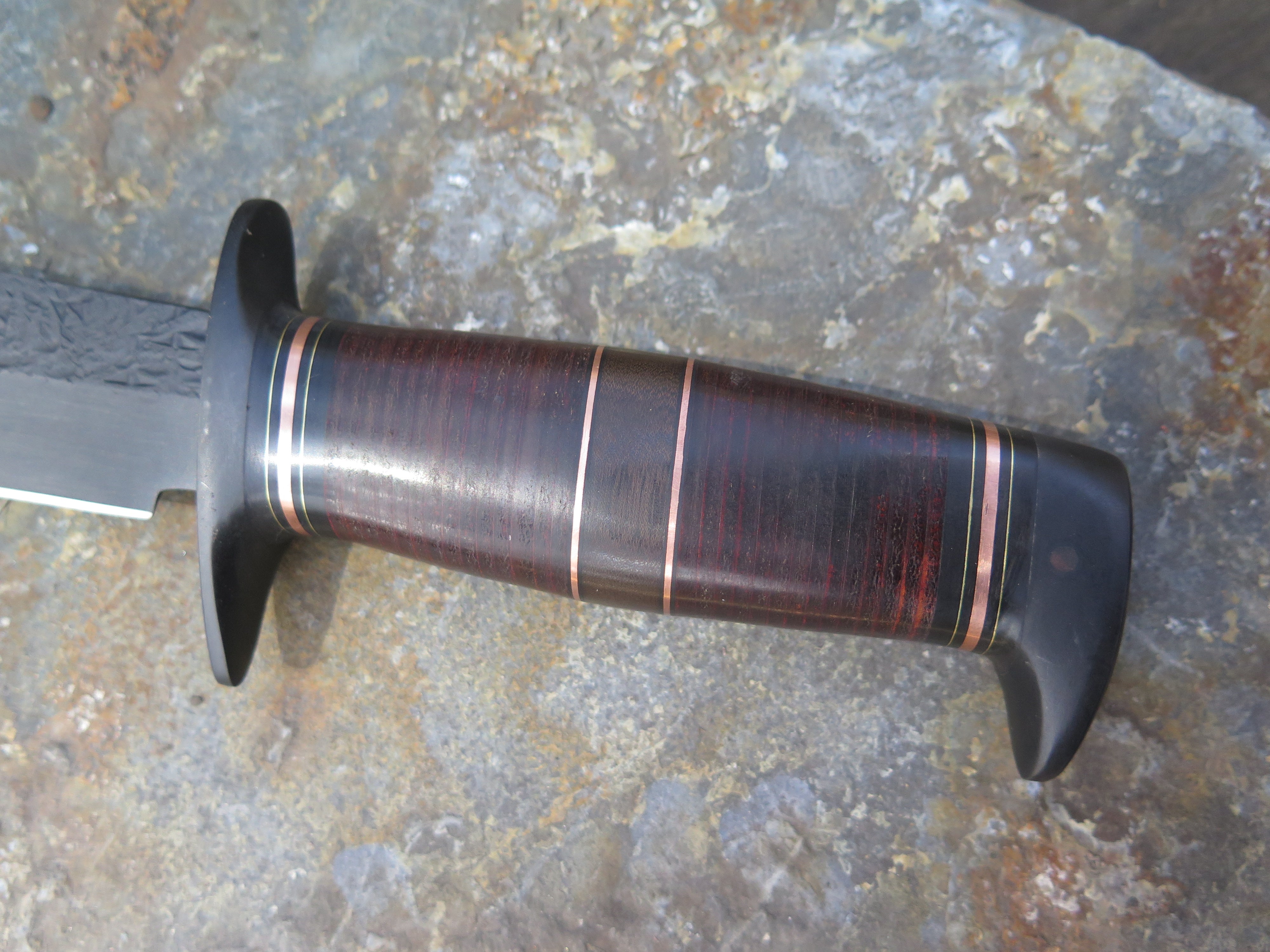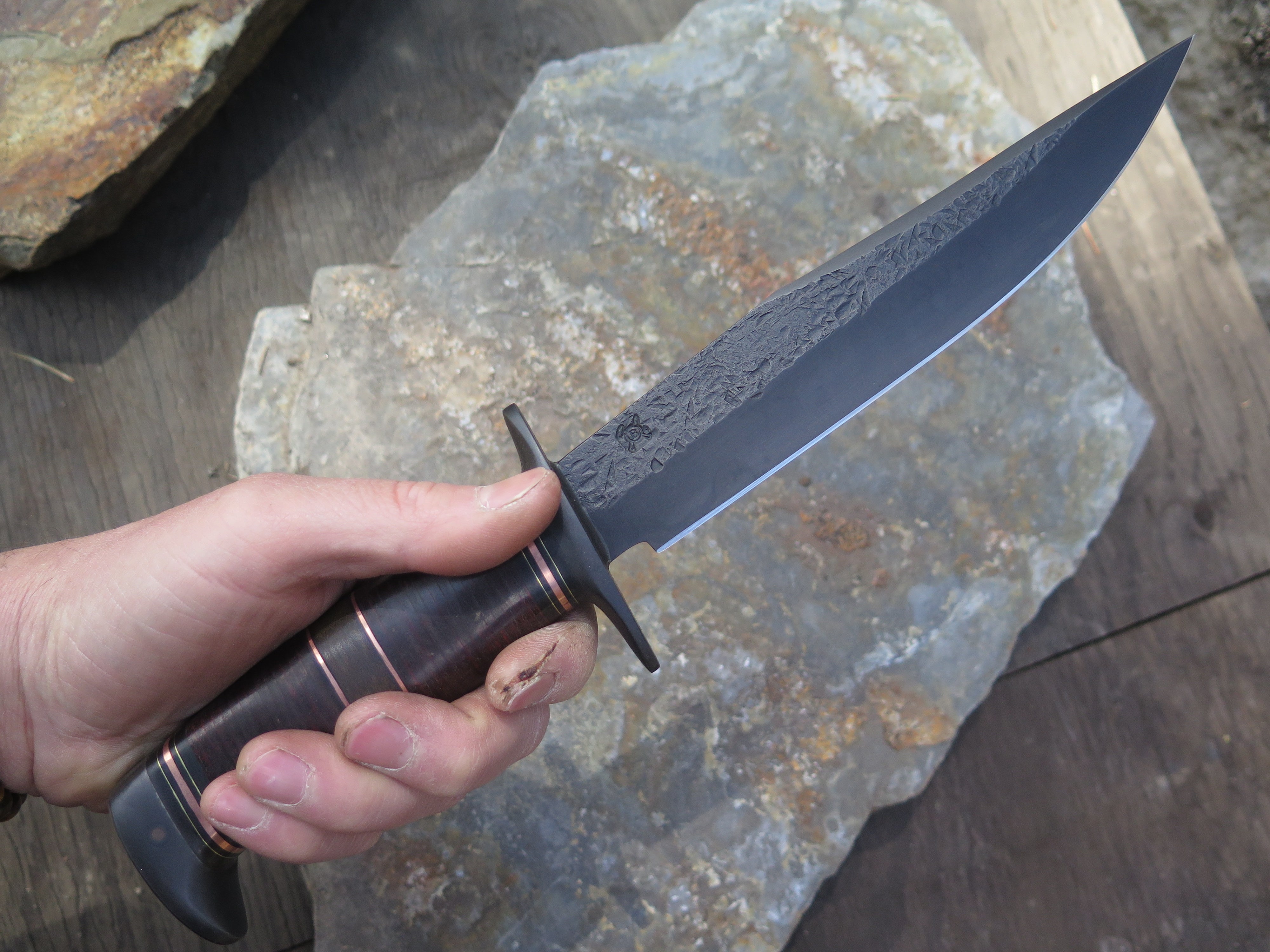 This beastly new Fighter from Behring Made© is hand forged from 3/16" thick 5160 spring steel and it measures 7 1/2" from tip to guard with a razor sharp hollow grind, hammermarks and our forced patina blued finish. The blued steel guard is soldered in place above black fiber, copper, green micarta spacers with a horsehide stack that's capped with blued steel and pinned through the tang with copper. The overall length measures 12 1/2" and it comes in a custom sheath from Warlander Leather.