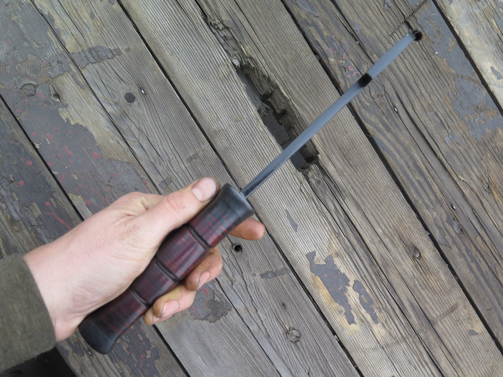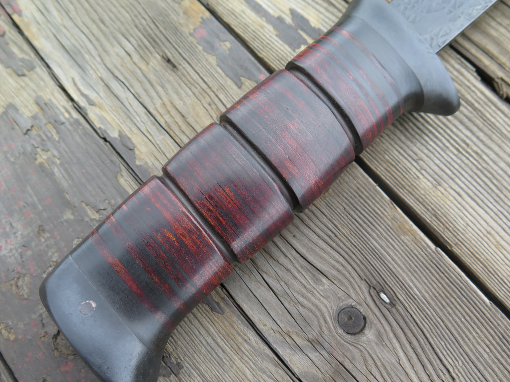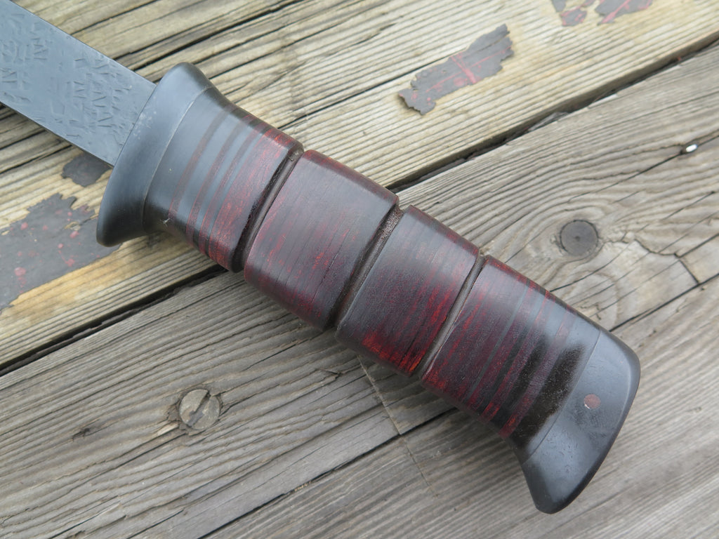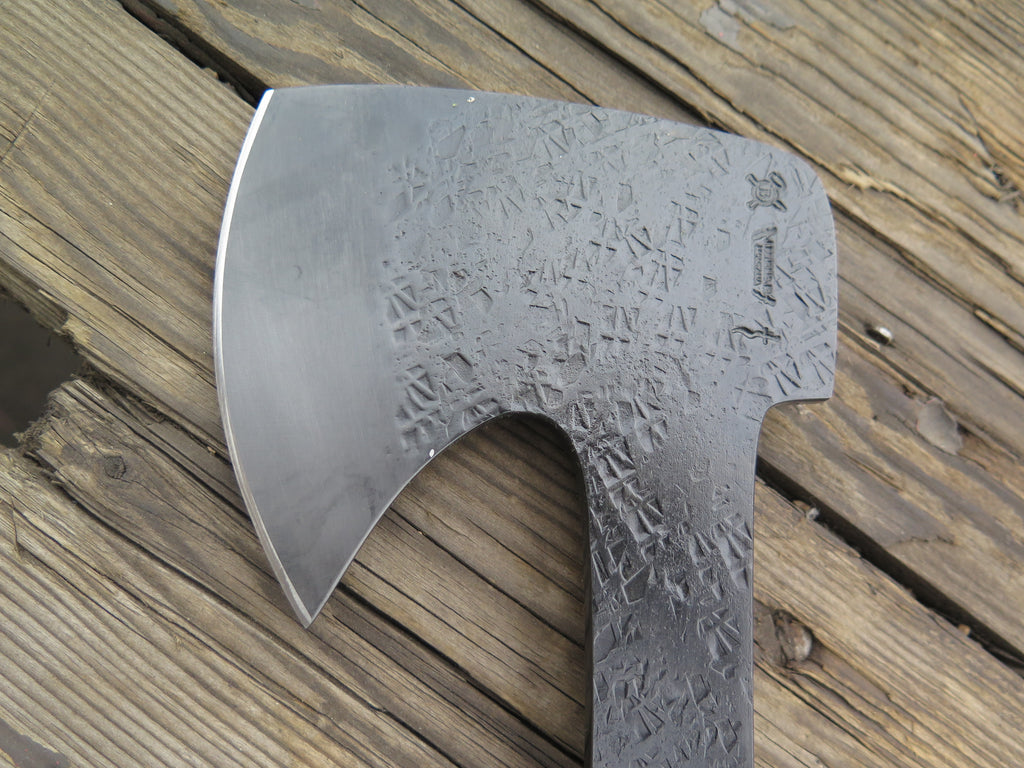 LIMITED RELEASE: This bad ass Hatchet is hand forged from 1/4" thick high carbon 01 tool steel with a 3 1/2" bit that dons our hammermark finish and a forced patina bluing. The blued steel guard is soldered in place above black fiber spacers with a stack of scalloped horsehide leather, just like the old days. We also capped it with blued steel that's pinned through tang with copper so you know you can count on this one for life. Overall length measures 11 1/4" and it will come with a custom scabbard from Behring Made. Lead time is 6 - 8 weeks. We are only making 4 at this time.