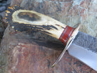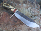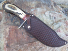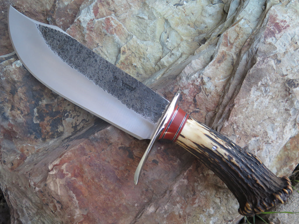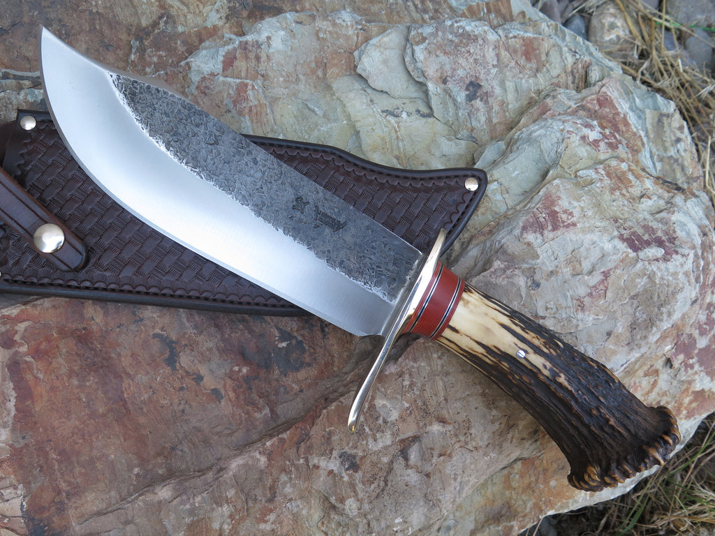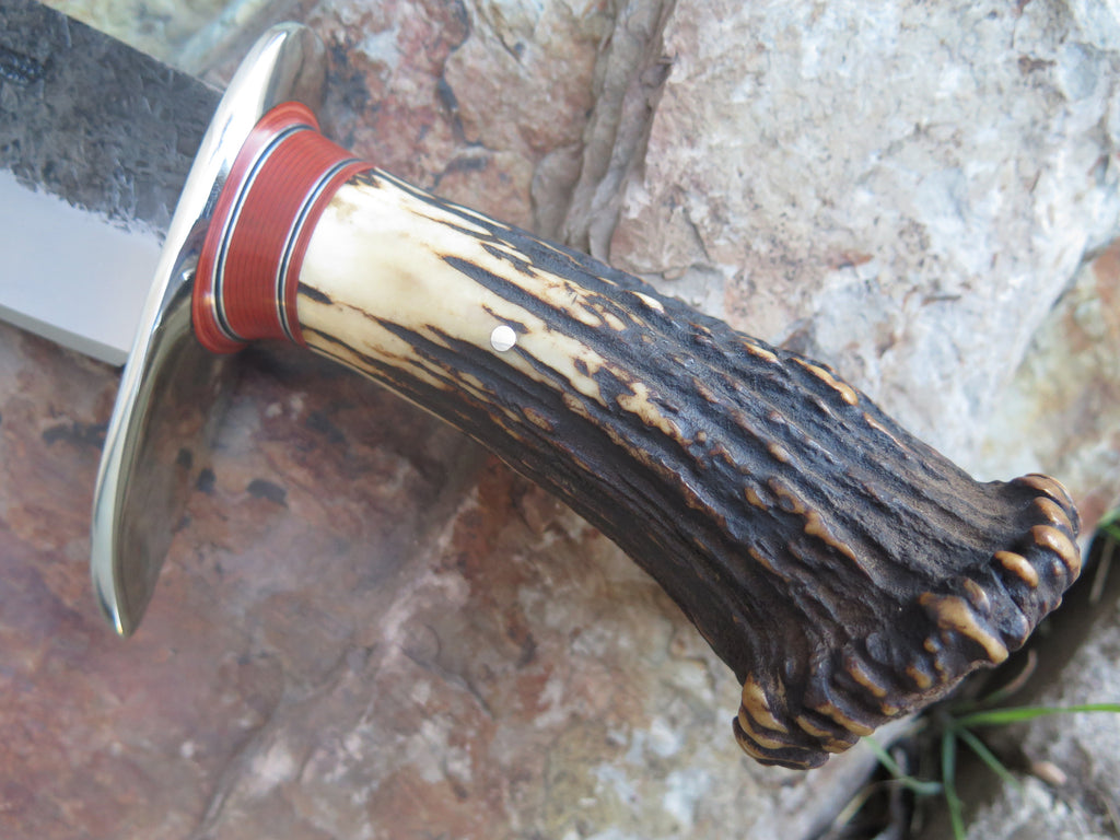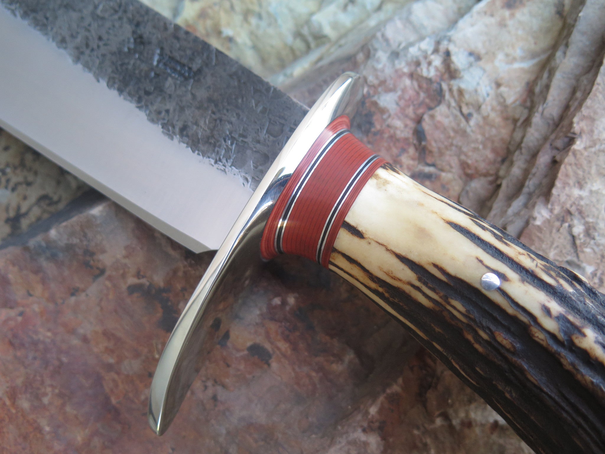If Jim Bowie were breathing today, you can bet this new one from Behring Made would have him blushing. Hand forged from 1/4" thick high carbon 01 tool steel, this behemoth measures 9 1/2" from tip to guard with a razor sharp hollow grind and a hammermark finish. The tall nickel silver guard is soldered in place above maroon, black and aluminum spacers as well as an XL sambar stag crown that's pinned with aluminum. Measuring 15 1/4" overall, this bad boy comes in a custom sheath from Warlander Leather.