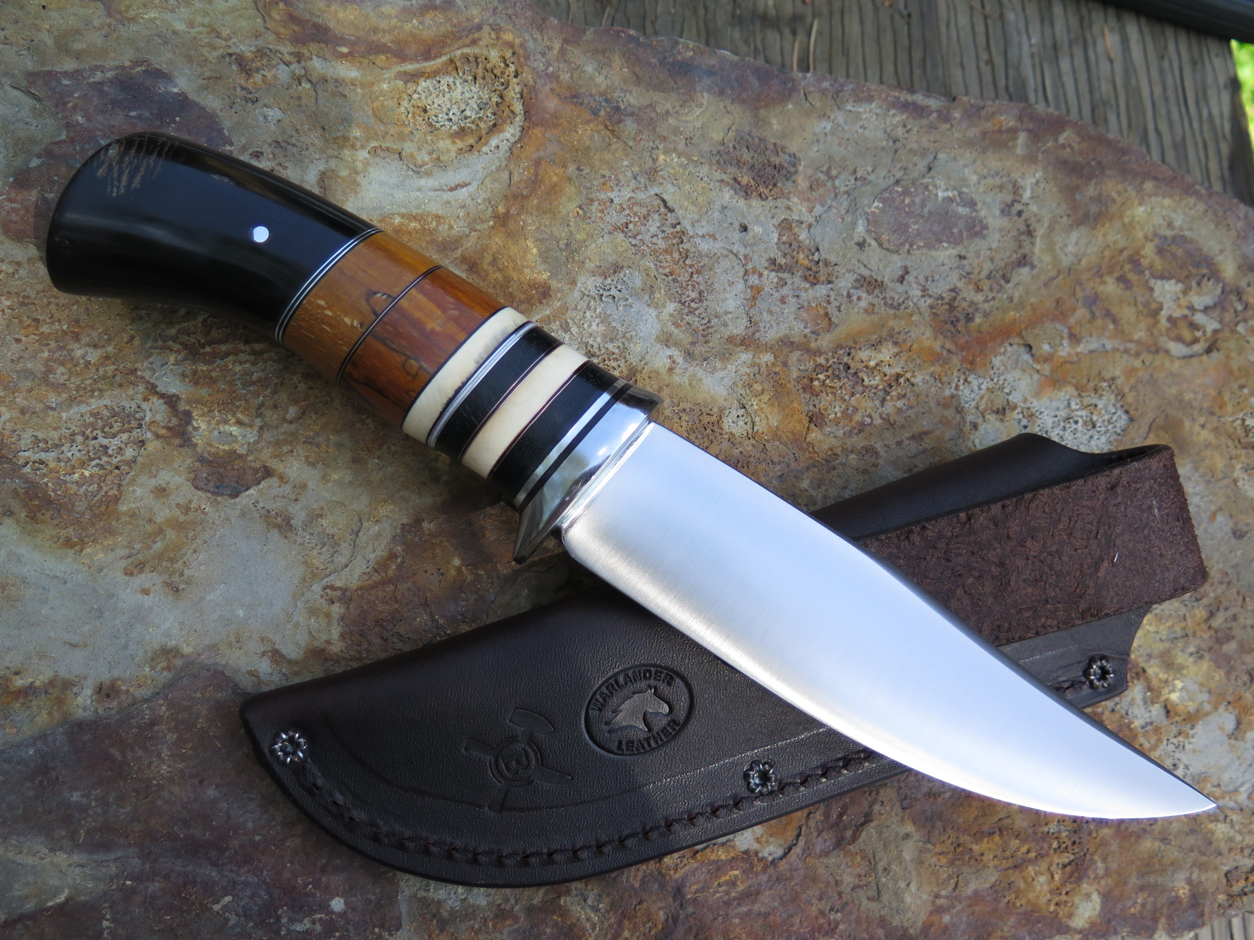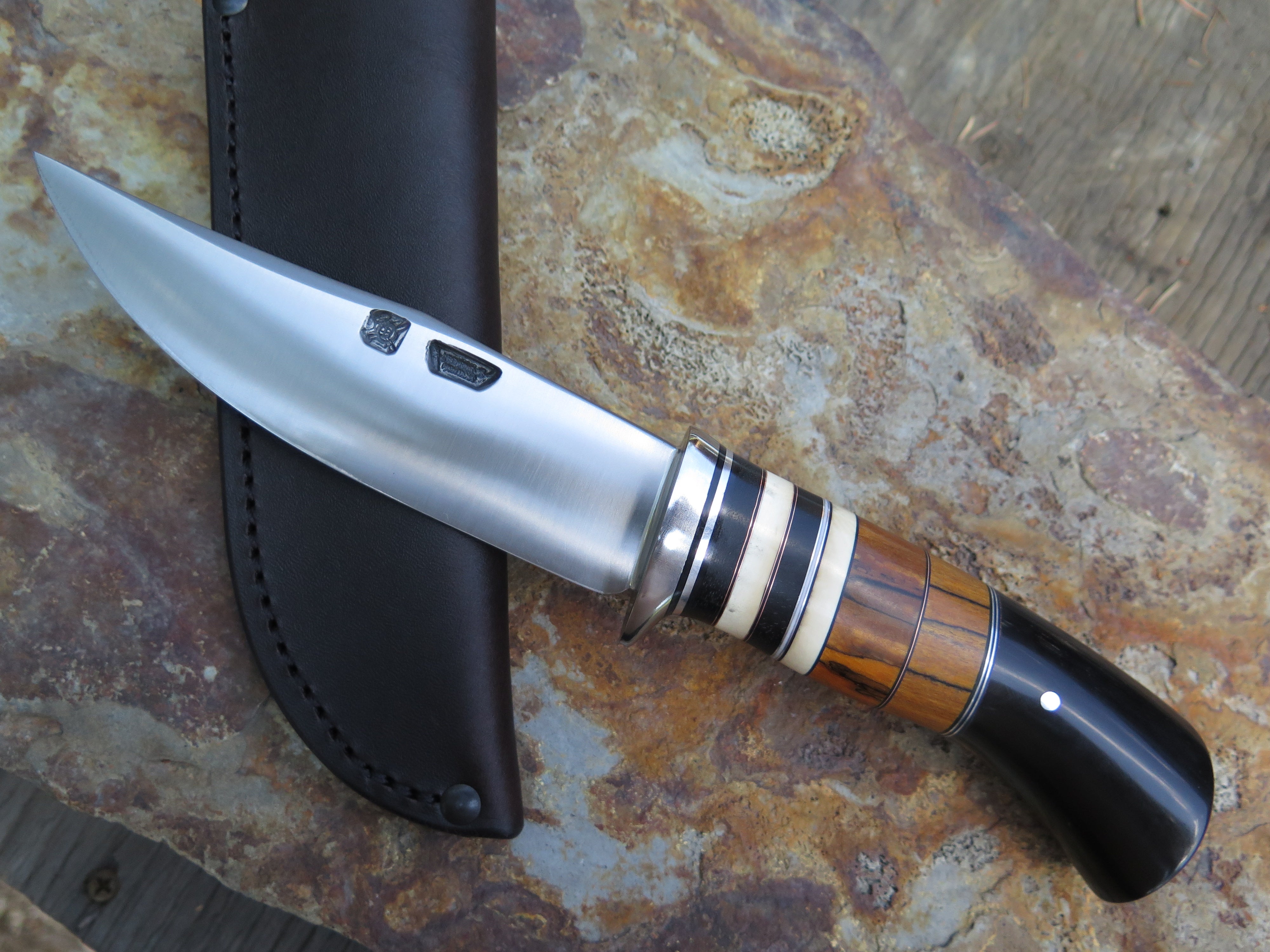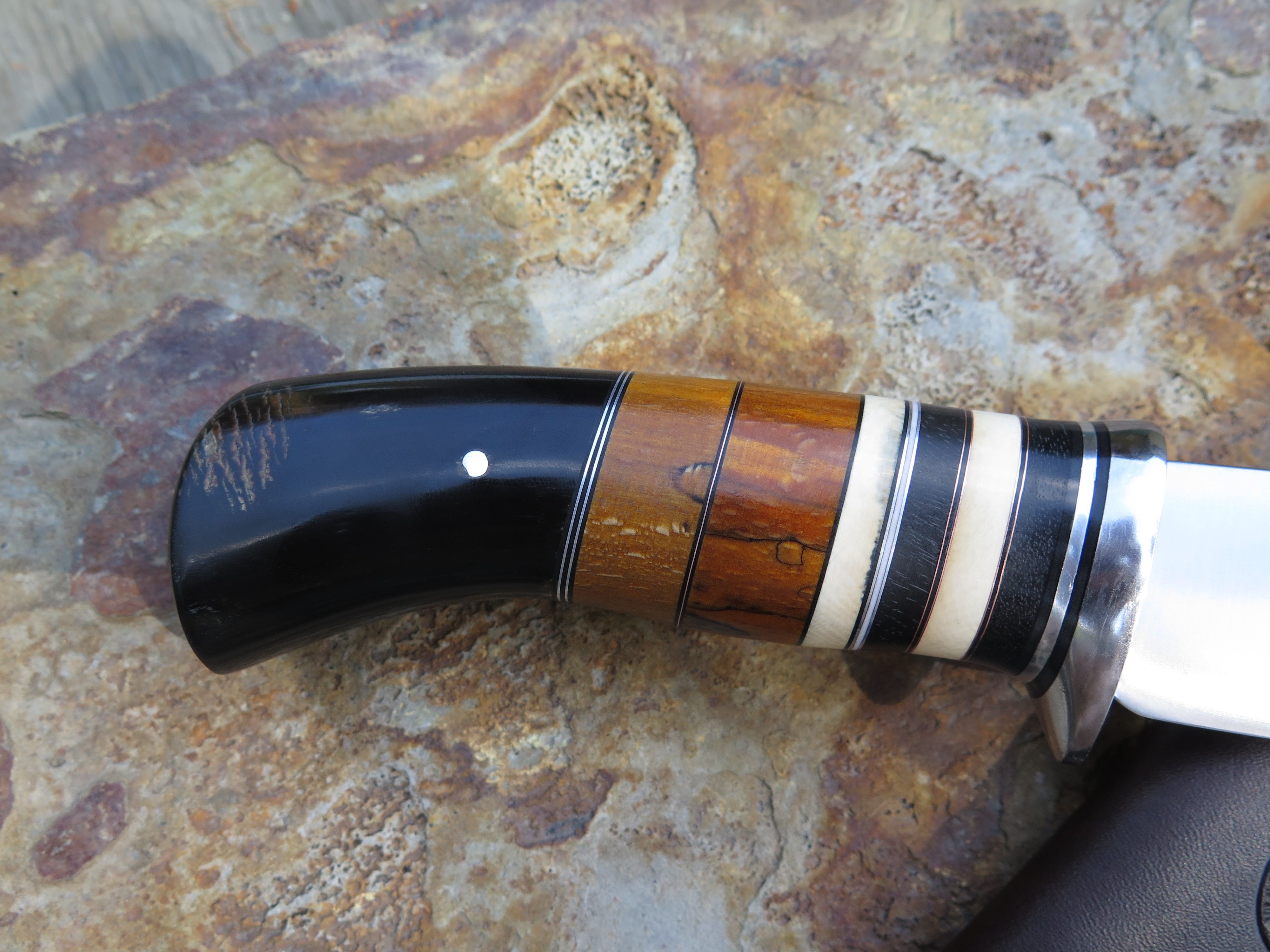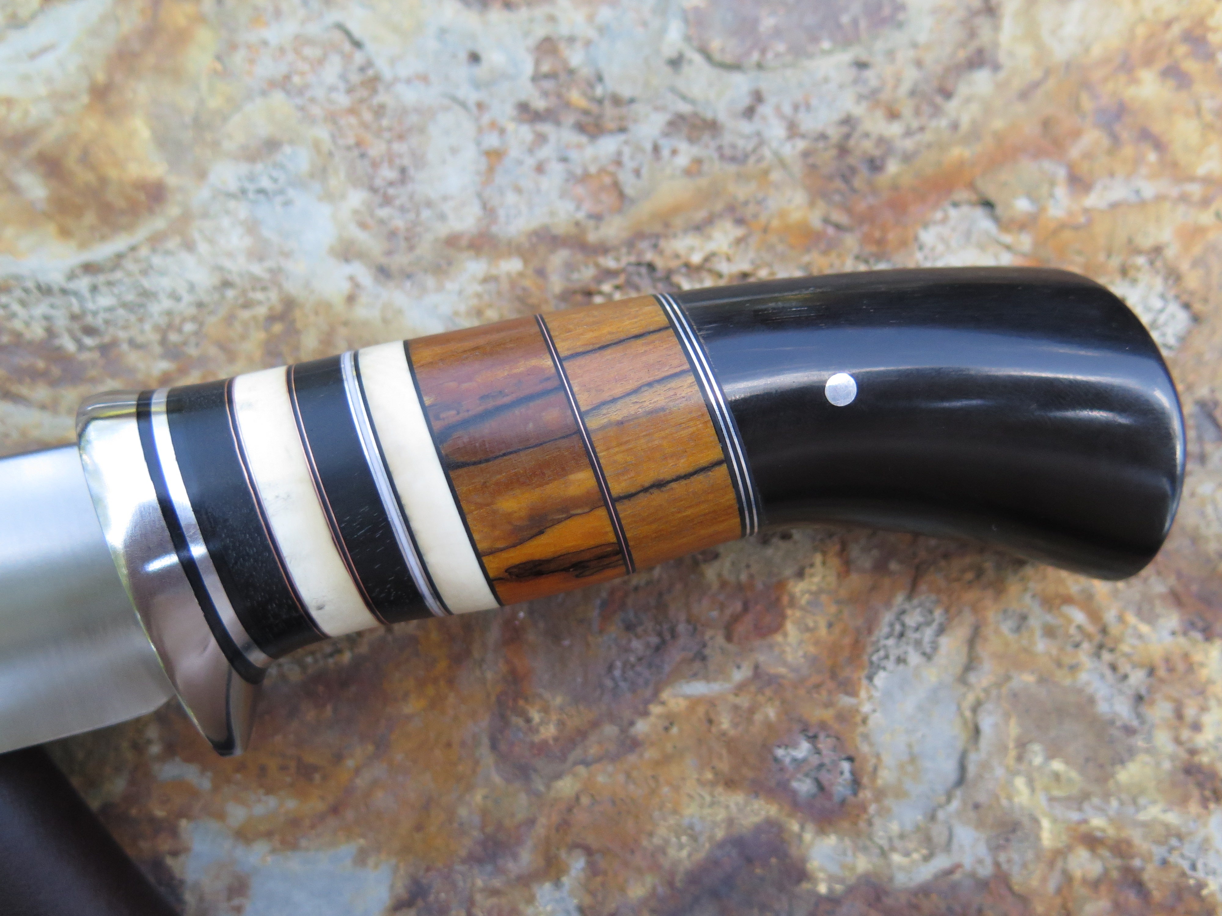 This beautiful new Hunter from Behring Made© is hand forged from 3/16" thick high carbon 01 tool steel and it measures 6" from tip to guard with a razor sharp convex grind. The nickel silver guard is soldered in place above black and white fiber, aluminum, copper, African ebony, ancient mammoth, stabilized beech and a water buffalo horn that's pinned through the tang with aluminum. The overall length measures 10 1/2" and it comes in a classic leather belt pouch sheath.