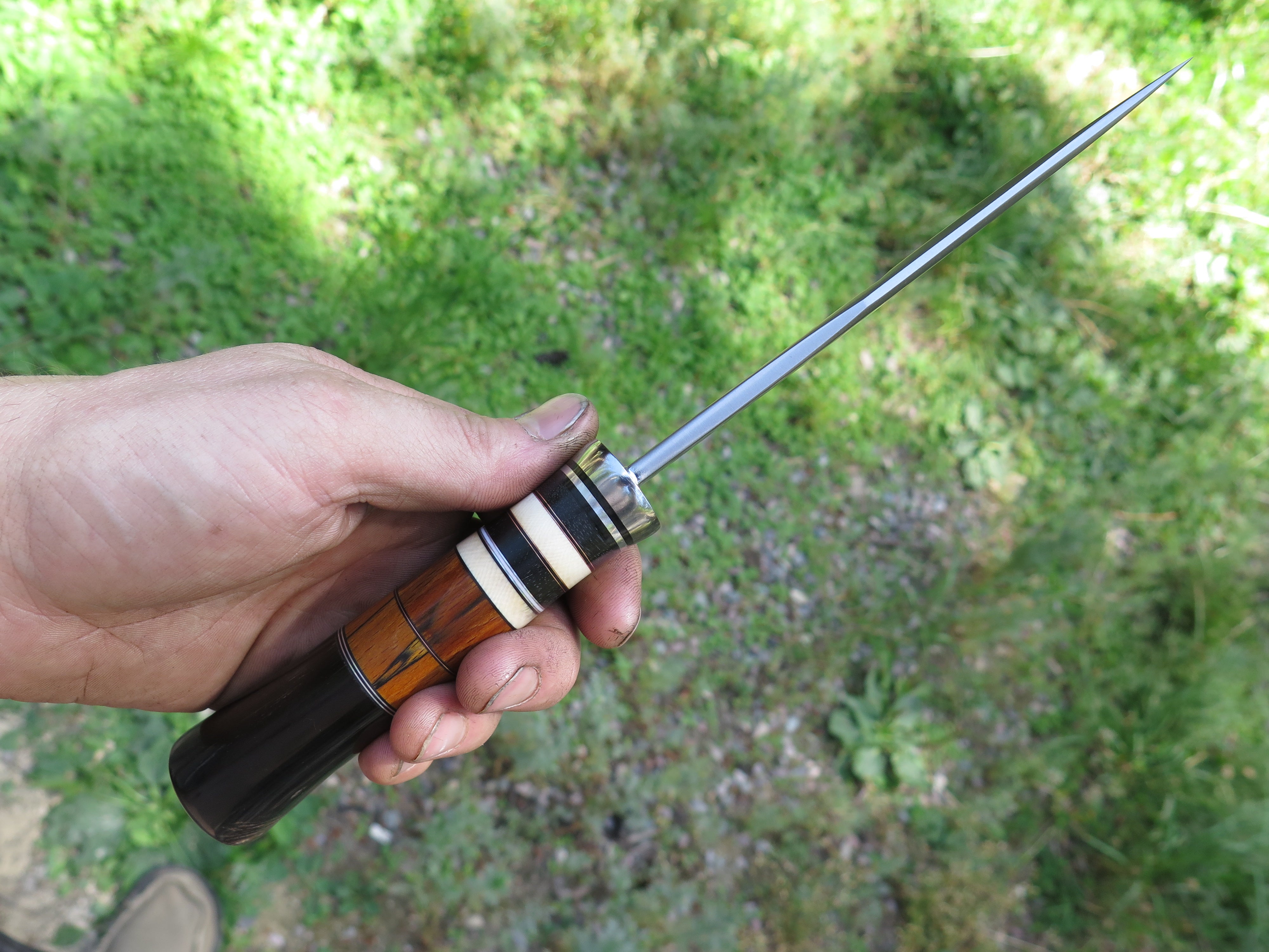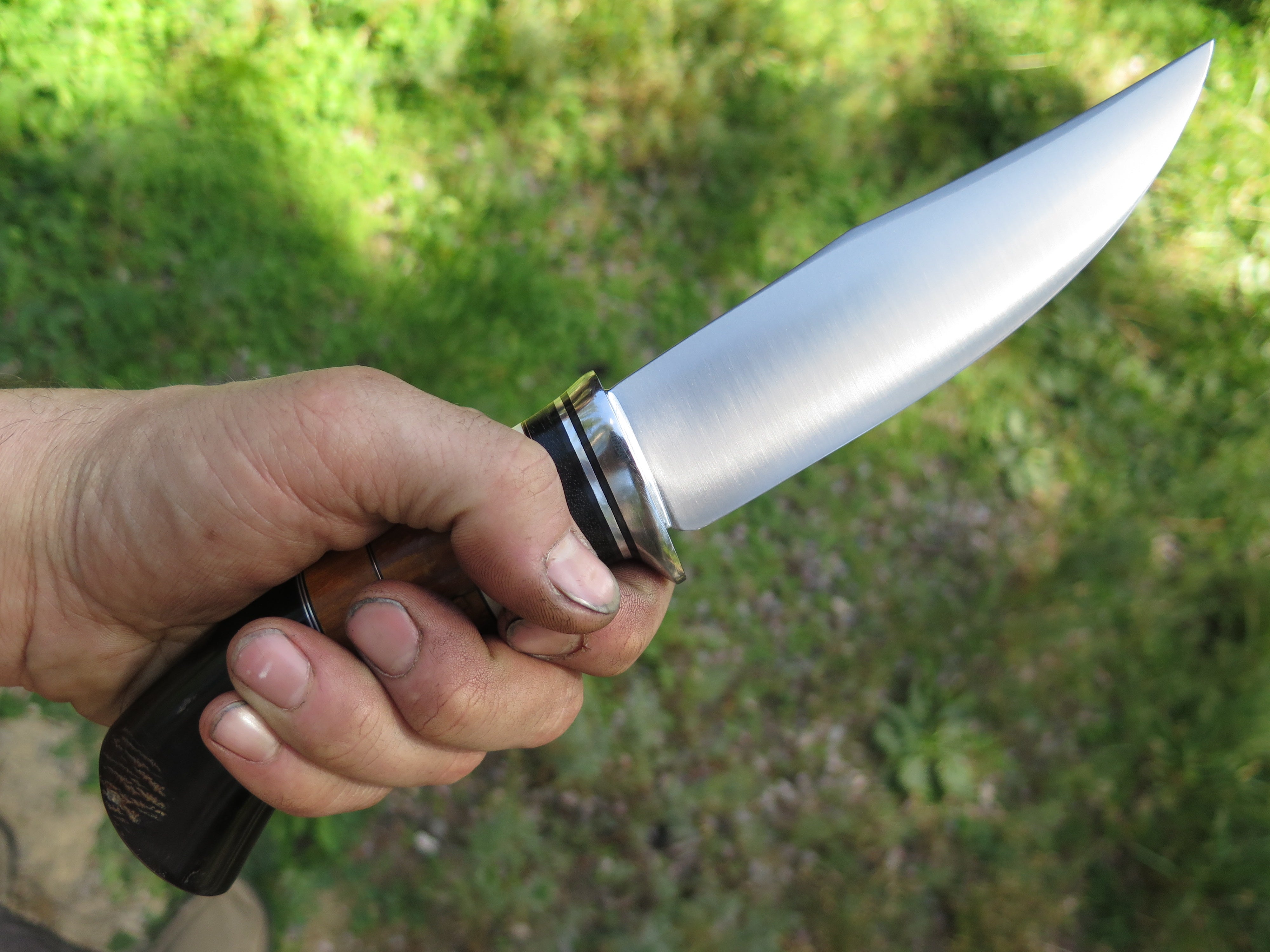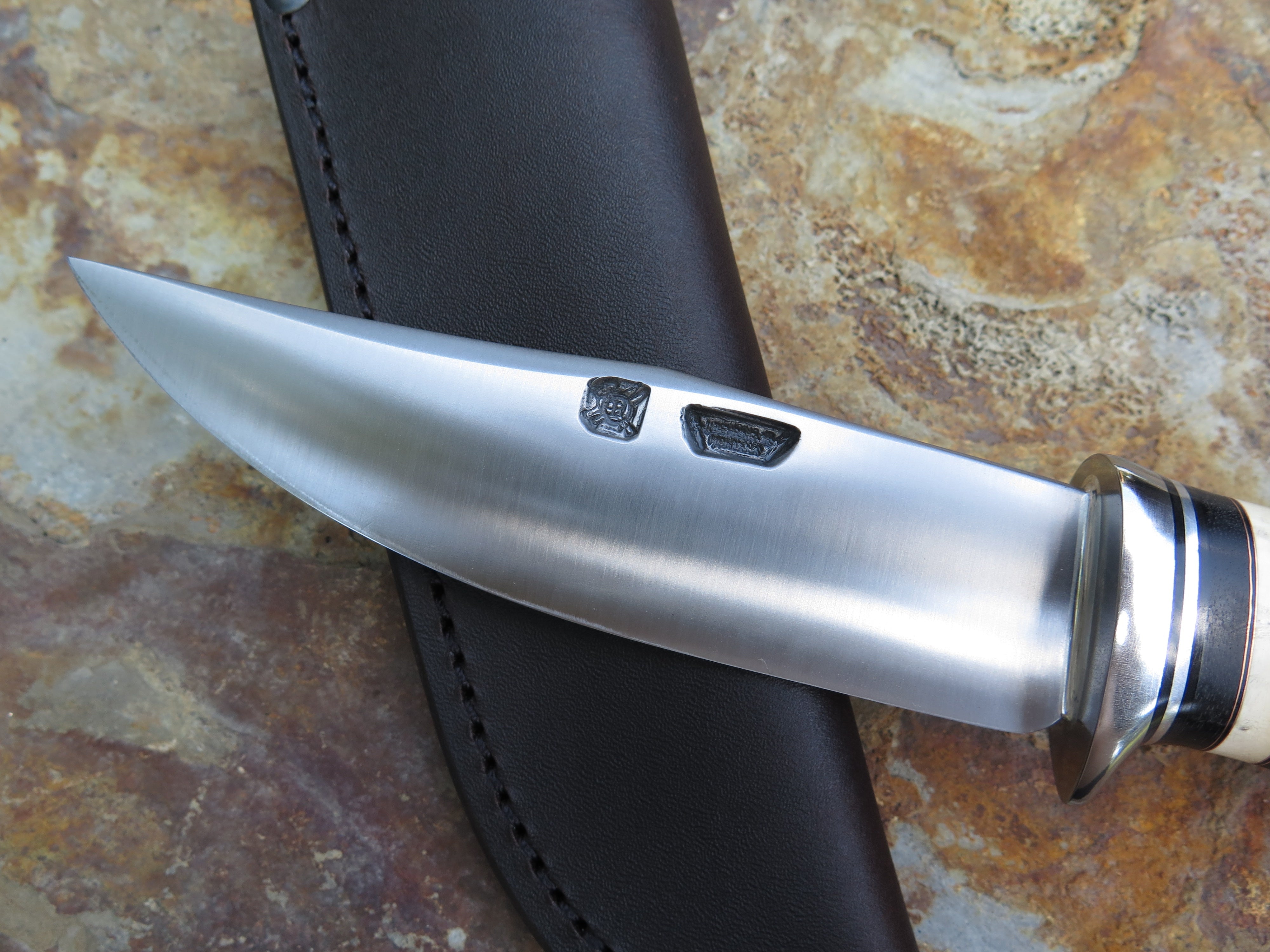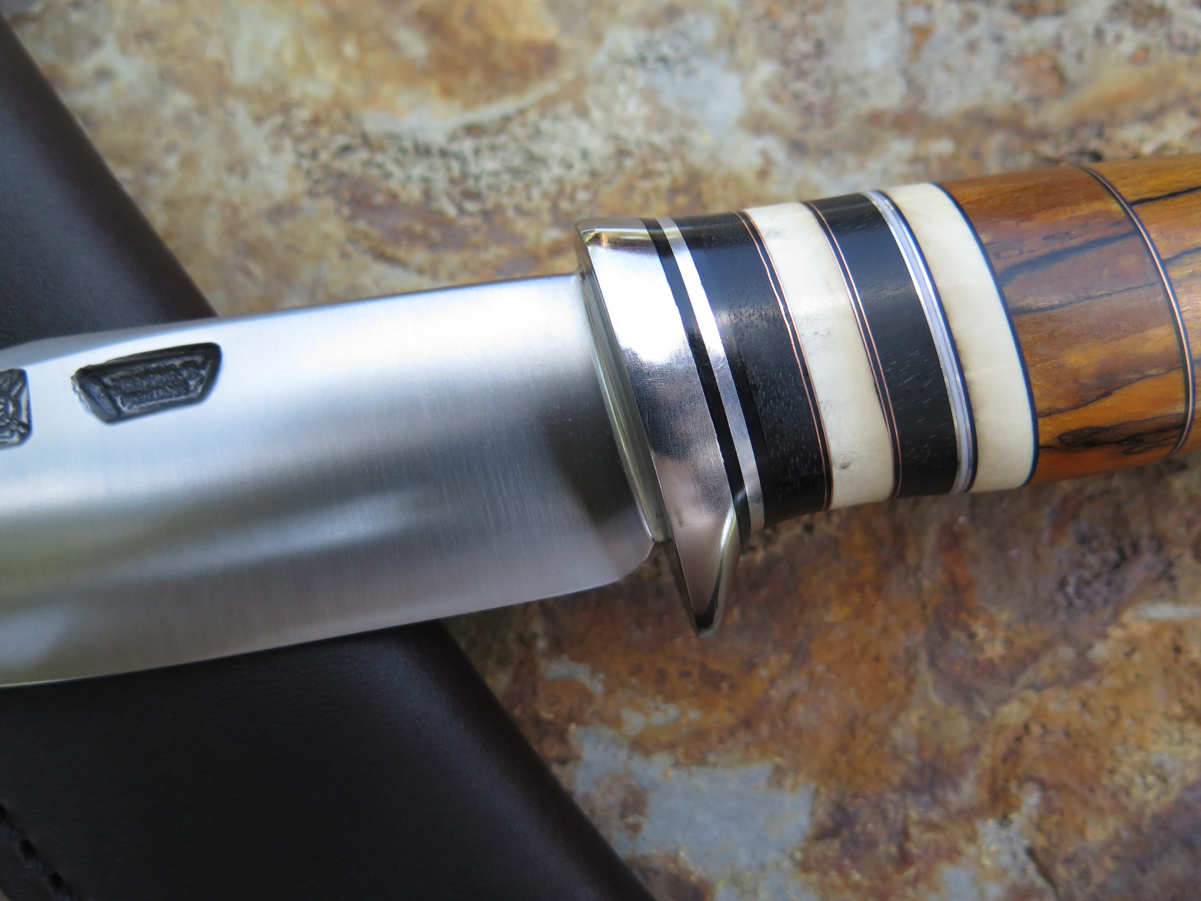 This beautiful new Hunter from Behring Made© is hand forged from 3/16" thick high carbon 01 tool steel and it measures 6" from tip to guard with a razor sharp convex grind. The nickel silver guard is soldered in place above black and white fiber, aluminum, copper, African ebony, ancient mammoth, stabilized beech and a water buffalo horn that's pinned through the tang with aluminum. The overall length measures 10 1/2" and it comes in a classic leather belt pouch sheath.