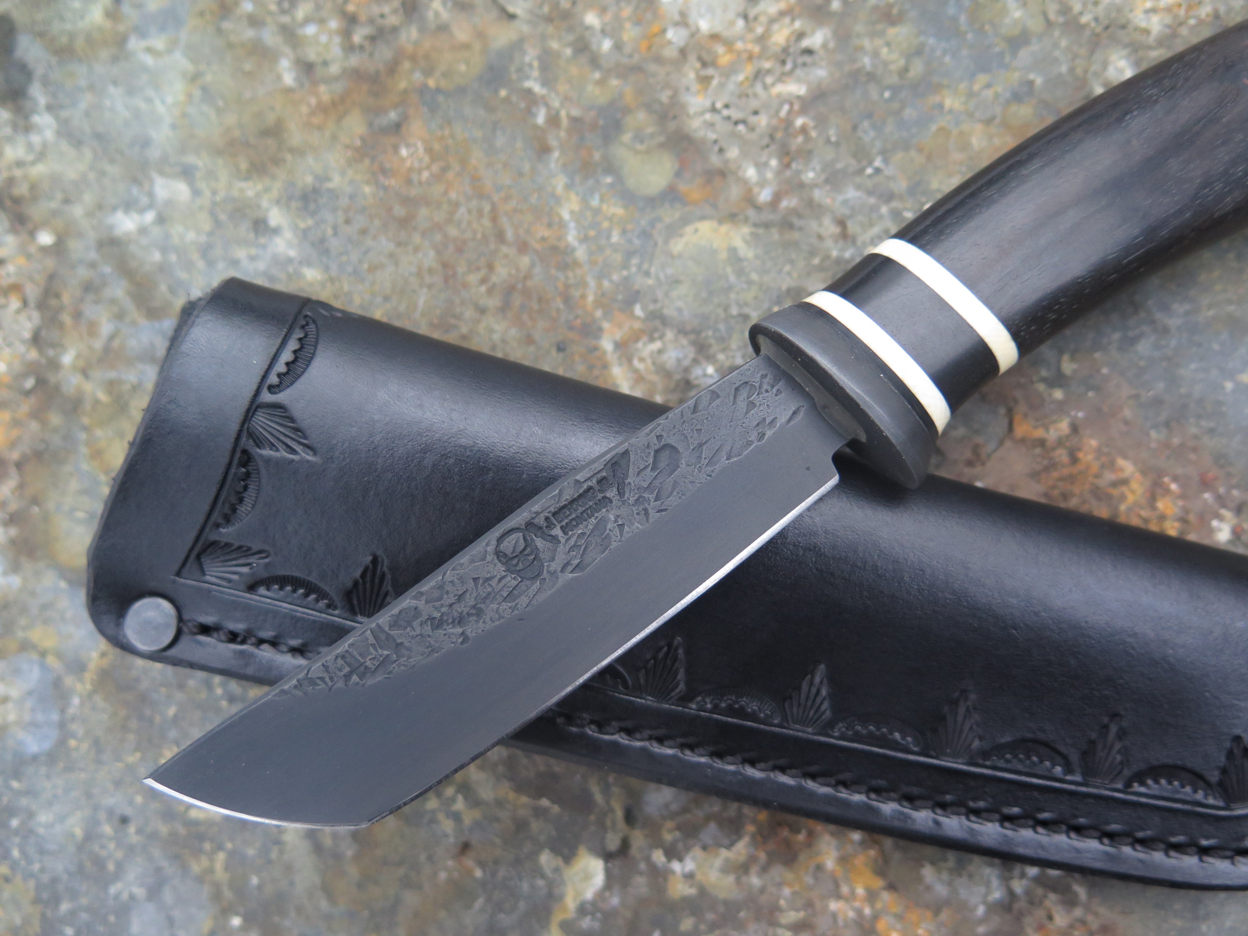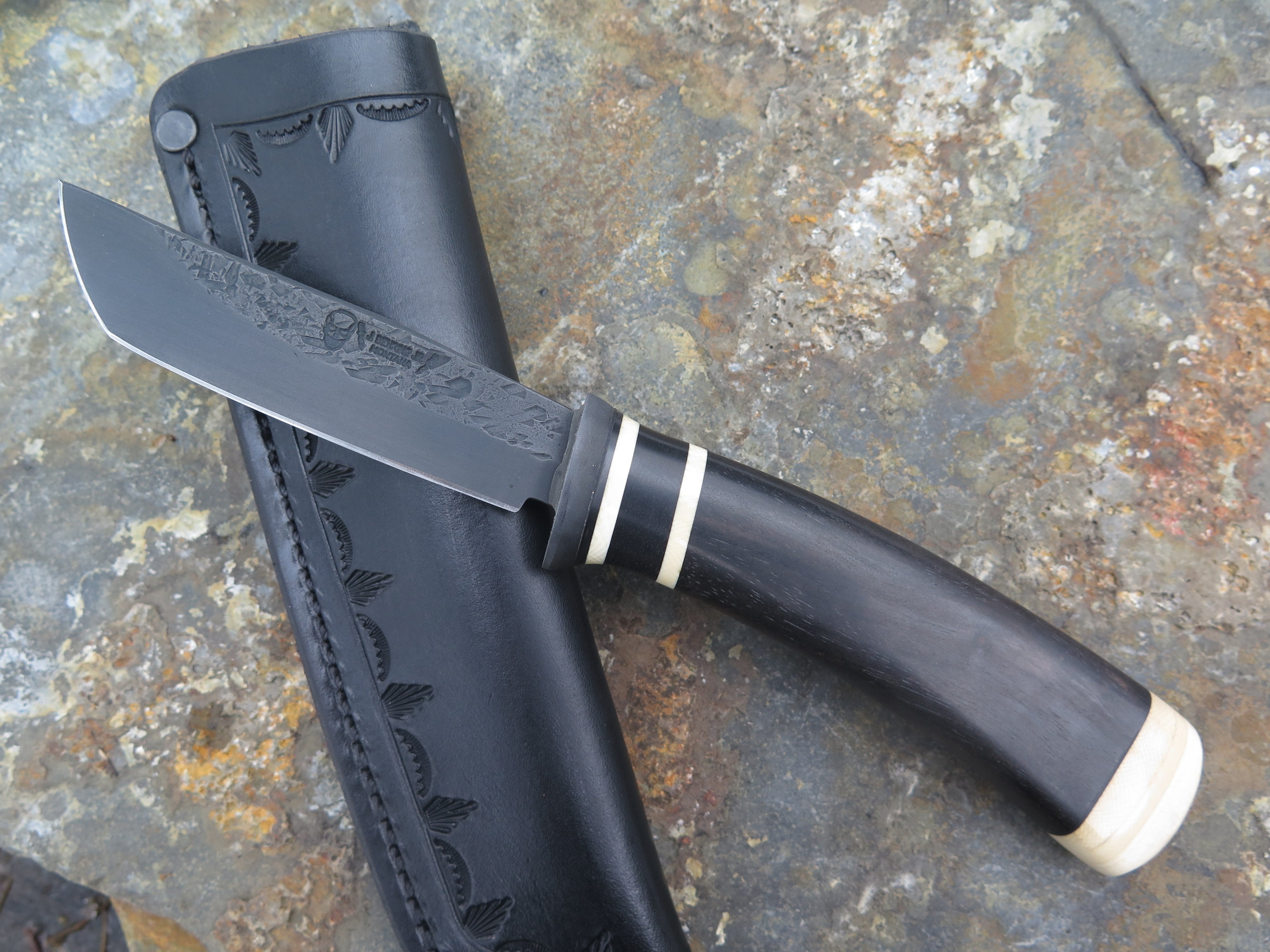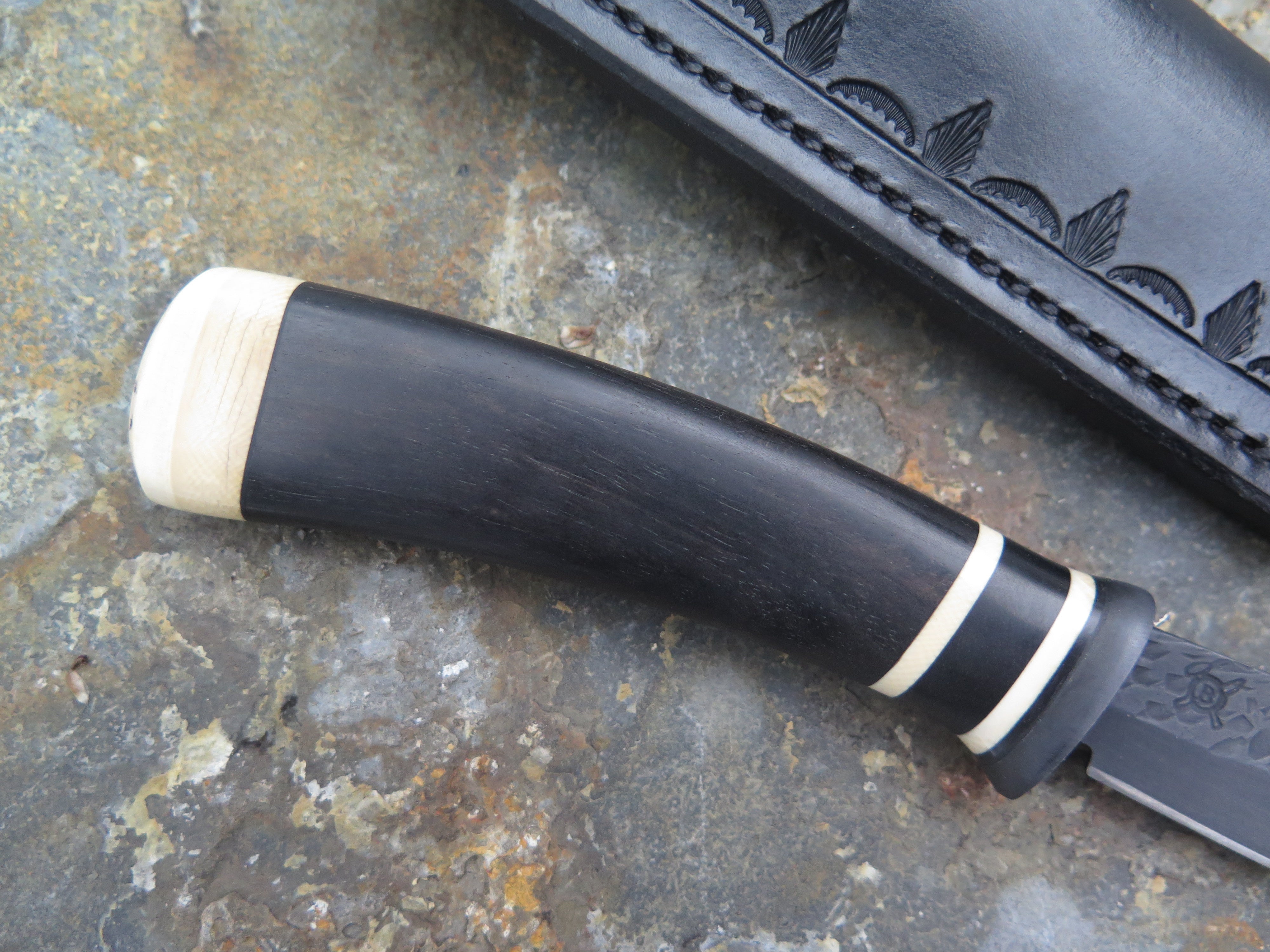This bad ass new Tanto from Behring Made© is hand forged from 1/8" thick high carbon 01 tool steel and it measures 3 3/4" from tip to guard with a razor sharp hollow grind, hammer marks, and our forced patina blued finish. The blued steel guard is soldered in place above an outstanding array of ancient mammoth ivory and African ebony wood. The overall length measures 8" and it comes in a custom border tooled Behring Made© pouch sheath.