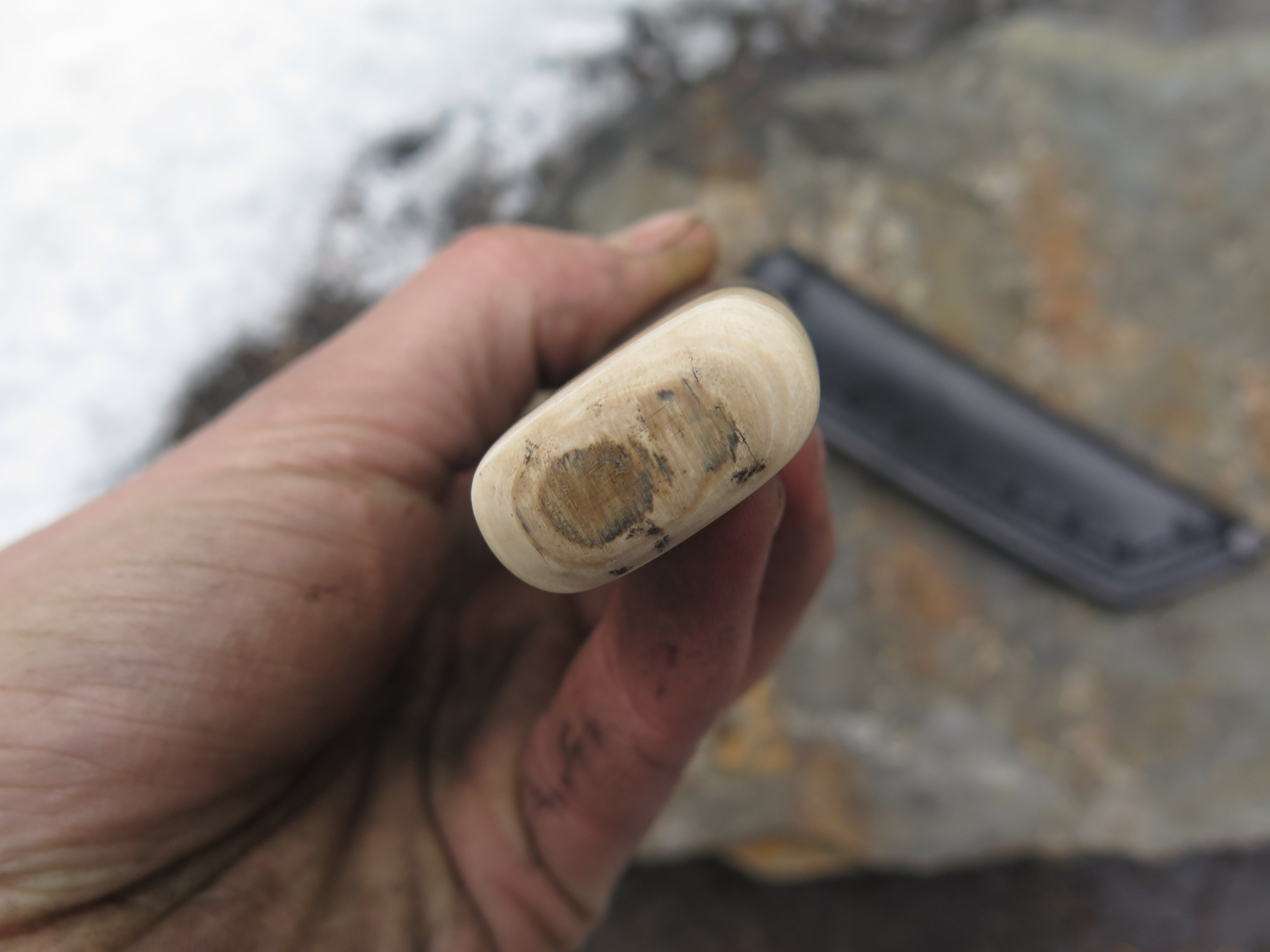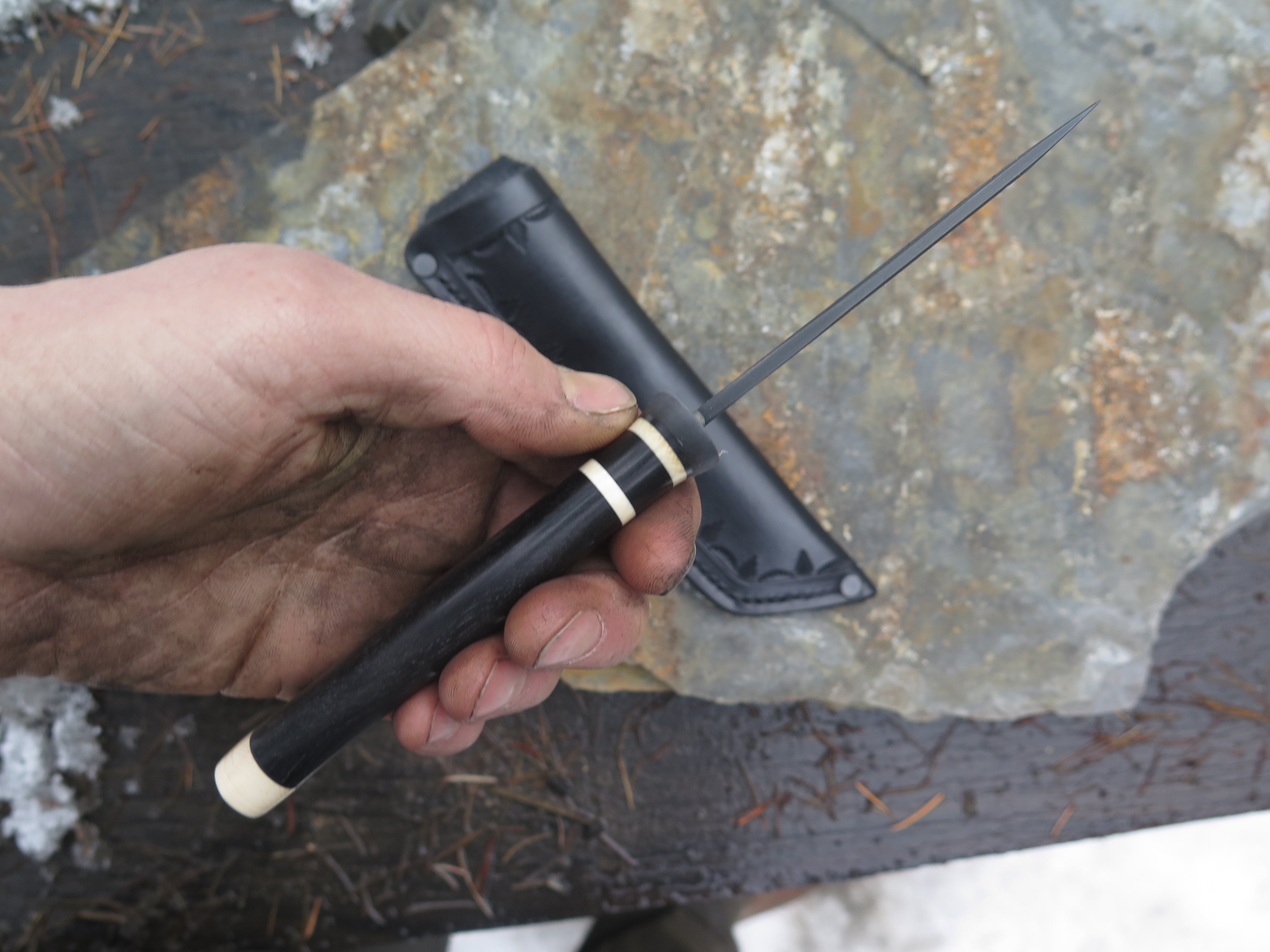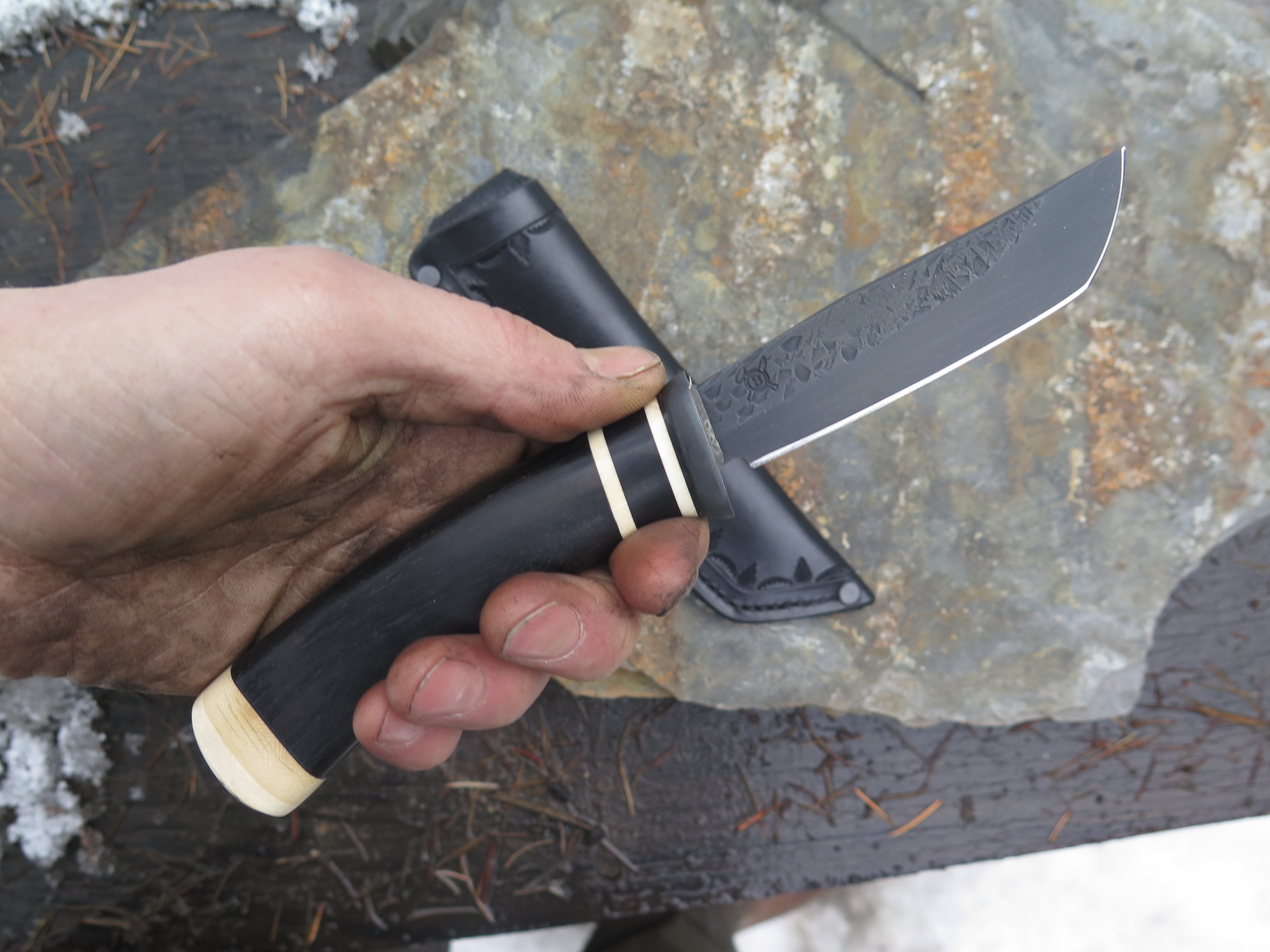 This bad ass new Tanto from Behring Made© is hand forged from 1/8" thick high carbon 01 tool steel and it measures 3 3/4" from tip to guard with a razor sharp hollow grind, hammer marks, and our forced patina blued finish. The blued steel guard is soldered in place above an outstanding array of ancient mammoth ivory and African ebony wood. The overall length measures 8" and it comes in a custom border tooled Behring Made© pouch sheath.