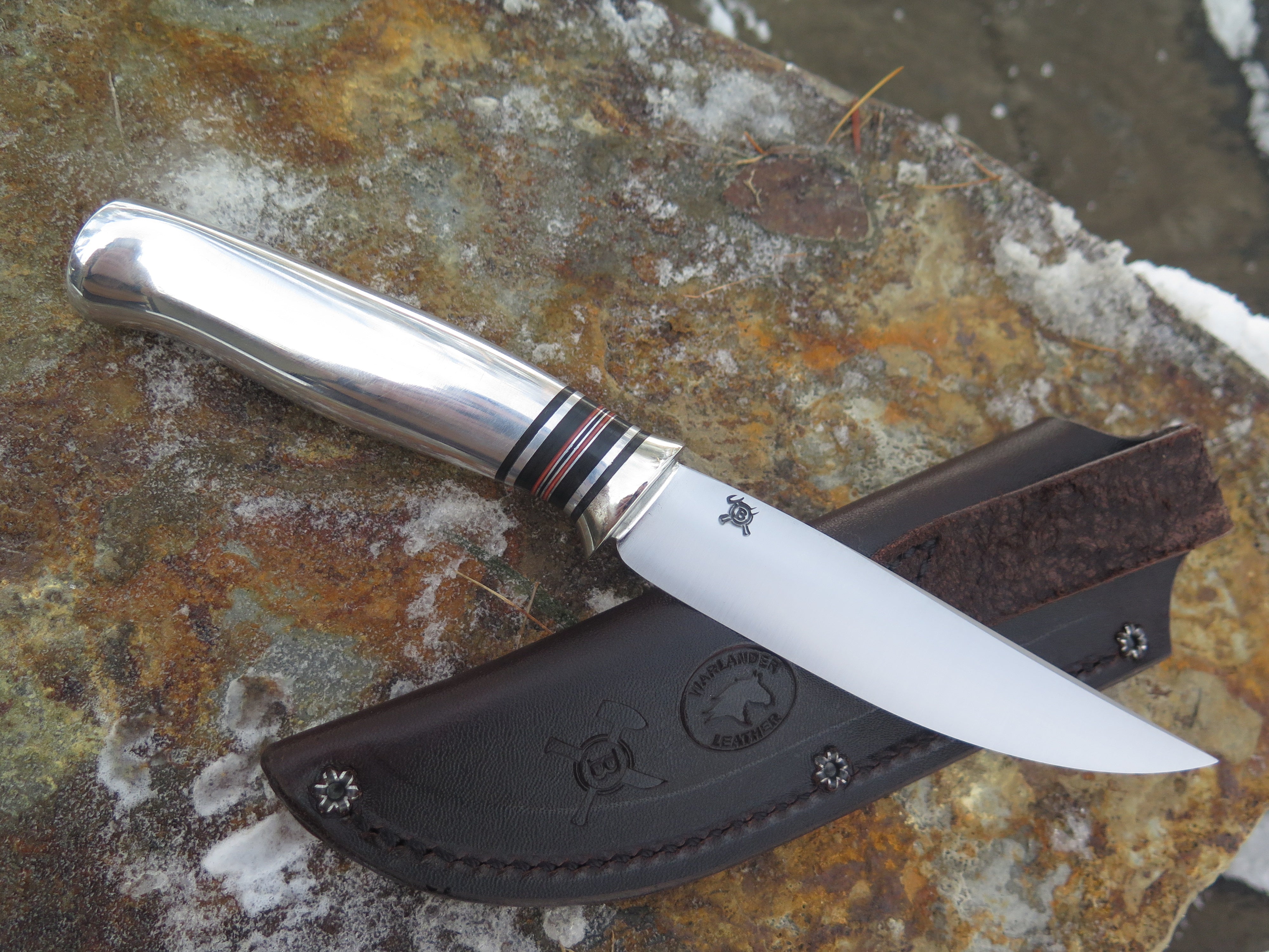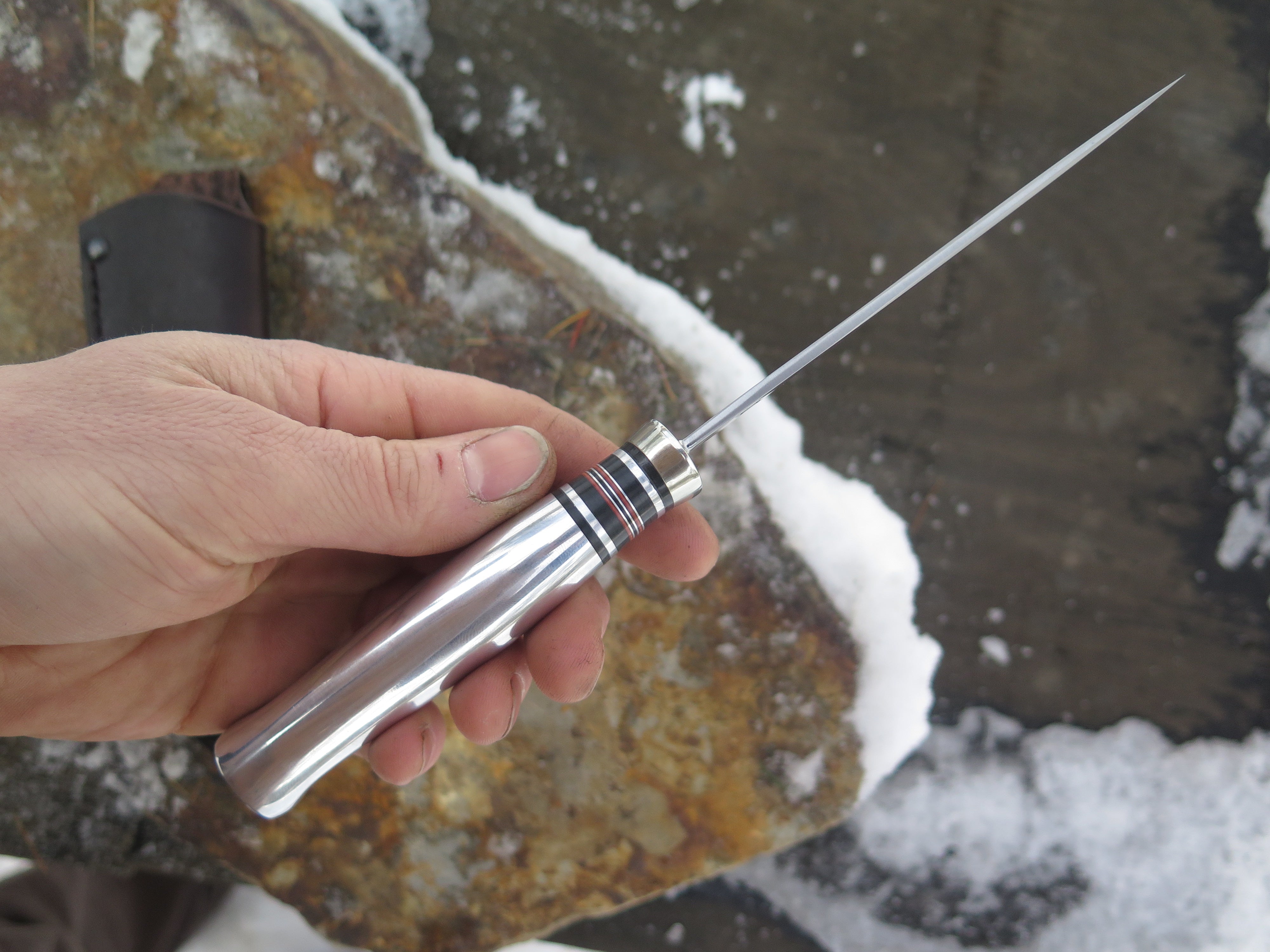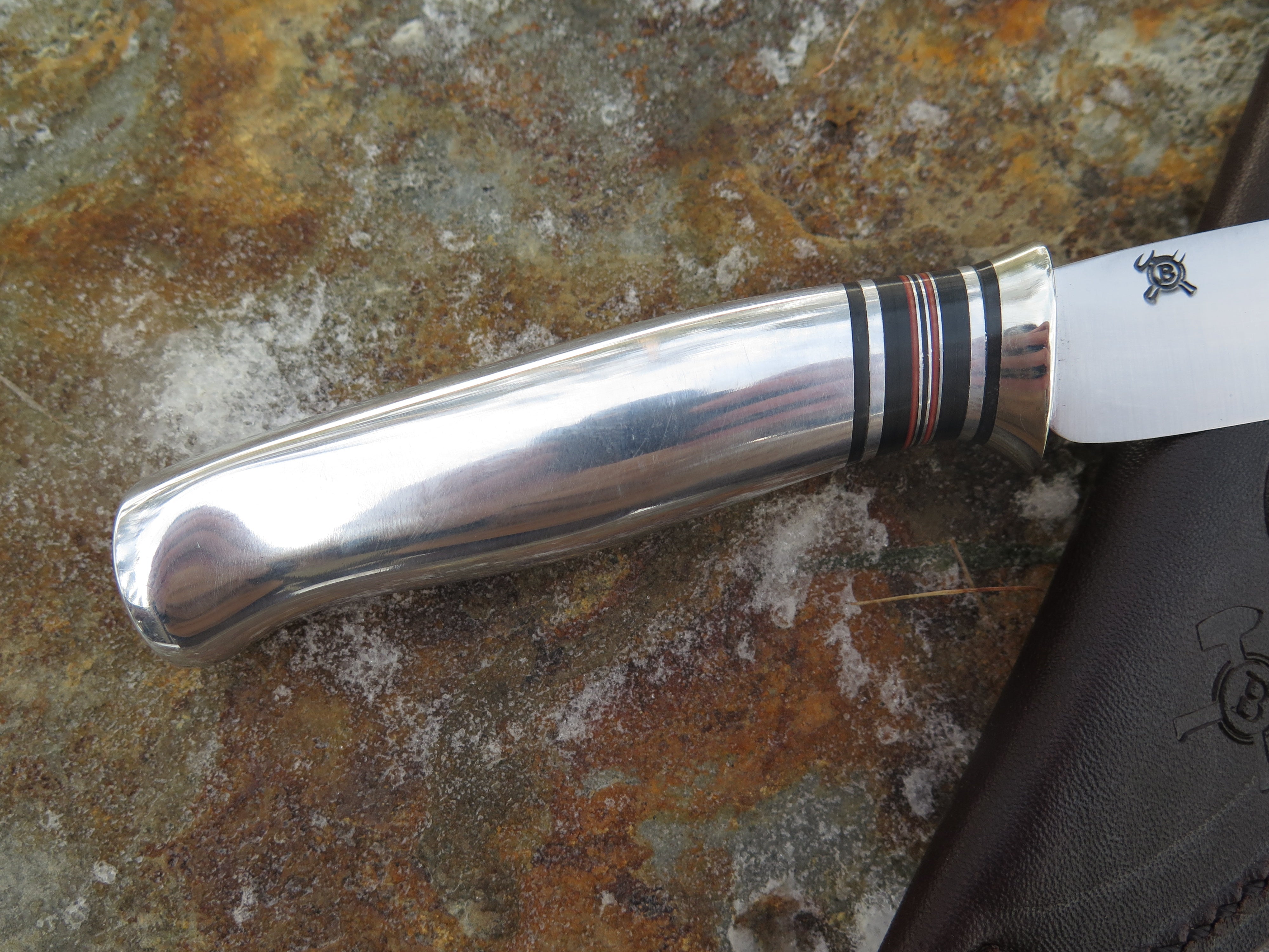 This unique Behring Made© Trout & Bird is hand forged from 1/8" thick high carbon 01 tool steel and it measures 4 3/4" from tip to guard with a razor sharp convex grind. The nickel silver guard is soldered in place above black, maroon and aluminum spacers which top a solid aluminum handle that's also pinned through the tang with, you guessed it, aluminum. The overall length measures 8 7/8" and it comes in a classic leather belt pouch sheath.