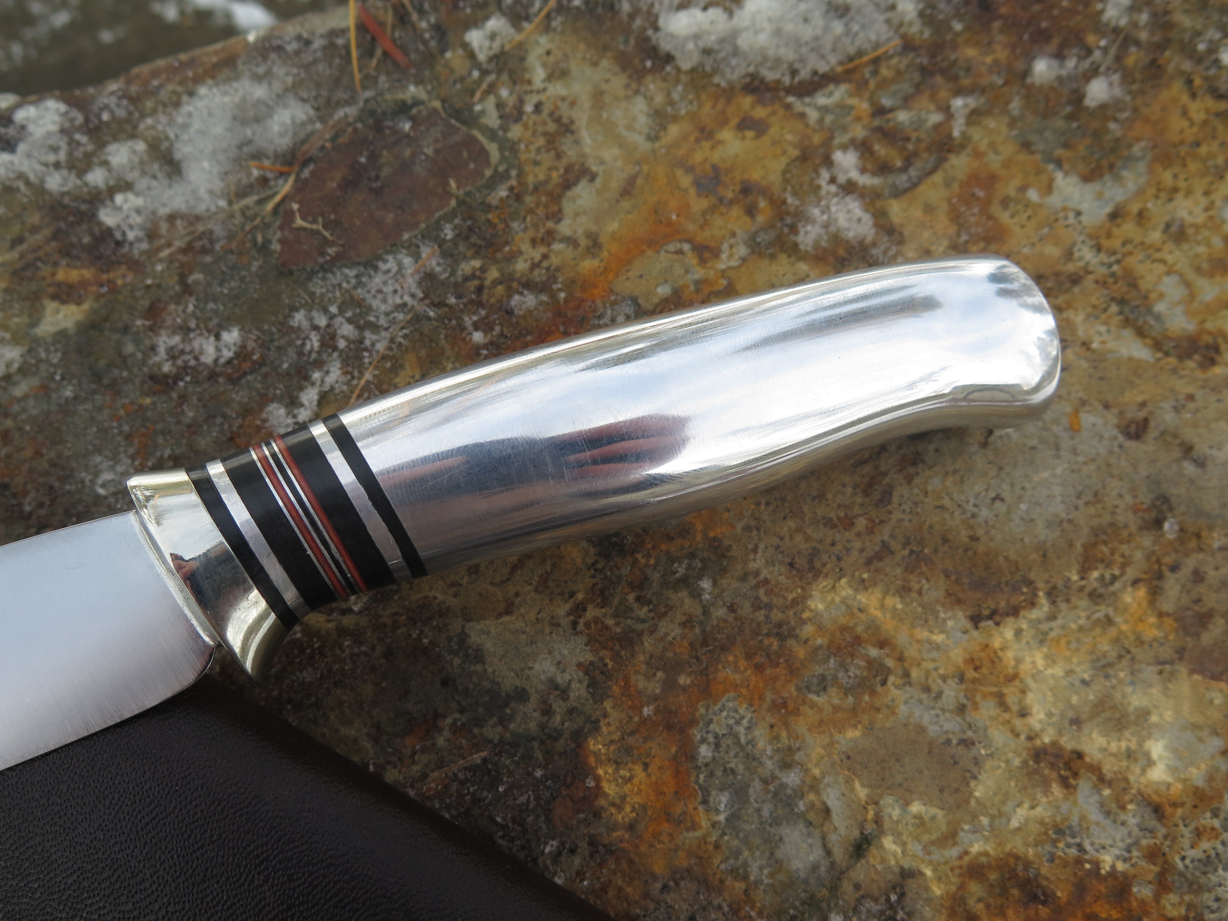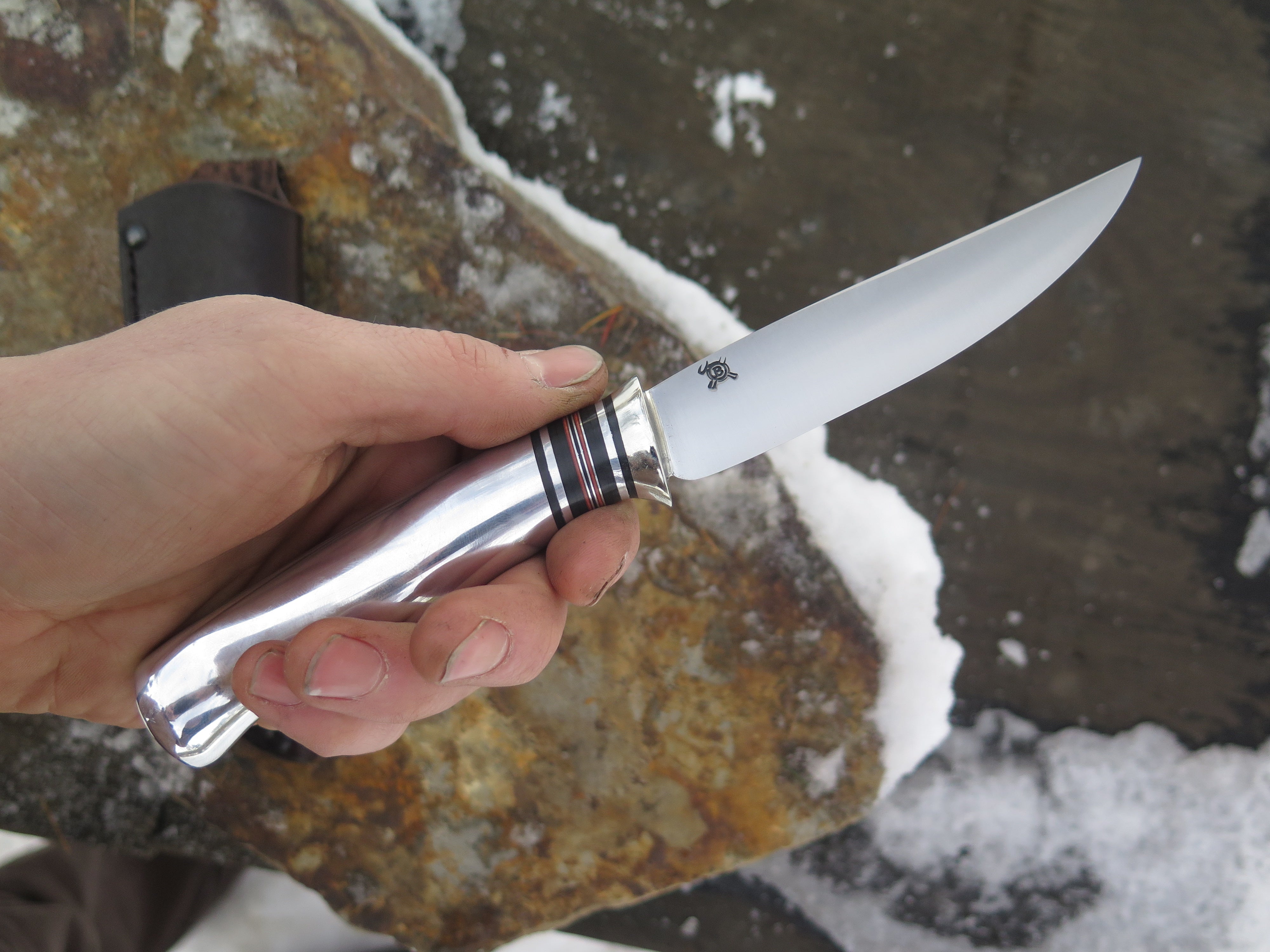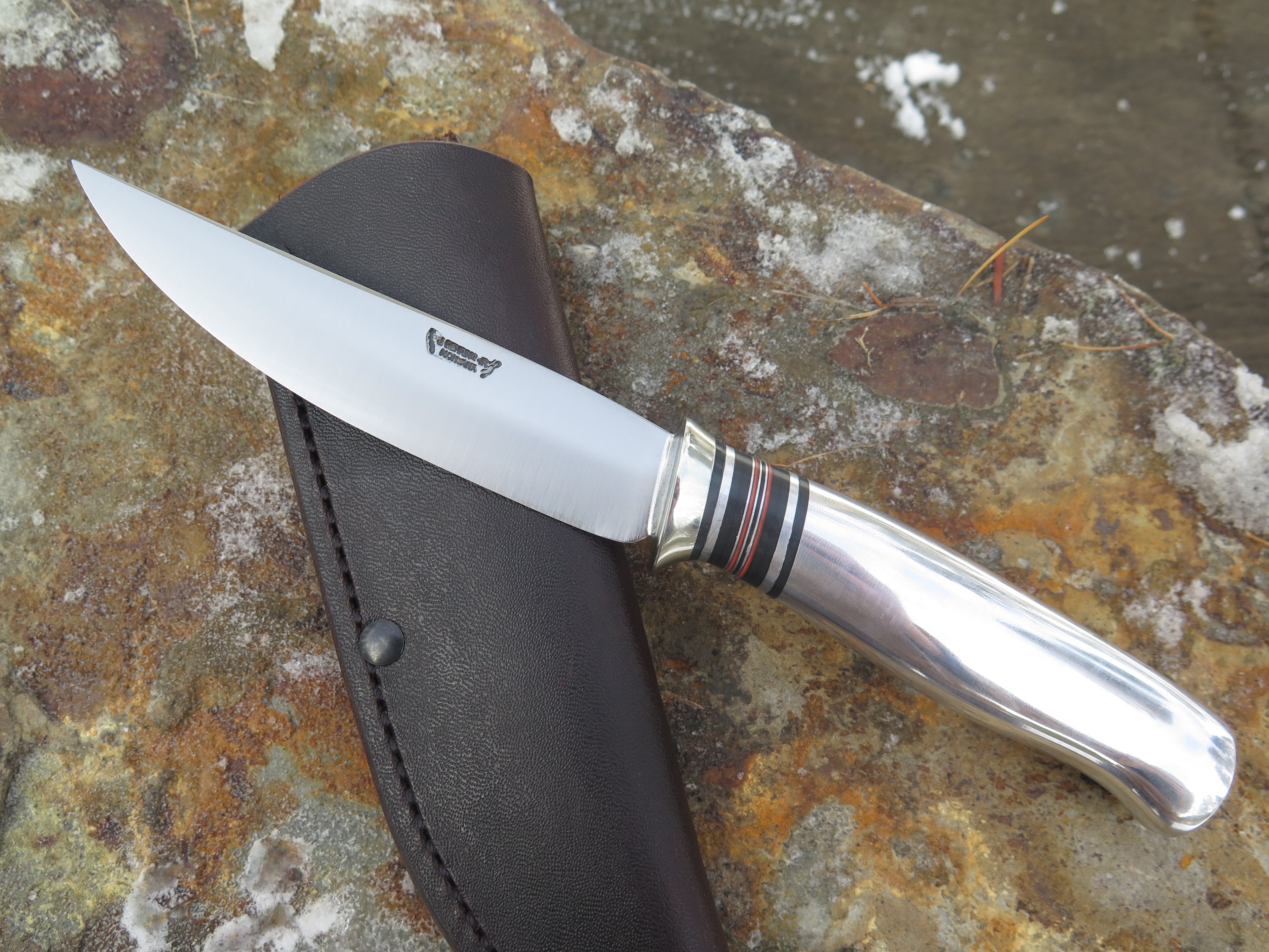 This unique Behring Made© Trout & Bird is hand forged from 1/8" thick high carbon 01 tool steel and it measures 4 3/4" from tip to guard with a razor sharp convex grind. The nickel silver guard is soldered in place above black, maroon and aluminum spacers which top a solid aluminum handle that's also pinned through the tang with, you guessed it, aluminum. The overall length measures 8 7/8" and it comes in a classic leather belt pouch sheath.