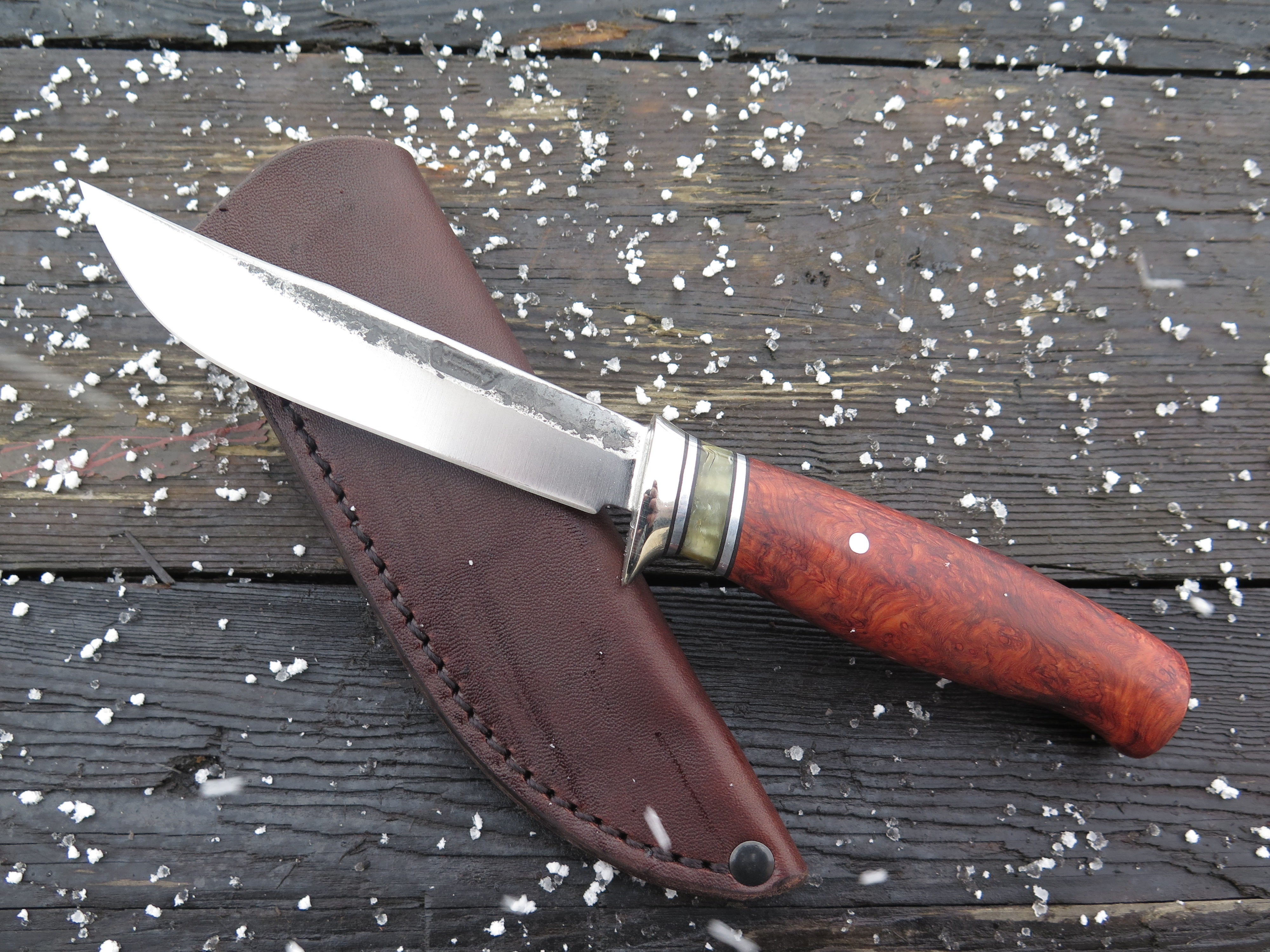 This incredible recurve Trout & Bird from Behring Made© is hand forged from 3/16" thick high carbon 01 tool steel and it measures 4 1/2" from tip to guard with a razor sharp hollow grind and our hammermark finish. The nickel silver guard is soldered in place above black fiber, aluminum and musk ox boss spacers above a wonderful handle of amboyna burl that's pinned through the tang with aluminum. The overall length measures 8 7/8" and it comes in a classic pouch style sheath.