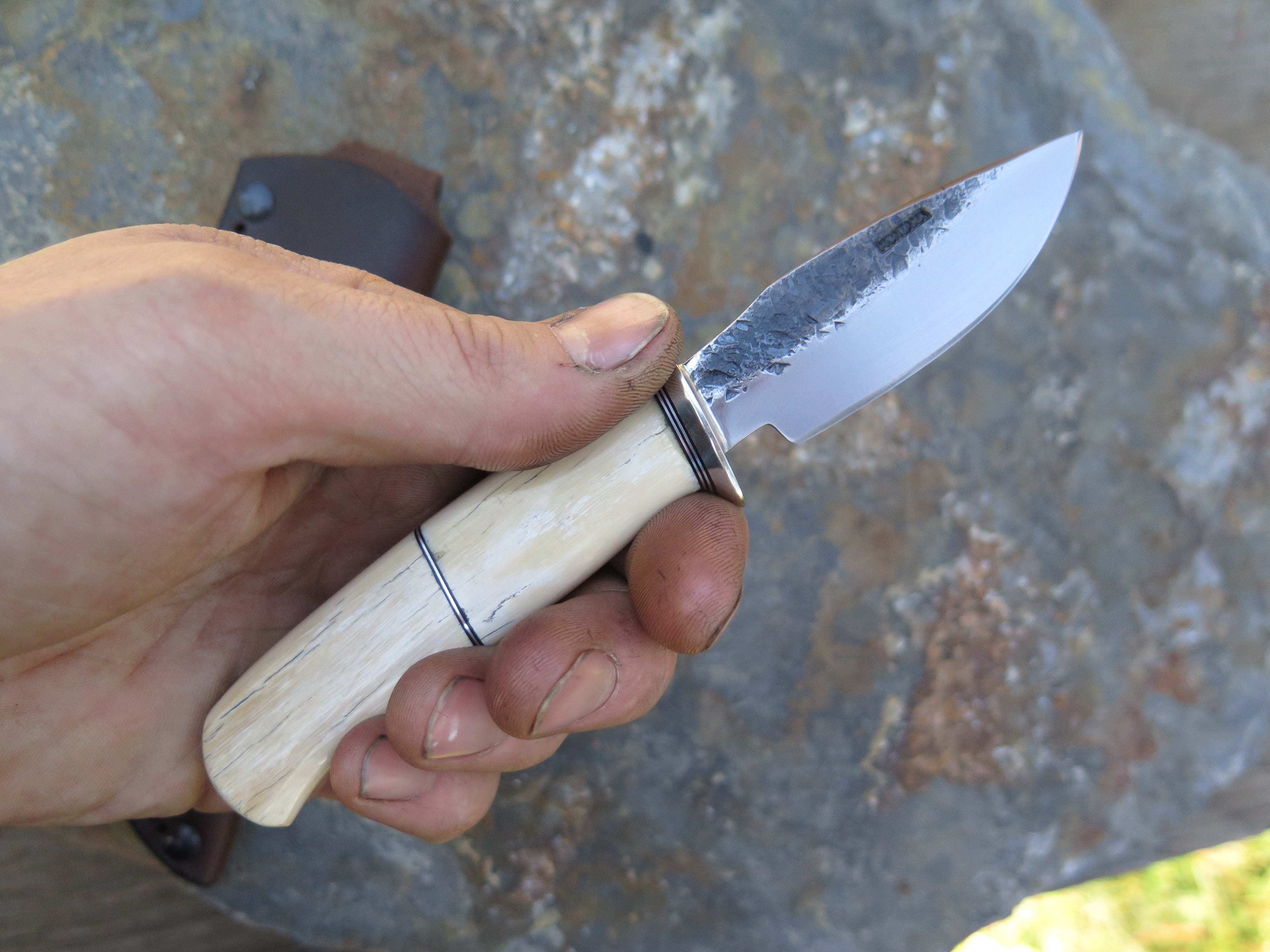 This beautiful new Alaskan from Behring Made© is hand forged from 1/8" thick high carbon 01 tool steel and it measures 2 3/4" from tip to guard with a razor sharp hollow grind and our hammermark finish. The nickel silver guard is soldered in place above black and aluminum spacers as well as a two-piece construction of ancient mammoth ivory. The overall length measures 6 1/4" and it comes in a classic leather belt pouch sheath.
