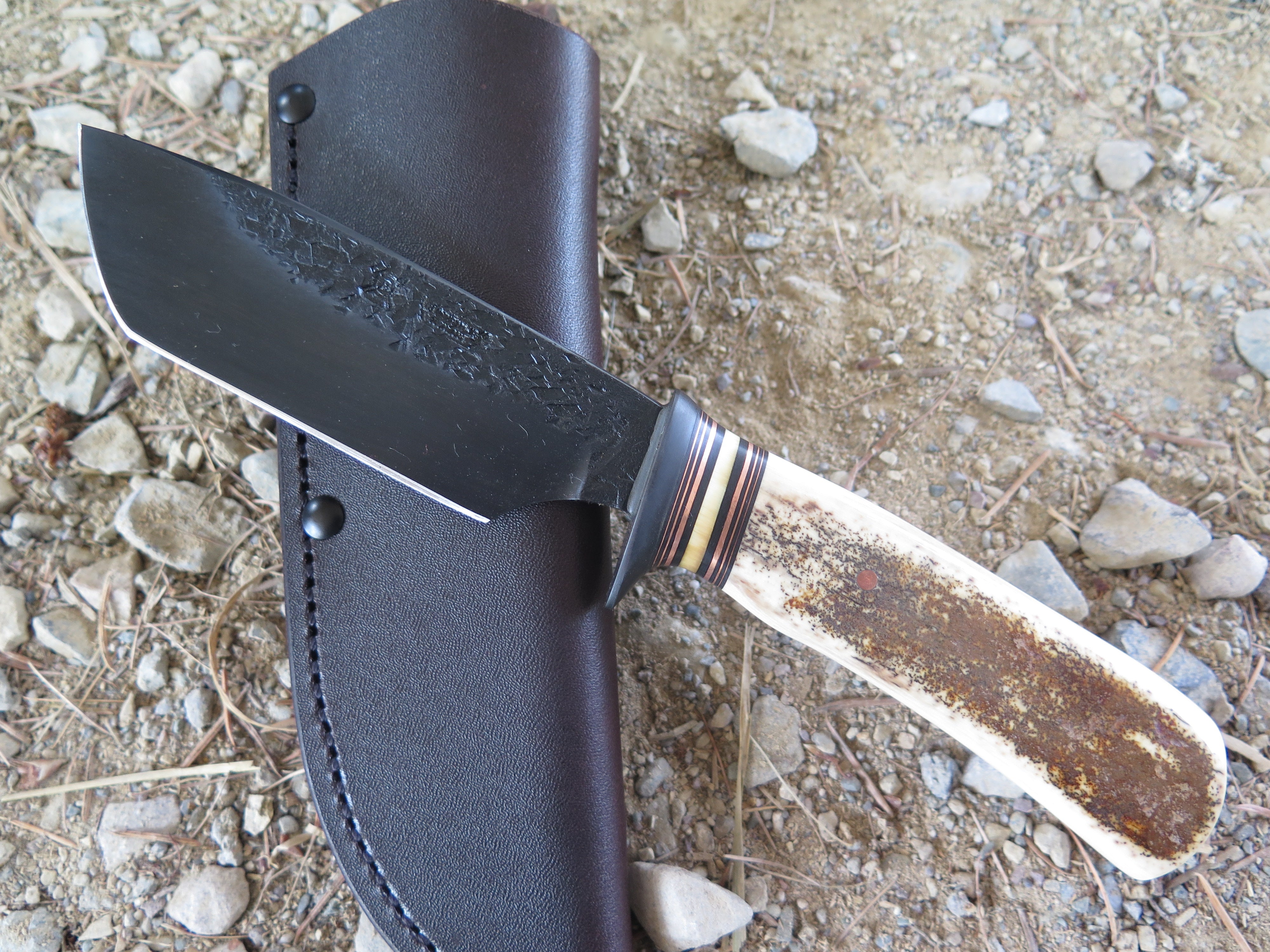 This outstanding Tanto from Behring Made© is hand forged from 3/16" thick high carbon 01 tool steel and it measures 5 1/4" from tip to guard with a razor sharp hollow grind, hammermarks and our forced patina blued finish. The blued steel guard is soldered in place above black fiber, copper and mammoth ivory spacers in addition to a beautiful ancient mammoth ivory handle that brings the overall length to measure about 10". This one is an Archive listing so new orders will vary in figure, but satisfaction is a guarantee! This one ships in a classic brown leather belt pouch, though mods are available on request.