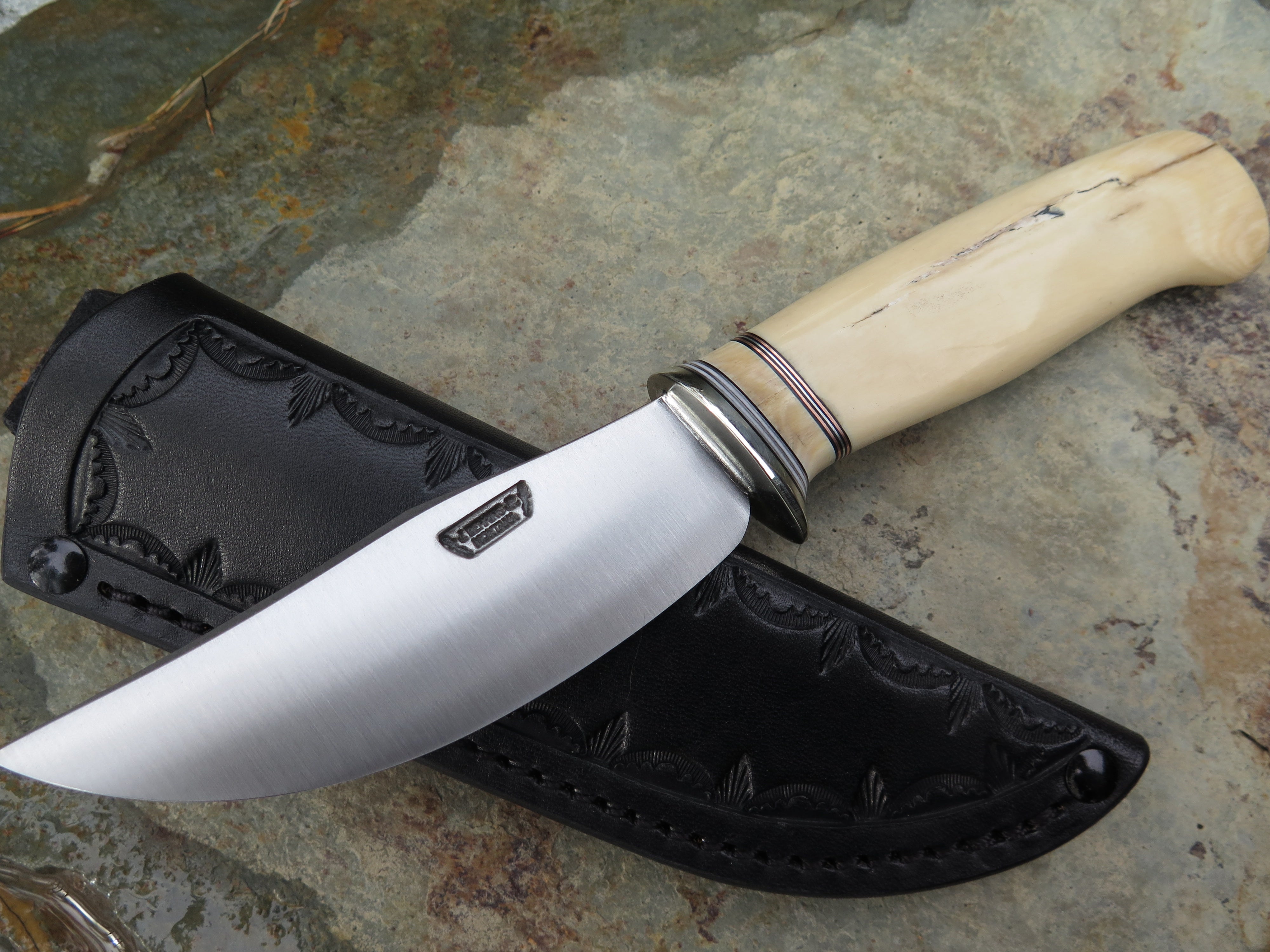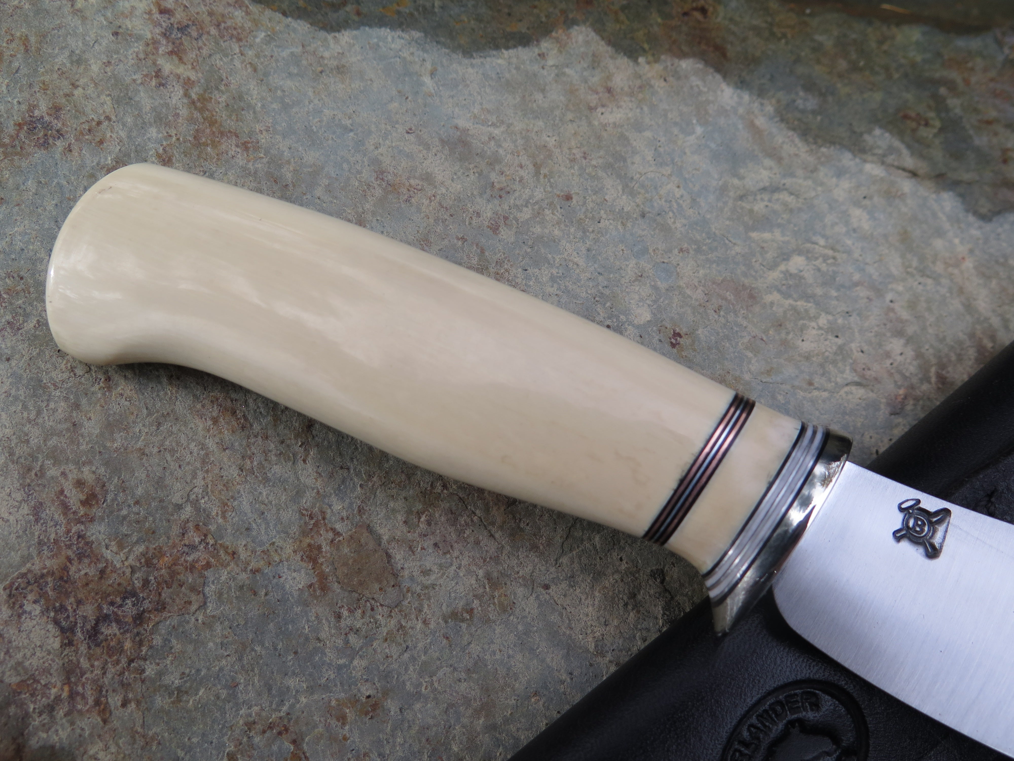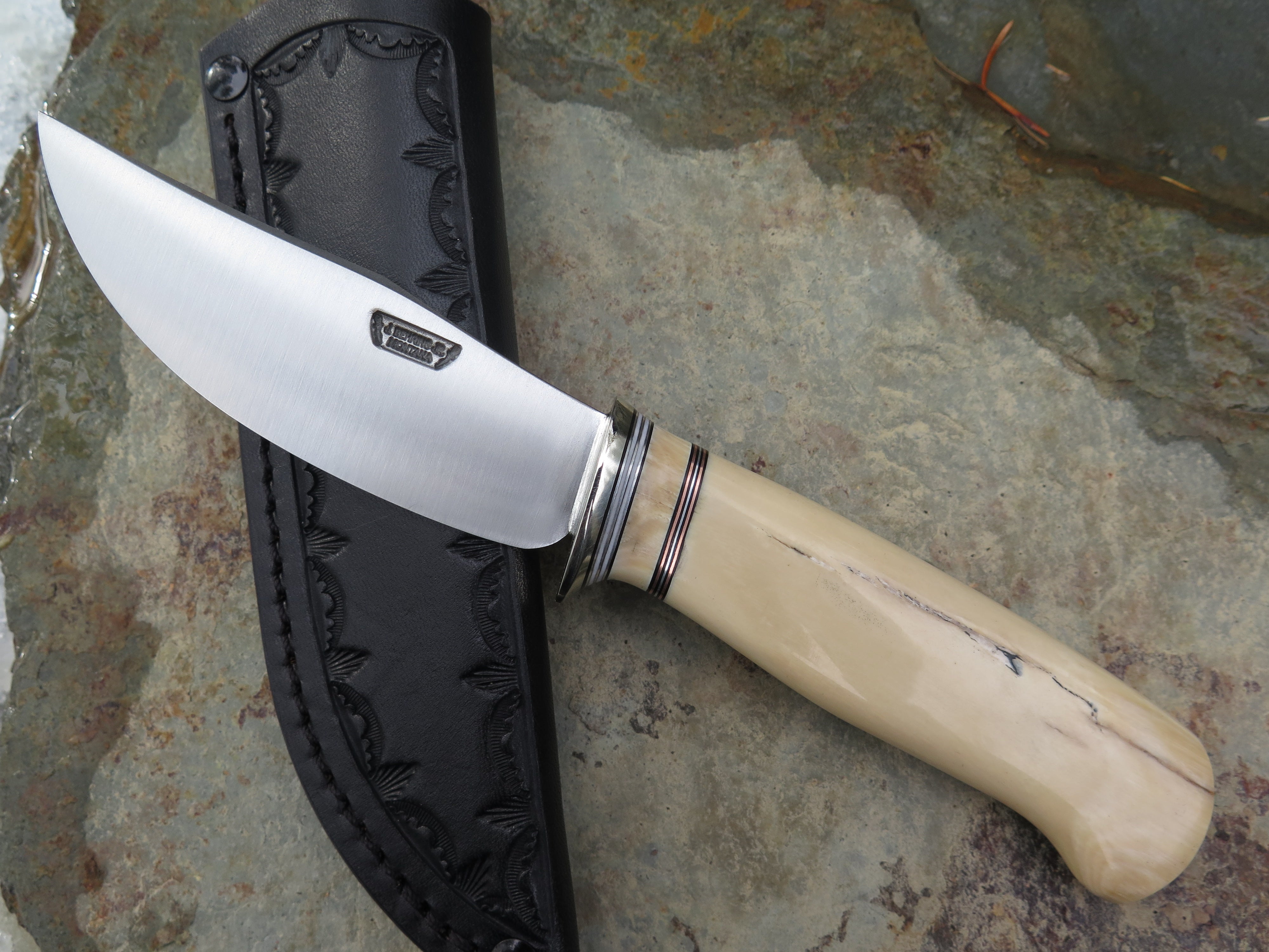 This beautiful new Behring Made© Clip Point is hand forged from 1/8" thick high carbon 01 tool steel and it measures 4" from tip to guard with a razor sharp convex grind. The nickel silver guard is soldered in place above black, white, copper, aluminum and ancient mammoth spacers in addition to the creamy ancient mammoth ivory handle. The overall length measures just about 8 1/4" and it comes in a border tooled leather belt pouch sheath. Nice!