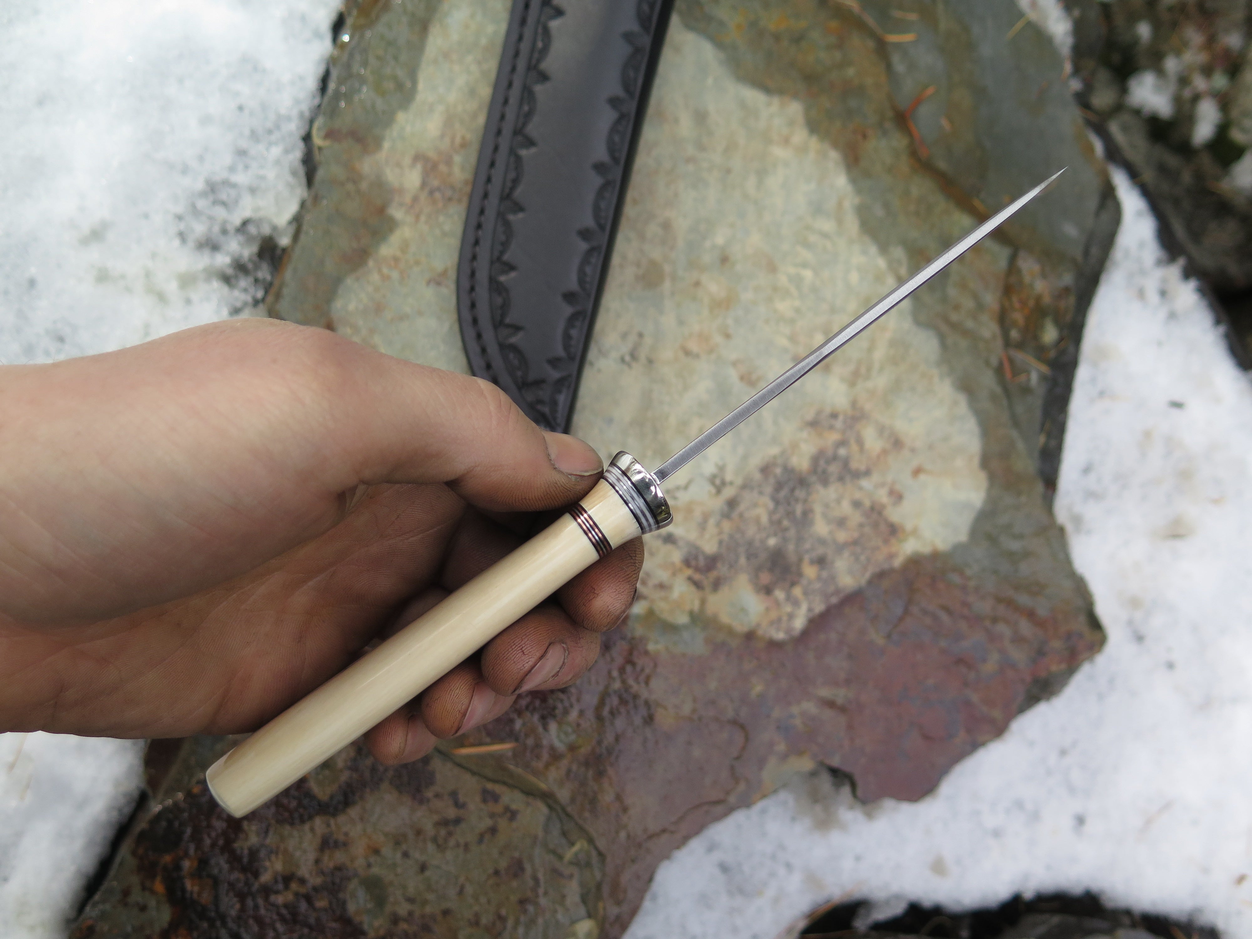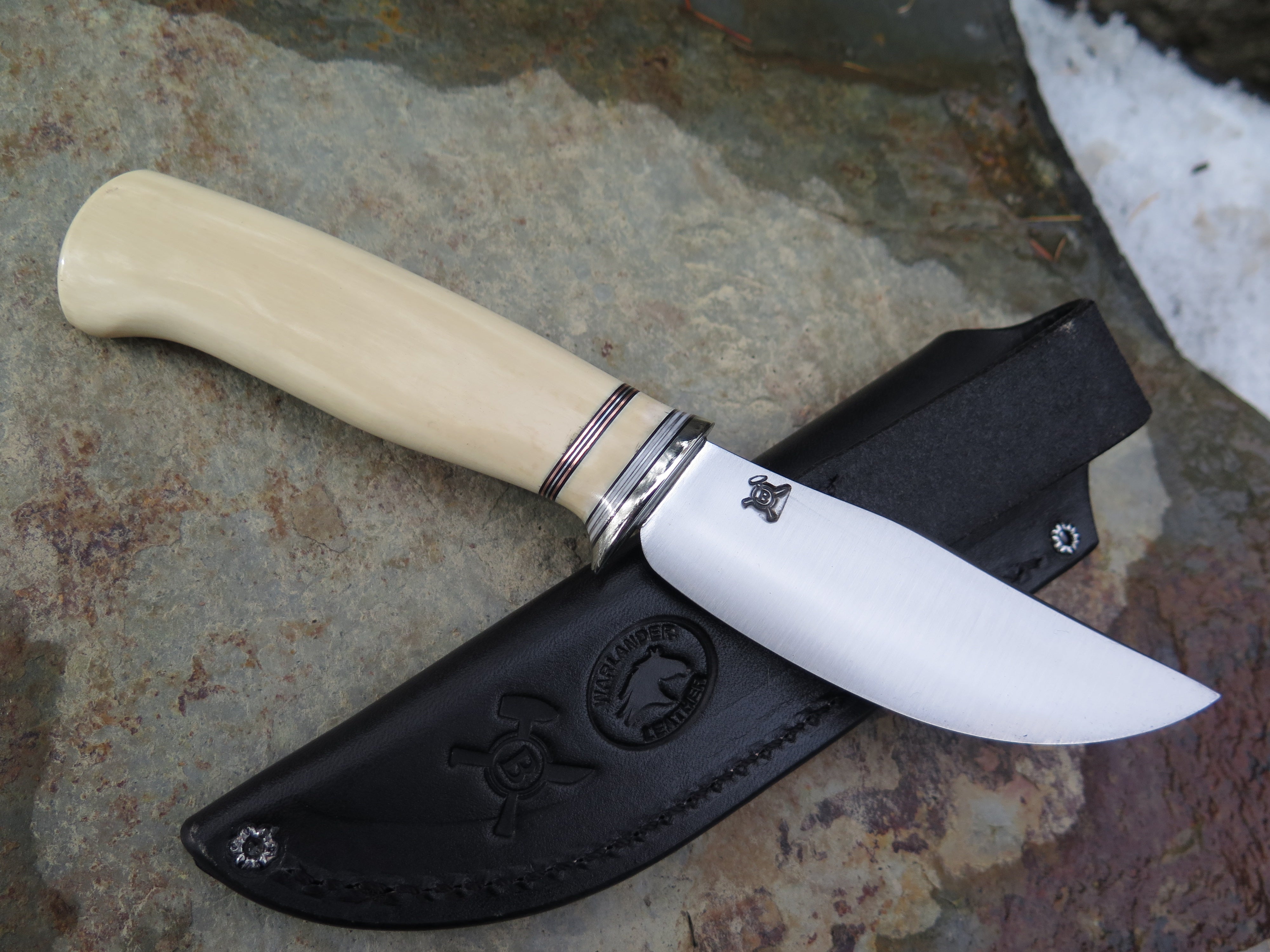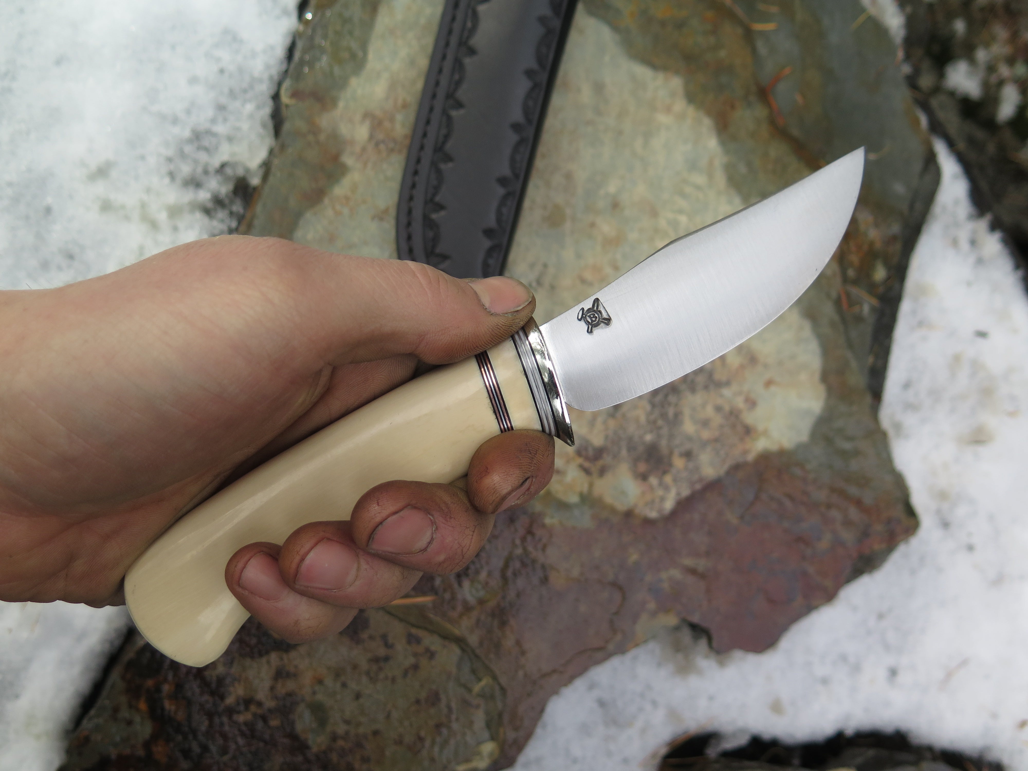 This beautiful new Behring Made© Clip Point is hand forged from 1/8" thick high carbon 01 tool steel and it measures 4" from tip to guard with a razor sharp convex grind. The nickel silver guard is soldered in place above black, white, copper, aluminum and ancient mammoth spacers in addition to the creamy ancient mammoth ivory handle. The overall length measures just about 8 1/4" and it comes in a border tooled leather belt pouch sheath. Nice!