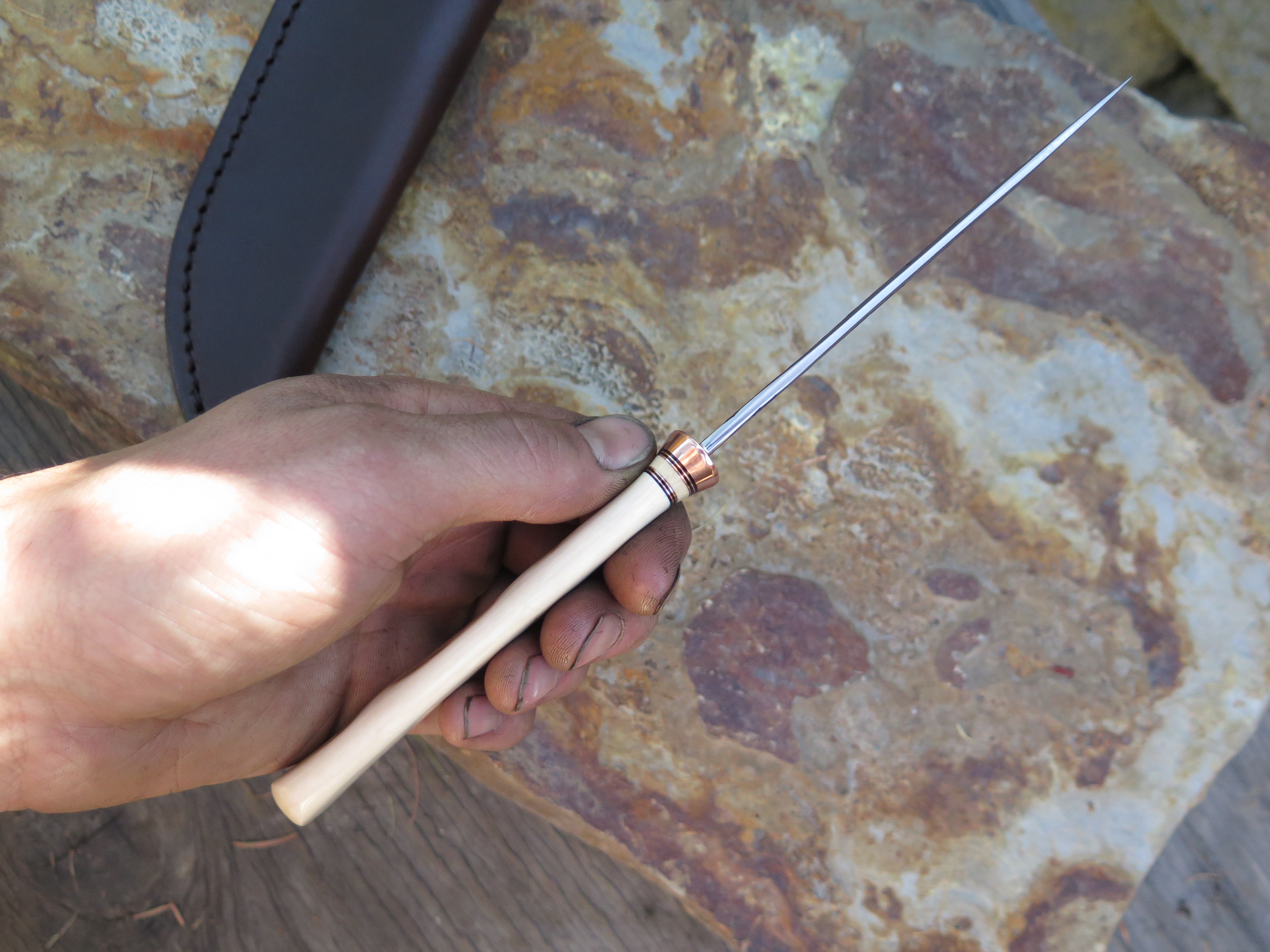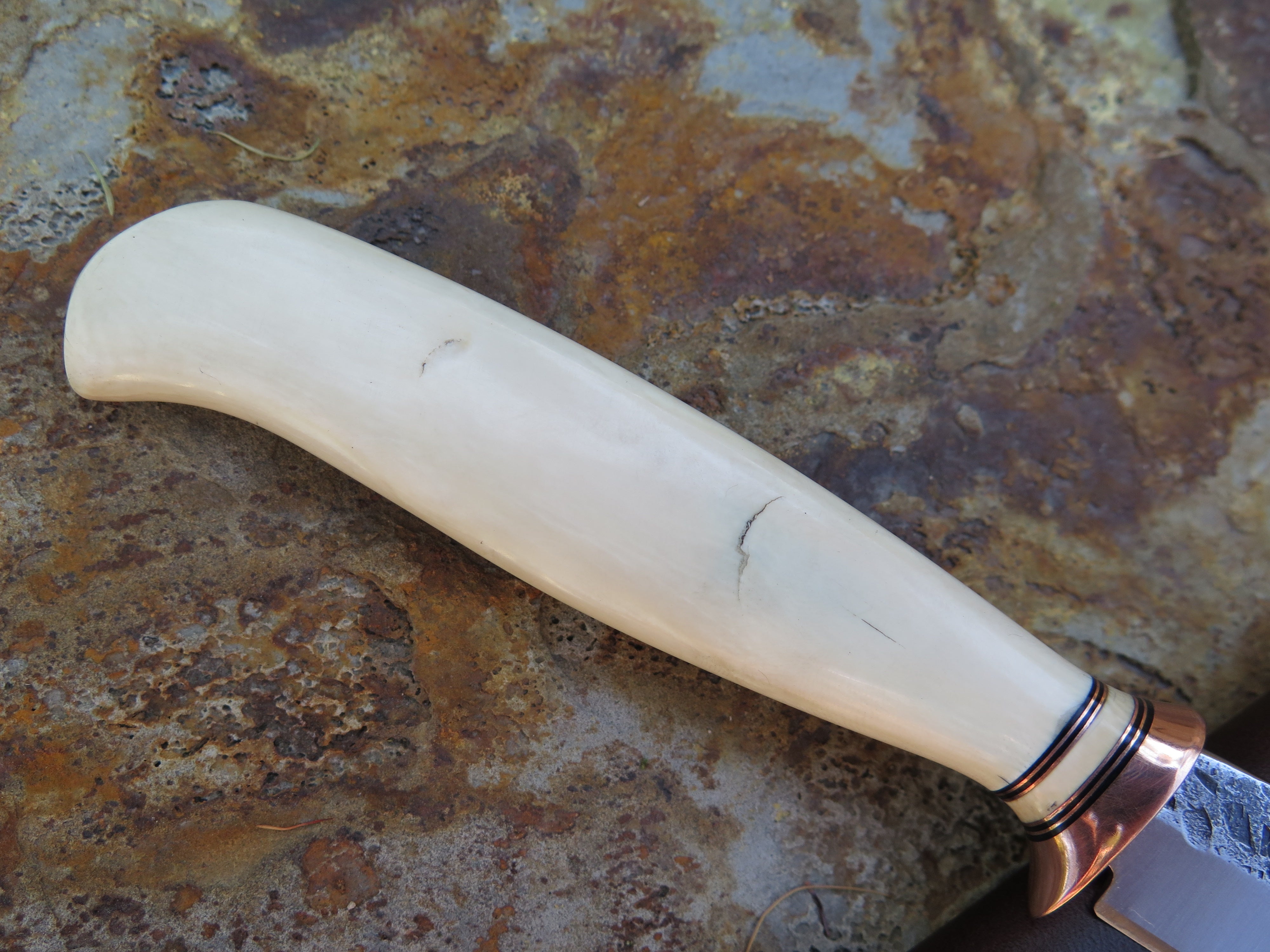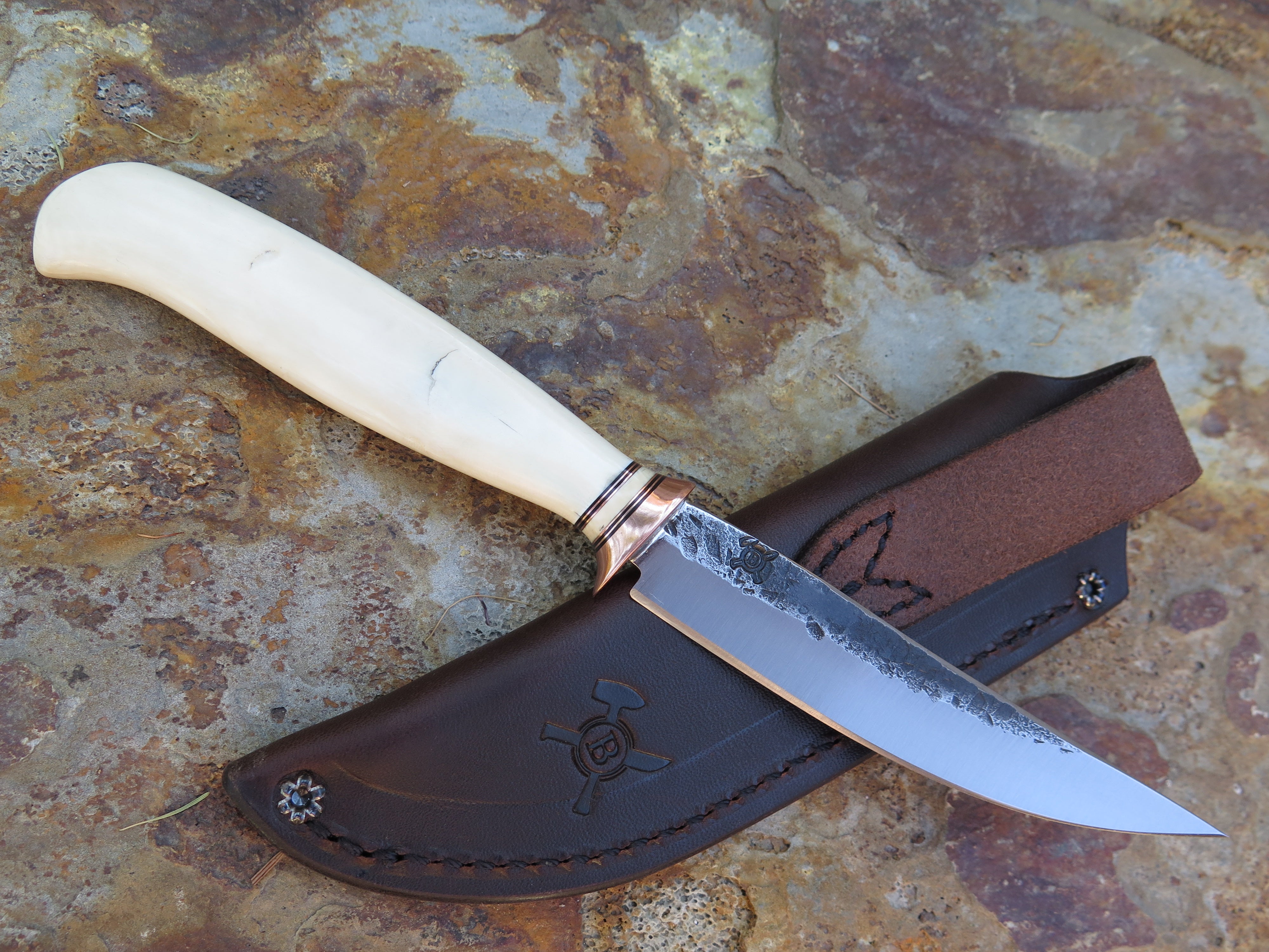 This beautiful new Behring Made© Pintail is hand forged from 1/8" thick high carbon 01 tool steel and it measures 4 1/2" from tip to guard with a razor sharp hollow grind and our hammermark finish. The copper guard is soldered in place above black fiber, copper and mammoth spacers as well as the full ancient mammoth handle with a primo figure and texture. The overall length measures 9" and it comes in a classic leather belt pouch sheath.