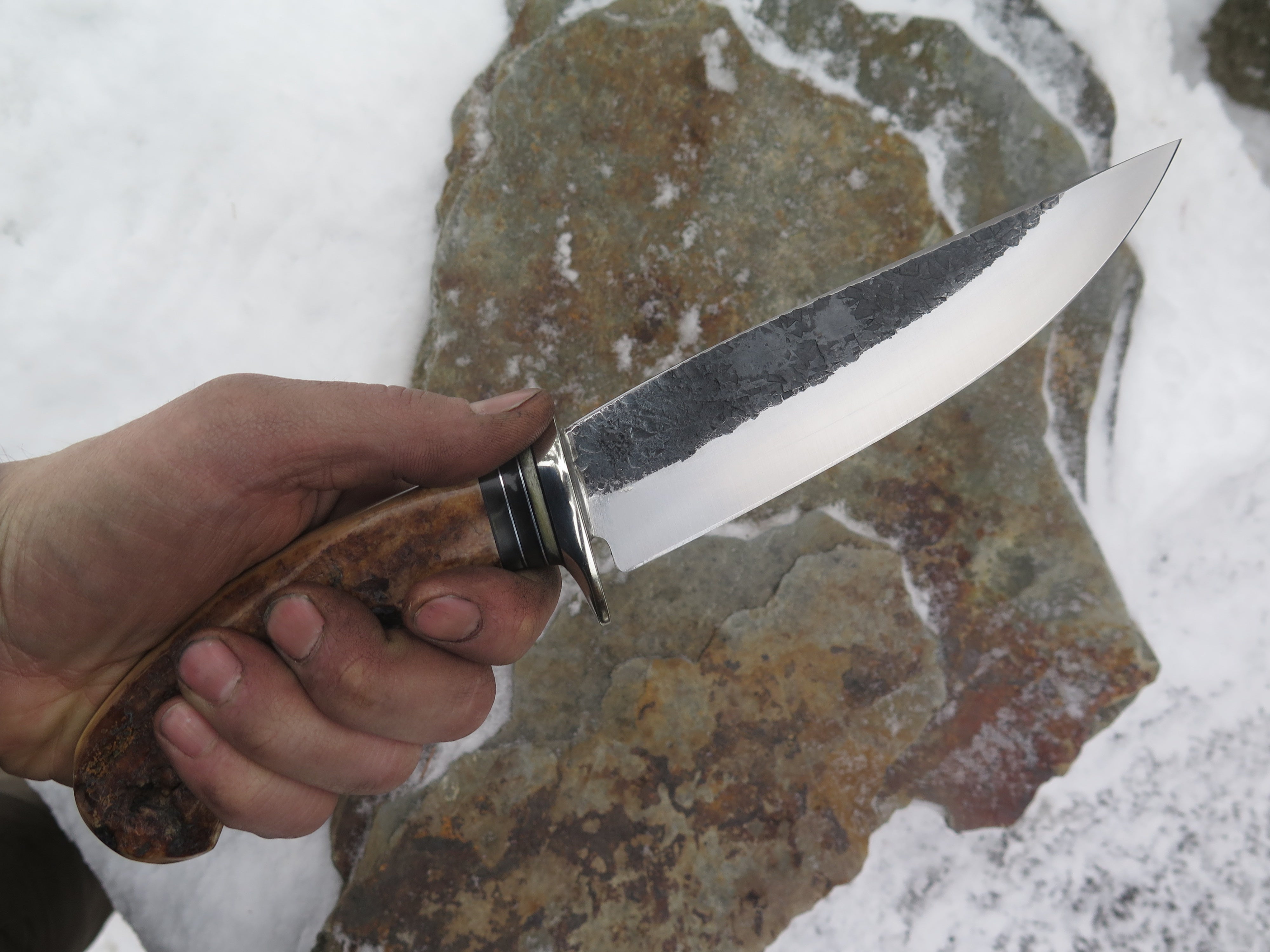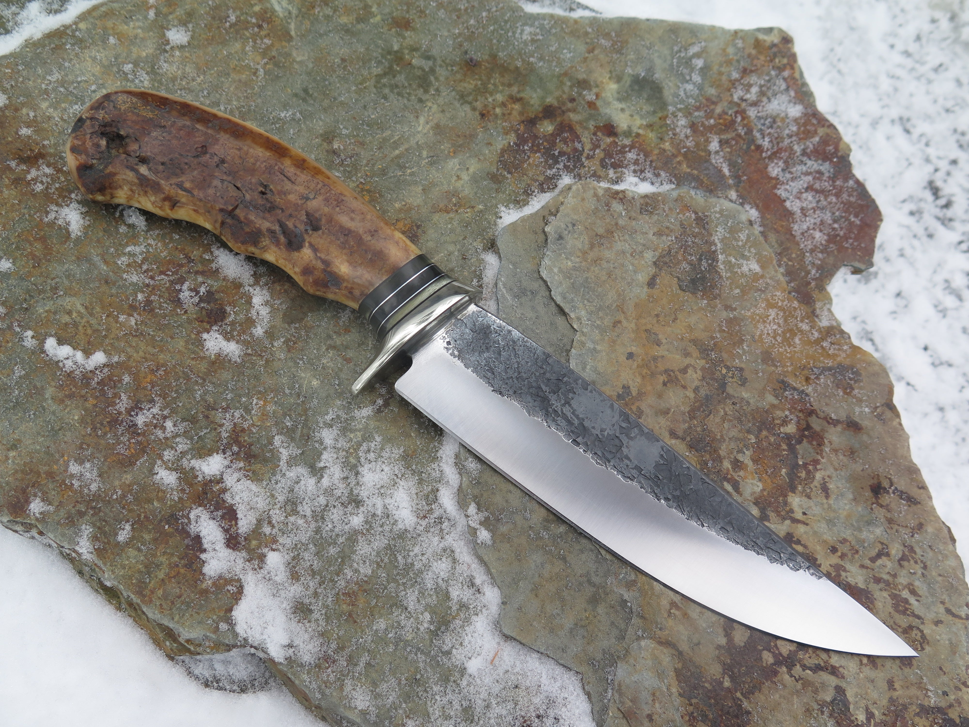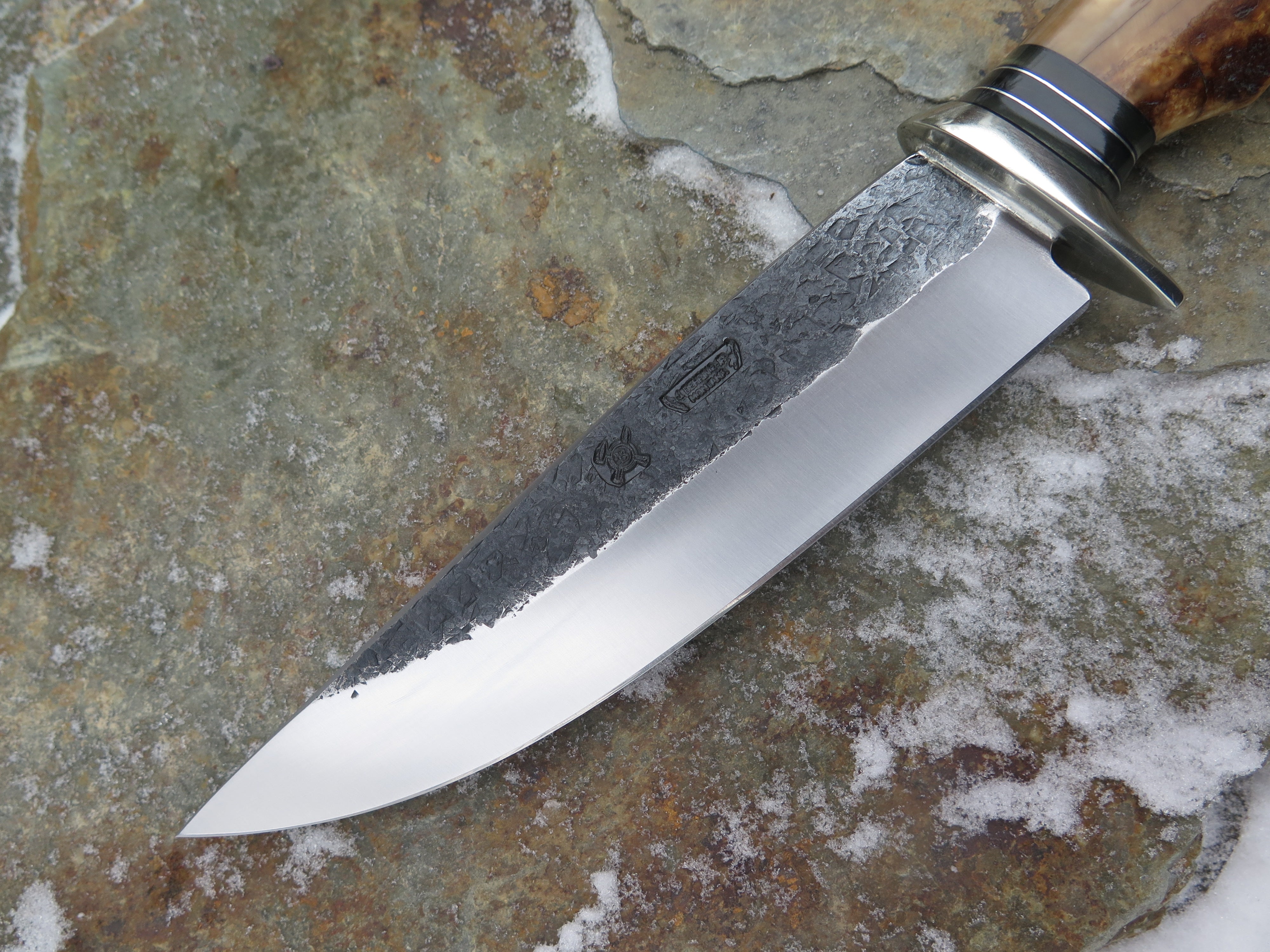 This bad ass new Camp Hunter from Behring Made© is hand forged from 3/16" thick high carbon 01 tool steel and it measures 6 1/2" from tip to guard with a razor sharp hollow grind and our hammermark finish. The nickel silver guard is soldered in place above black fiber, aluminum and three musk ox horn spacers as well as a beautiful artifact walrus ivory handle. The overall length measures 11 1/8" and it will come in a custom Warlander Leather sheath.
