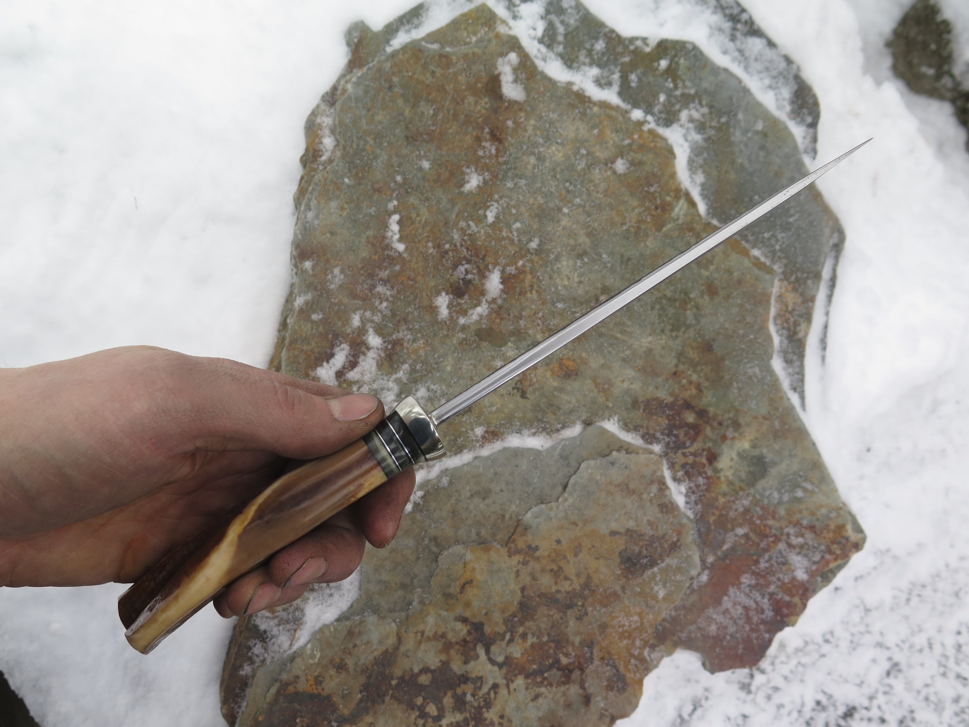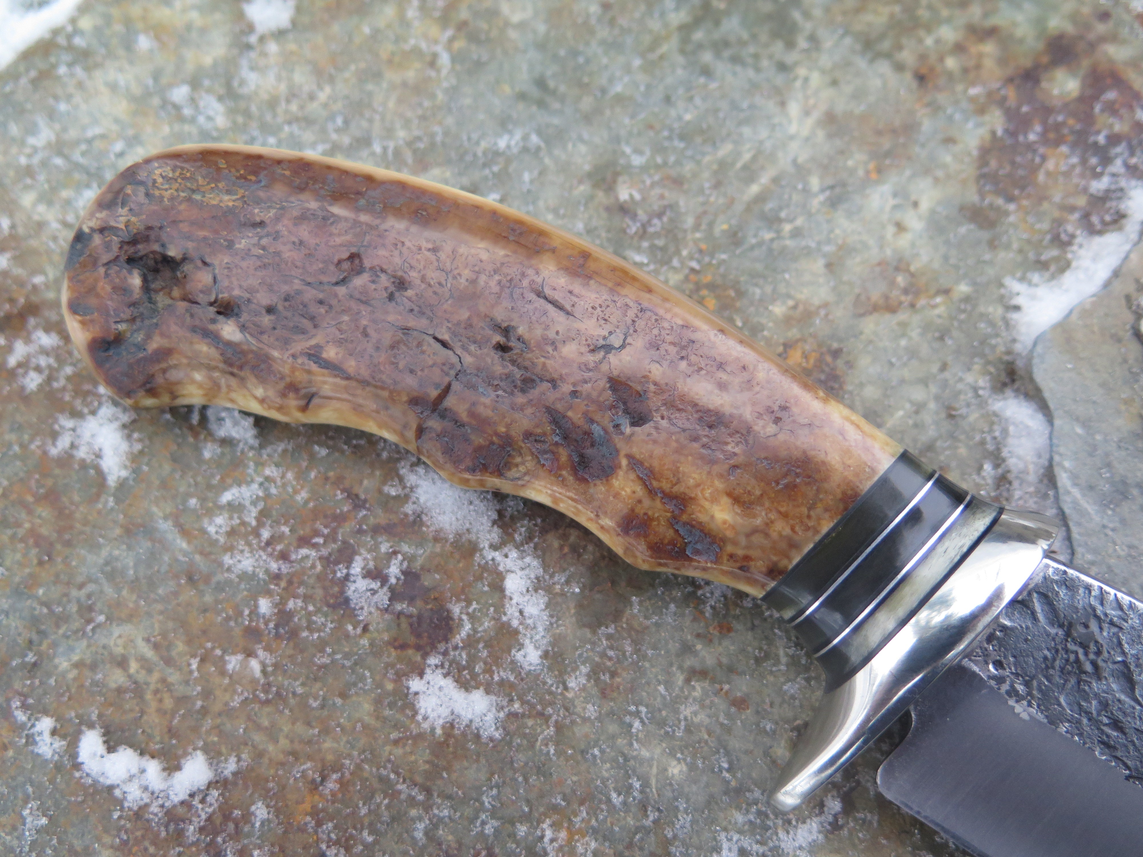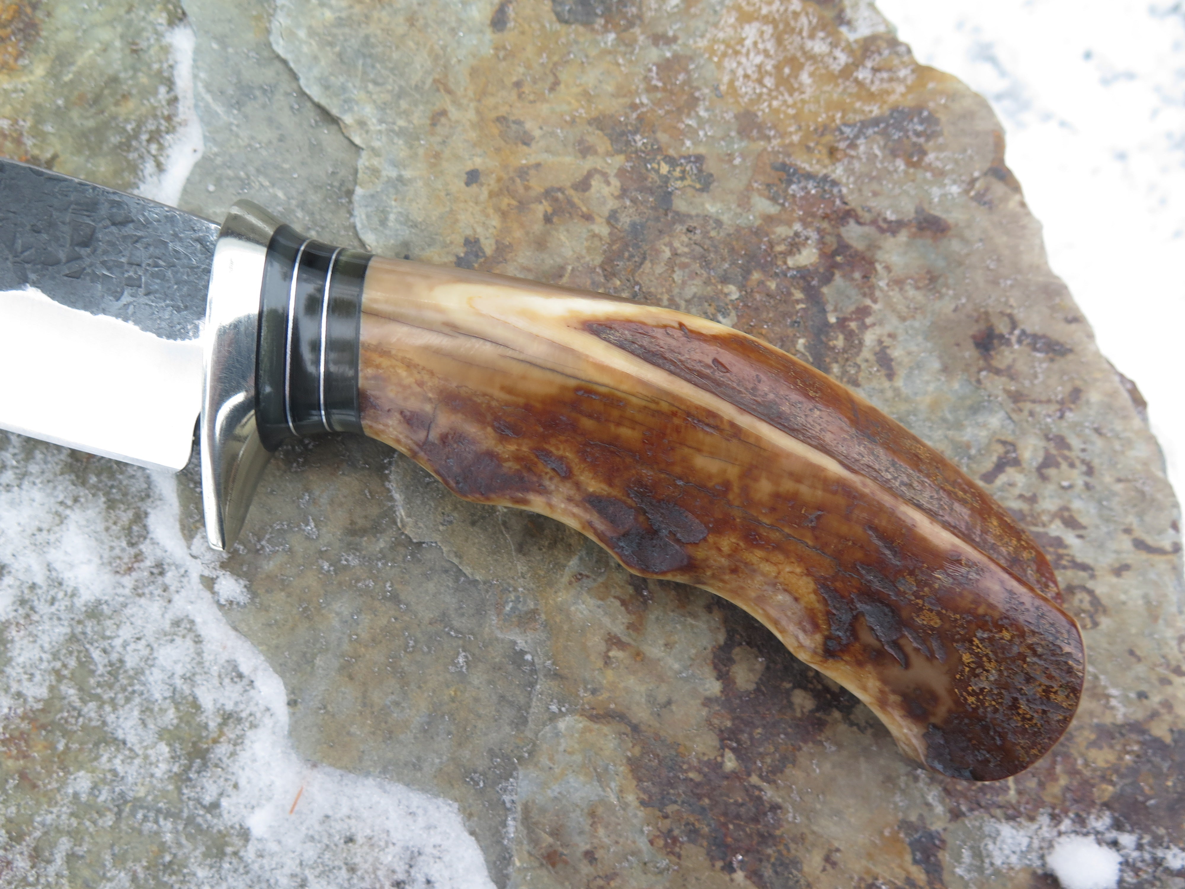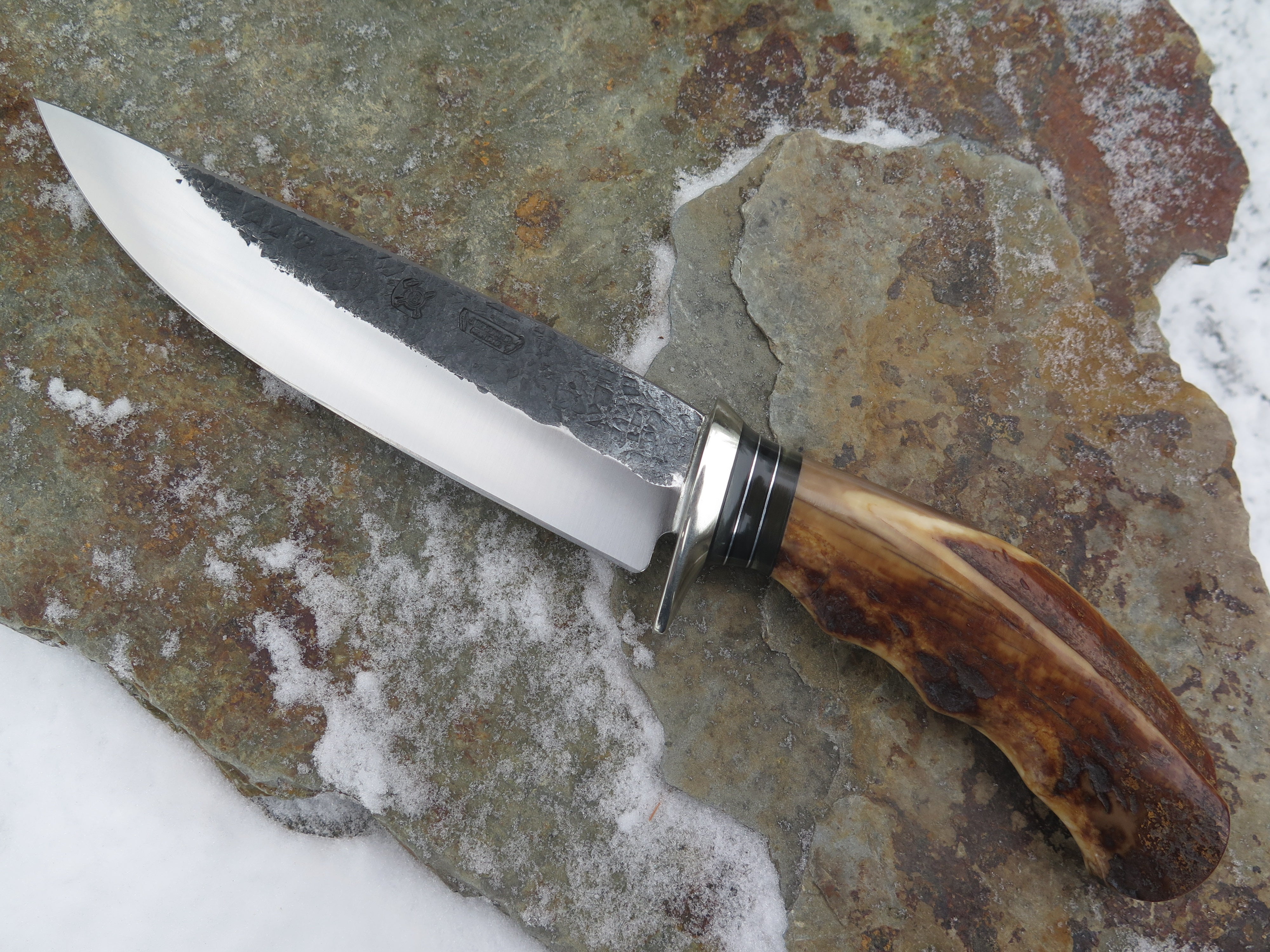 This bad ass new Camp Hunter from Behring Made© is hand forged from 3/16" thick high carbon 01 tool steel and it measures 6 1/2" from tip to guard with a razor sharp hollow grind and our hammermark finish. The nickel silver guard is soldered in place above black fiber, aluminum and three musk ox horn spacers as well as a beautiful artifact walrus ivory handle. The overall length measures 11 1/8" and it will come in a custom Warlander Leather sheath.
