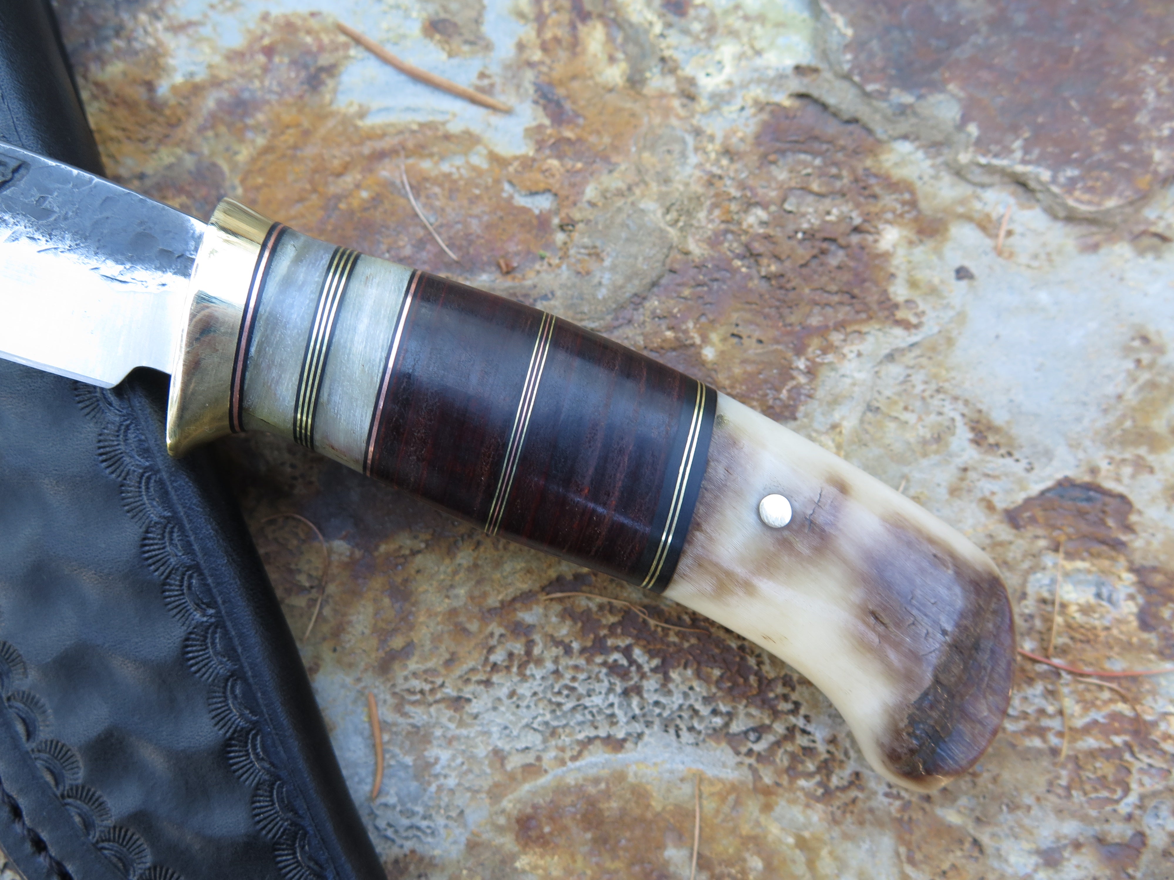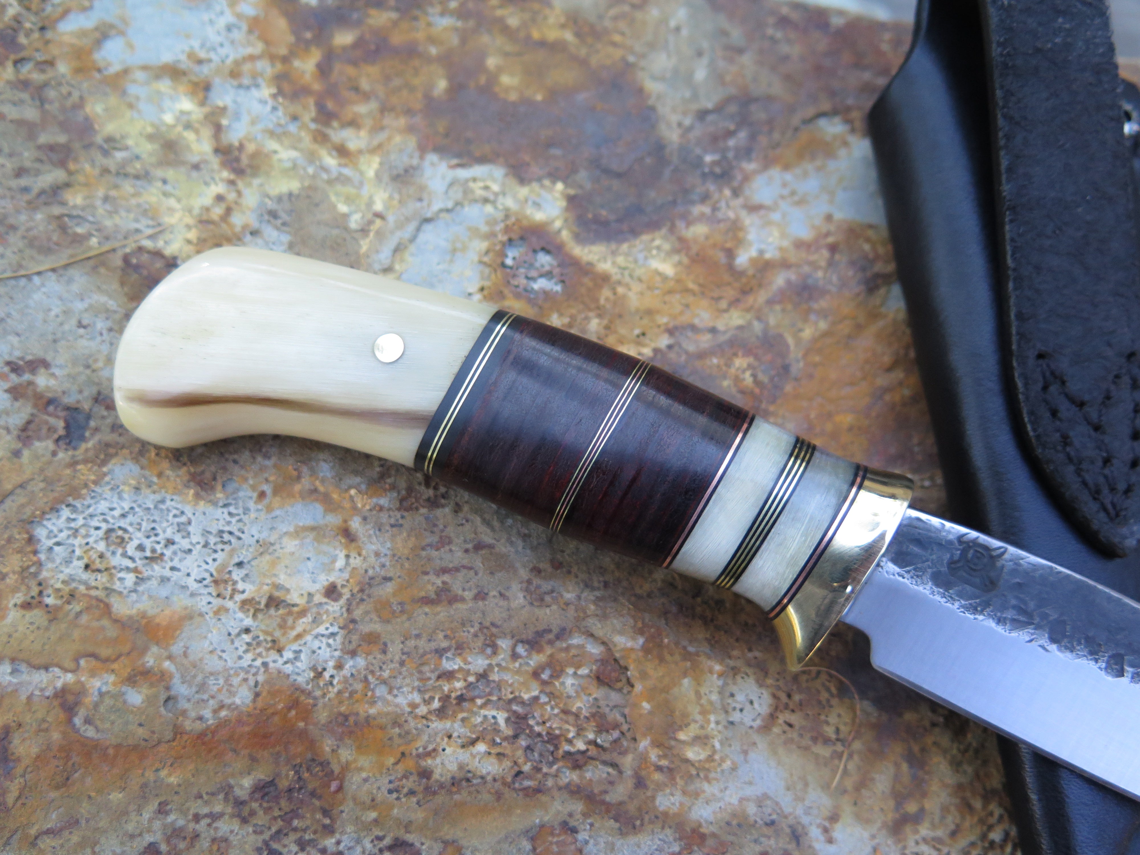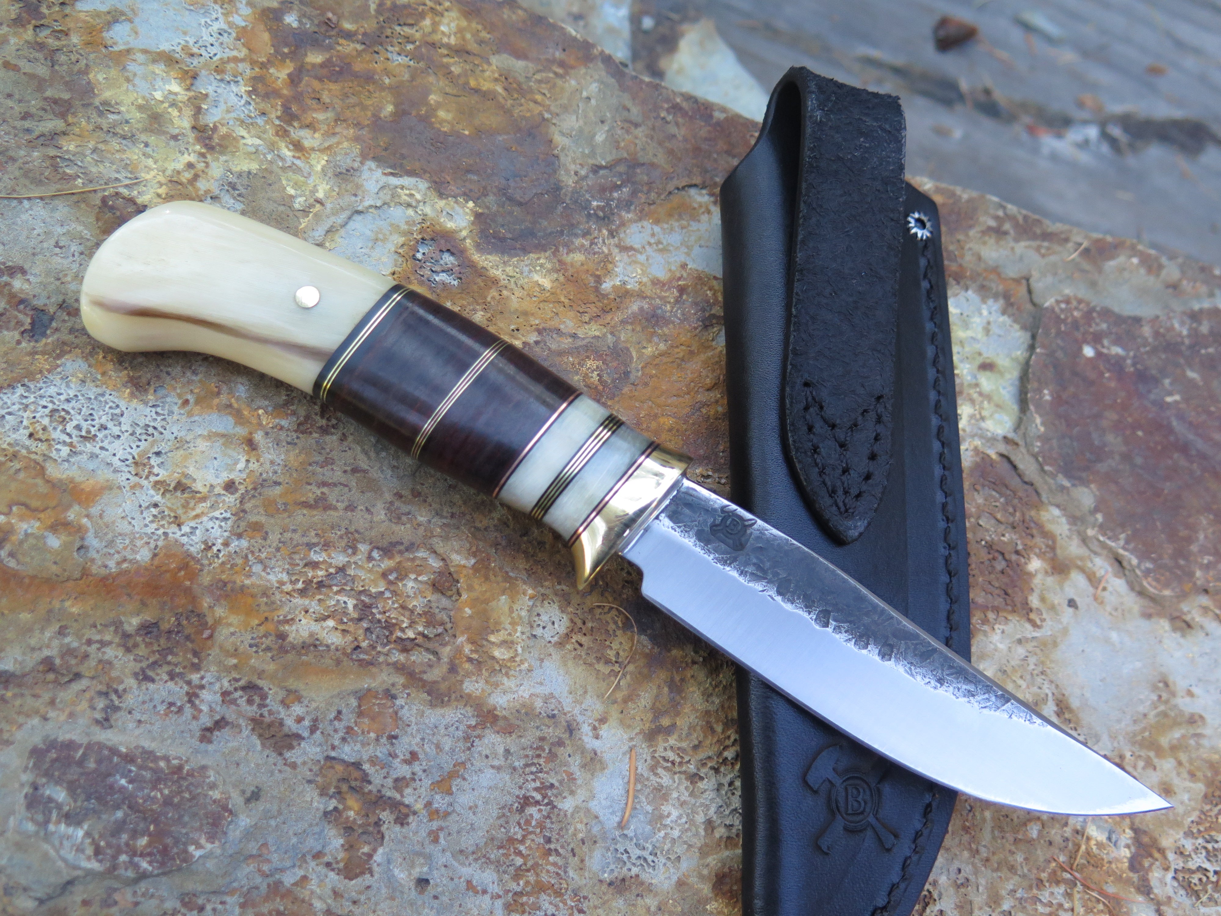 This new addition to the Pintail Archive from Behring Made© is hand forged from 1/8” thick high carbon 01 tool steel and it measures 4 1/4” from tip to guard with a razor sharp hollow grind and our hammermark finish. The brass guard is soldered in place above black, brass, copper and horsehide spacers with a two big horn sheep accents and a butt of the same that’s pinned through the tang with brass. The overall length measures just over 8 3/8” and it comes in premium tooled belt pouch sheath. Please allow 4-8 weeks for production and delivery. Material figure will vary, and we hand select so that we can guarantee satisfaction. Contact if you need more info or want to make changes.