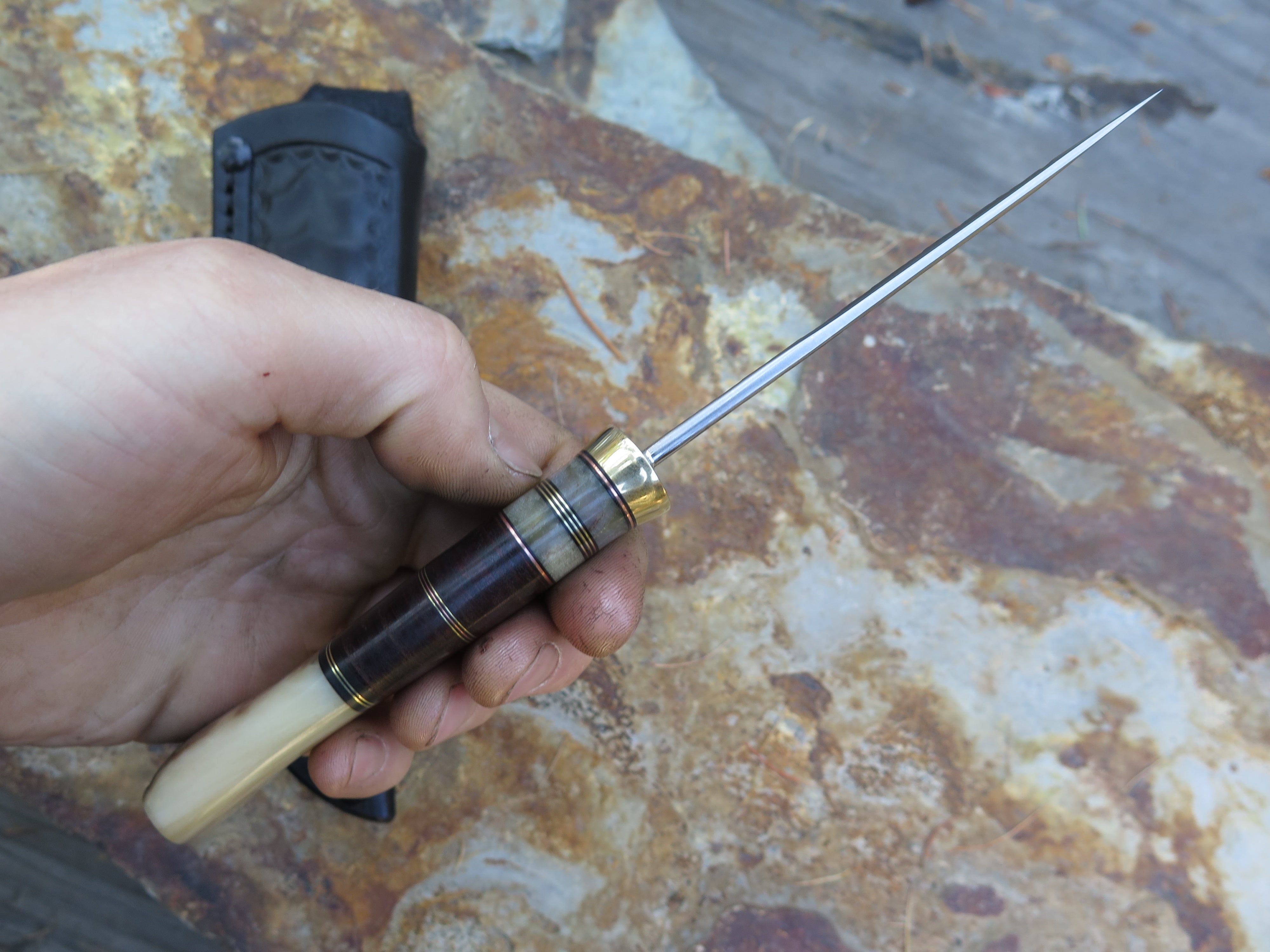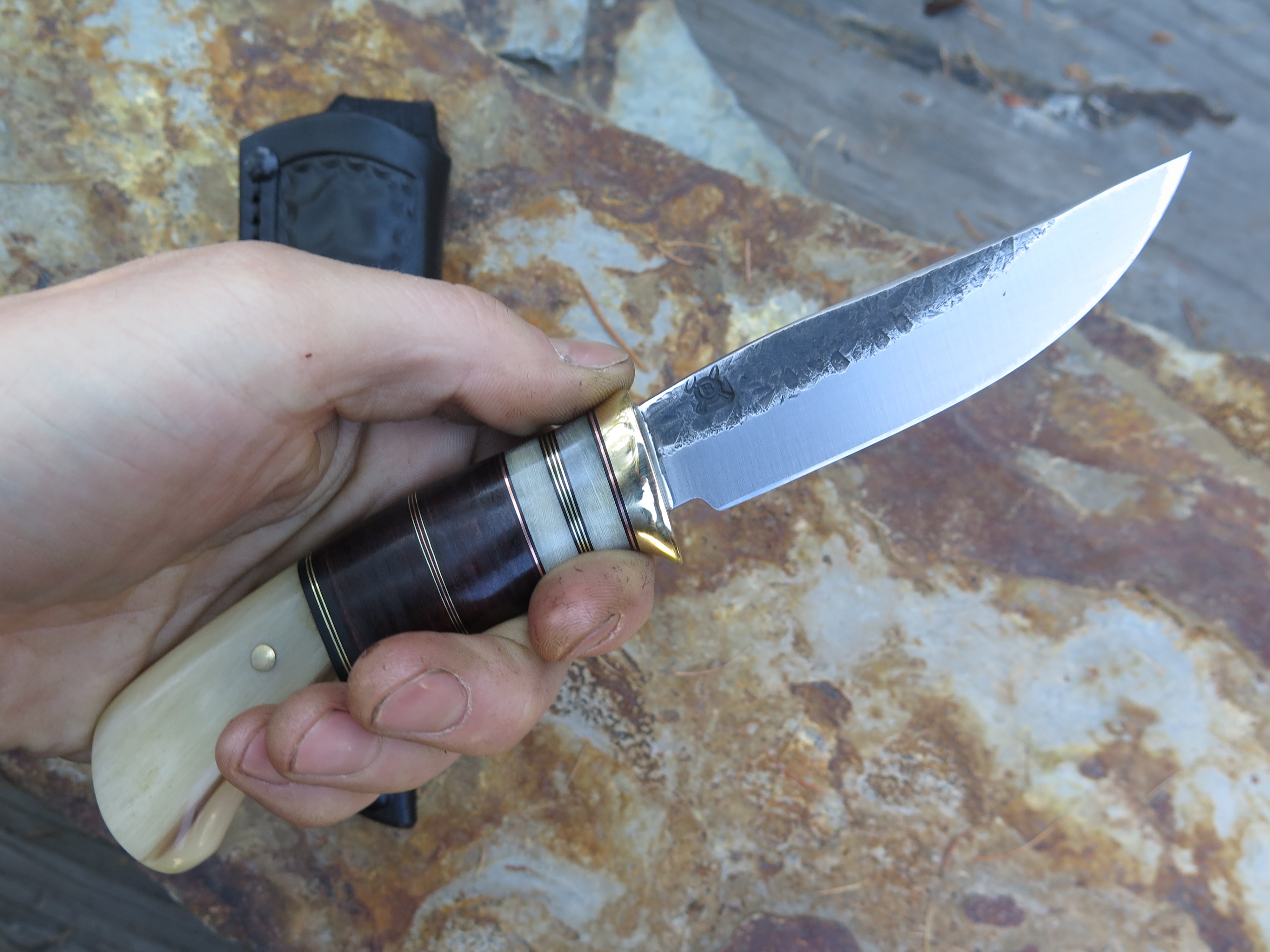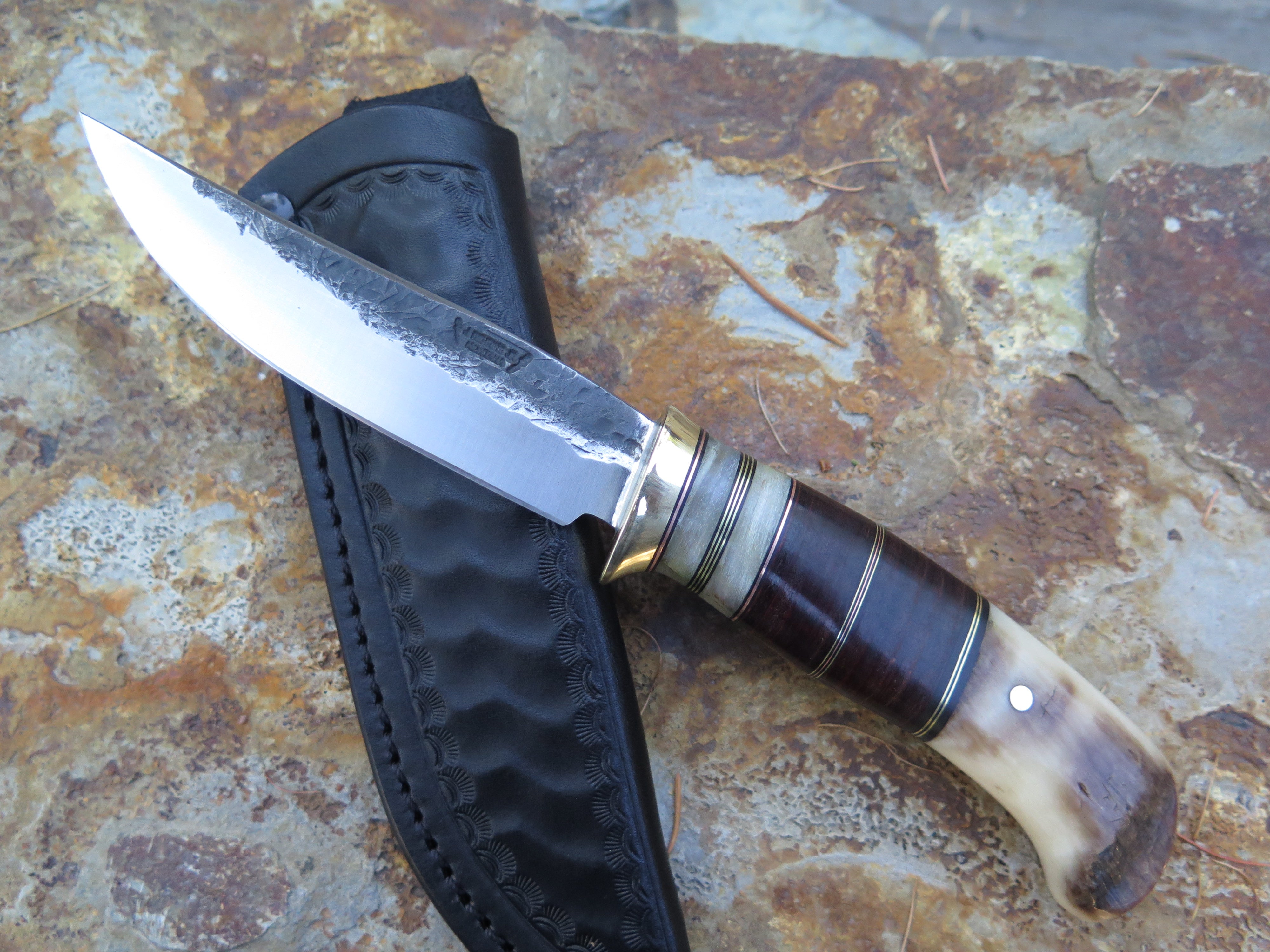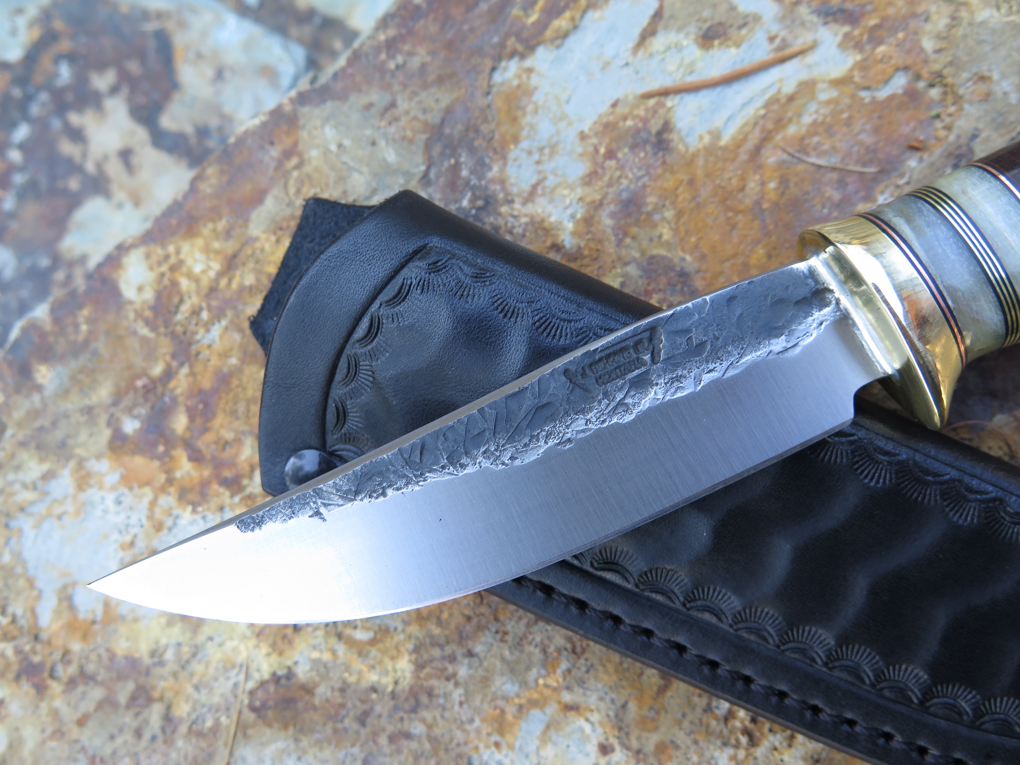This new addition to the Pintail Archive from Behring Made© is hand forged from 1/8” thick high carbon 01 tool steel and it measures 4 1/4” from tip to guard with a razor sharp hollow grind and our hammermark finish. The brass guard is soldered in place above black, brass, copper and horsehide spacers with a two big horn sheep accents and a butt of the same that’s pinned through the tang with brass. The overall length measures just over 8 3/8” and it comes in premium tooled belt pouch sheath. Please allow 4-8 weeks for production and delivery. Material figure will vary, and we hand select so that we can guarantee satisfaction. Contact if you need more info or want to make changes.