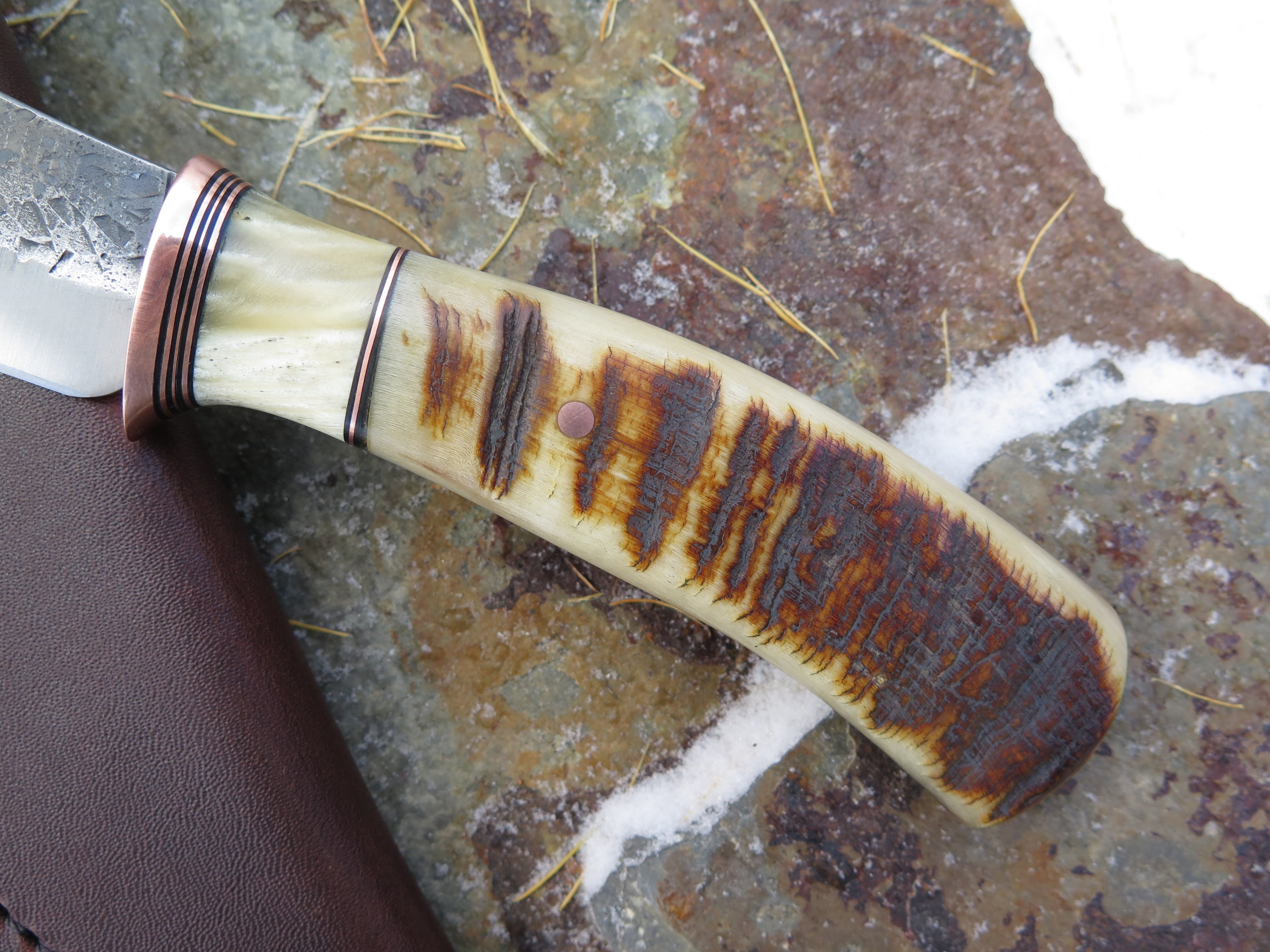 This beautiful new Clip Point from Behring Made© is hand forged from 1/8" thick high carbon 01 tool steel and measures 4 3/4" from tip to guard with a razor sharp hollow grind and our hammermark finish. The copper guard is soldered in place above black fiber and copper with musk ox boss spacers as well as a big horn sheep handle that is pinned through the tang with copper. The overall length measures 9 5/8" and it comes in the shown leather belt pouch sheath, though substitutions are available upon request.