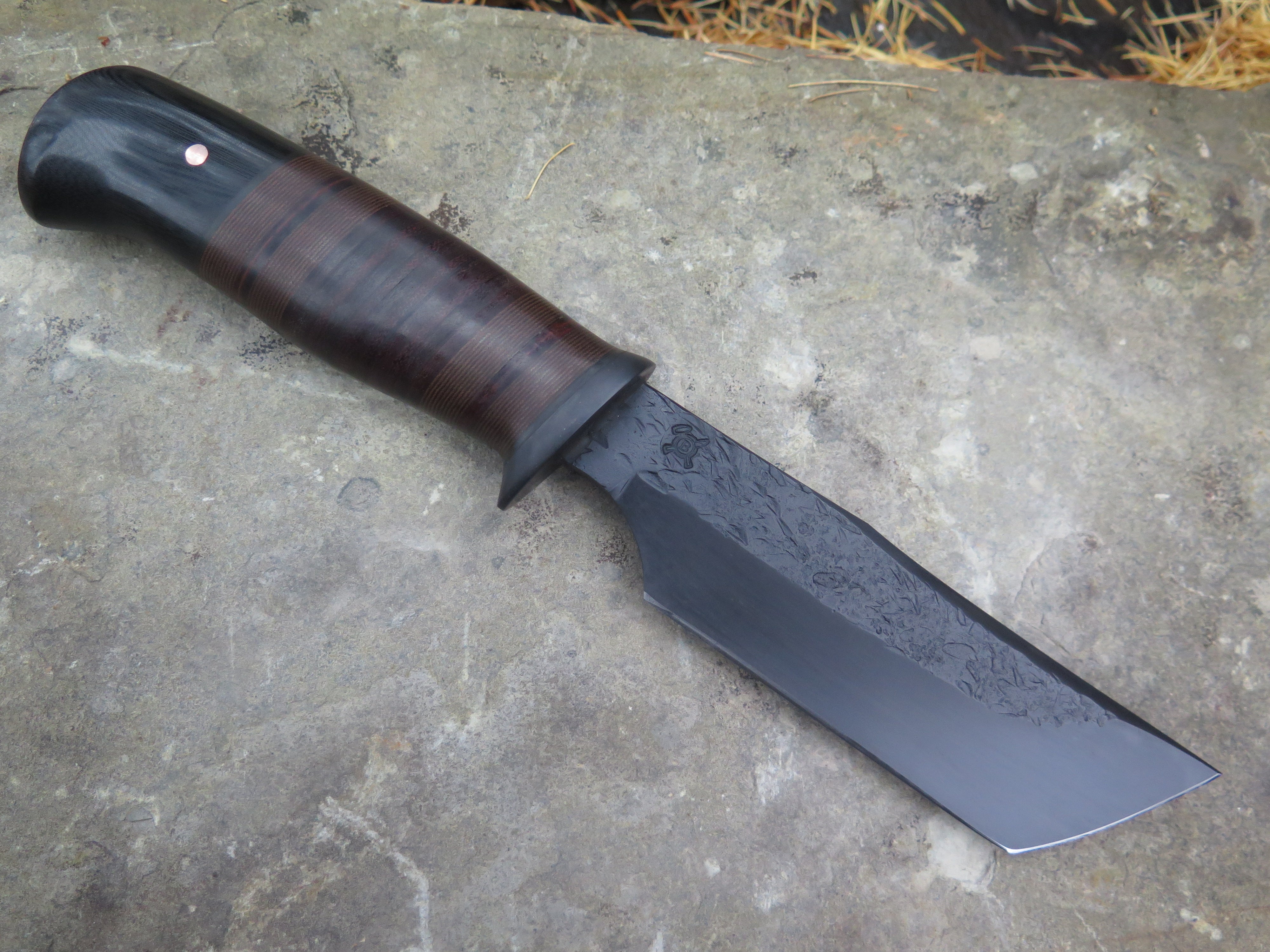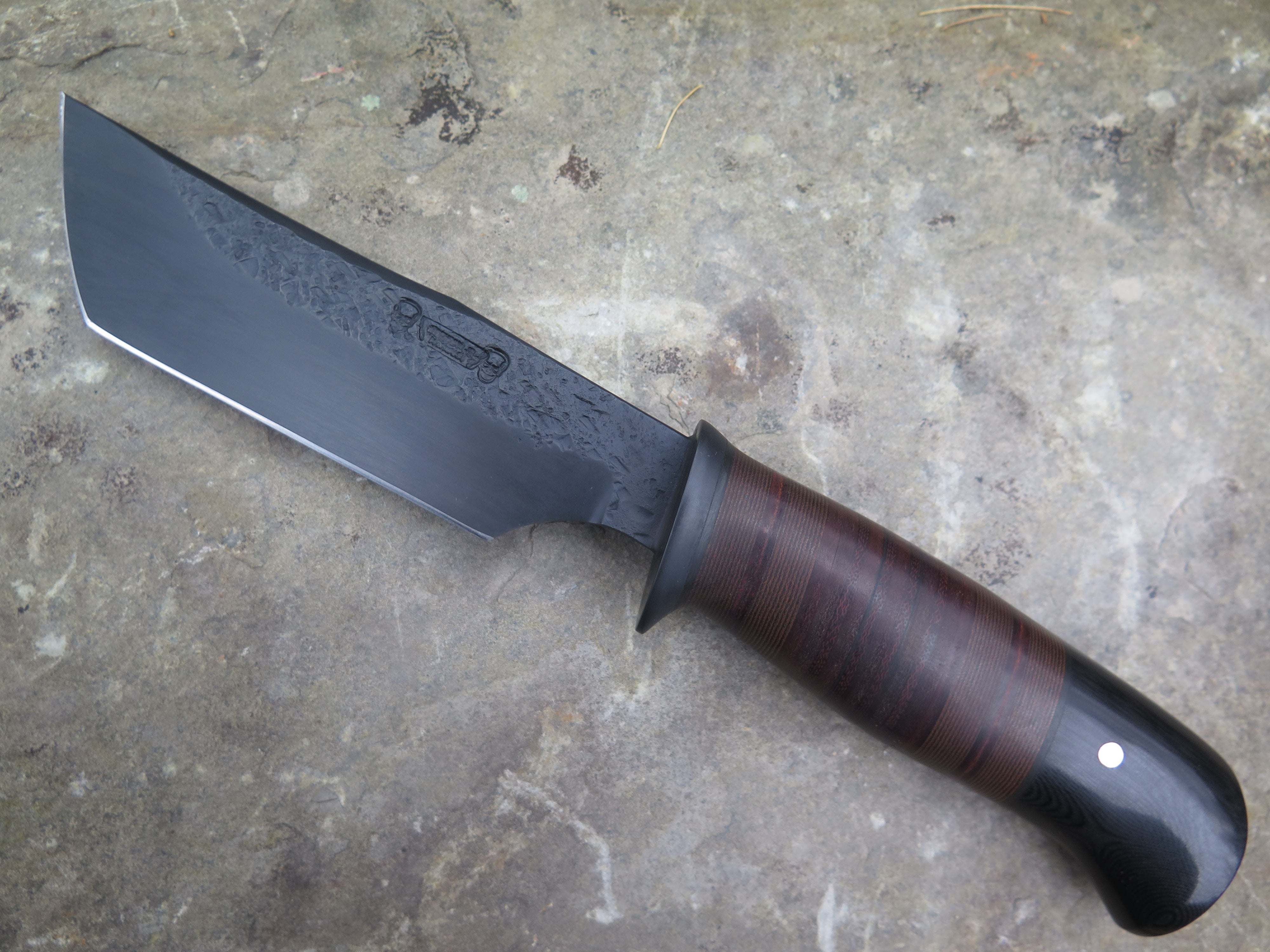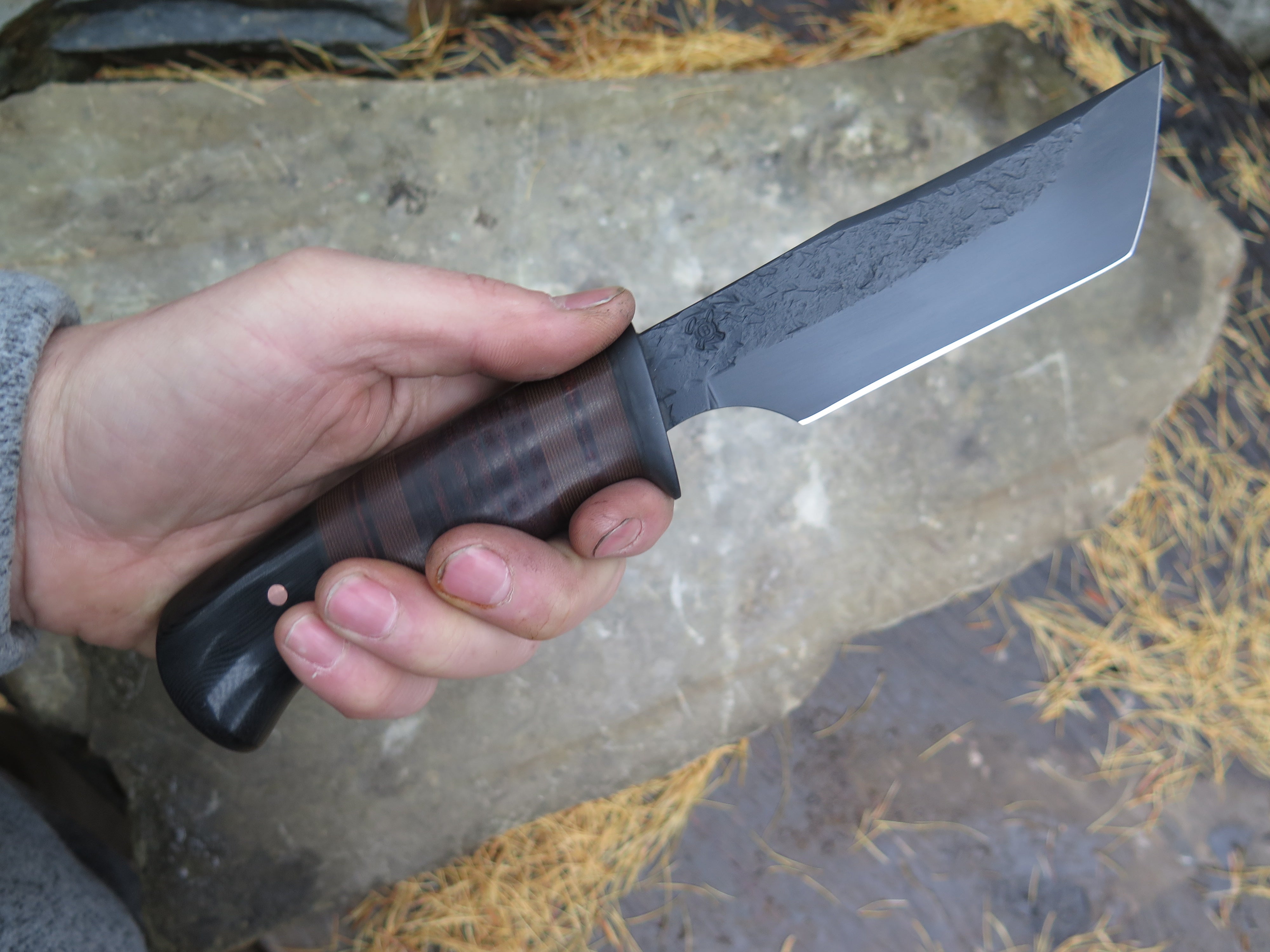This bad ass new Tanto from Behring Made© is hand forged from 3/16" thick high carbon 01 tool steel and it measures 5 1/2" from tip to guard with a razor sharp hollow grind, hammermarks and our forced patina blued finish. The blued steel guard is soldered in place above black fiber, horsehide, and black + coyote micarta spacers with a black micarta butt that is pinned with copper. The overall length measures 10" and this one comes in a custom sheath from Warlander Leather.
