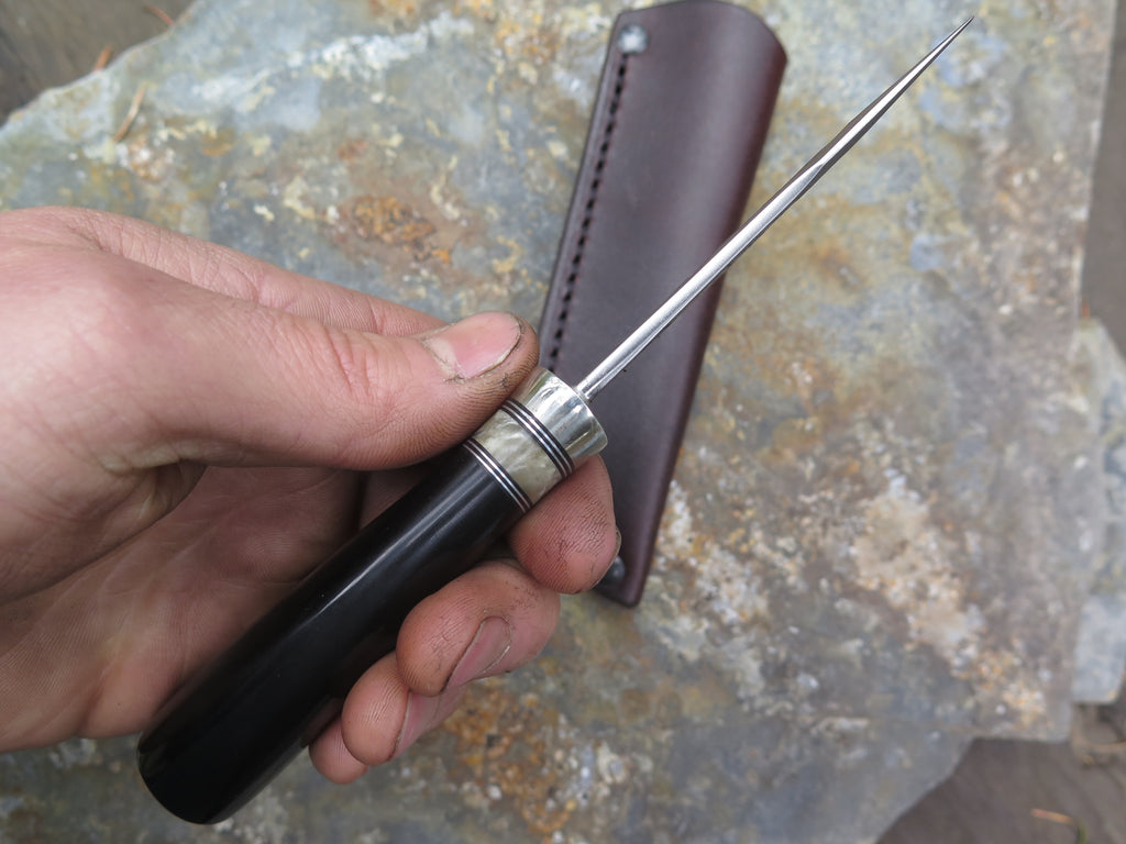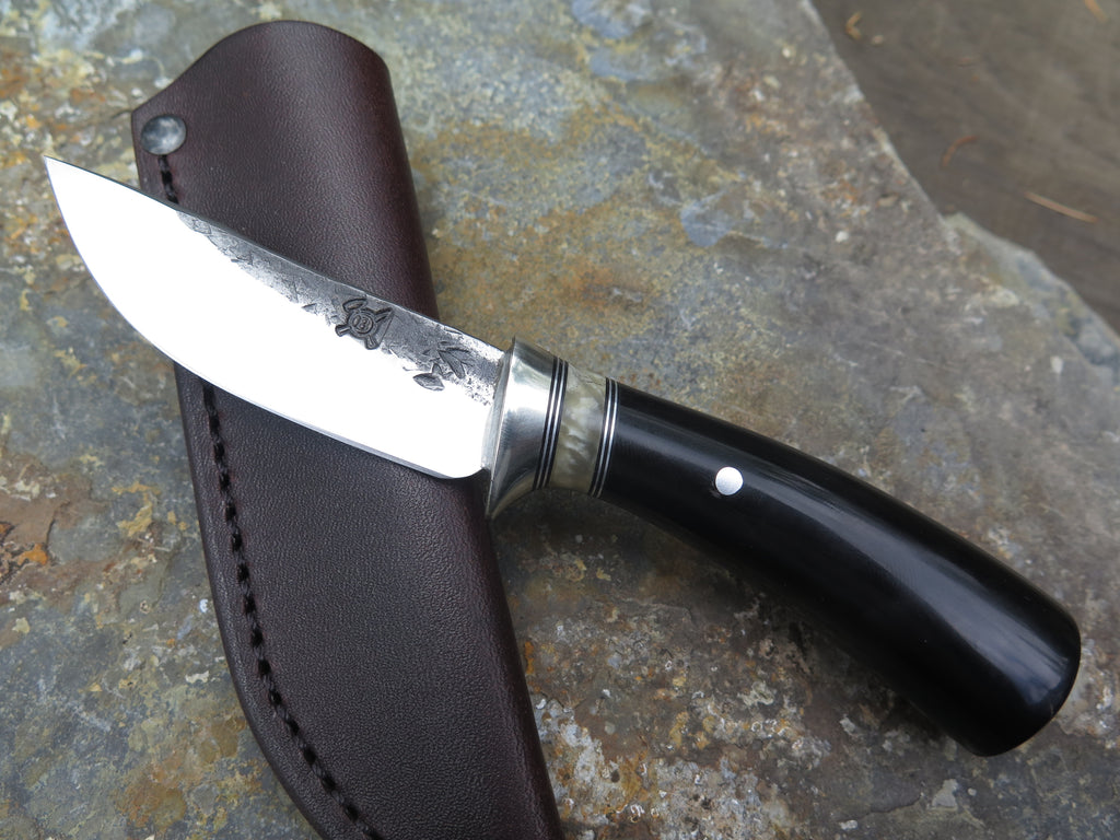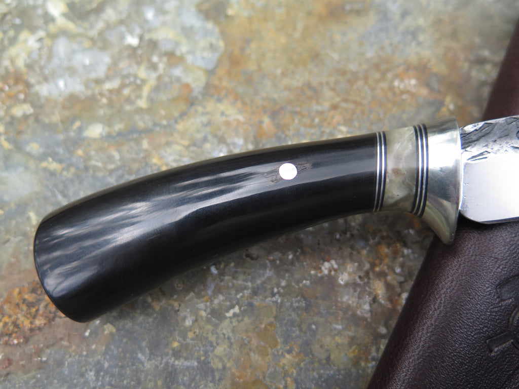 This new Woodcraft from Behring Made© is hand forged from 1/8" thick high carbon 01 tool steel and it measures 3" from tip to guard with a razor sharp hollow grind and our hammermark finish. The nickel silver guard is soldered in place above black fiber, aluminum and musk ox boss spacers with a buffalo horn handle that's pinned through the tang with aluminum. The overall length measures 6 5/8" and it comes in a leather belt pouch sheath.