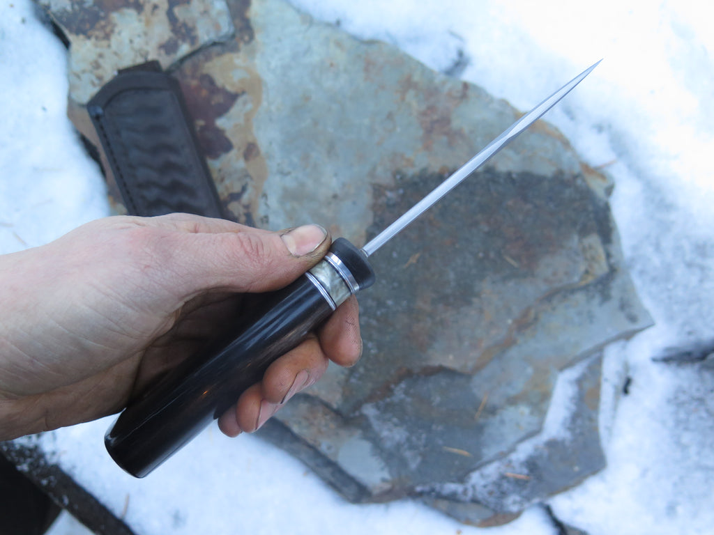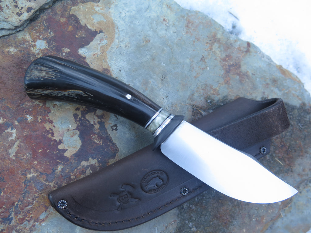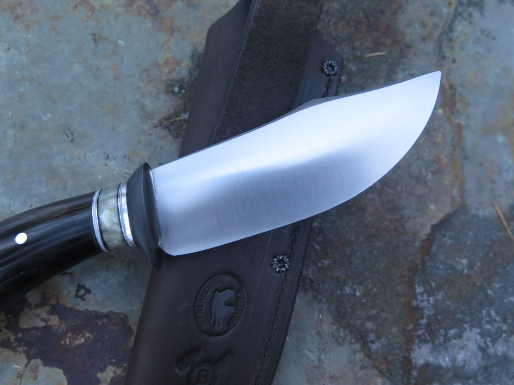 This beautiful new Clip Point from Behring Made© is hand forged from 3/16” thick high carbon 01 tool steel and it measures 4 1/2“ from tip to guard with a razor sharp convex grind. The blued steel guard is soldered in place above black, white, aluminum and musk ox boss spacers and a buffalo horn handle that's pinned through the tang with aluminum. The overall length measures 9“ and it comes in a ripple tooled leather sheath from Warlander.