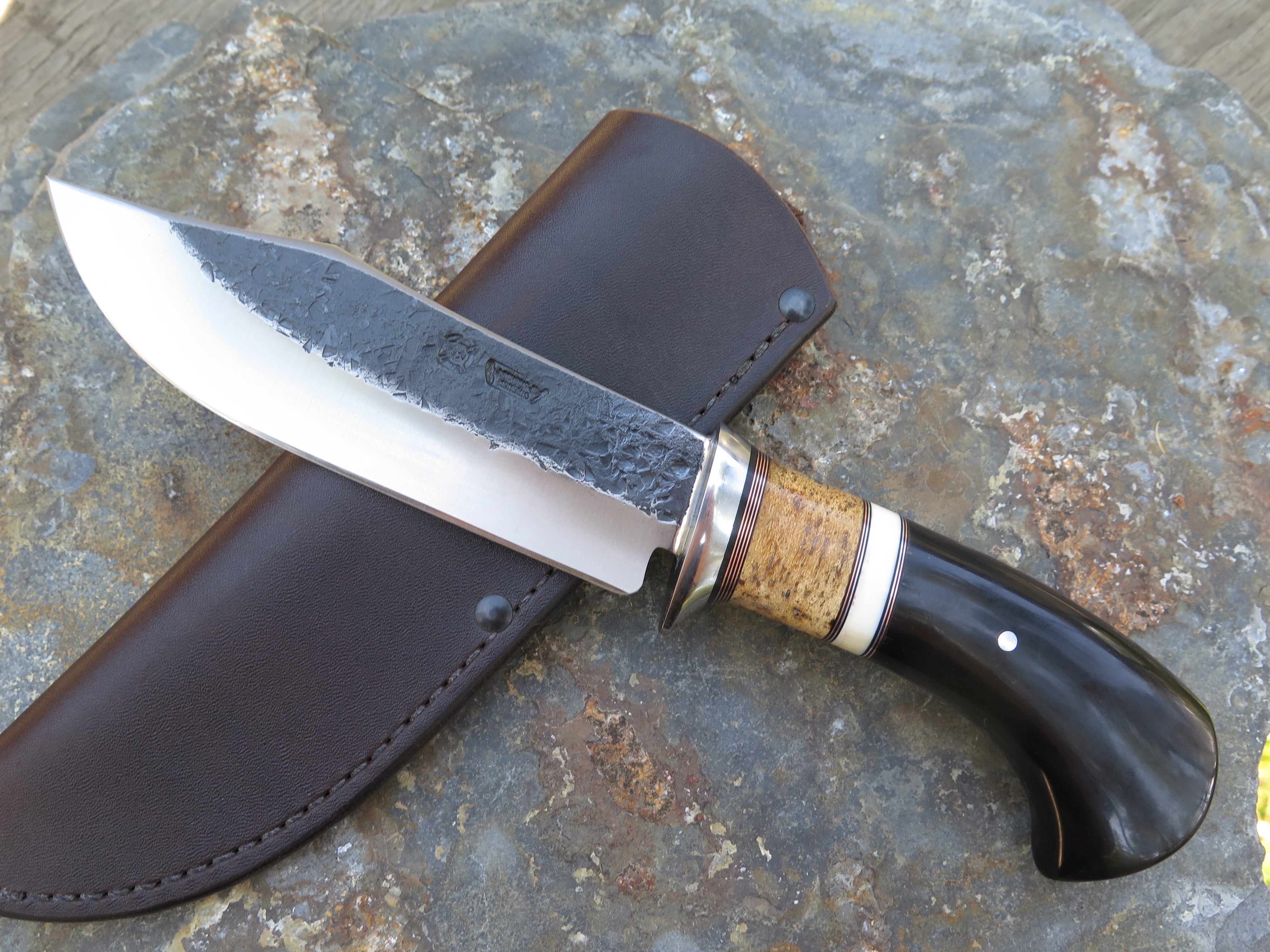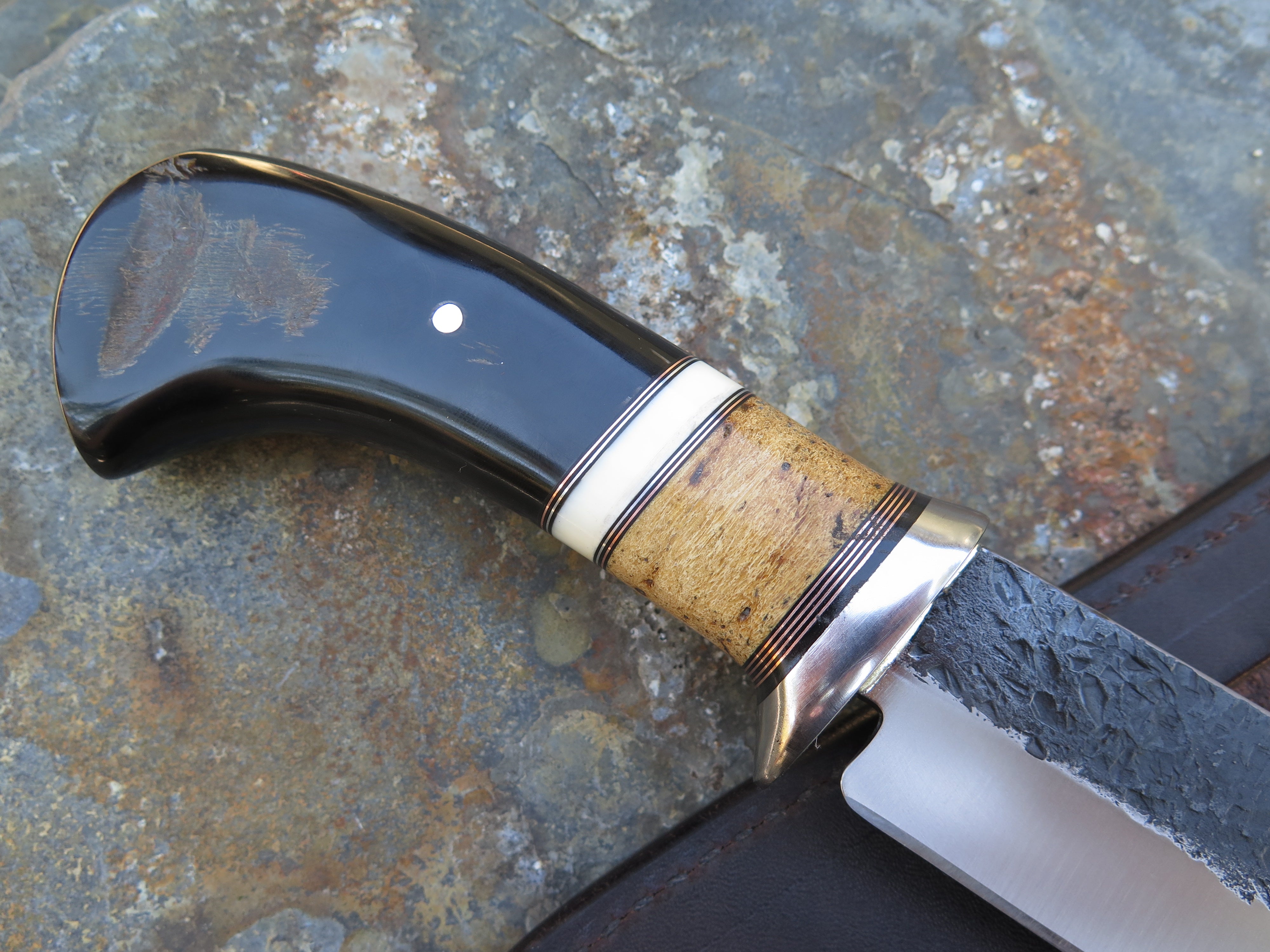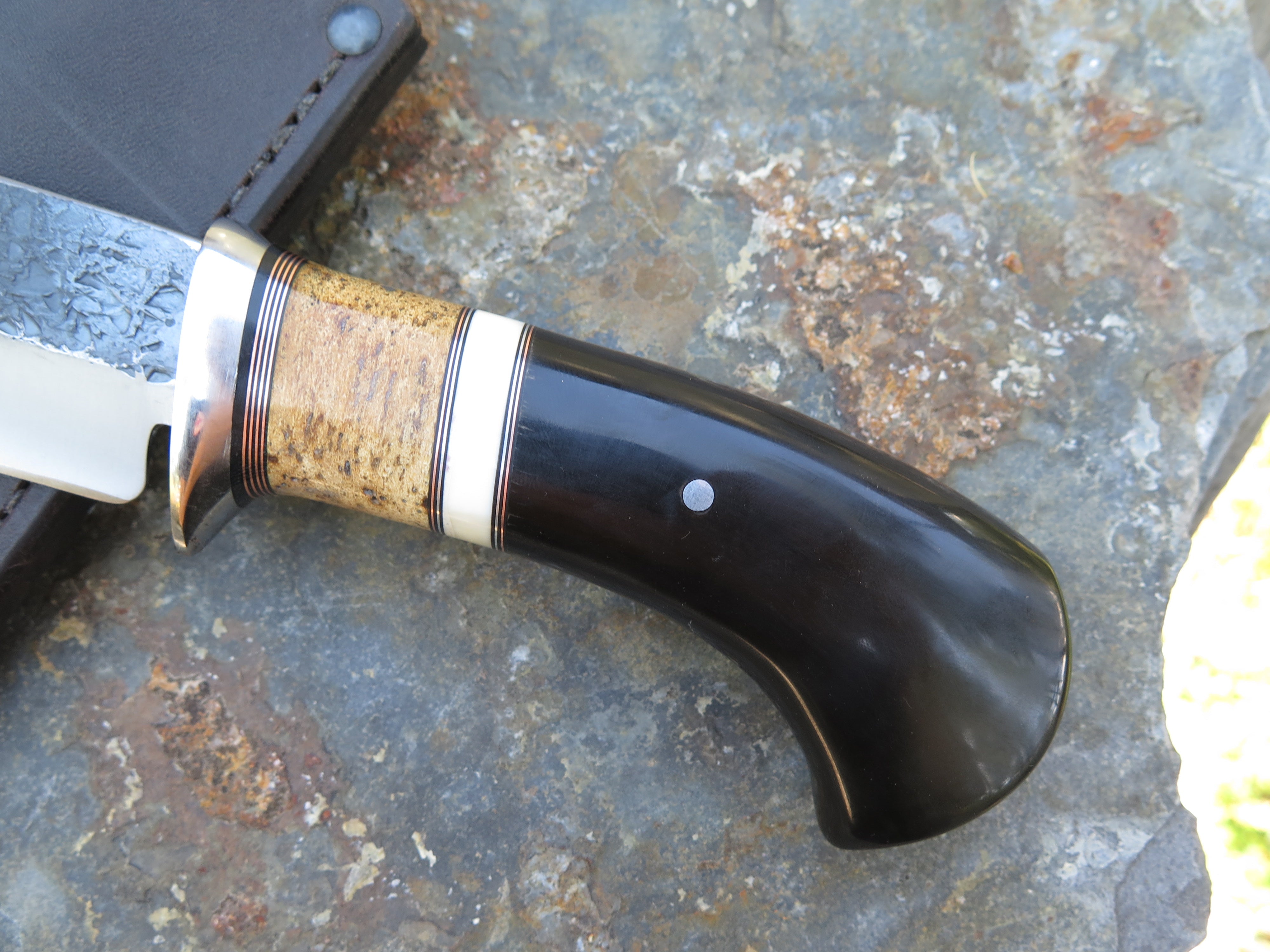 This outstanding new Clip Point from Behring Made© is hand forged from 13/64" thick 5160 spring steel and it measures 6" from tip to guard with a razor sharp hollow grind and our hammermark finish. The stainless steel guard is soldered in place above black, copper, aluminum, Stellar's Sea Cow rib and fossil walrus ivory spacers. The buffalo horn handle is pinned through the tang with aluminum and the overall length measures 10 3/4", plus it comes in a classic leather belt pouch sheath. Shown is a lefty, but yours will be right handed unless otherwise requested.