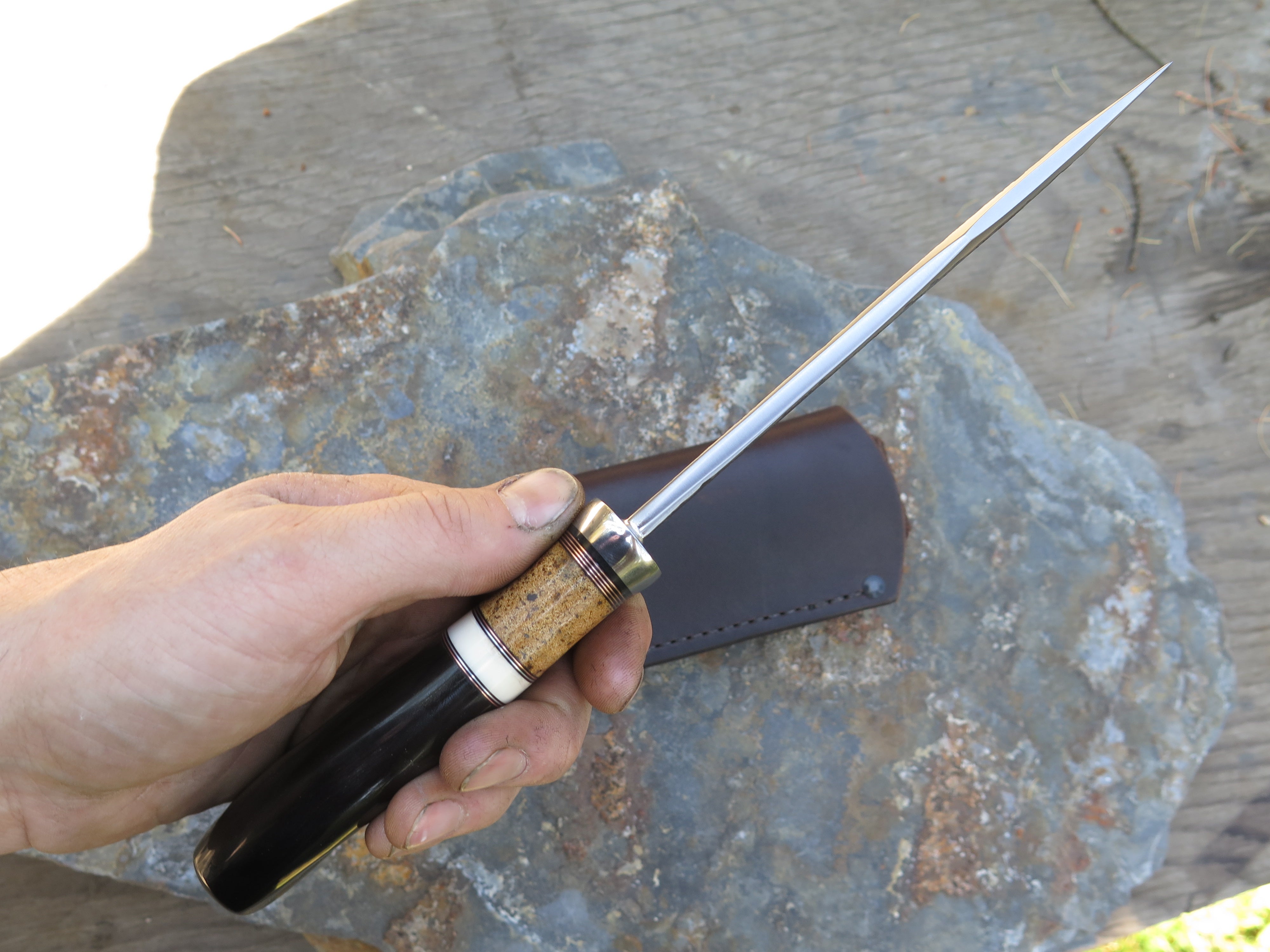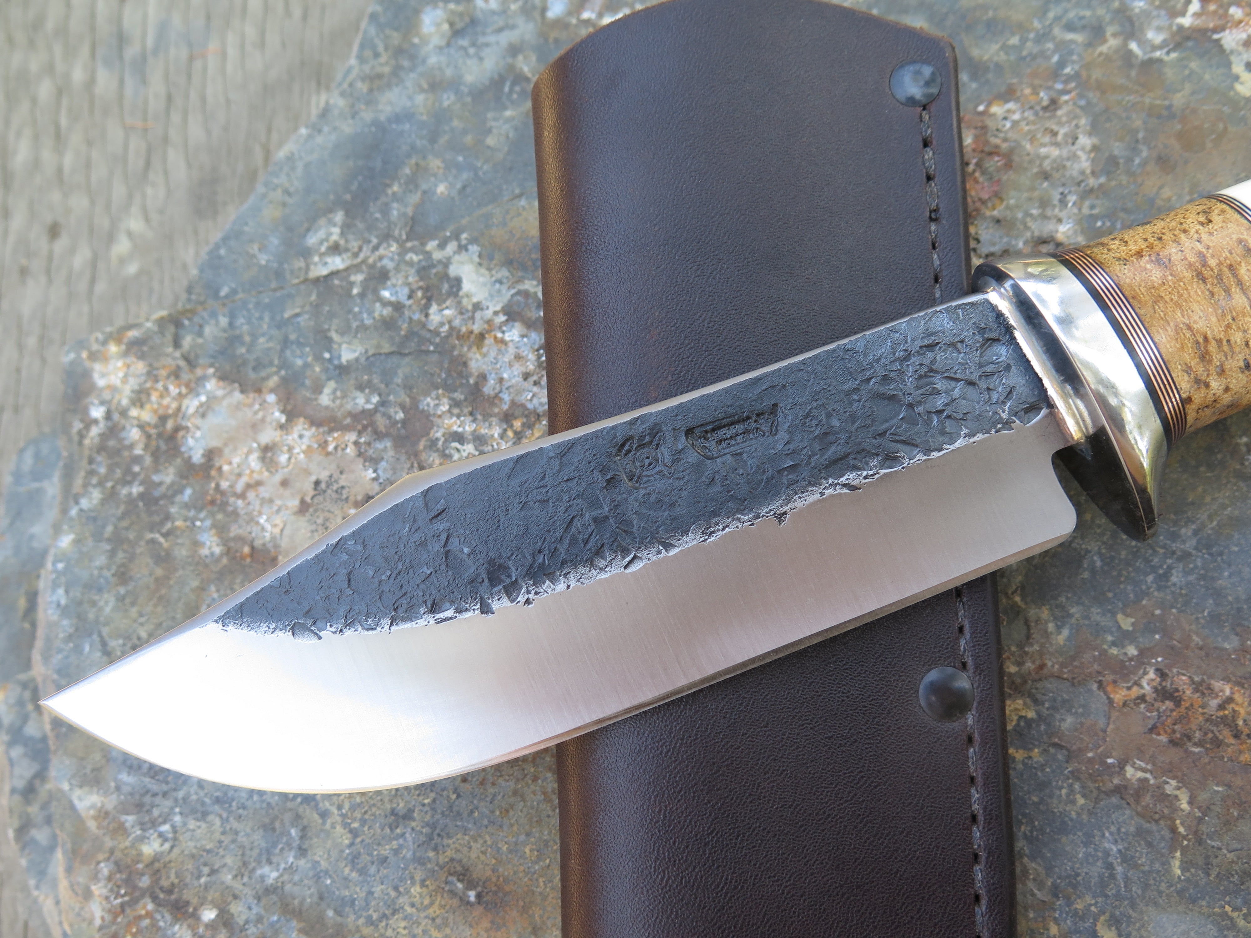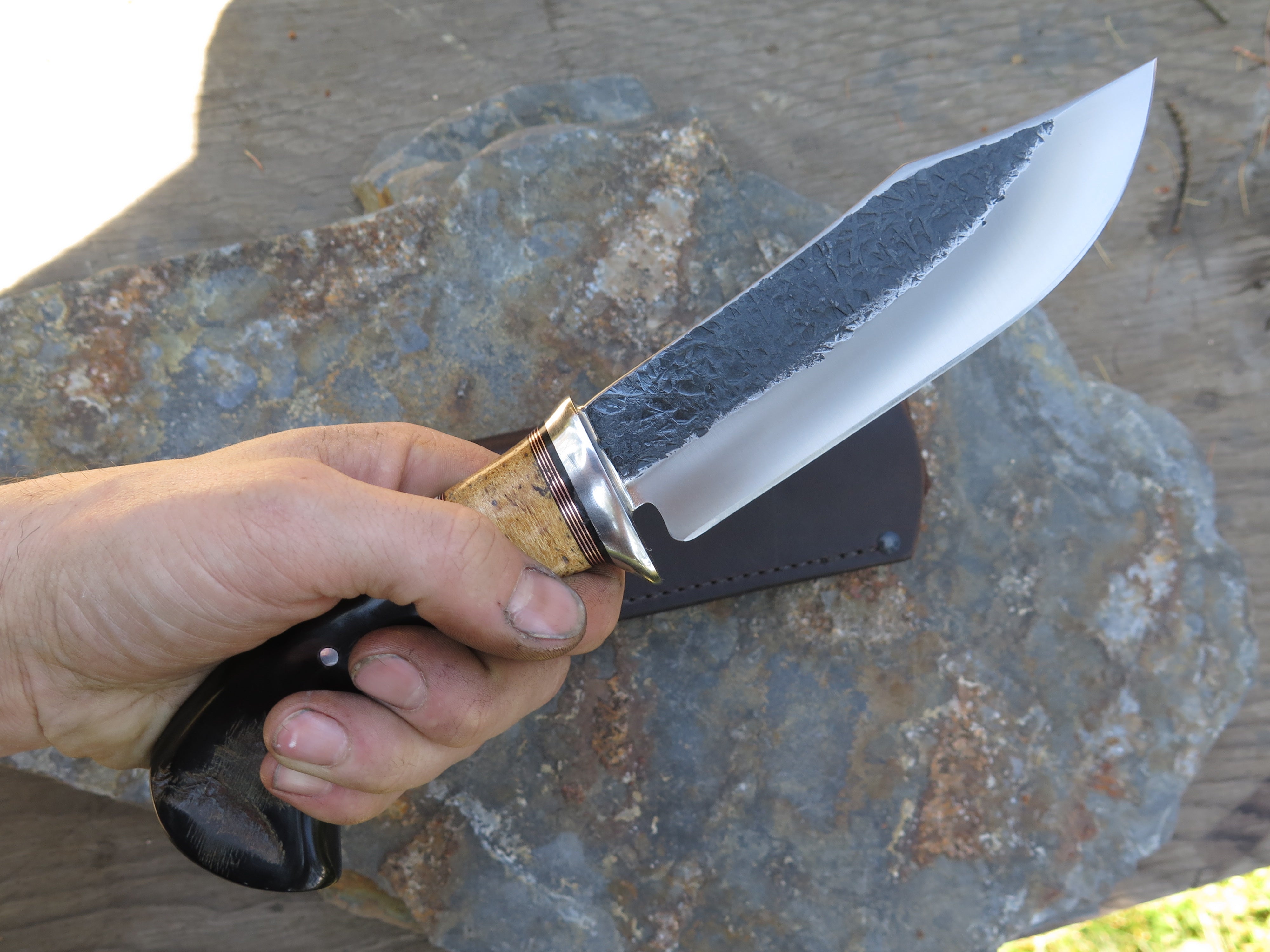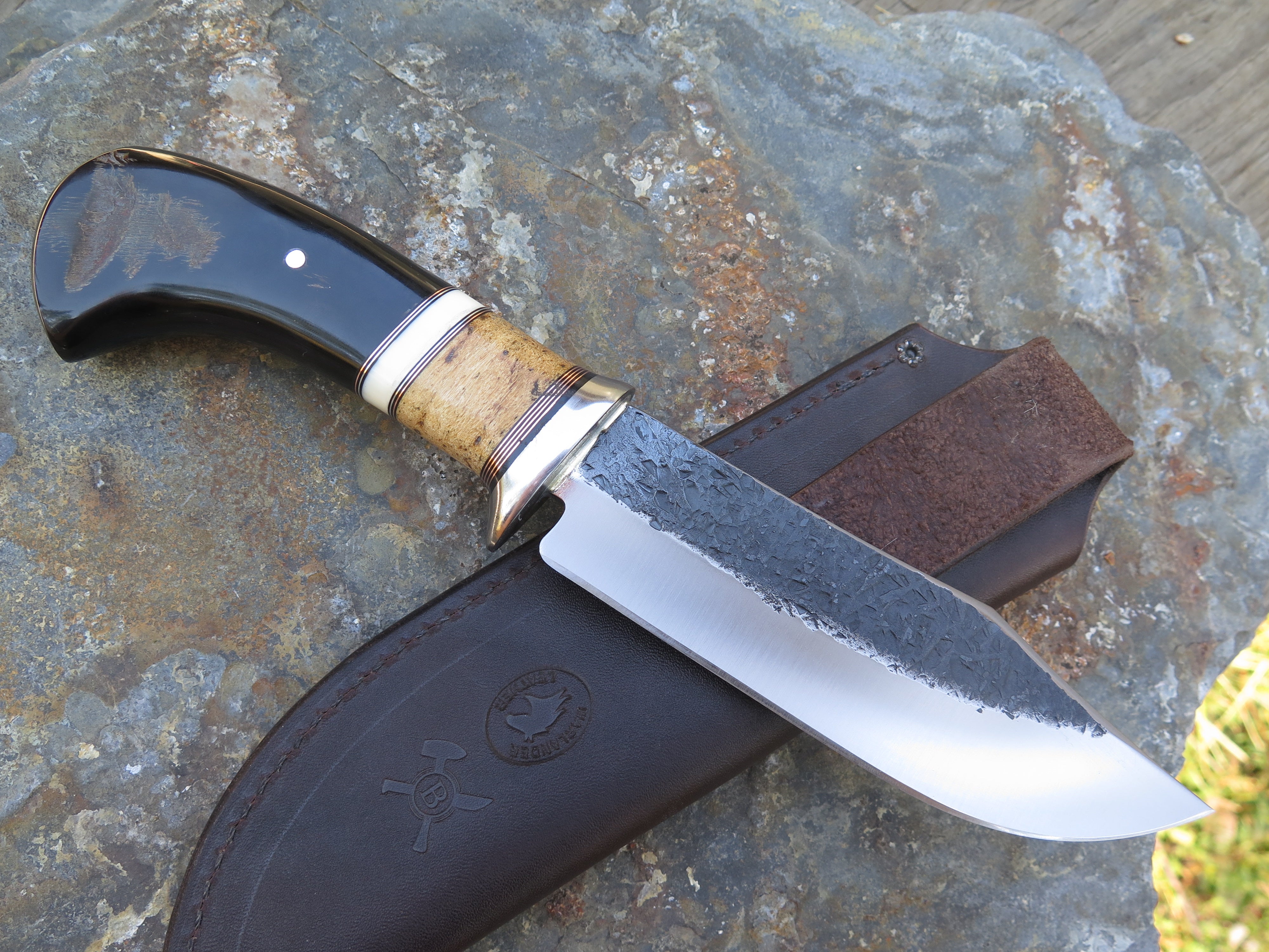 This outstanding new Clip Point from Behring Made© is hand forged from 13/64" thick 5160 spring steel and it measures 6" from tip to guard with a razor sharp hollow grind and our hammermark finish. The stainless steel guard is soldered in place above black, copper, aluminum, Stellar's Sea Cow rib and fossil walrus ivory spacers. The buffalo horn handle is pinned through the tang with aluminum and the overall length measures 10 3/4", plus it comes in a classic leather belt pouch sheath. Shown is a lefty, but yours will be right handed unless otherwise requested.
