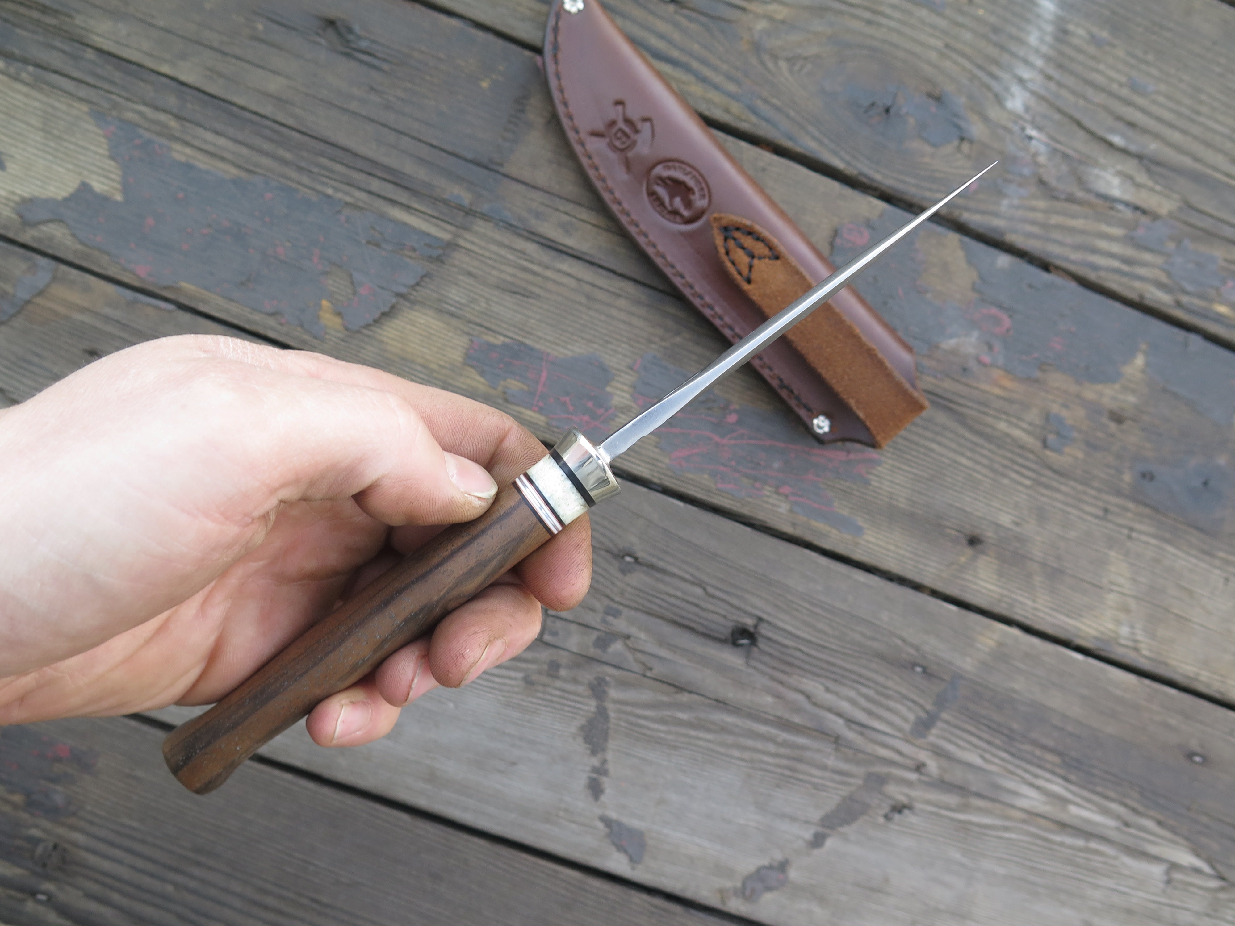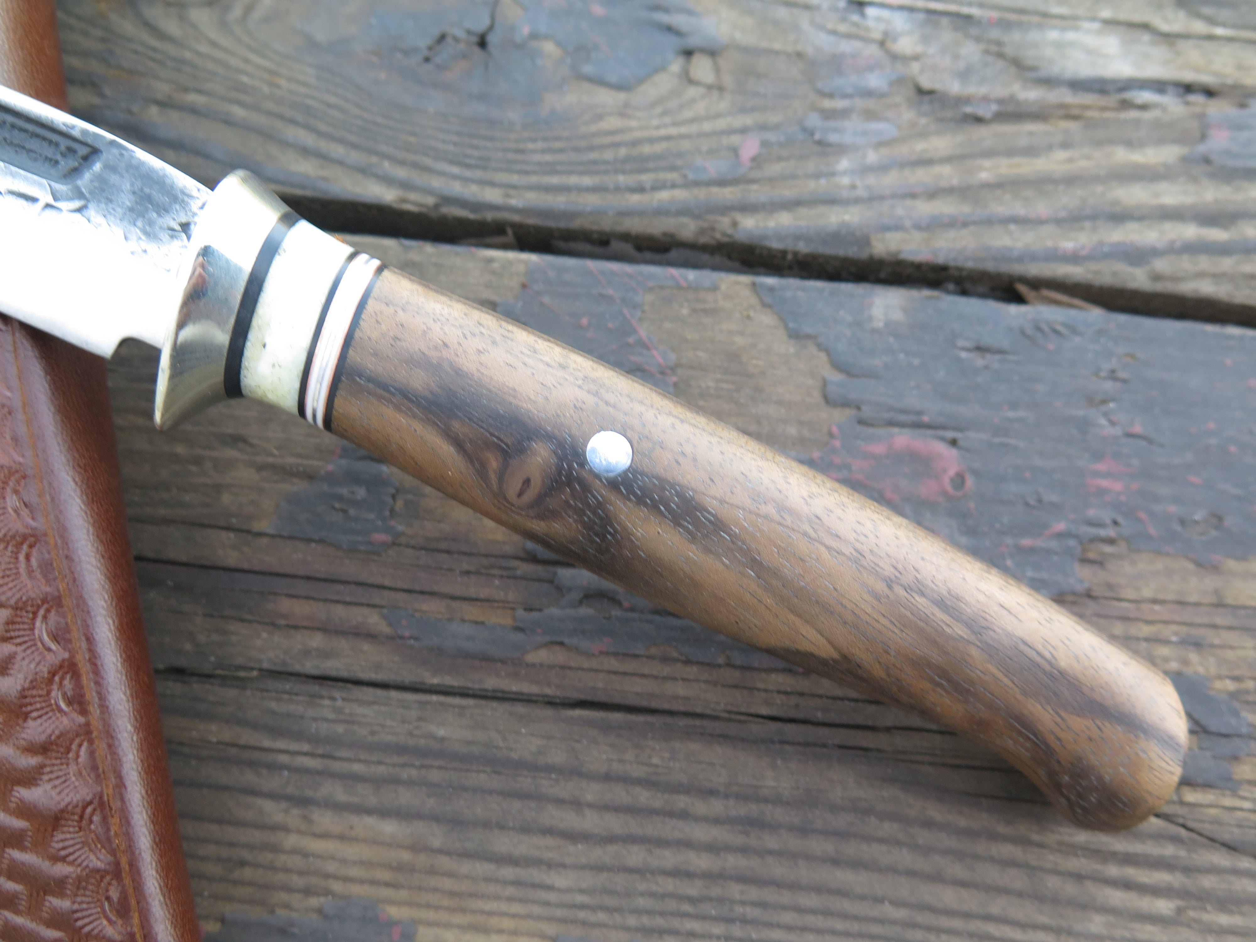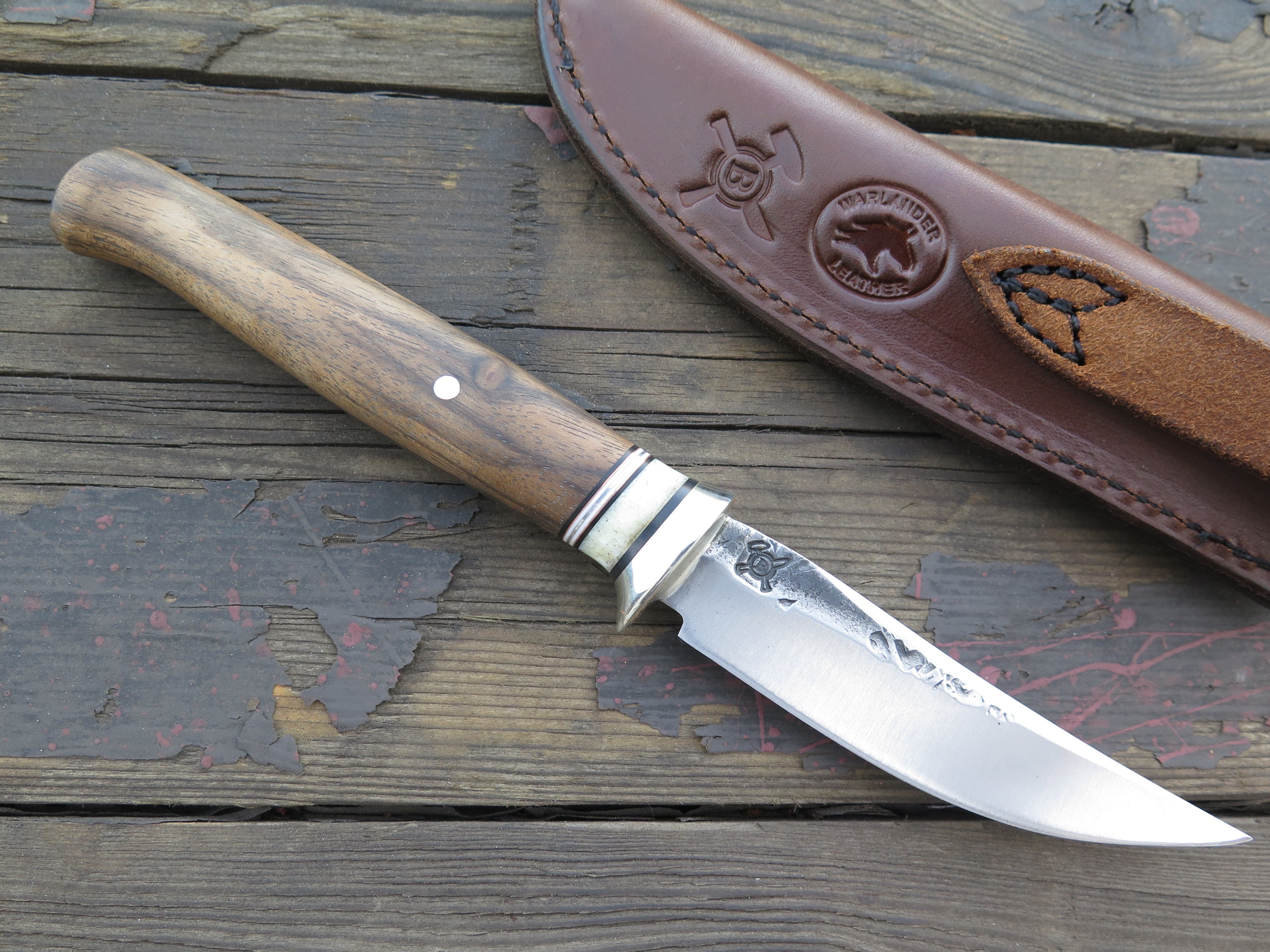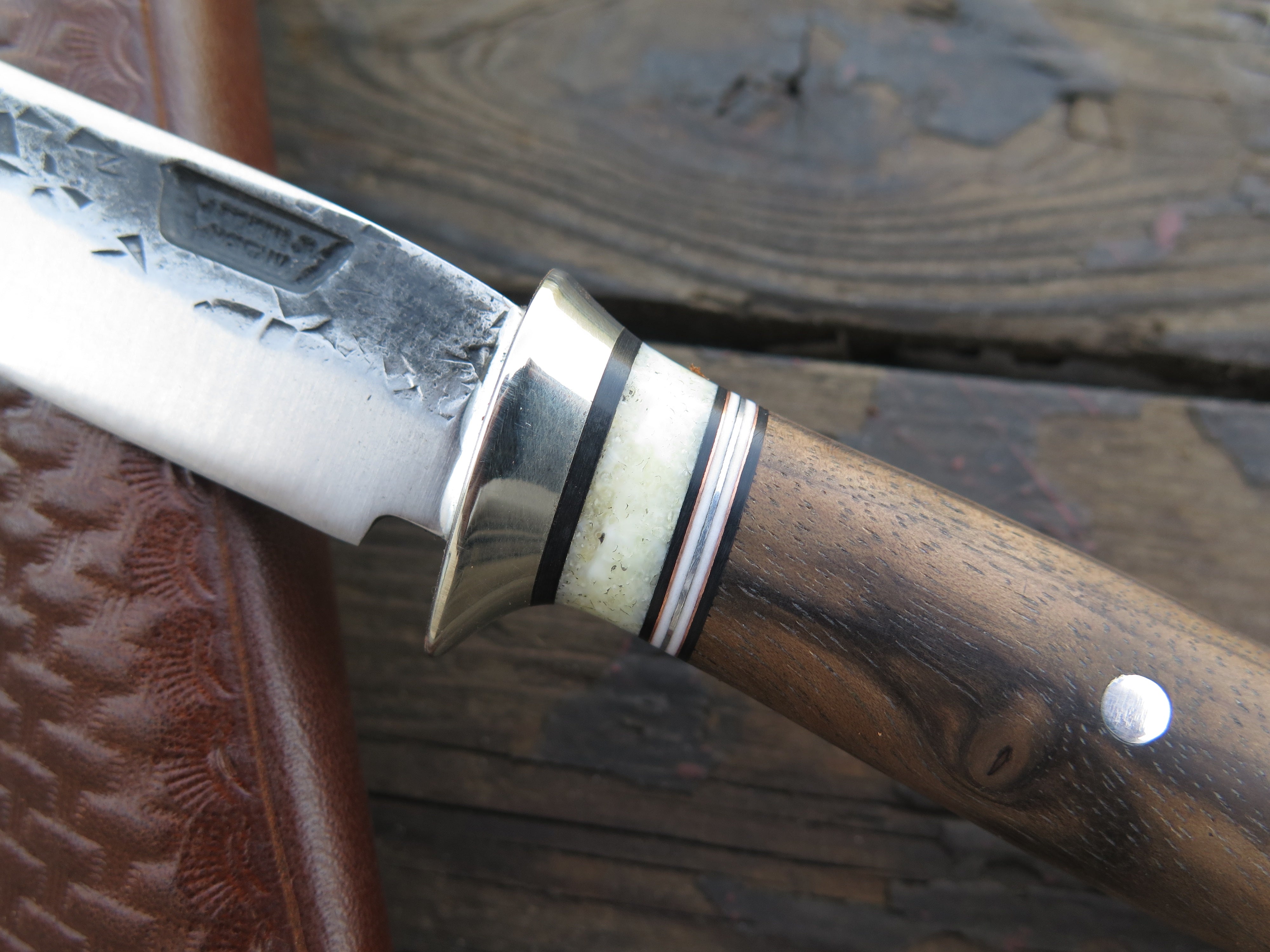 This beautiful new Pintail from Behring Made™ is hand forged from 3/16" thick high carbon 01 tool steel and it measures 3 7/8" with a razor sharp hollow grind and our hammermark finish. The nickel silver guard is soldered in place above black and white fiber, aluminum, copper and beautiful fossil walrus ivory spacers that compliment the hand selected claro walnut handle that's pinned through the tang with aluminum. The overall length measures 8 1/2" and it comes in a brown basketweave Warlander Leather pouch sheath, though substitutions can be made upon request.