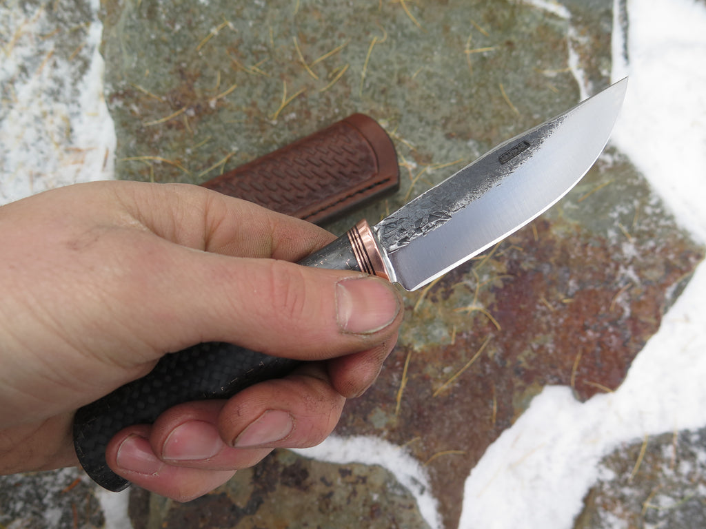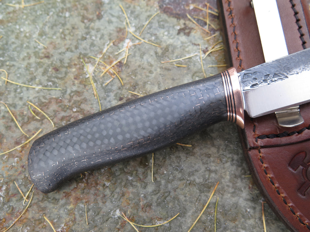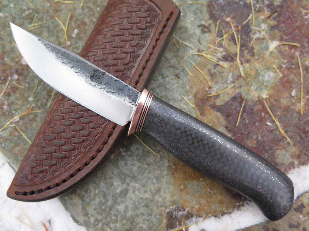 This handy new Pocket Knife from Behring Made© is hand forged from 1/8" thick high carbon 01 tool steel and it measures 3 1/4" from tip to guard with a razor sharp hollow grind and our hammermark finish. The copper guard is soldered in place above black and copper spacers as well as a copper weave carbon fiber handle that brings the overall length to just over 7". This one comes in the shown spring clip pocket sheath, though substitutions are available upon request.