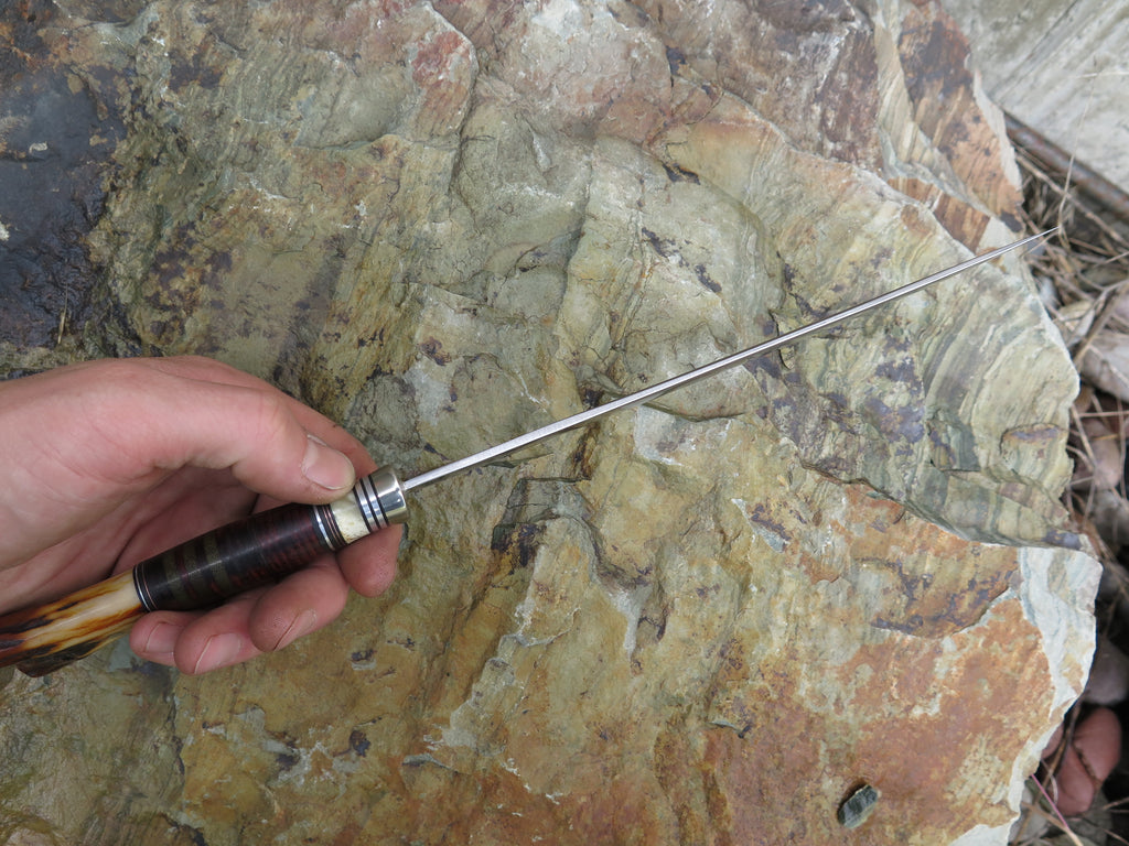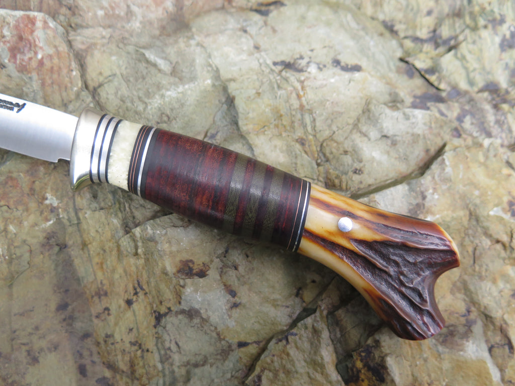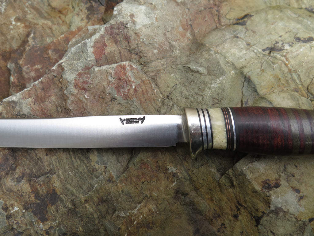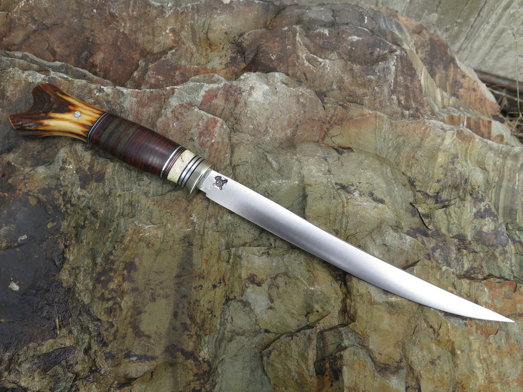 This beautiful and flexible new Fillet from Behring Made™ is hand forged from 1/8" thick spring steel that measures 7 1/2" from tip to guard with a razor sharp convex grind that'll be a true joy to use! The nickel silver guard is soldered in place above black fiber, musk ox boss, green micarta, aluminum, copper and horsehide leather spacers as well as a premium sambar crotch stag butt that's pinned with aluminum. The overall length measures 12 1/2" and it will come in a custom sheath from Warlander Leather.