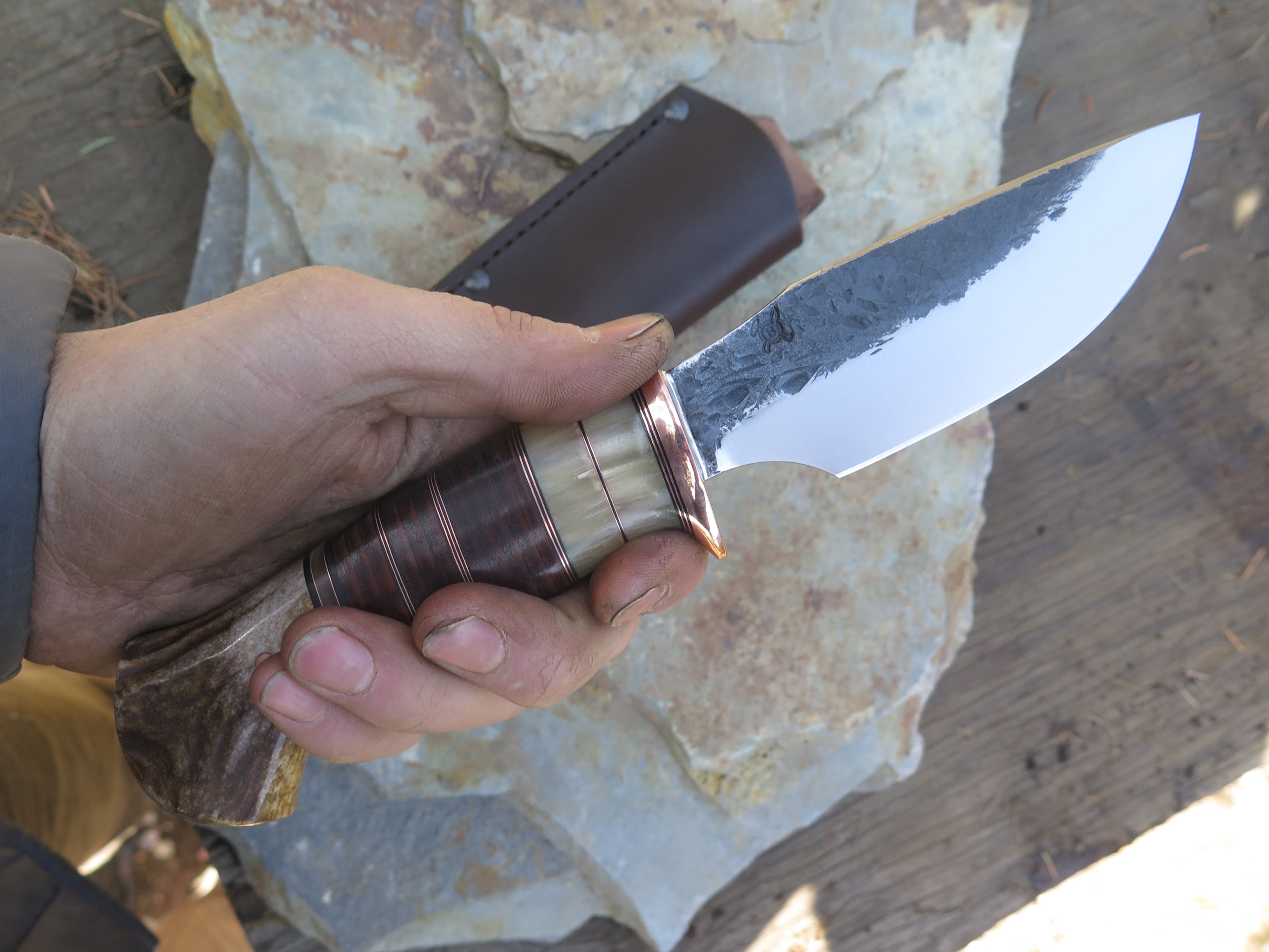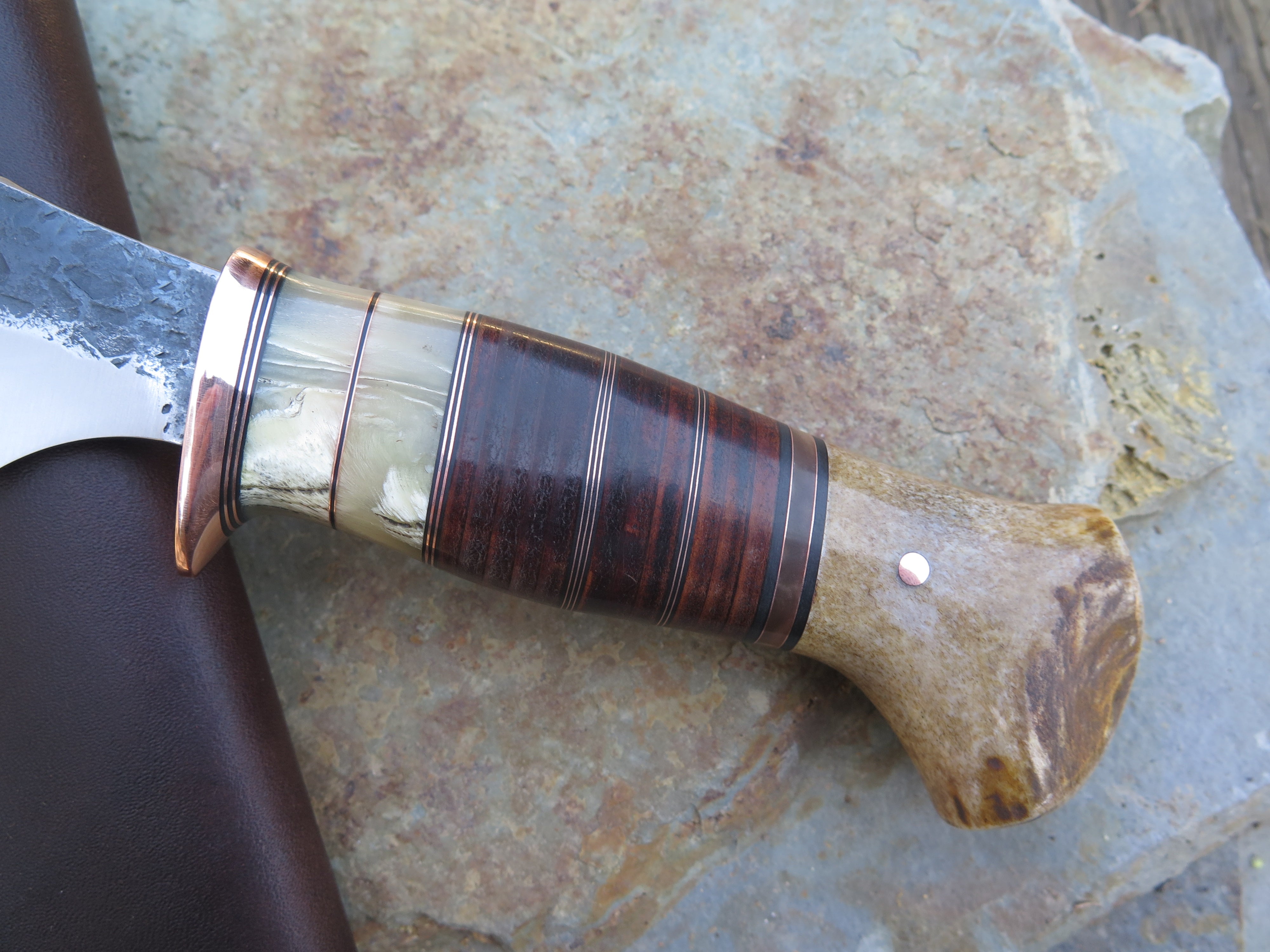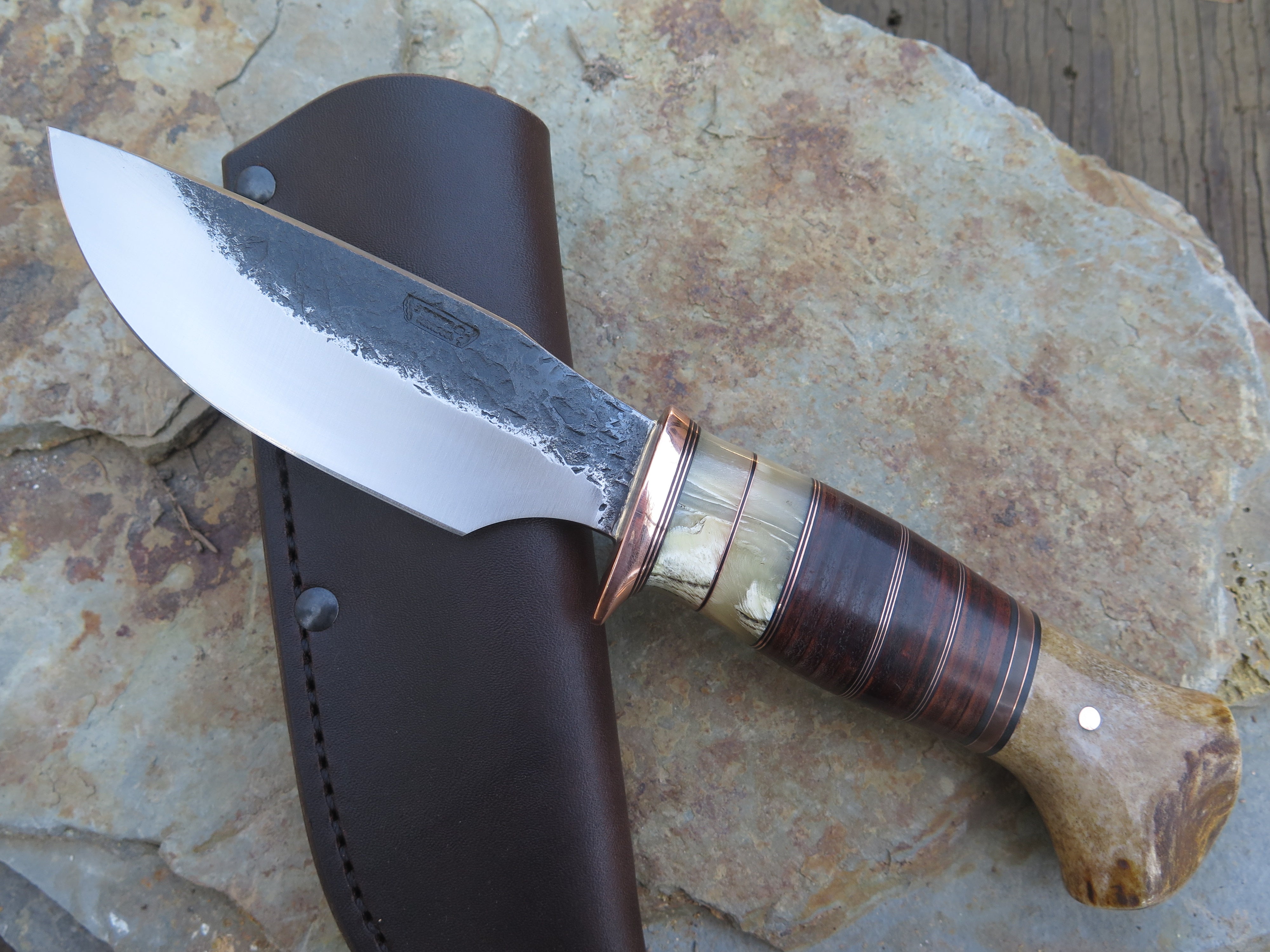 This beautiful new Alaskan from Behring Made© is hand forged from 3/16" thick high carbon 01 tool steel and it measures 4 3/4" from tip to guard with a razor sharp hollow grind and our hammermark finish. The copper guard is soldered in place above black fiber, copper, three musk ox and horsehide leather spacers which top a premium crotch stag butt that's pinned with copper. The overall length measures just about 9 1/2" and this one comes in a classic leather belt pouch sheath.