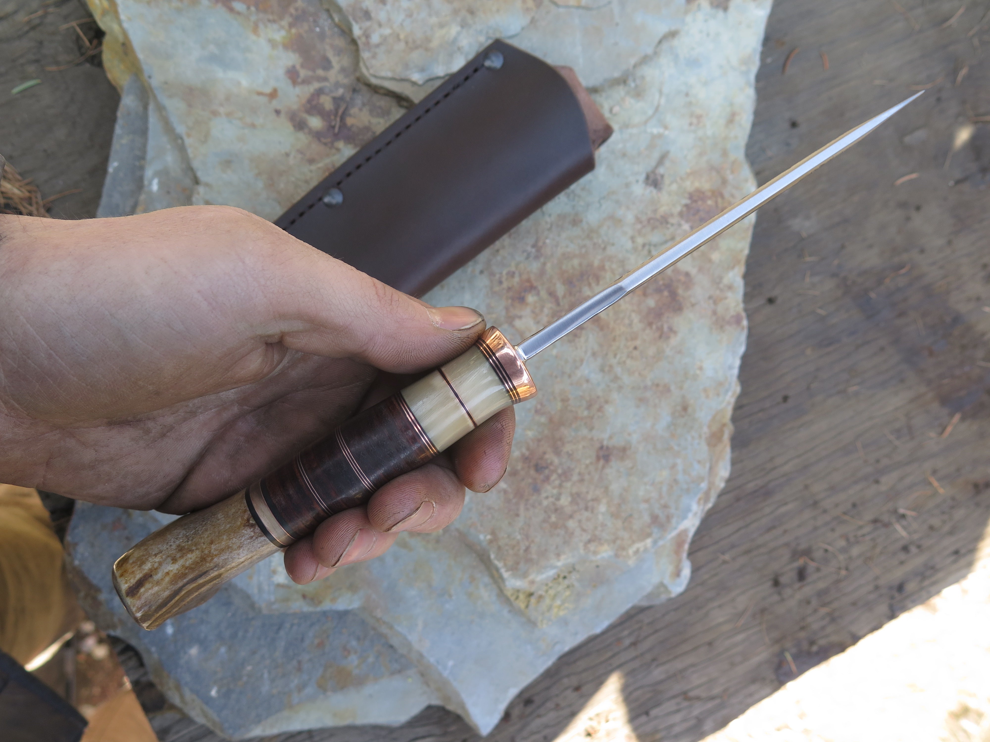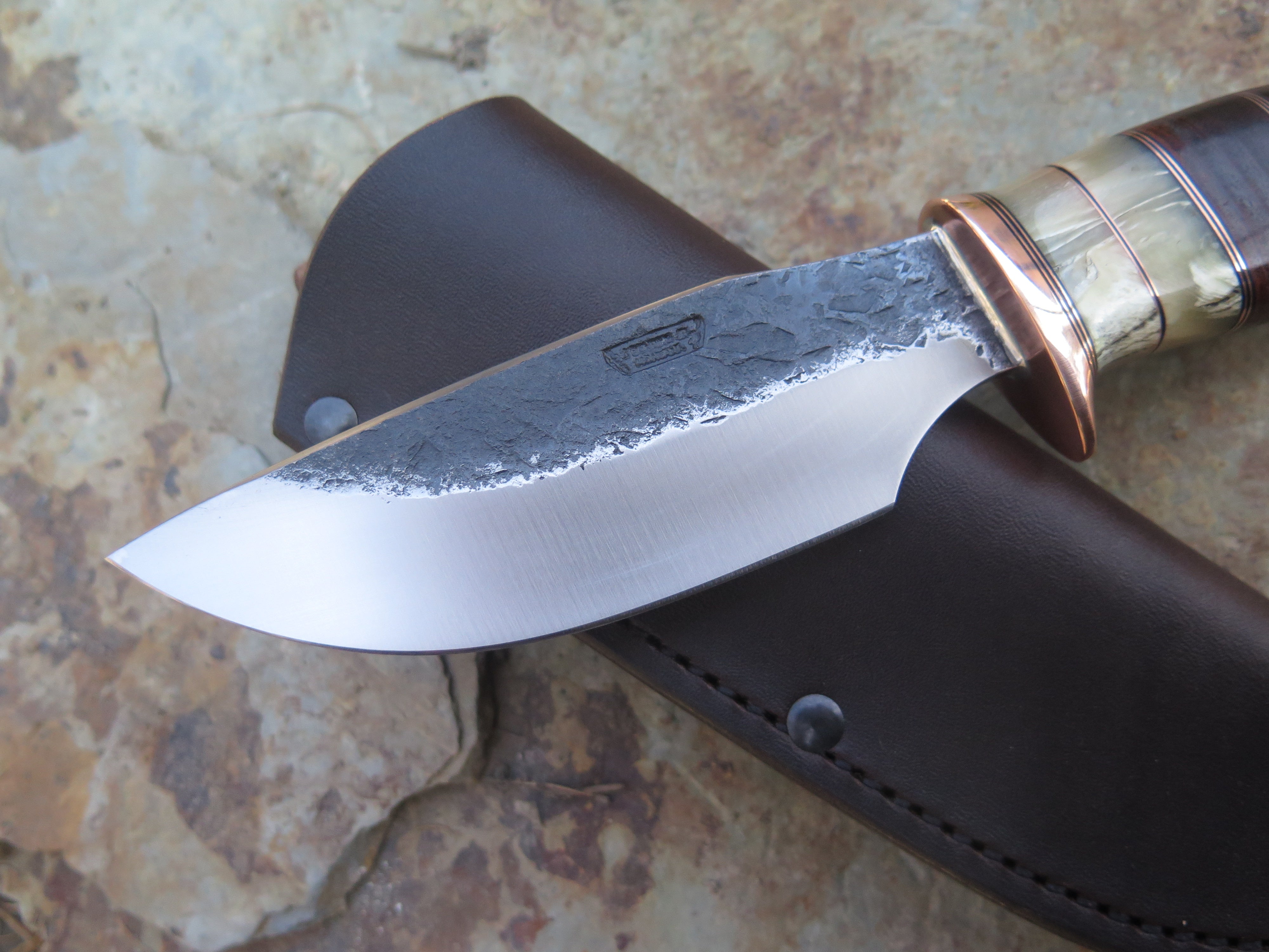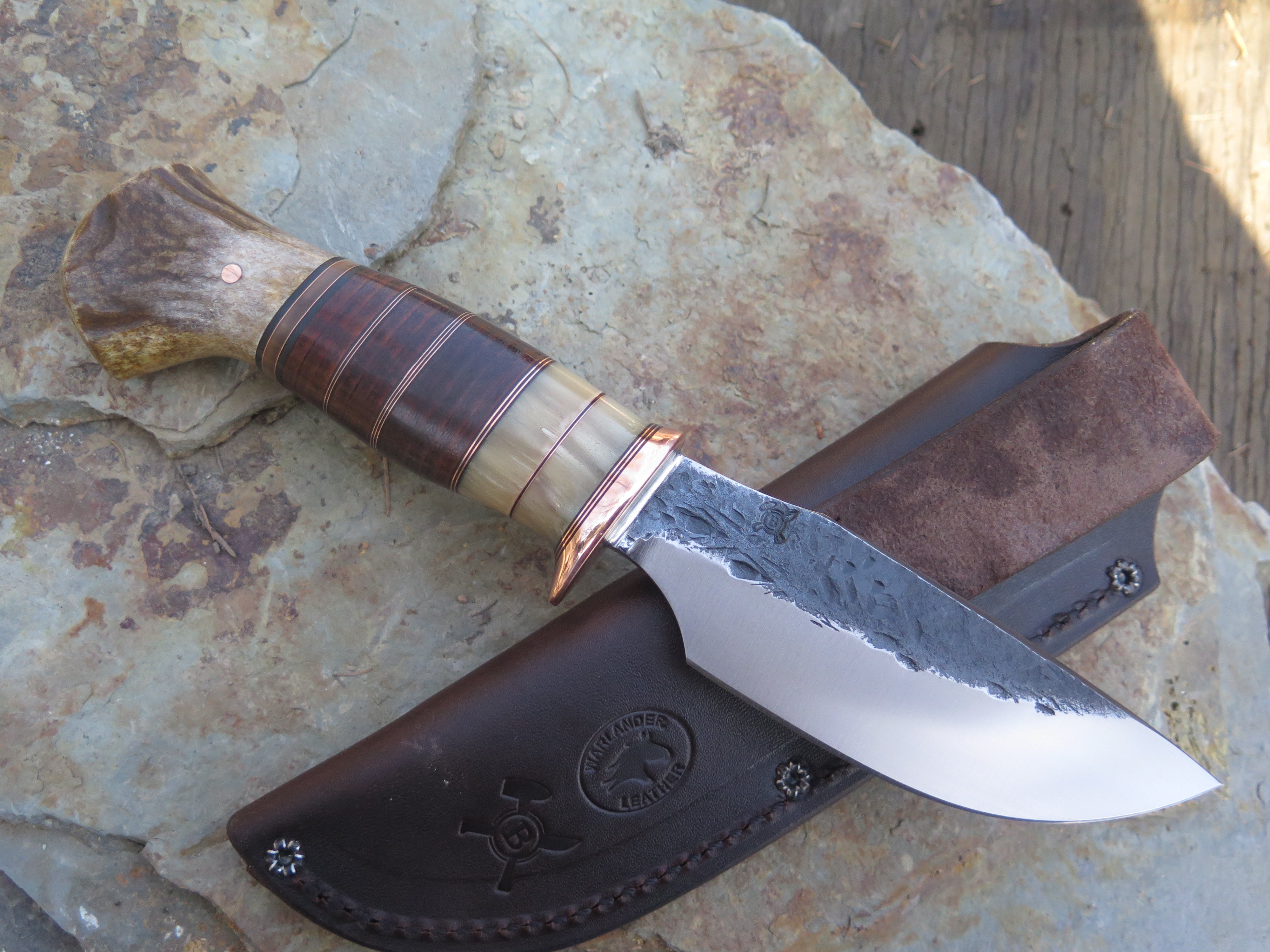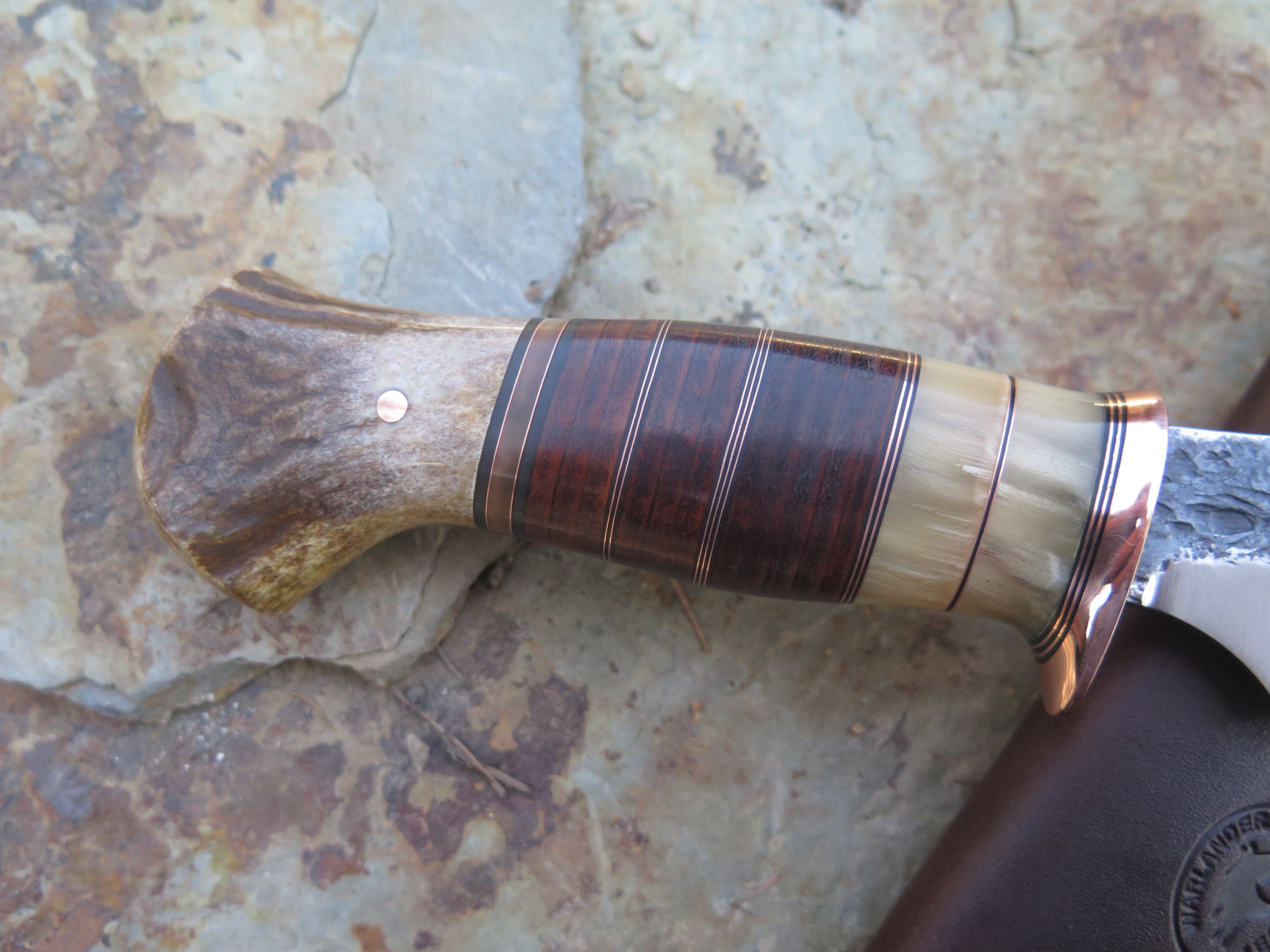 This beautiful new Alaskan from Behring Made© is hand forged from 3/16" thick high carbon 01 tool steel and it measures 4 3/4" from tip to guard with a razor sharp hollow grind and our hammermark finish. The copper guard is soldered in place above black fiber, copper, three musk ox and horsehide leather spacers which top a premium crotch stag butt that's pinned with copper. The overall length measures just about 9 1/2" and this one comes in a classic leather belt pouch sheath.
