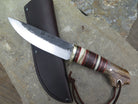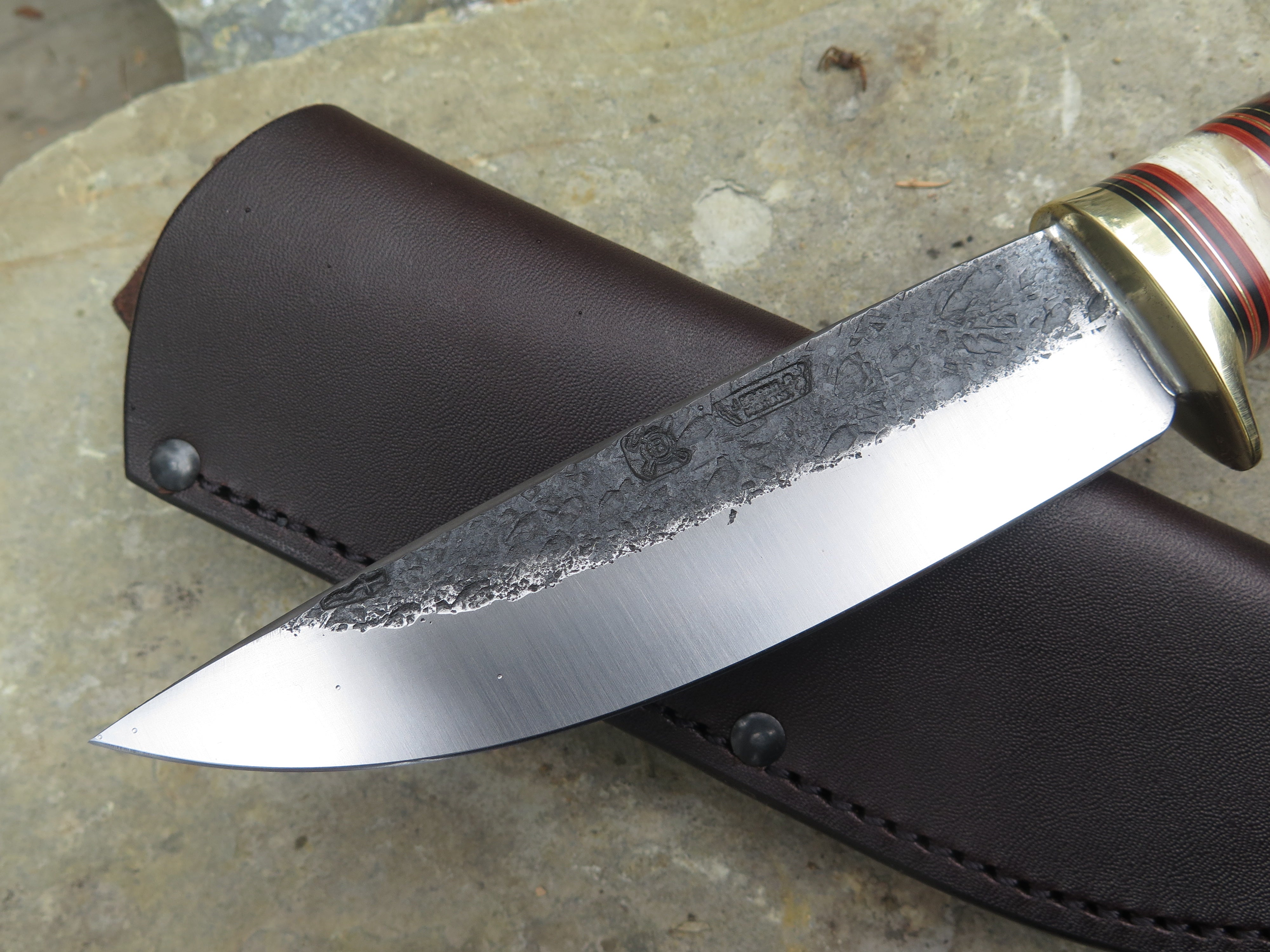 This beautiful new Drop Point from Behring Made© is hand forged from 3/16" thick high carbon 01 tool steel and it measures 6" from tip to guard with a razor sharp hollow grind and our hammermark finish. The brass guard is soldered in place above black and maroon fiber, brass, musk ox boss and horsehide leather spacers with a premium crotch stag butt that's pinned and thongholed with brass. The overall length measures 11" and this one comes in a classic leather belt pouch sheath.