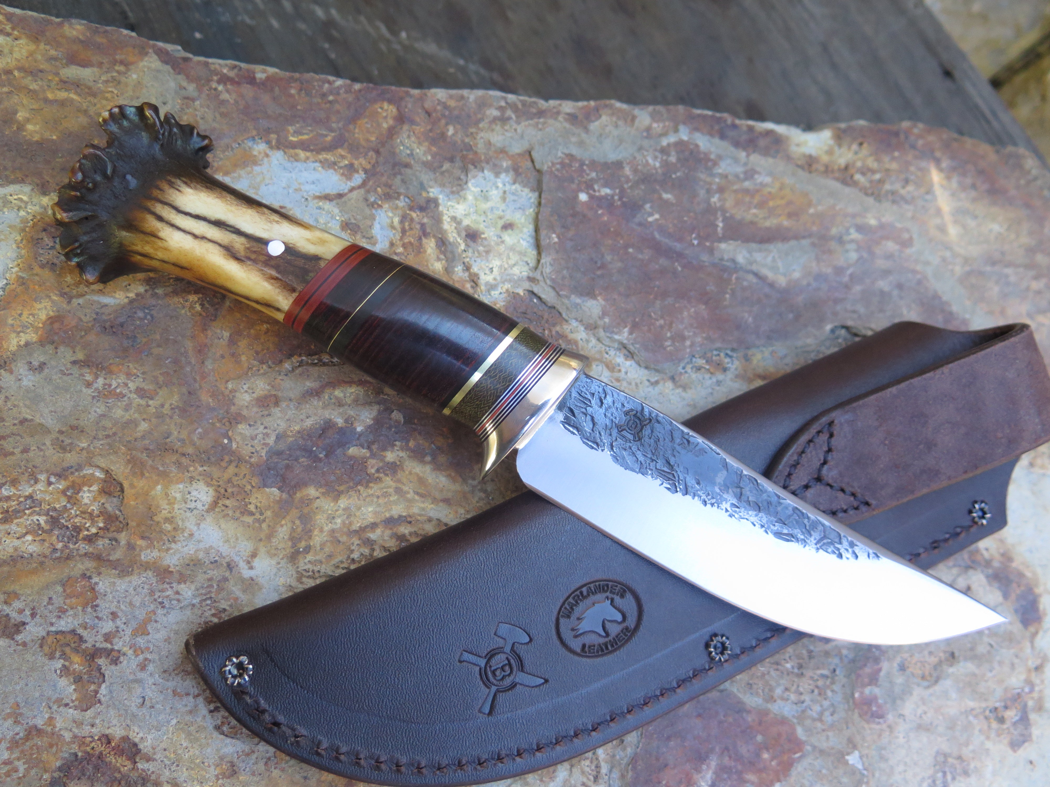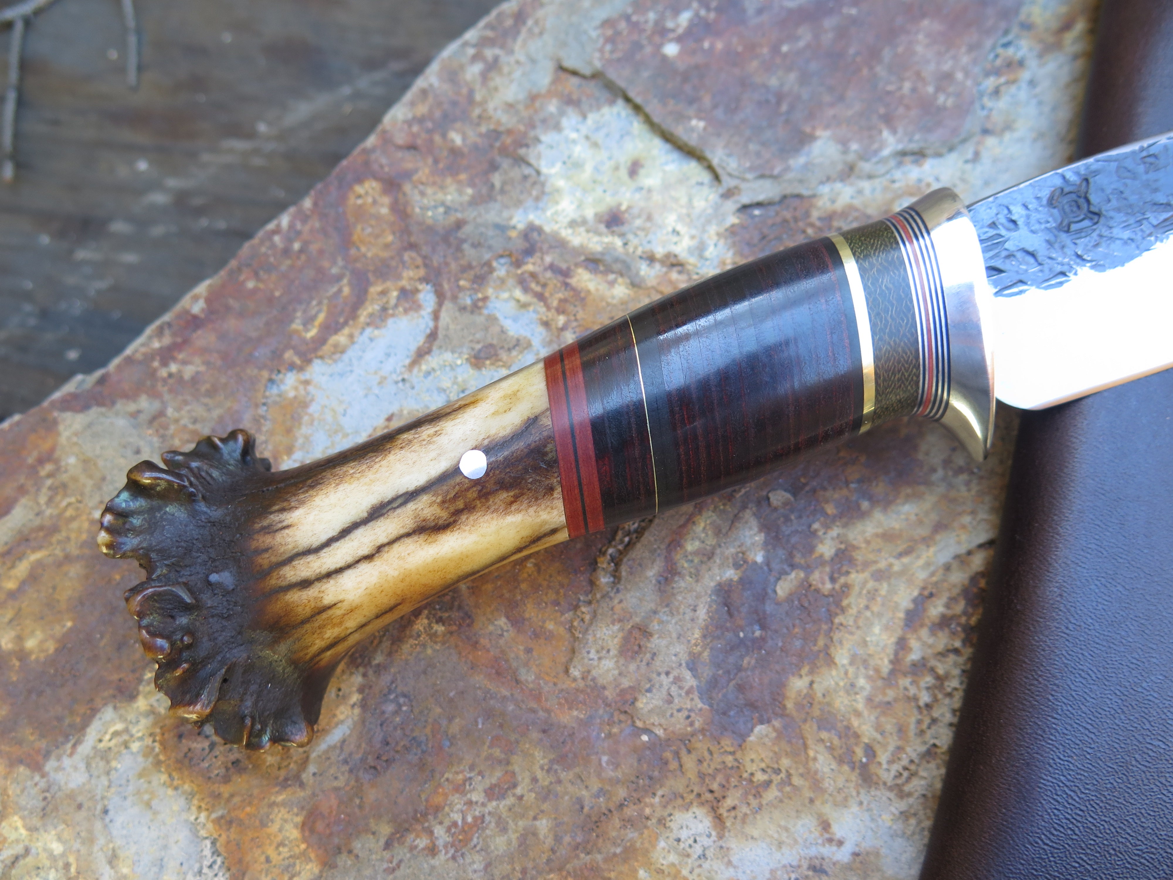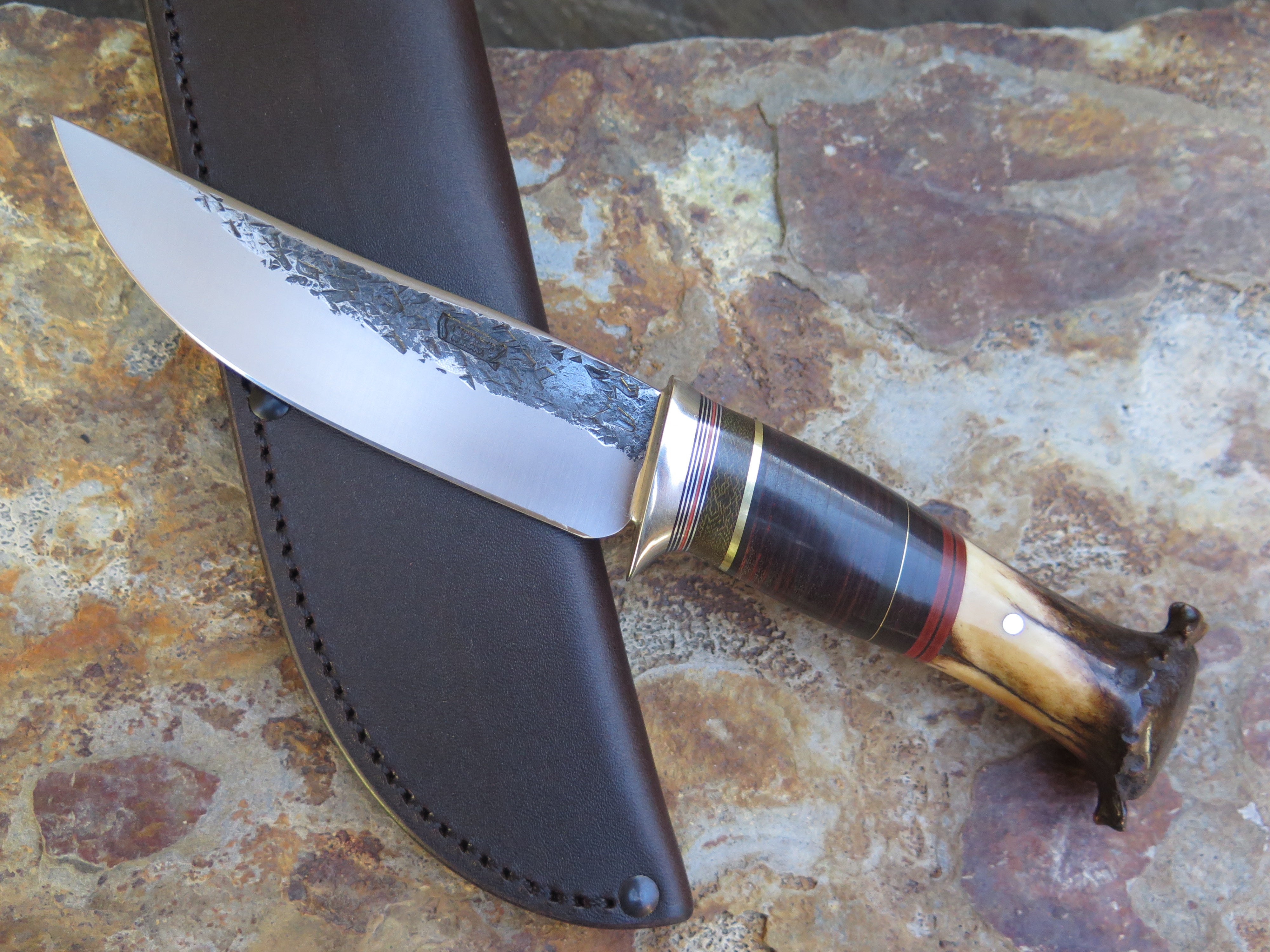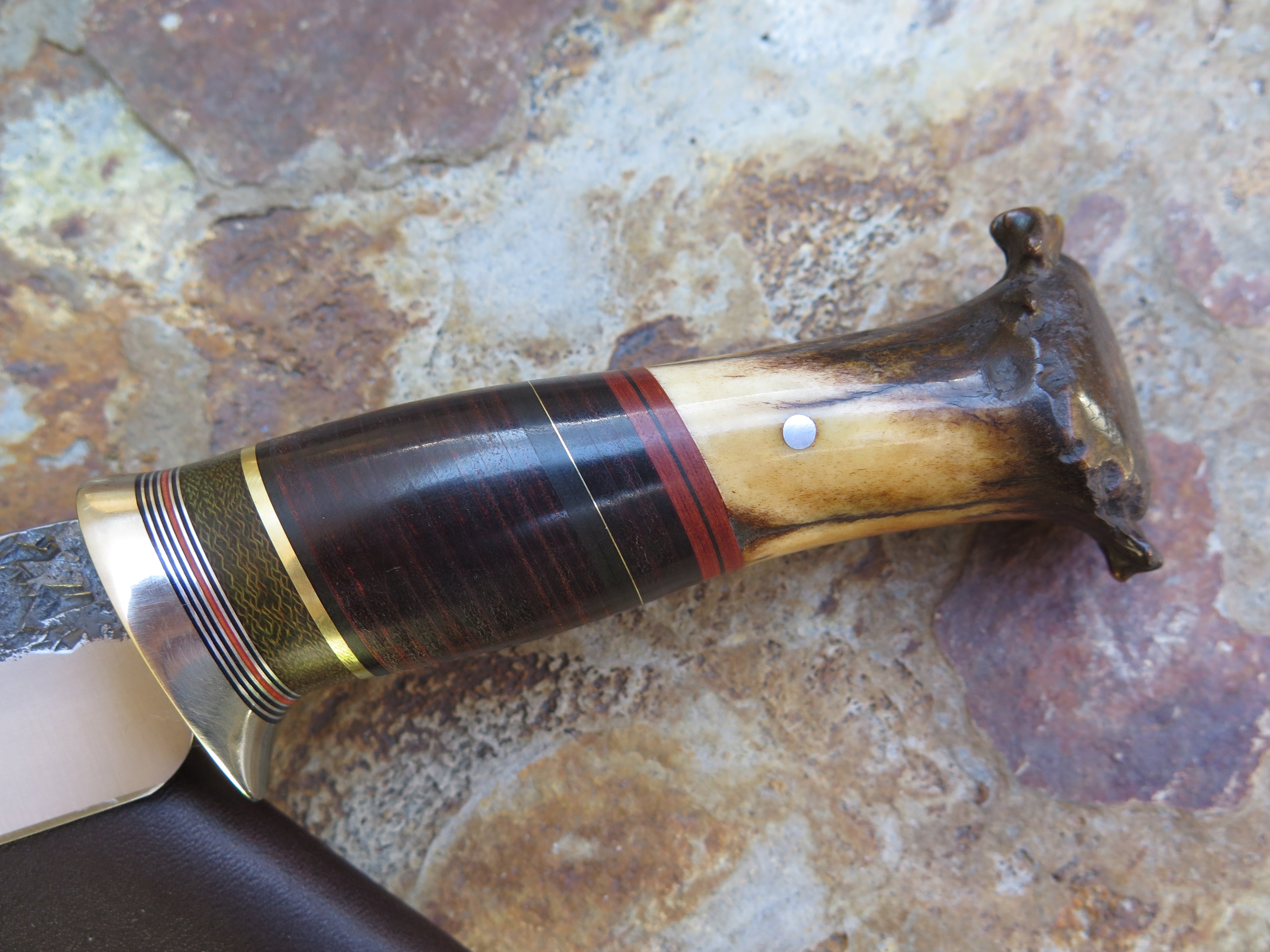 This awesome new Hunter from Behring Made© is hand forged from 3/16" thick high carbon 01 tool steel and it measures about 5 1/2" from tip to guard with a razor sharp hollow grind and our hammermark finish. The brass guard is soldered in place above black and maroon fiber, brass, aluminum, and horsehide leather spacers as well as a premium crown stag butt that is pinned through the tang with aluminum. The overall length measures 10 1/4" and it comes in a classic leather belt pouch sheath.