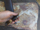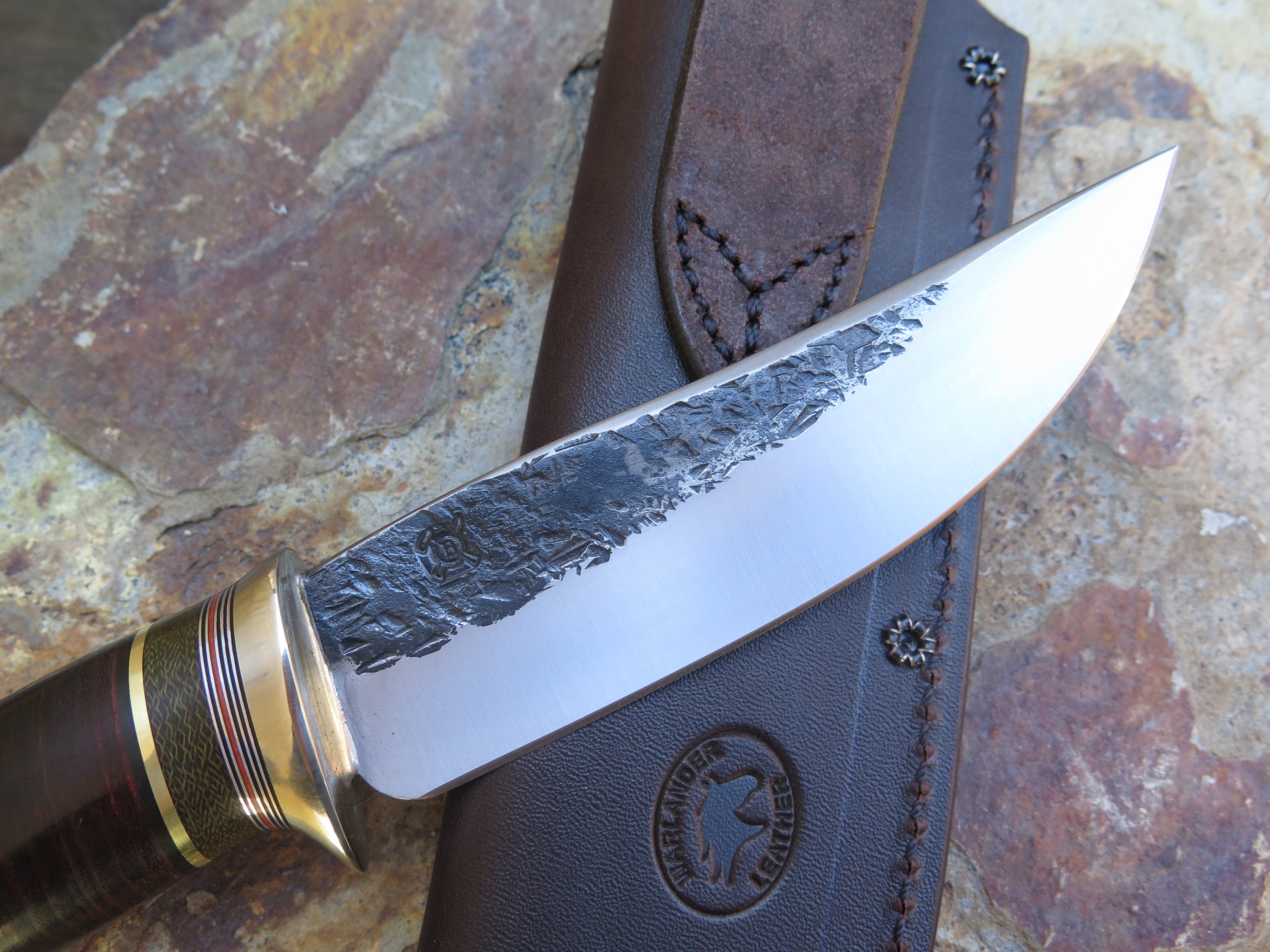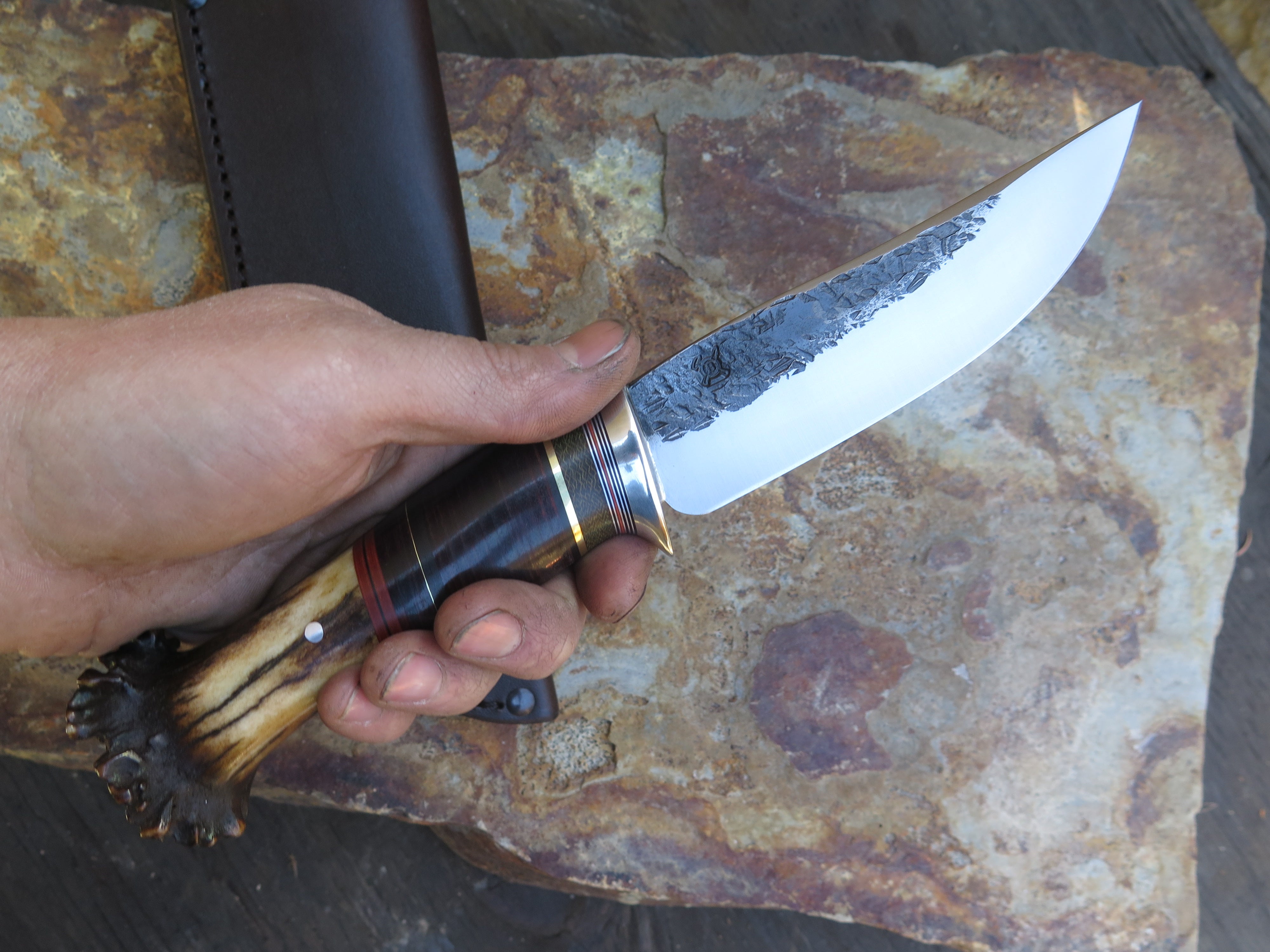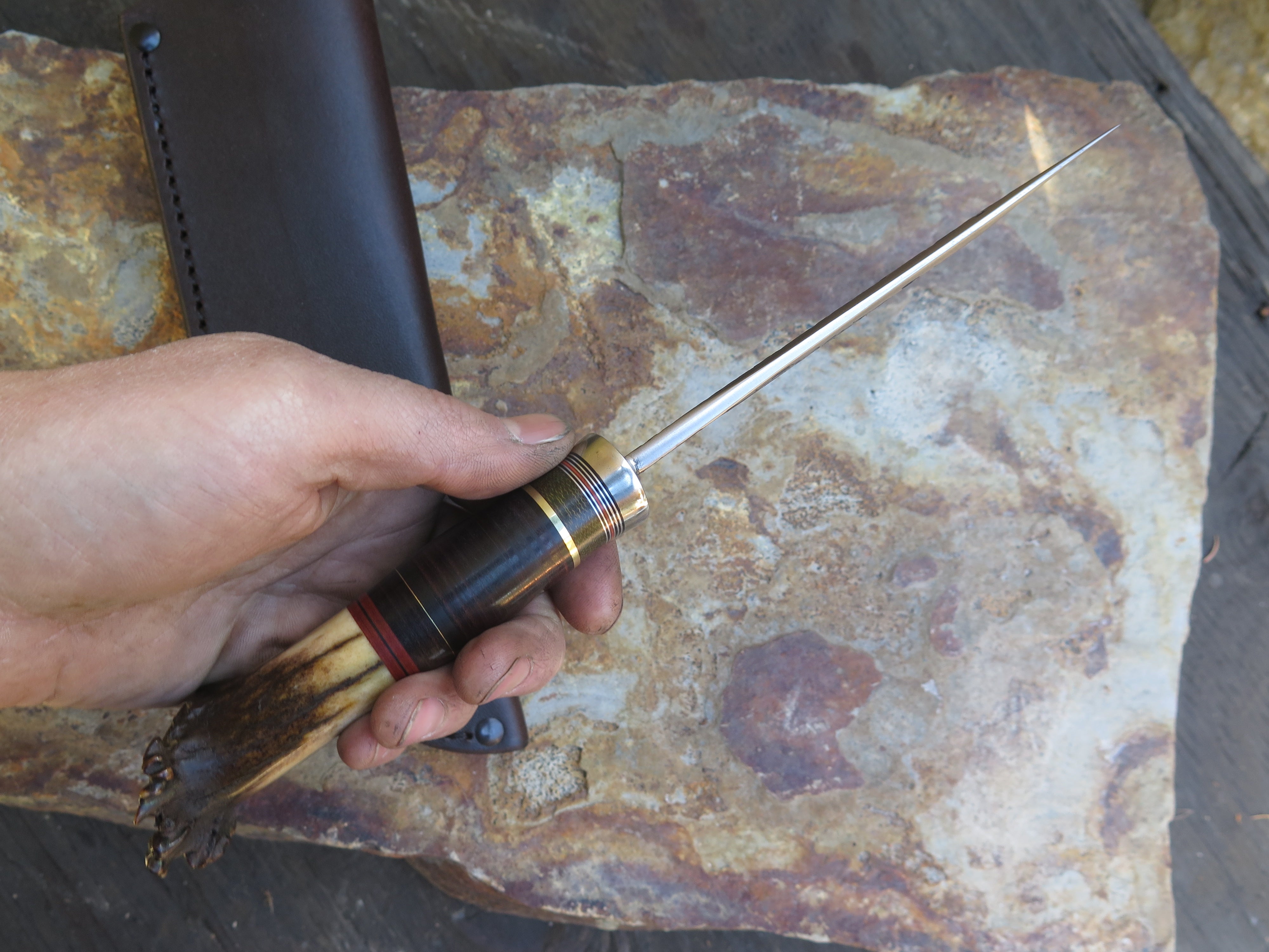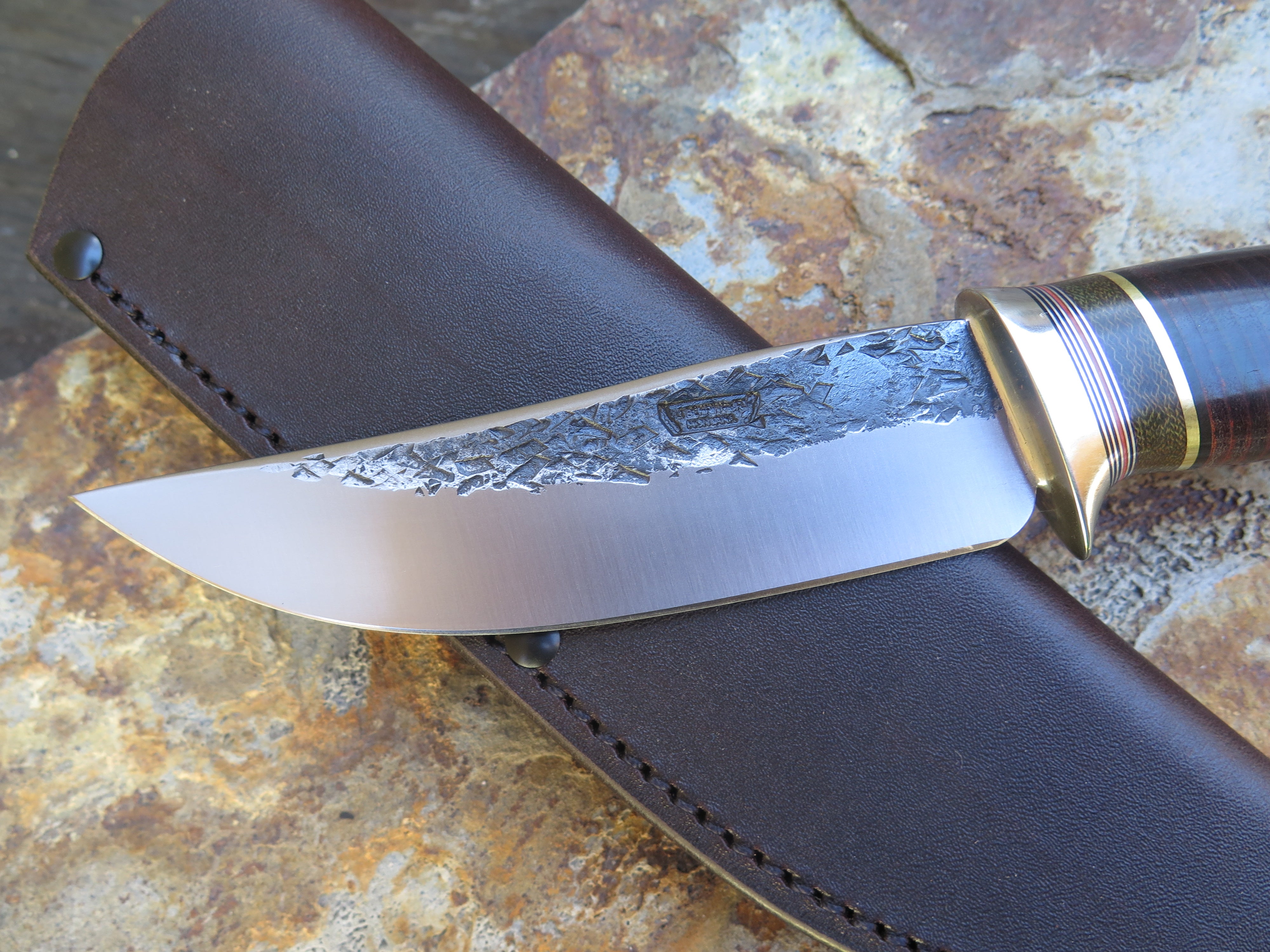 This awesome new Hunter from Behring Made© is hand forged from 3/16" thick high carbon 01 tool steel and it measures about 5 1/2" from tip to guard with a razor sharp hollow grind and our hammermark finish. The brass guard is soldered in place above black and maroon fiber, brass, aluminum, and horsehide leather spacers as well as a premium crown stag butt that is pinned through the tang with aluminum. The overall length measures 10 1/4" and it comes in a classic leather belt pouch sheath.