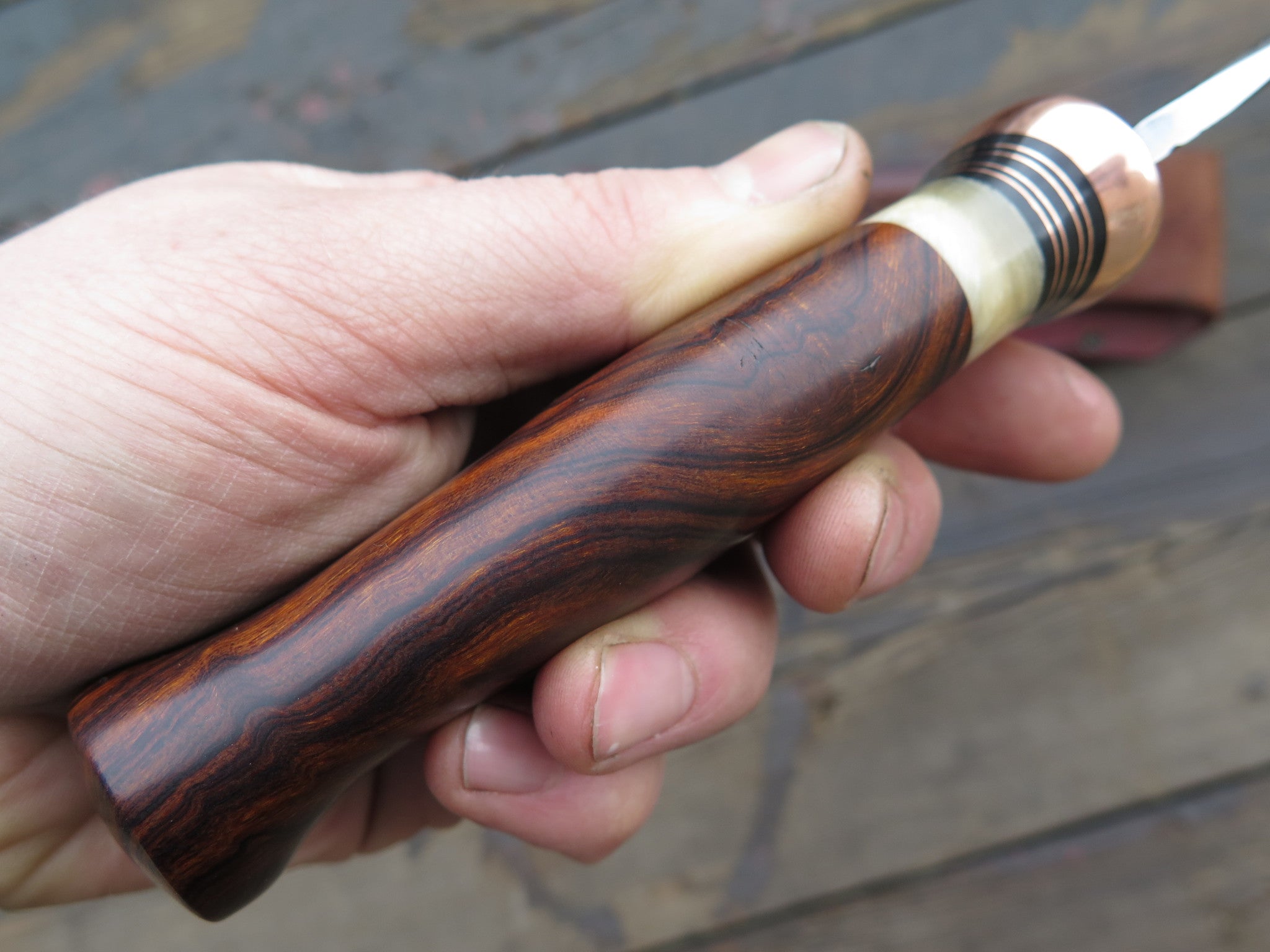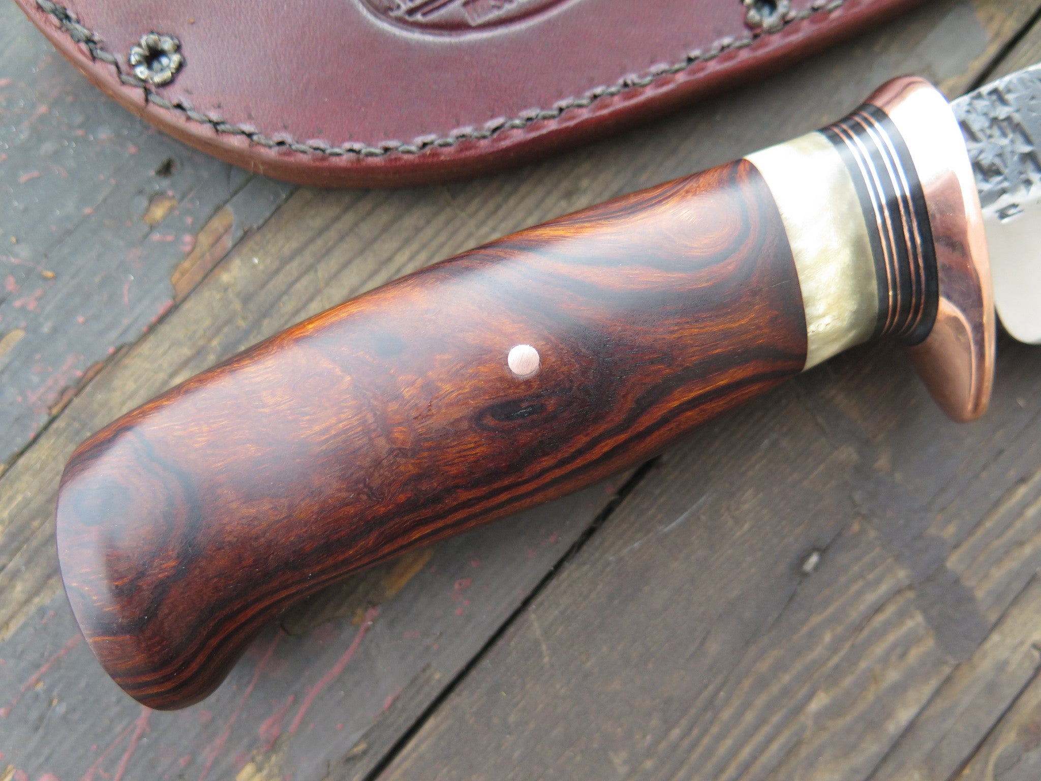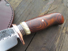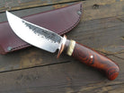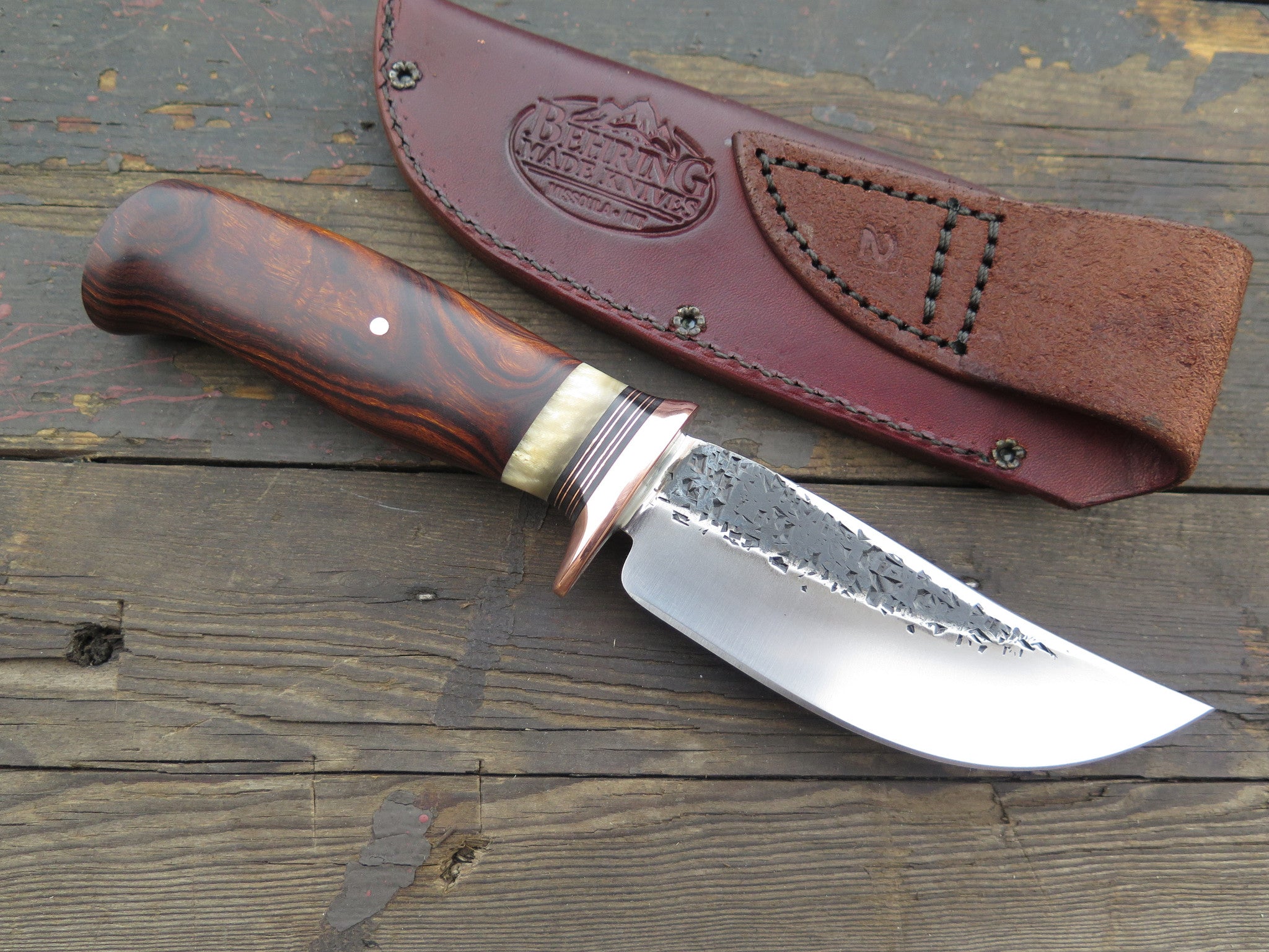 This gorgeous Behring Made hunter is hand forged from high carbon 01 tool steel and measures 4 1/2" from tip to guard with a razor sharp hollow grind and a hammermark finish. The copper guard is soldered in place above black, copper and musk ox boss spacers as well as a premium desert ironwood handle that's pinned with copper. The overall length measures 9 3/8" and it comes in our Behring Made pouch style sheath.