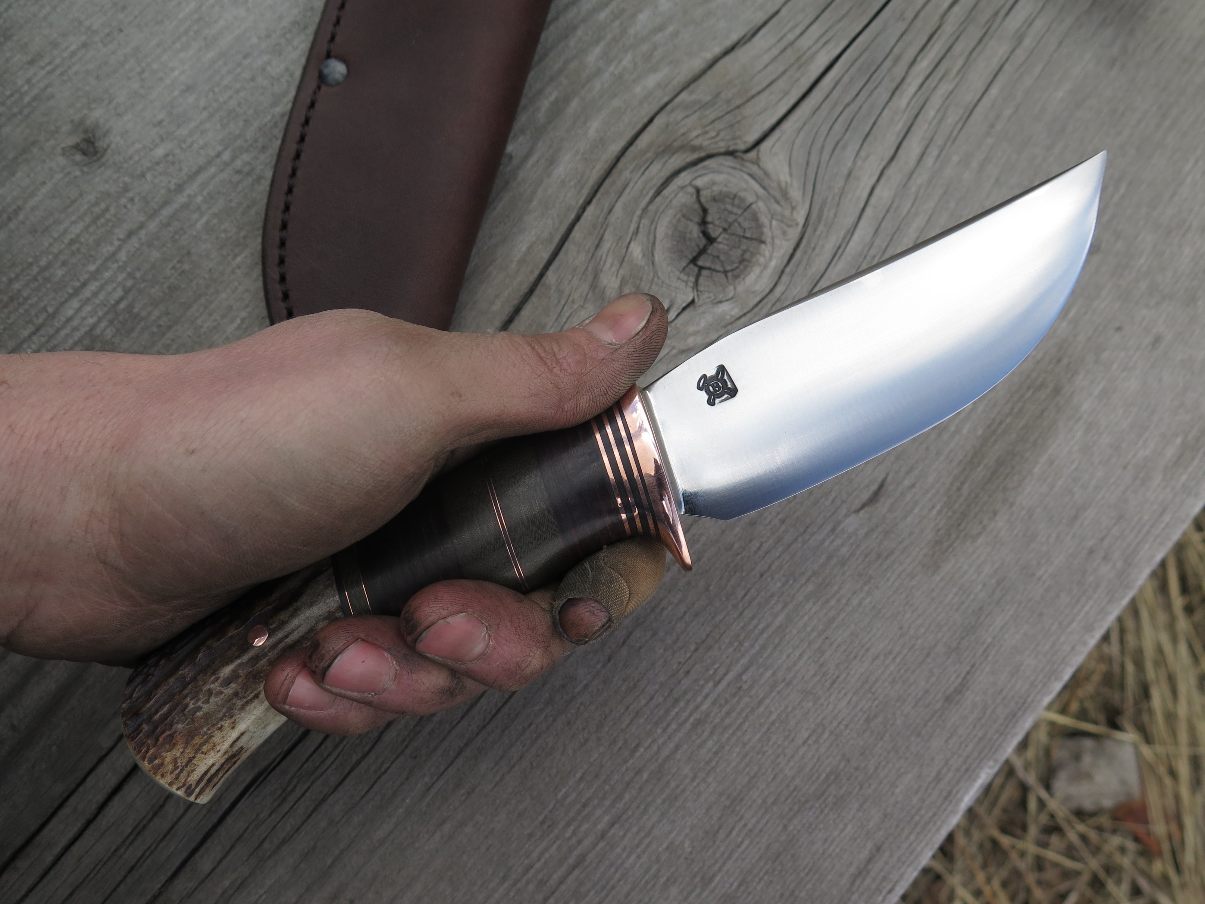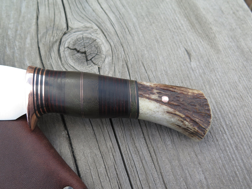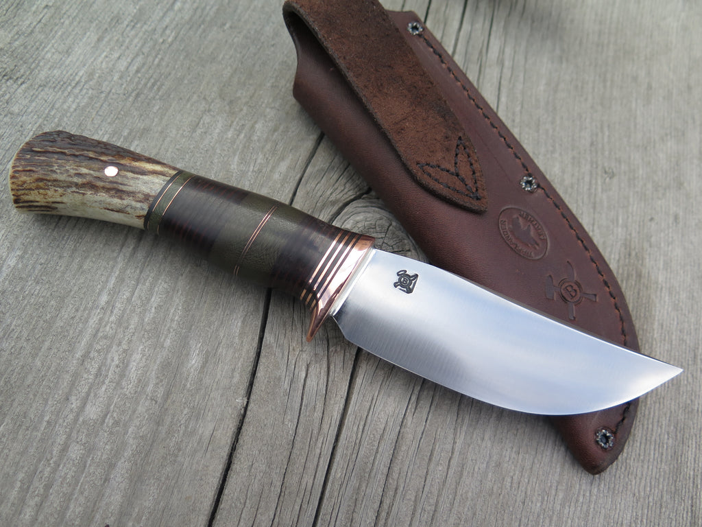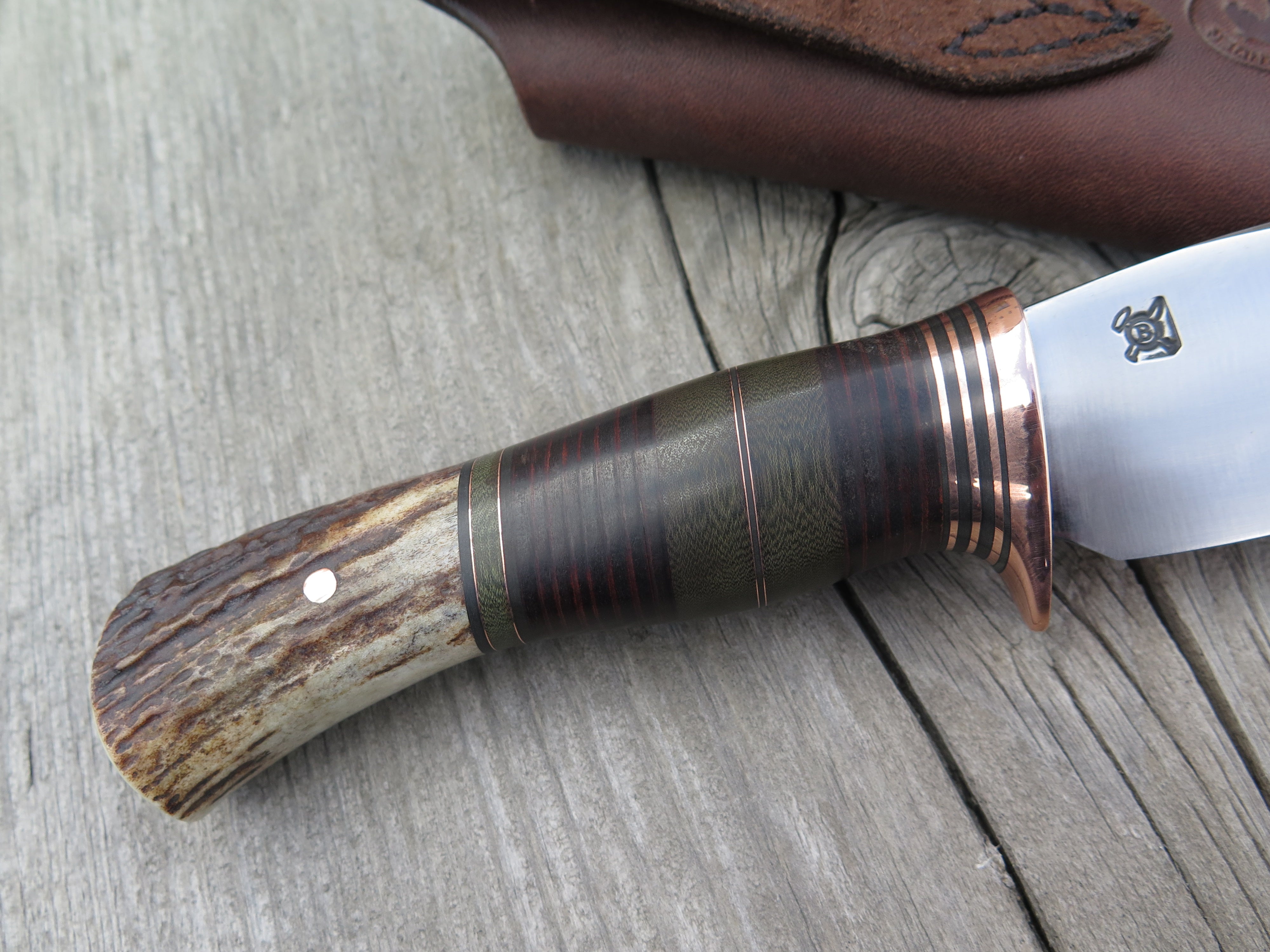 This incredible new Hunter from Behring Made© is hand forged from 3/16" thick high carbon 01 tool steel and it measures 4 3/4" from tip to guard with a razor sharp convex grind. The copper guard is soldered in place above black fiber, copper, green micarta and horsehide spacers as well as a premium elk stag butt that's pinned through the tang with copper. The overall length measures just over 9 1/2" and it comes in a classic belt pouch sheath.