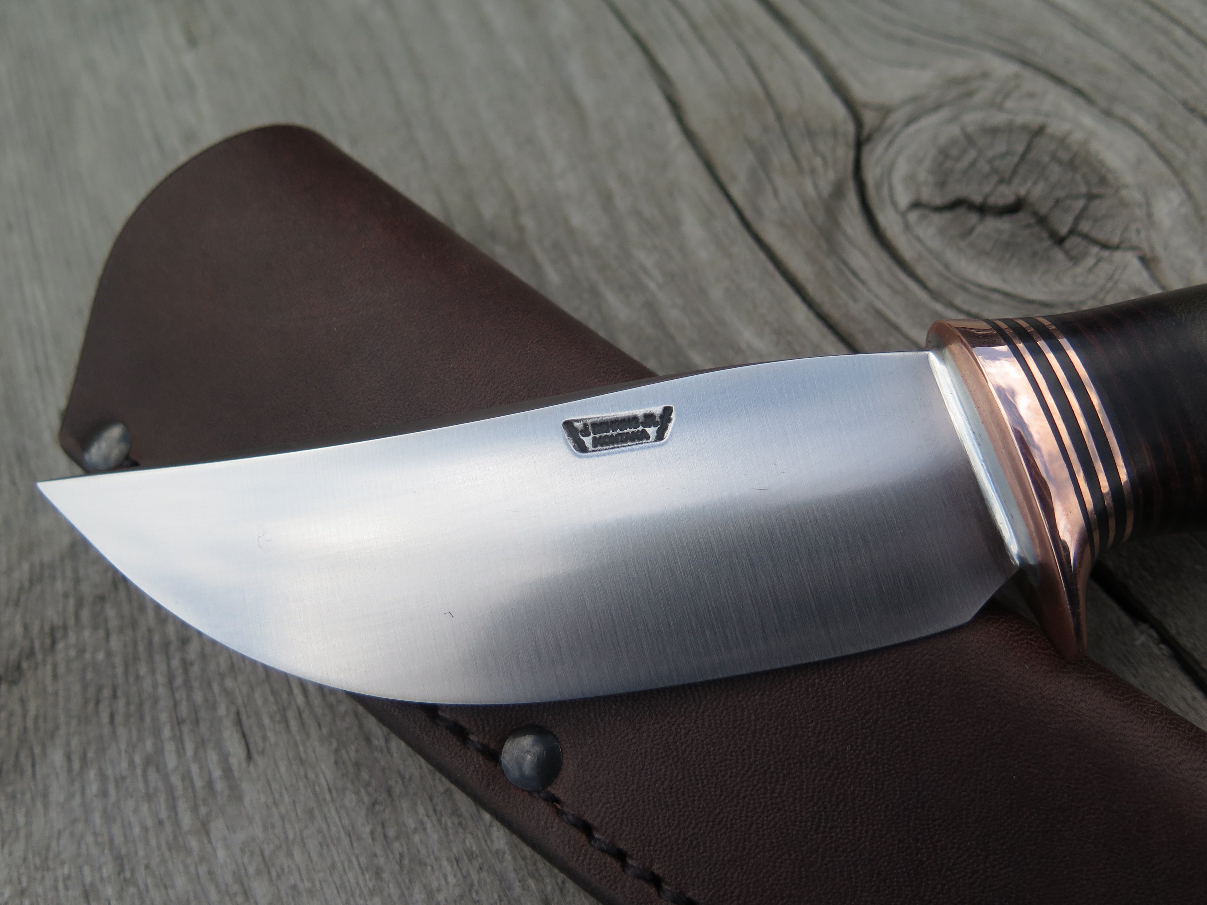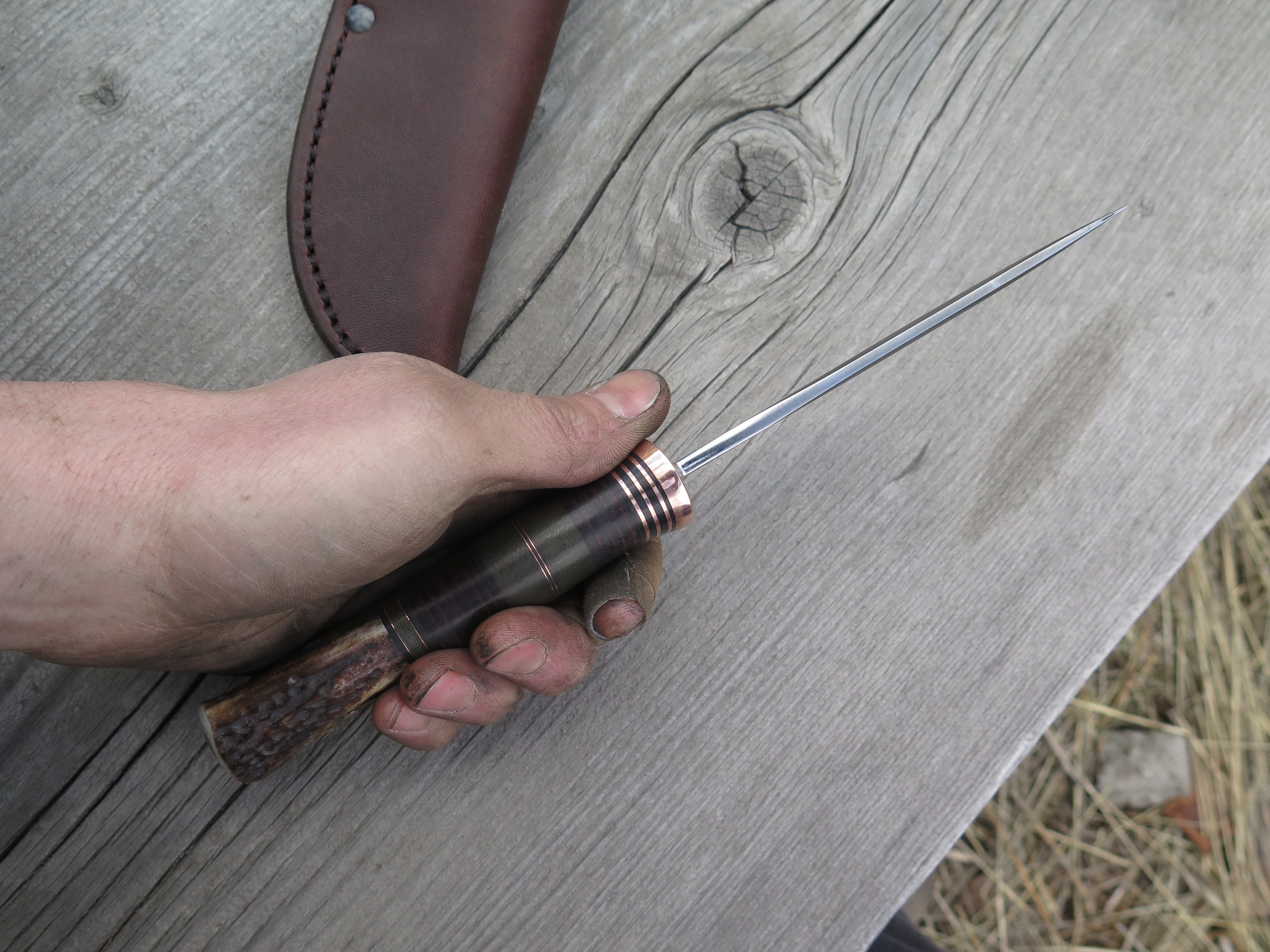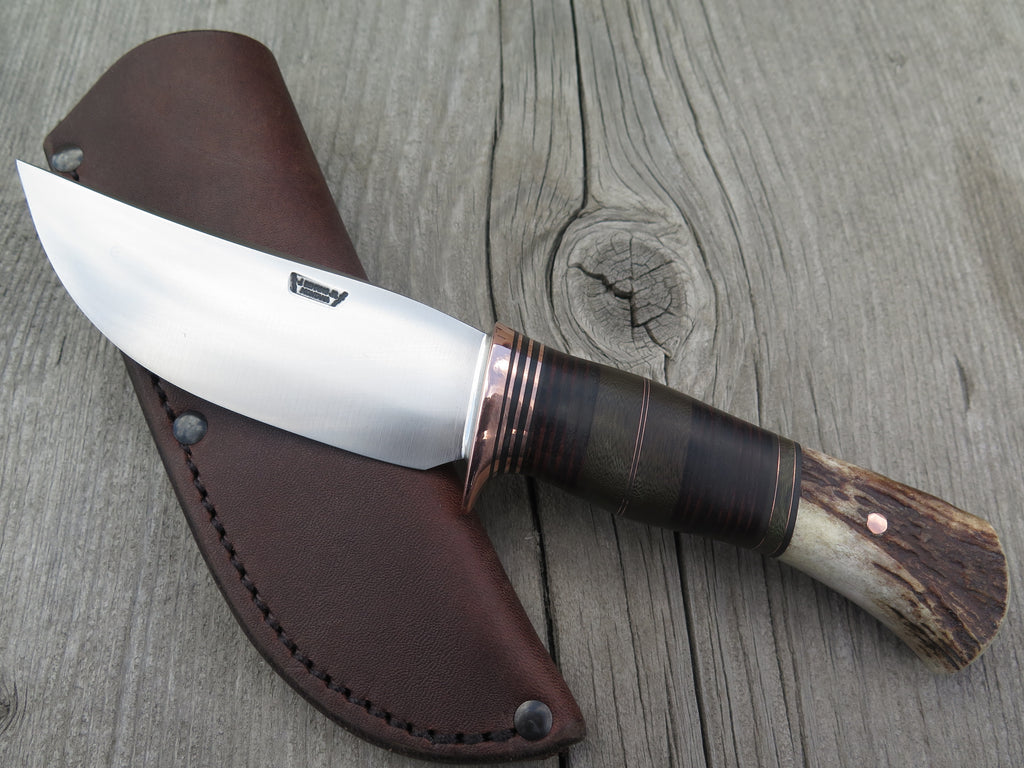 This incredible new Hunter from Behring Made© is hand forged from 3/16" thick high carbon 01 tool steel and it measures 4 3/4" from tip to guard with a razor sharp convex grind. The copper guard is soldered in place above black fiber, copper, green micarta and horsehide spacers as well as a premium elk stag butt that's pinned through the tang with copper. The overall length measures just over 9 1/2" and it comes in a classic belt pouch sheath.