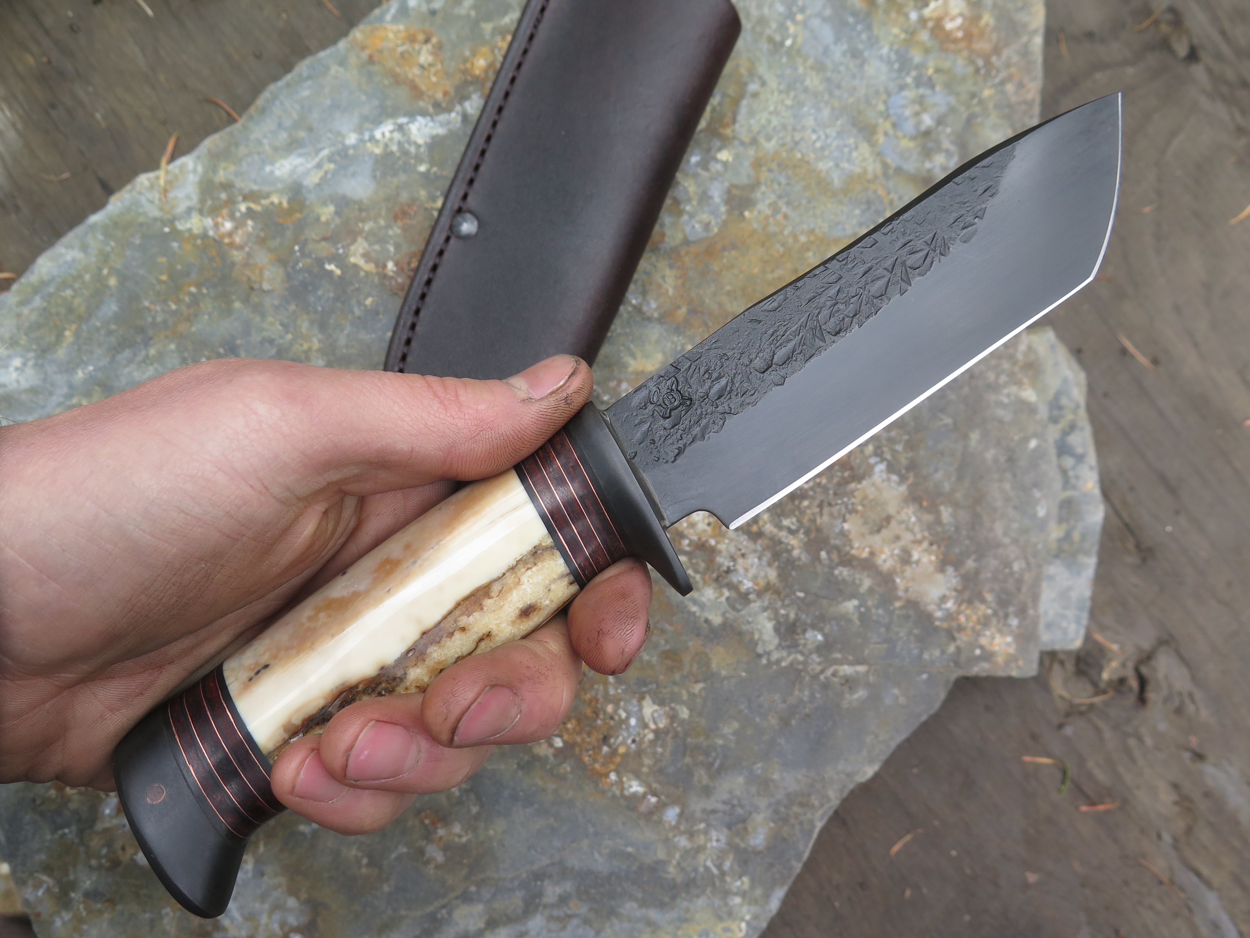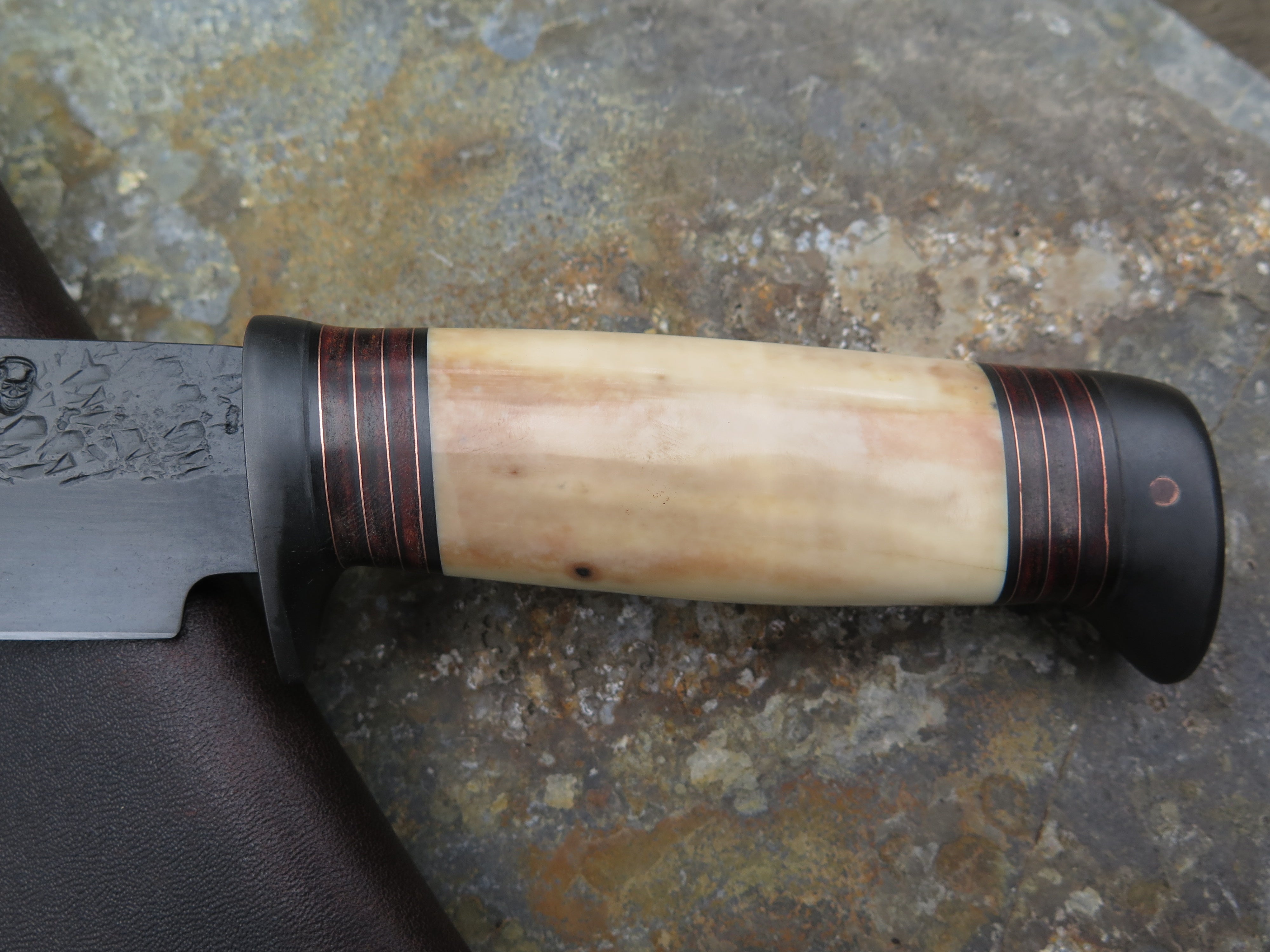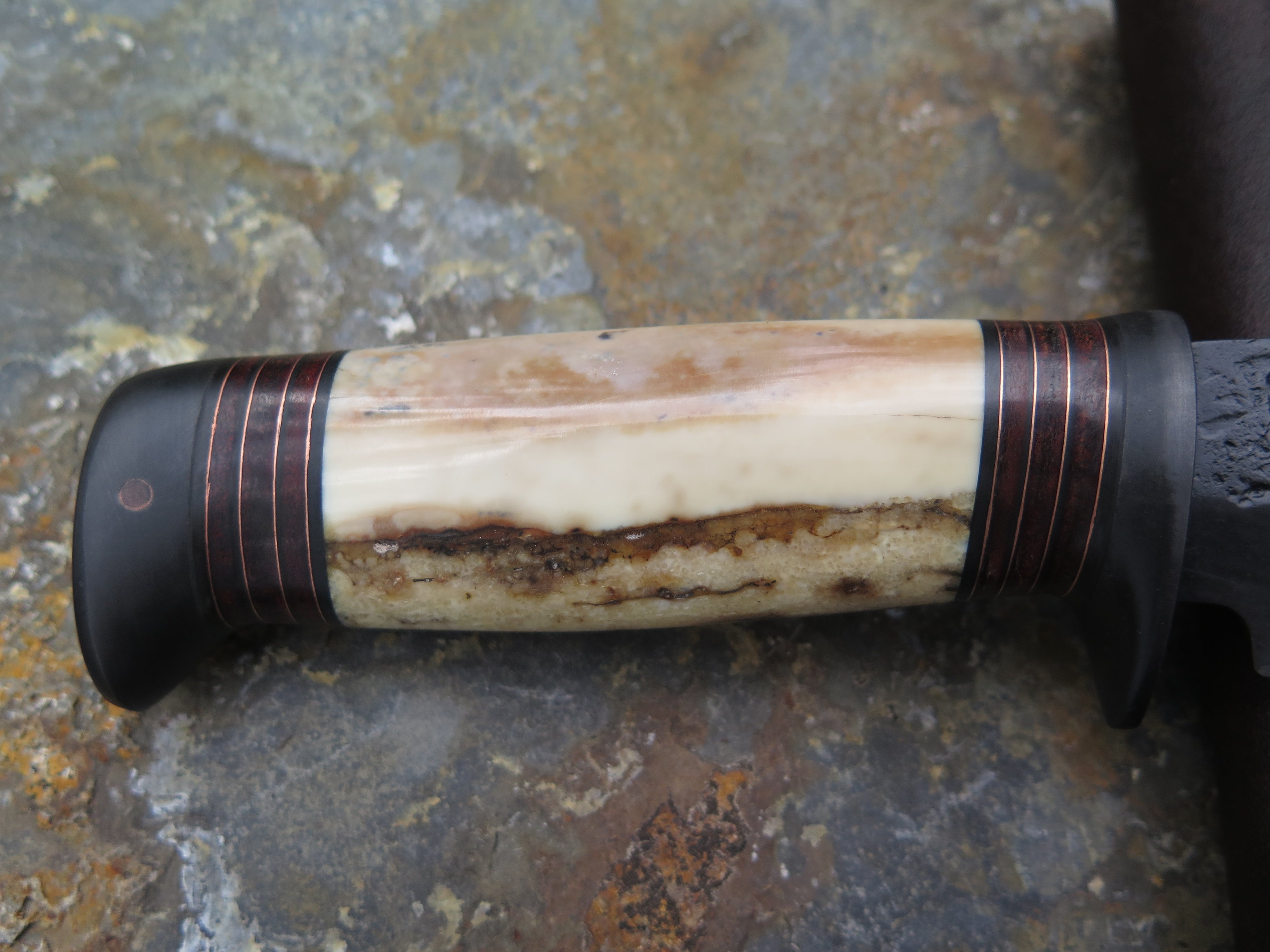 This bad ass Tanto from Behring Made© is hand forged from 3/16" thick high carbon 01 tool steel and it measures 5 1/4" from tip to guard with a razor sharp hollow grind, hammermarks and our forced patina blued finish. The blued steel guard is soldered in place above black fiber, copper, and horsehide leather spacers with a gorgeous fossil walrus core that's capped with blued steel and then pinned through the tang with copper. The overall length measures 9 3/4" and it comes in a classic brown leather belt pouch sheath.