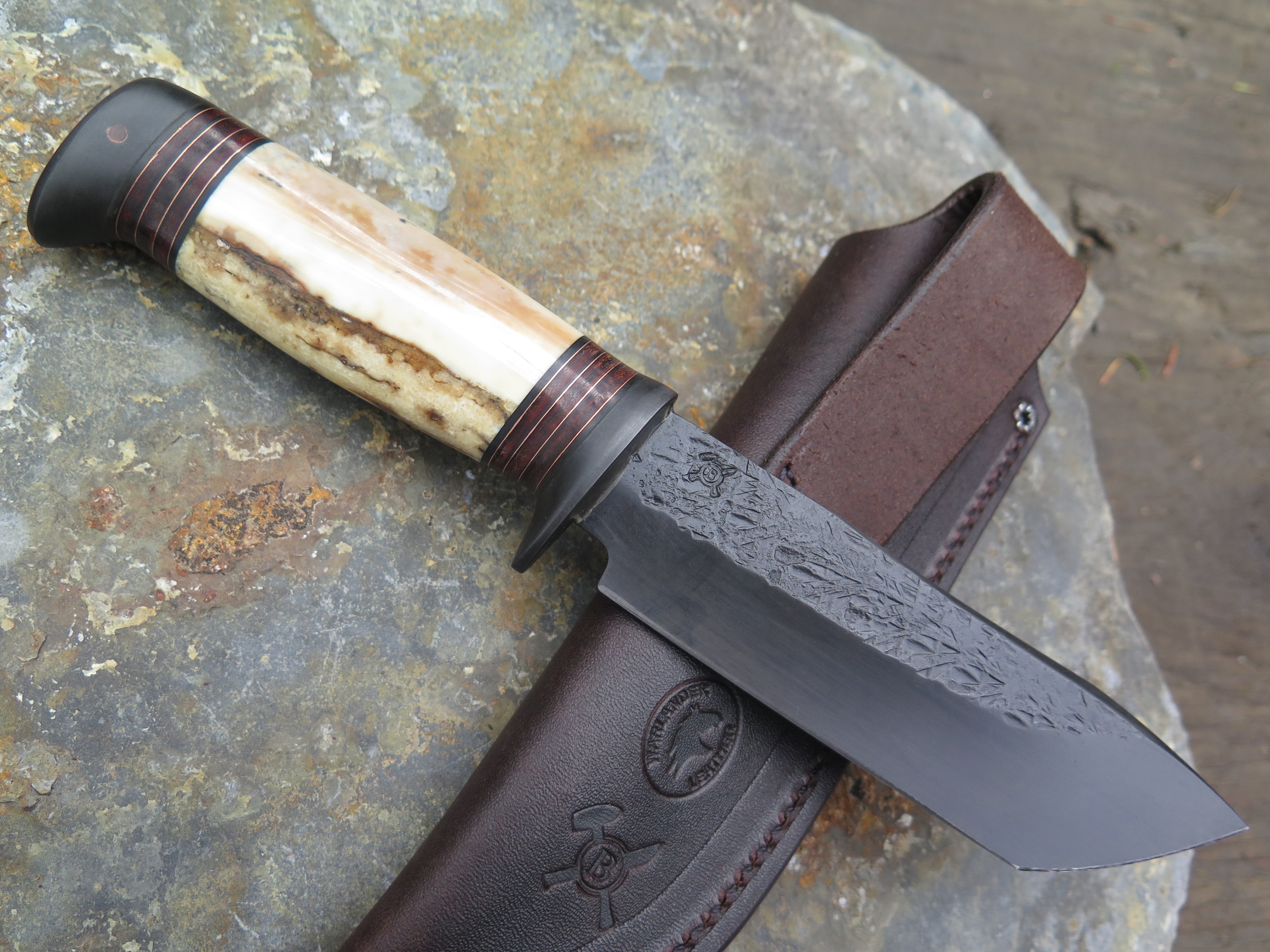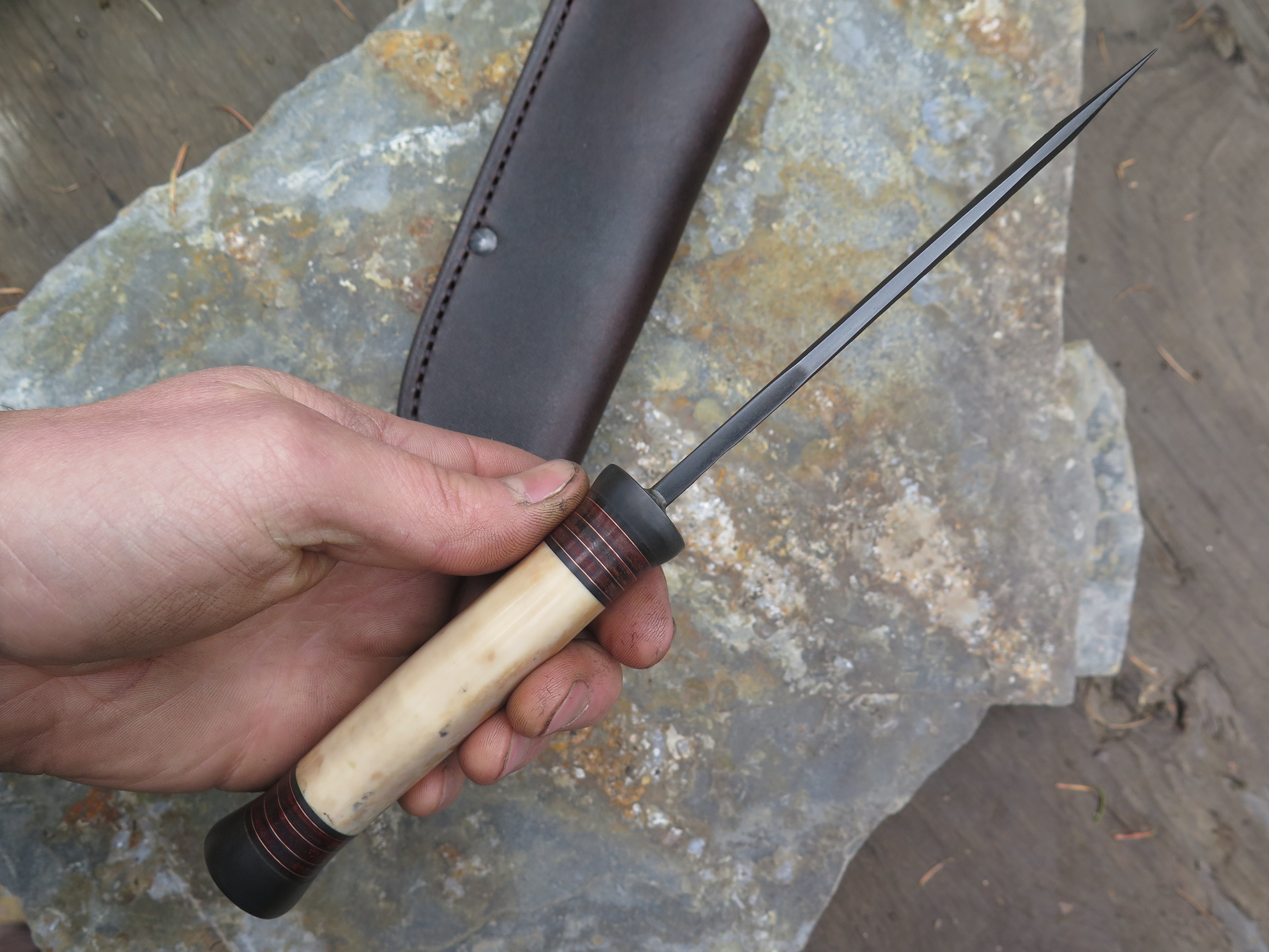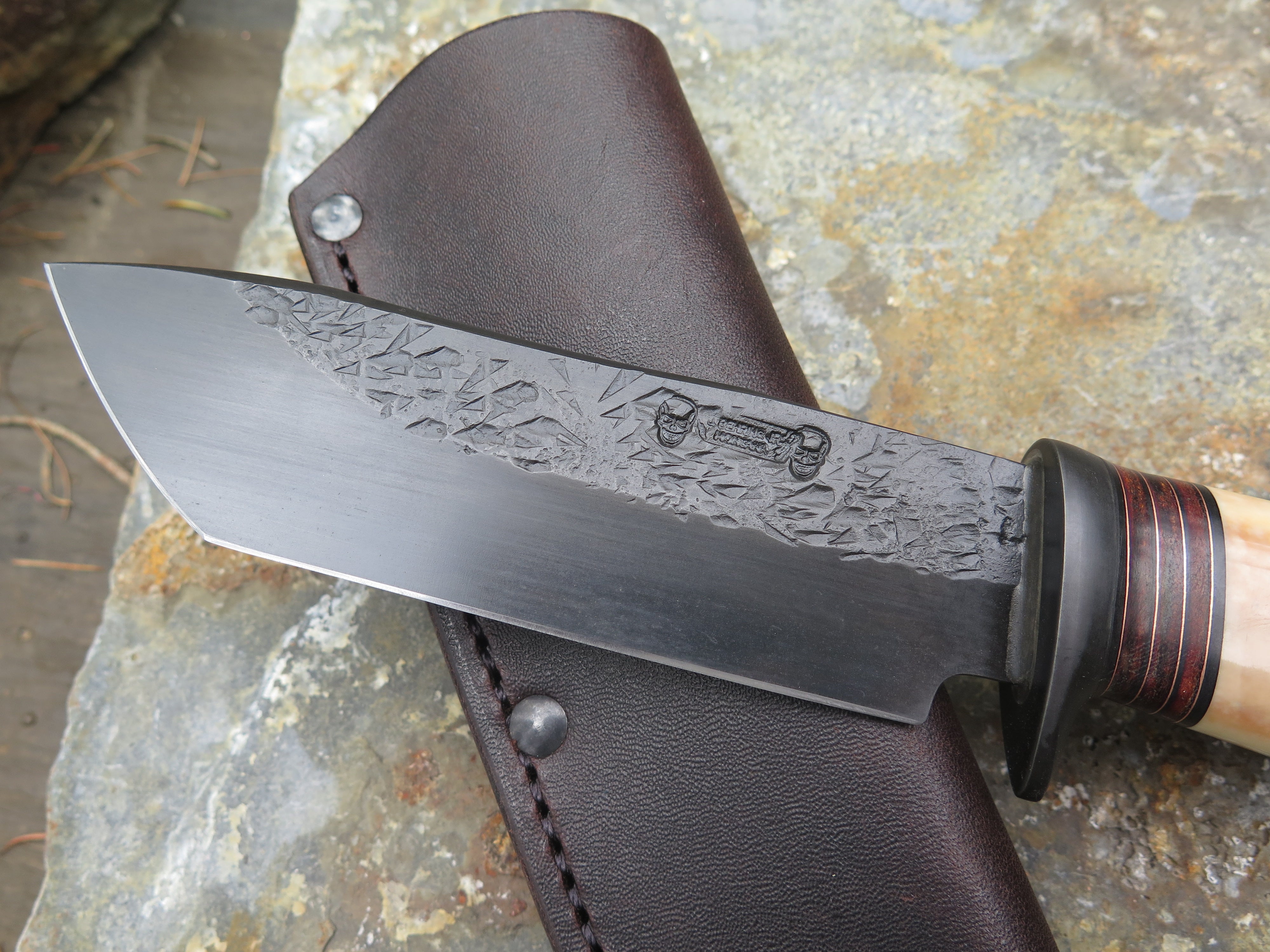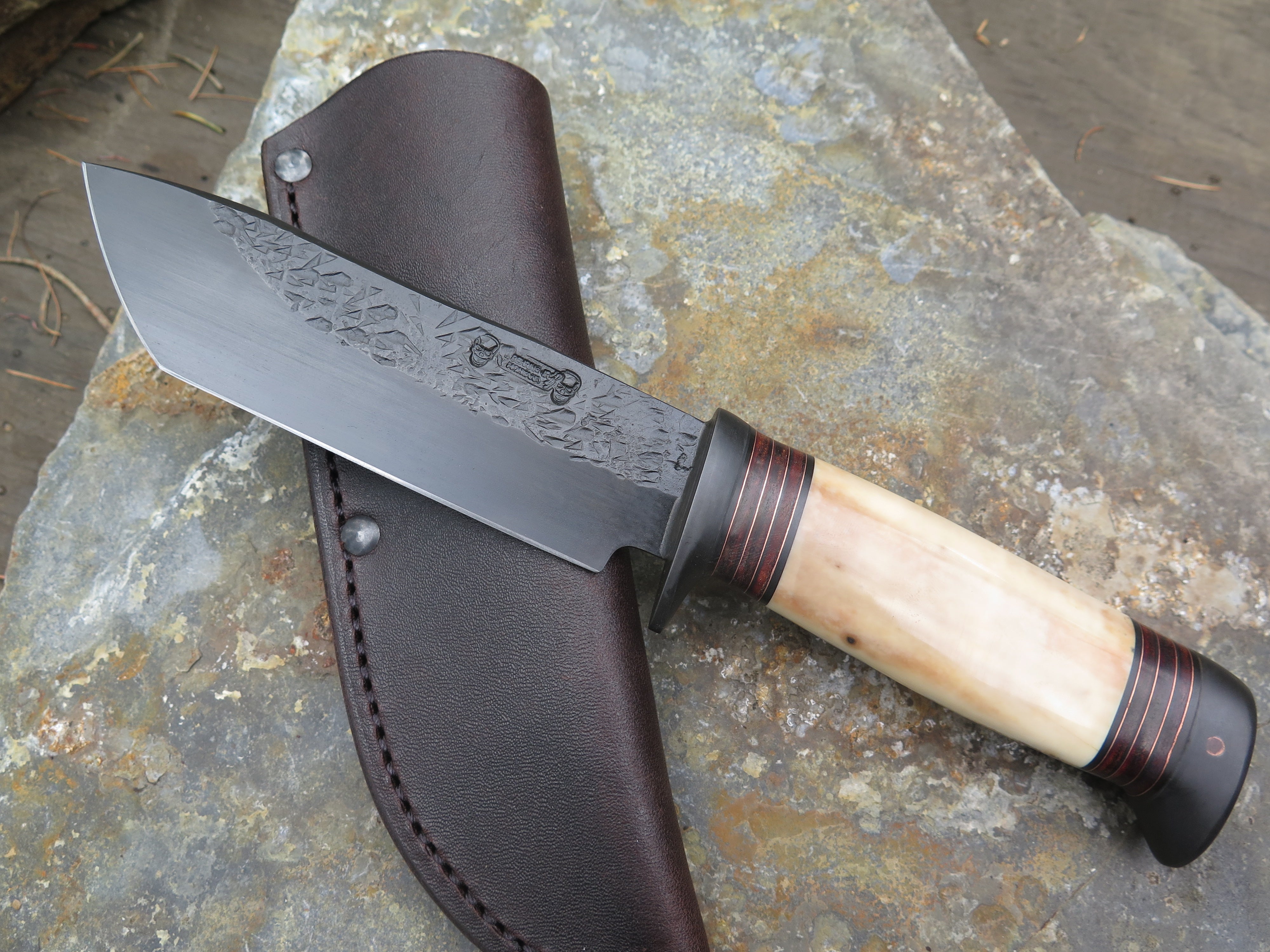 This bad ass Tanto from Behring Made© is hand forged from 3/16" thick high carbon 01 tool steel and it measures 5 1/4" from tip to guard with a razor sharp hollow grind, hammermarks and our forced patina blued finish. The blued steel guard is soldered in place above black fiber, copper, and horsehide leather spacers with a gorgeous fossil walrus core that's capped with blued steel and then pinned through the tang with copper. The overall length measures 9 3/4" and it comes in a classic brown leather belt pouch sheath.