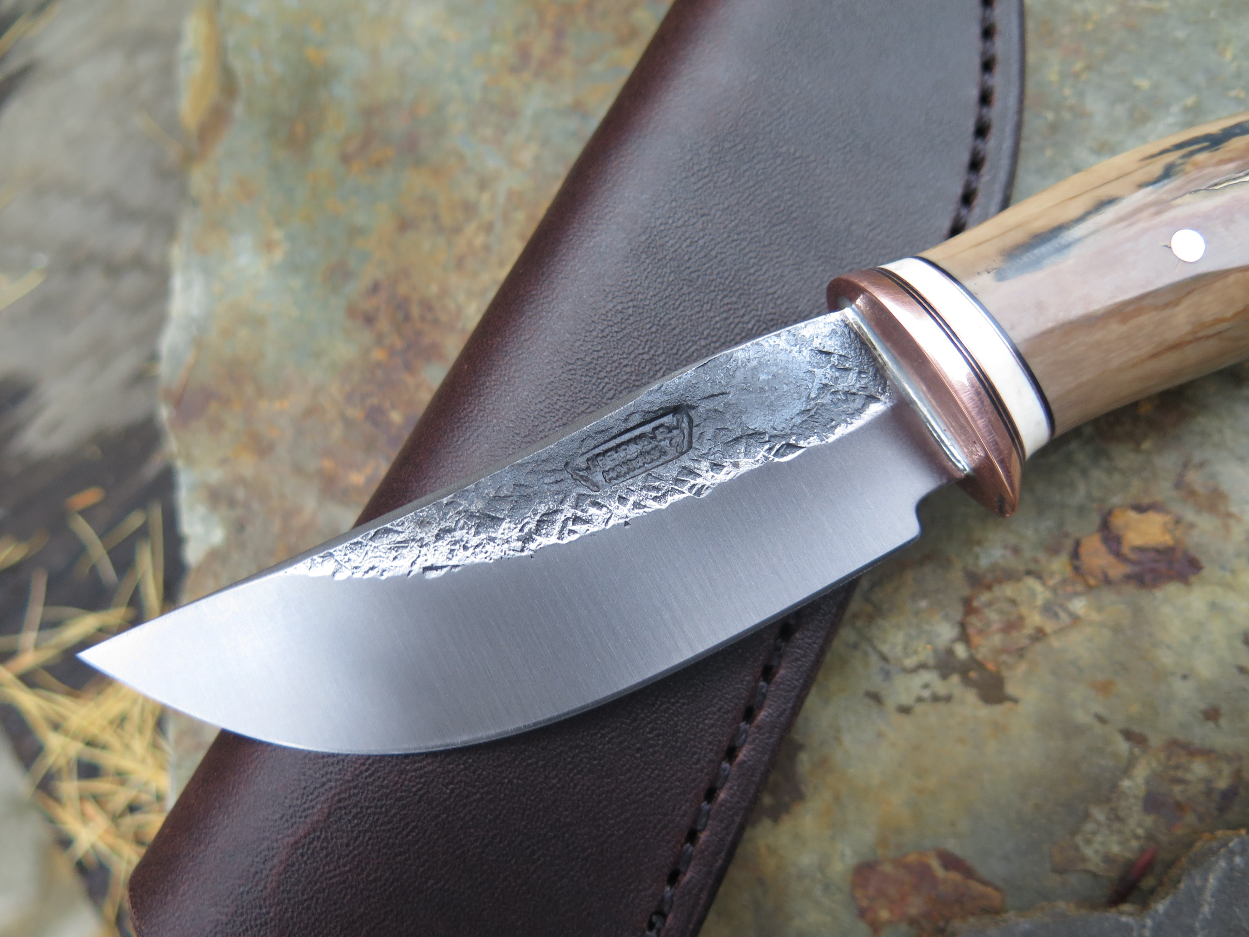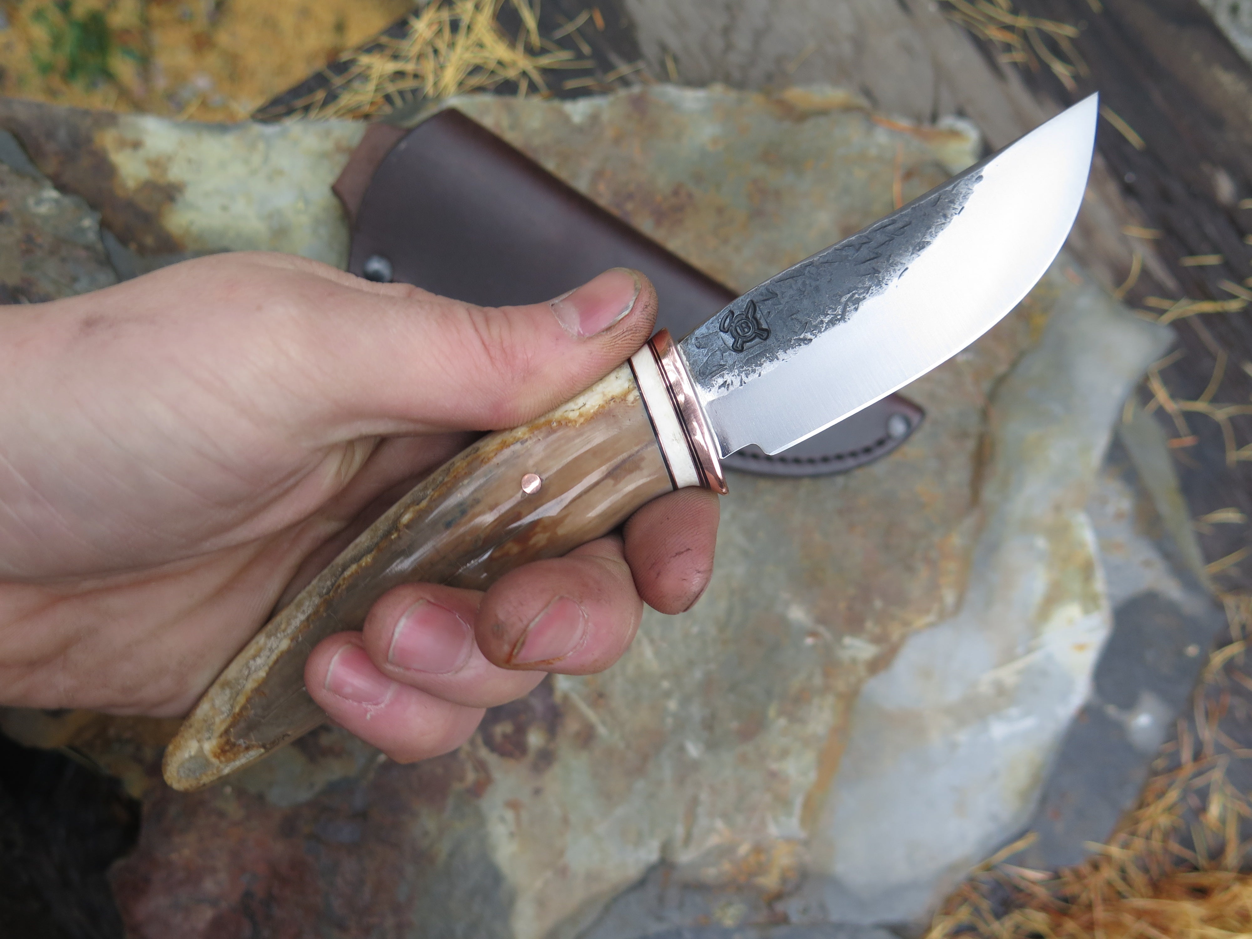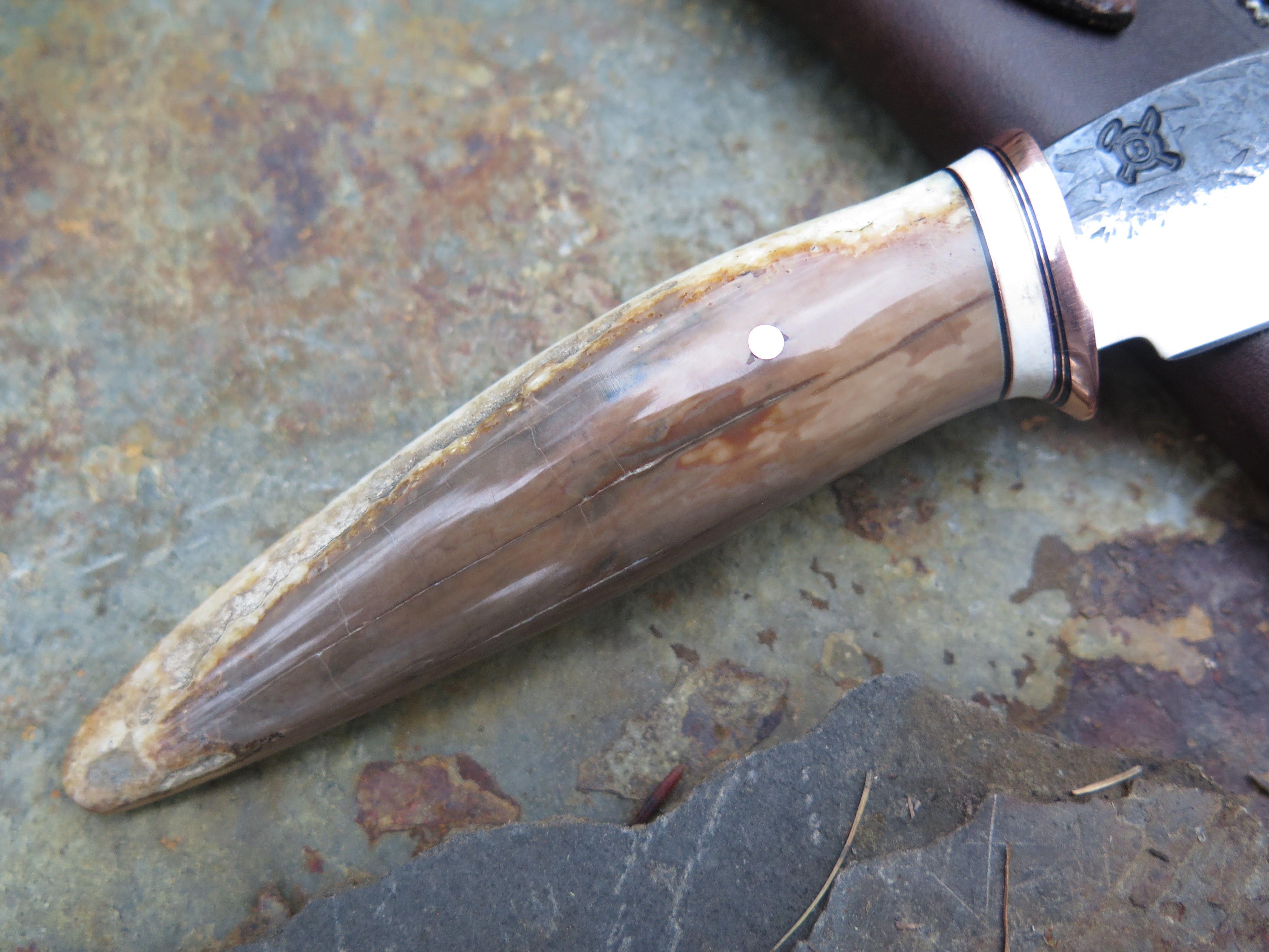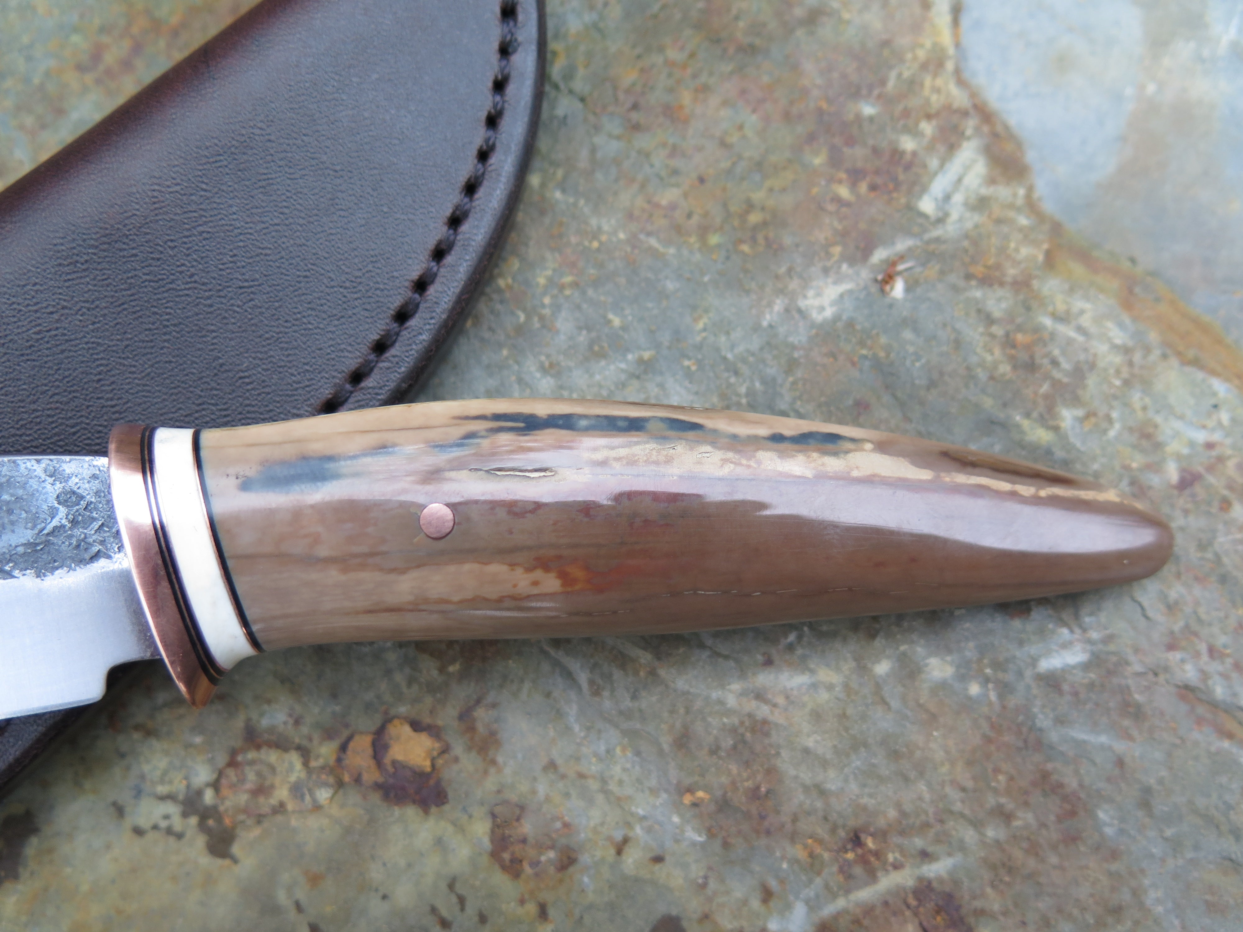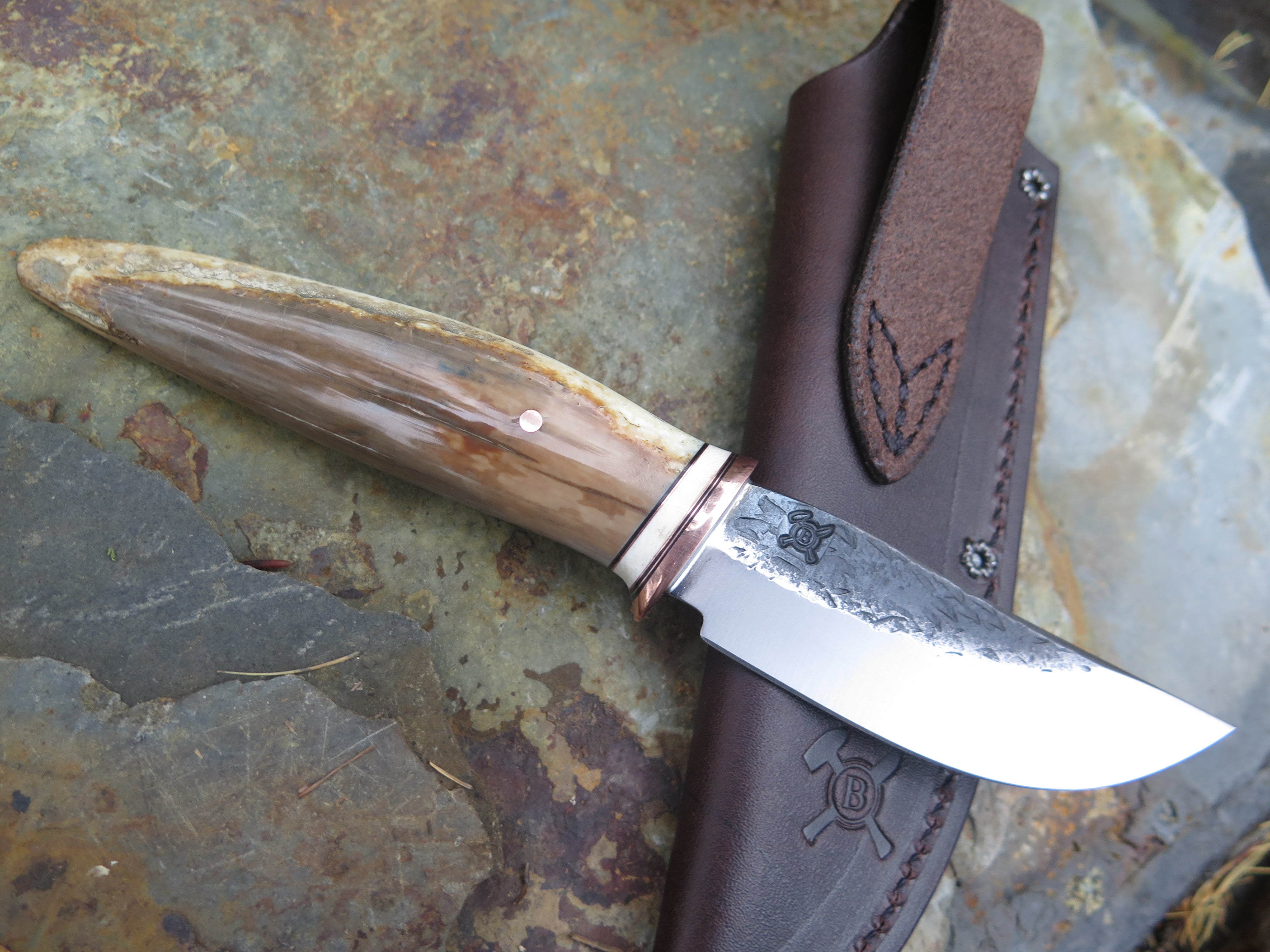 This incredible new Hunter from Behring Made© is hand forged from 1/8" thick high carbon 01 tool steel and it measures 3 1/2" from tip to guard with a razor sharp hollow grind and our hammermark finish. The copper guard is soldered in place above black fiber, copper, and mammoth ivory spacers which top a premium fossil walrus ivory tip handle that's pinned through the tang with copper. The overall length measures 8" and this one will come in a classic leather belt pouch sheath.