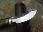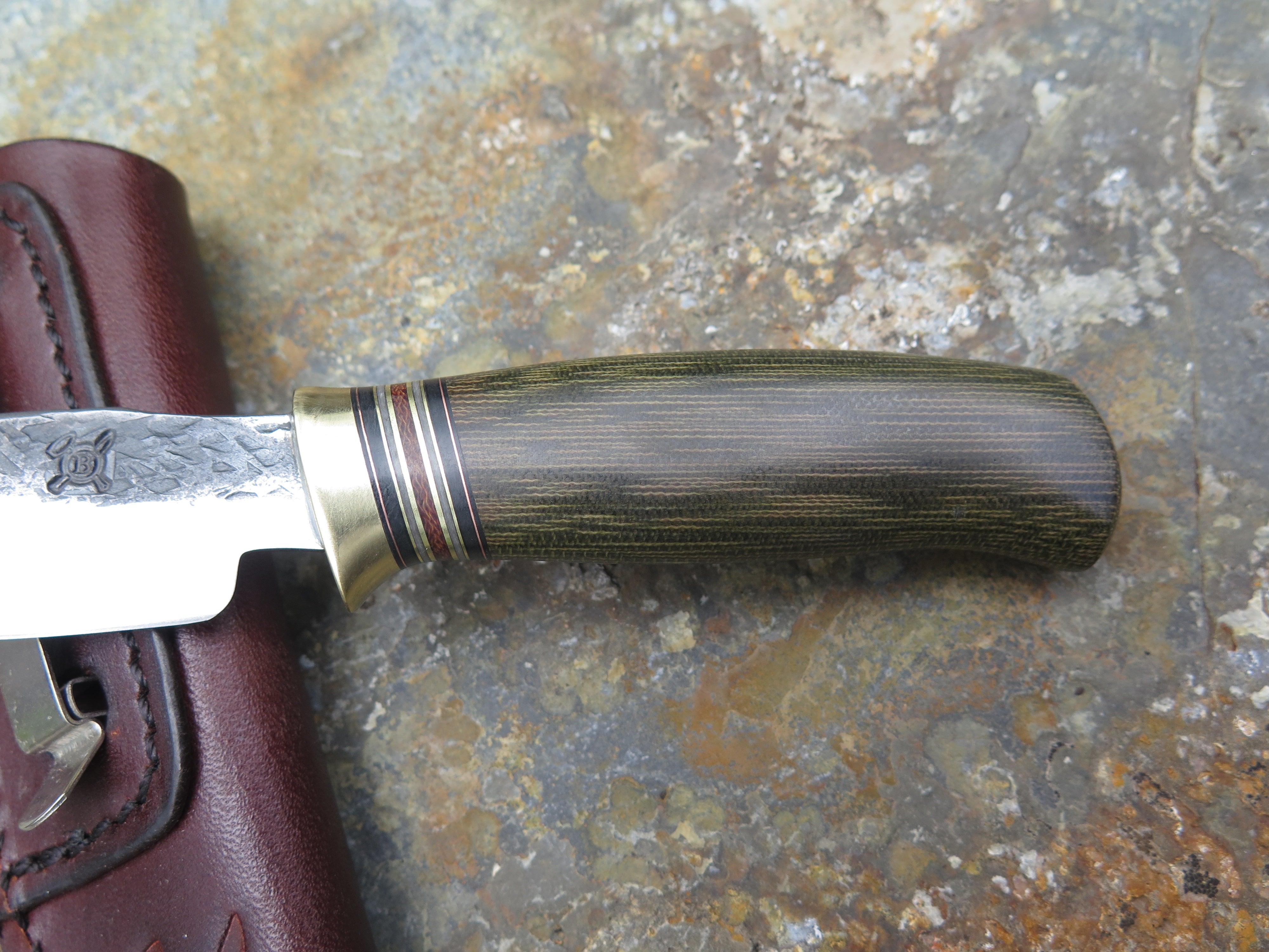 This beautiful Alaskan Pocket from Behring Made© is hand forged from 1/8" thick high carbon 01 tool steel and it measures 3" from tip to guard with a razor sharp hollow grind and our hammermark finish. The brass guard is soldered in place above black and gray fiber, brown micarta and brass spacers with a green canvas micarta handle. The overall length measures 6 1/4" and it comes in a clip style sheath designed to ride in the right hand pocket.