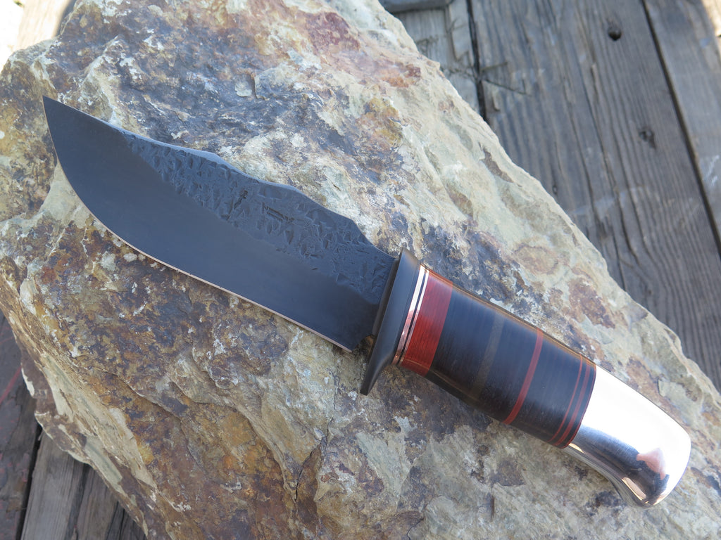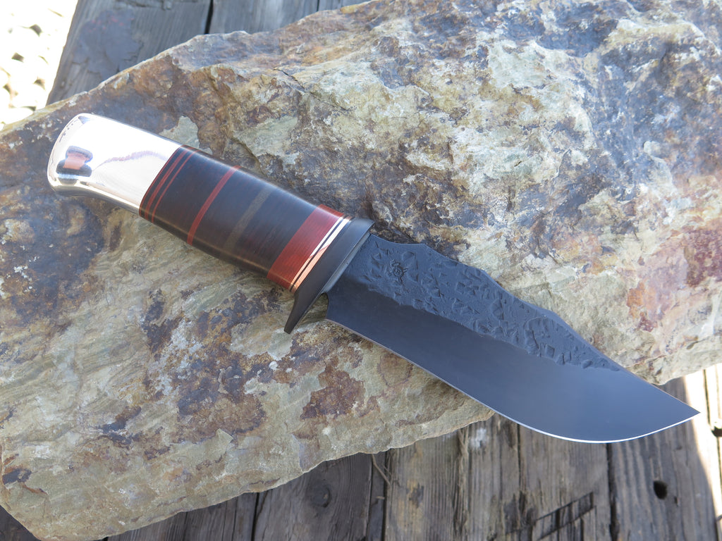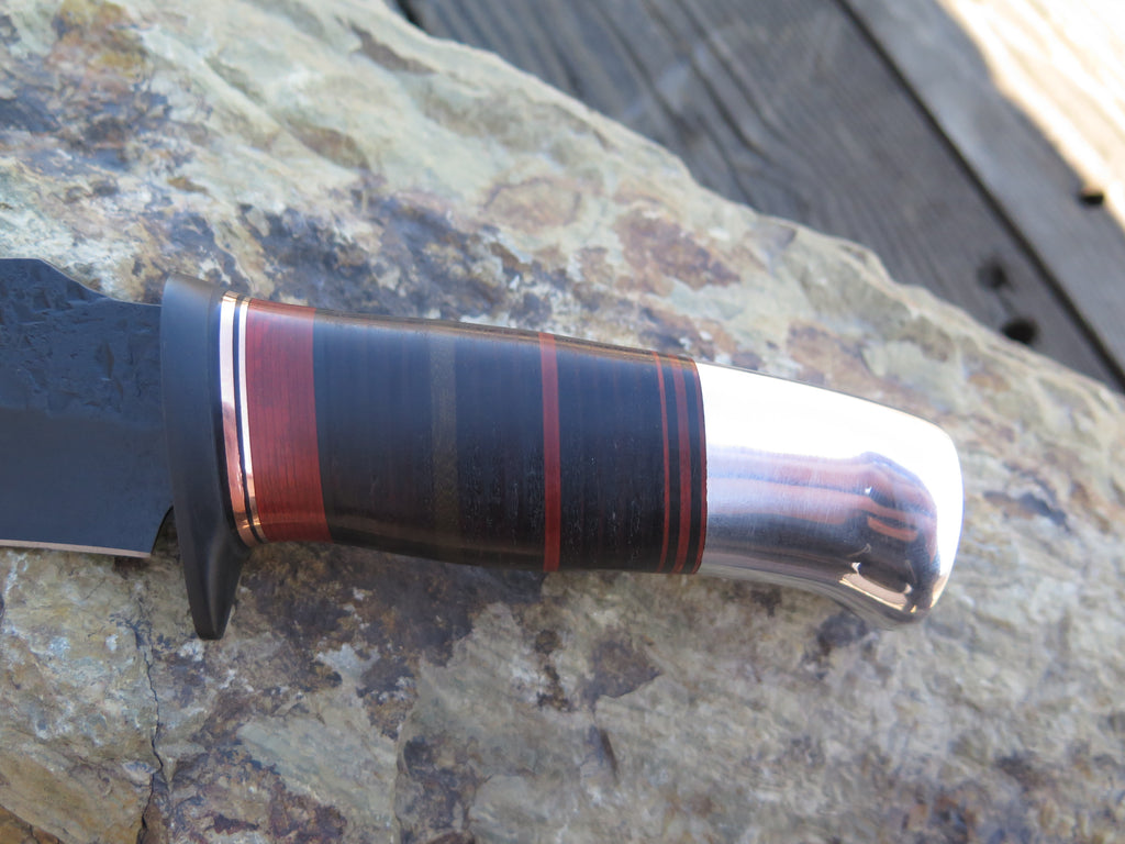 This new Scagel Tribute is hand forged from 13/64" thick 5160 spring steel and it measures 6" from tip to guard with a razor sharp hollow grind, hammermarks and our forced patina blued finish. The blued steel guard is soldered in place above black and maroon fiber, green micarta, copper and chocolate horsehide leather spacers as well as a big aluminum butt that's also pinned through the tang with aluminum. The overall length measures 10 5/8" and it will come in a custom leather sheath in the style of your choosing.