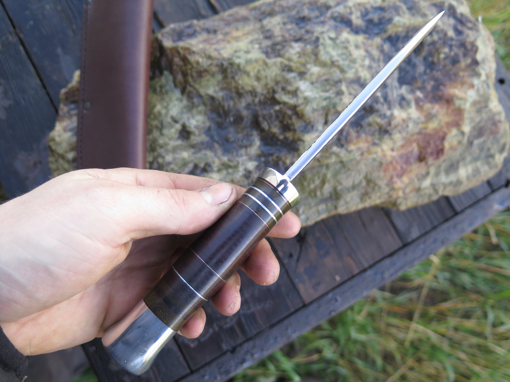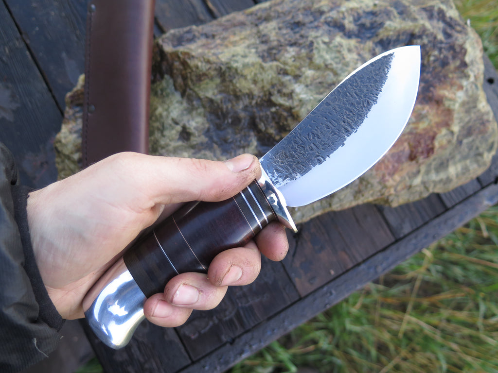 This ideal Nessmuk from Behring Made© is hand forged from 3/16" thick high carbon 01 tool steel and it measures 4 1/2" from tip to guard with a razor sharp hollow grind and our hammermark finish. The nickel silver guard is soldered in place above black fiber, green micarta, copper, aluminum and horsehide leather spacers in addition to an aluminum butt that's also pinned through the tang with aluminum. The overall length measures 9" and it comes in a Warlander Leather pouch sheath.