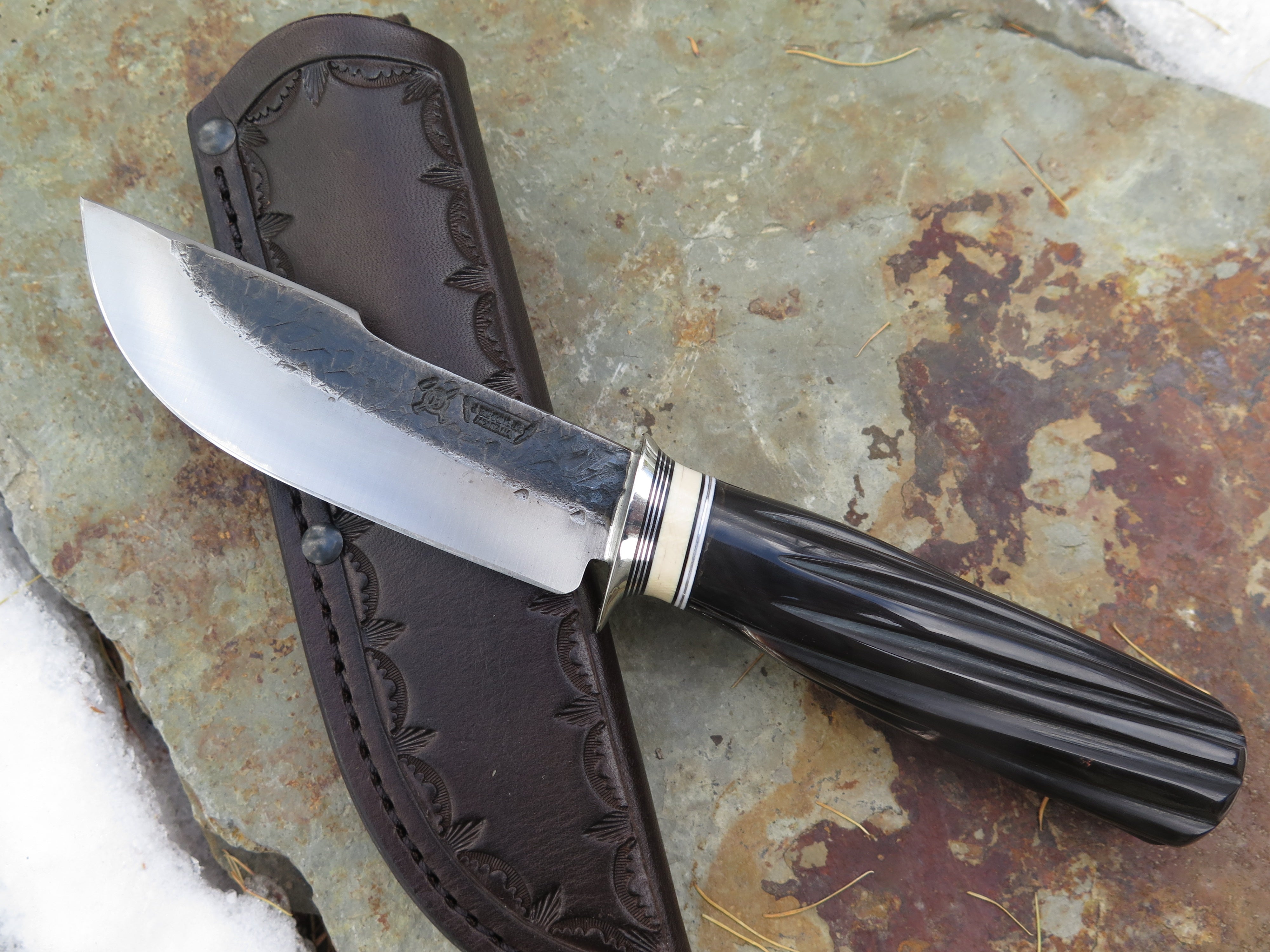 This beautiful new Woodcraft from Behring Made© is hand forged from 1/8" thick high carbon 01 tool steel and measures 4 1/2" from tip to guard with a razor sharp hollow grind and our hammermark finish. The nickel silver guard is soldered in place above black and white fiber, aluminum and ancient mammoth ivory spacers as well as a jigged African buffalo handle. The overall length measures 9" and it comes in the shown leather belt pouch sheath, though substitutions are available upon request.