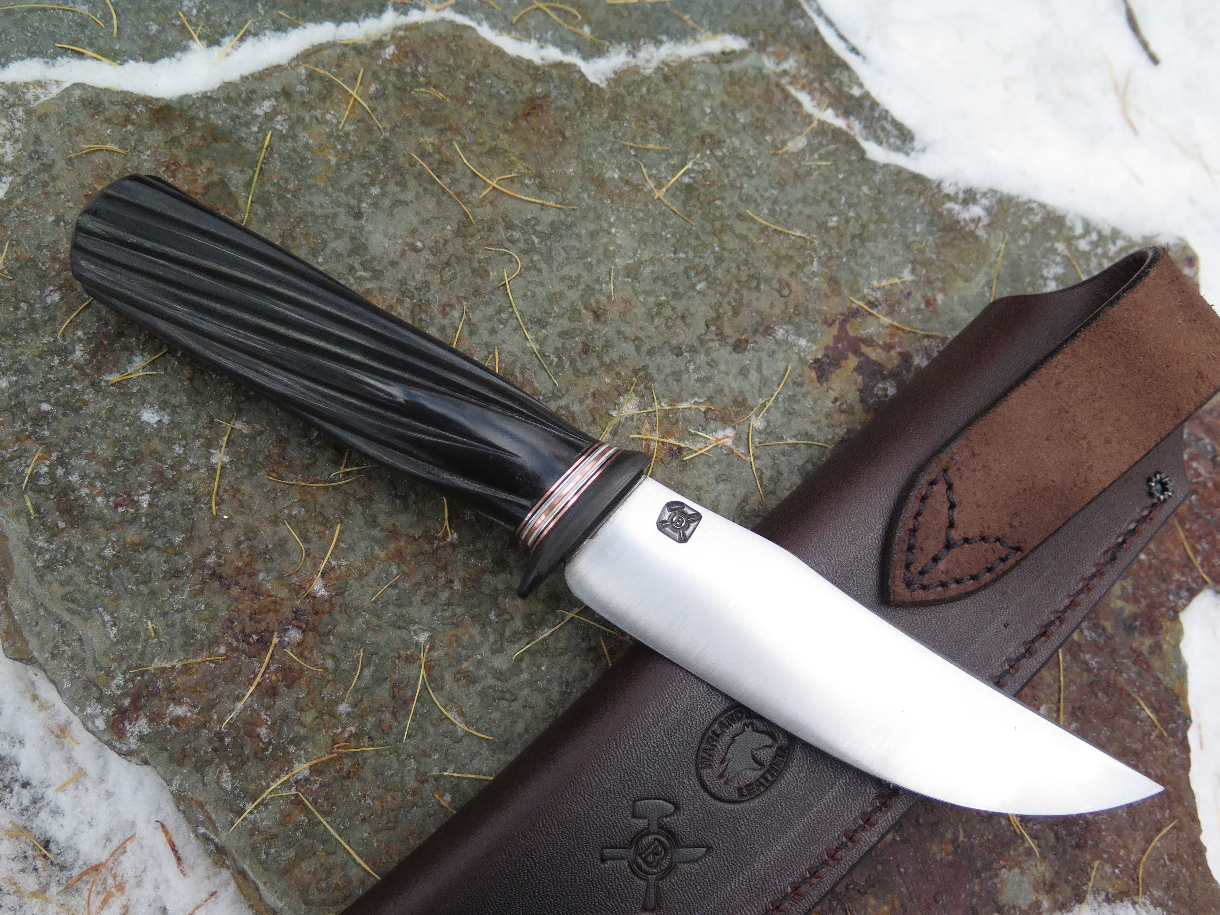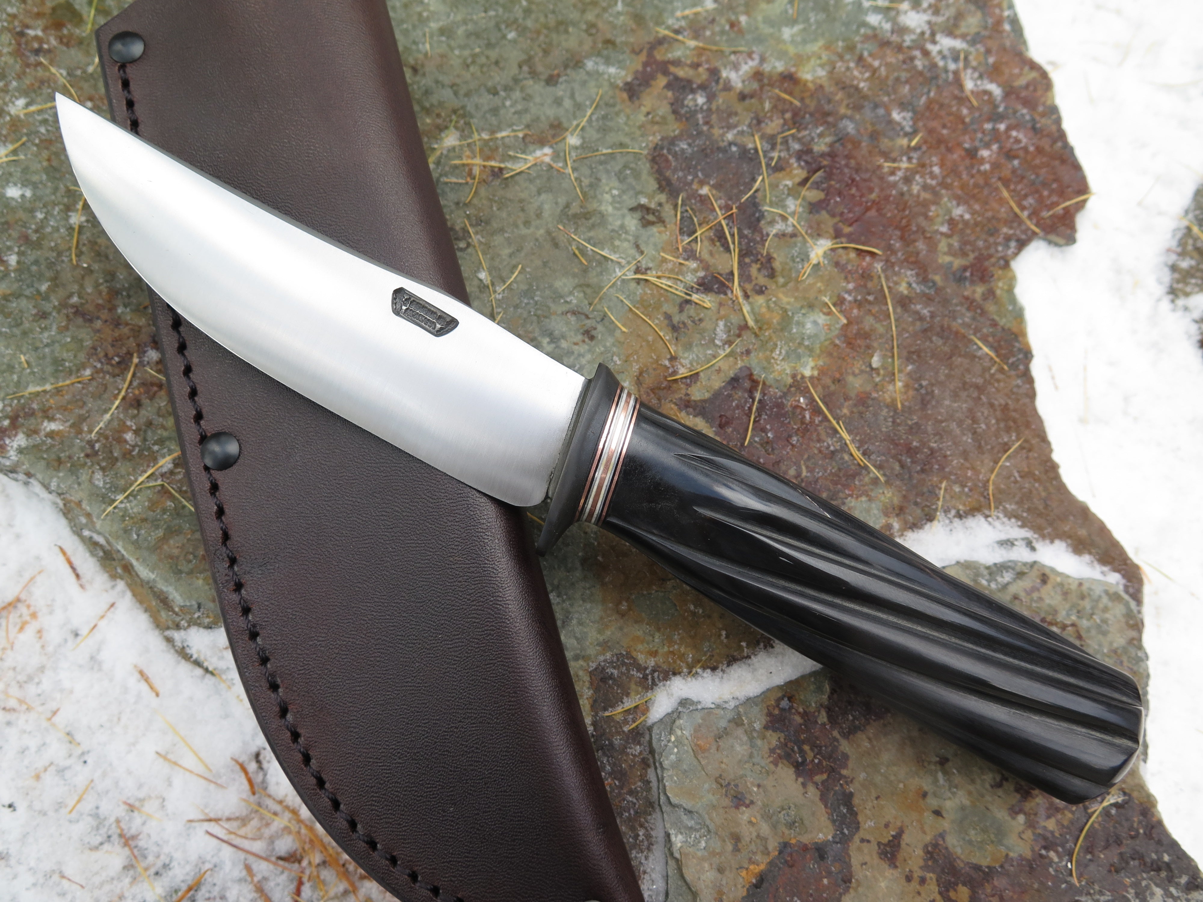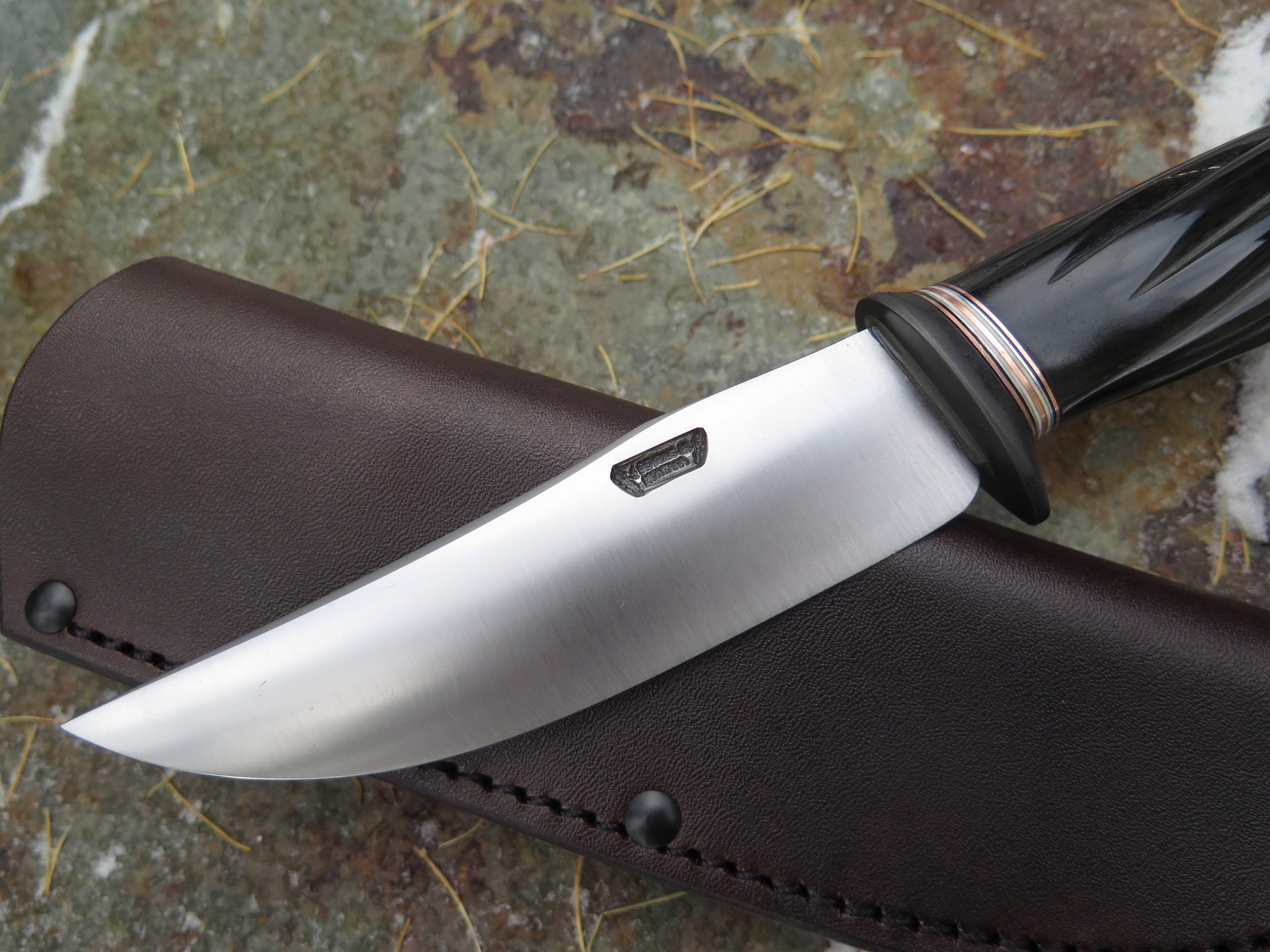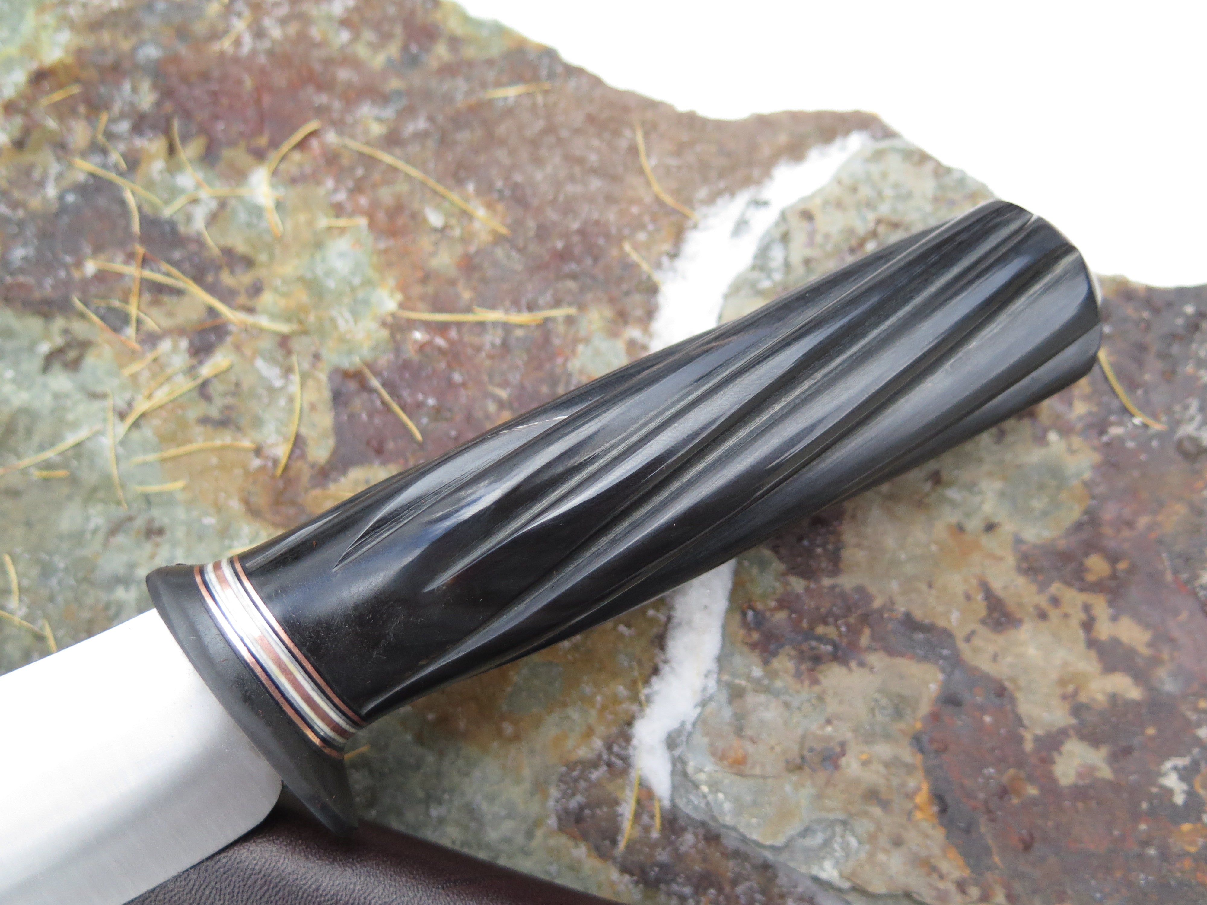 This beautiful new Hunter from Behring Made© is hand forged from 3/16" thick high carbon 01 tool steel and measures 5" from tip to guard with a razor sharp convex grind. The blued steel guard is soldered in place above black and white, aluminum and copper spacers as well as a jigged buffalo handle that feels incredible in the hand! The overall length measures just over 10" and it comes in the shown leather belt pouch sheath, though substitutions are available upon request.
