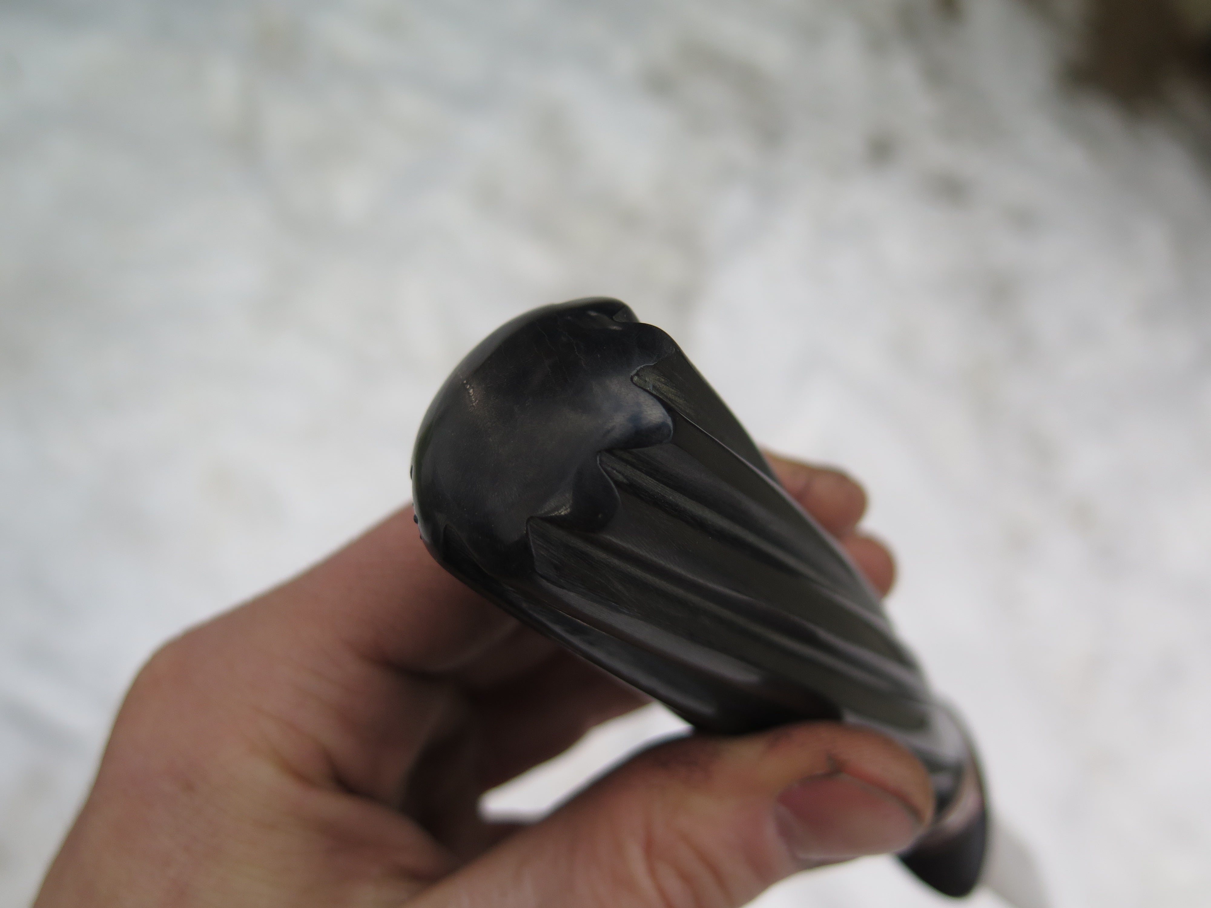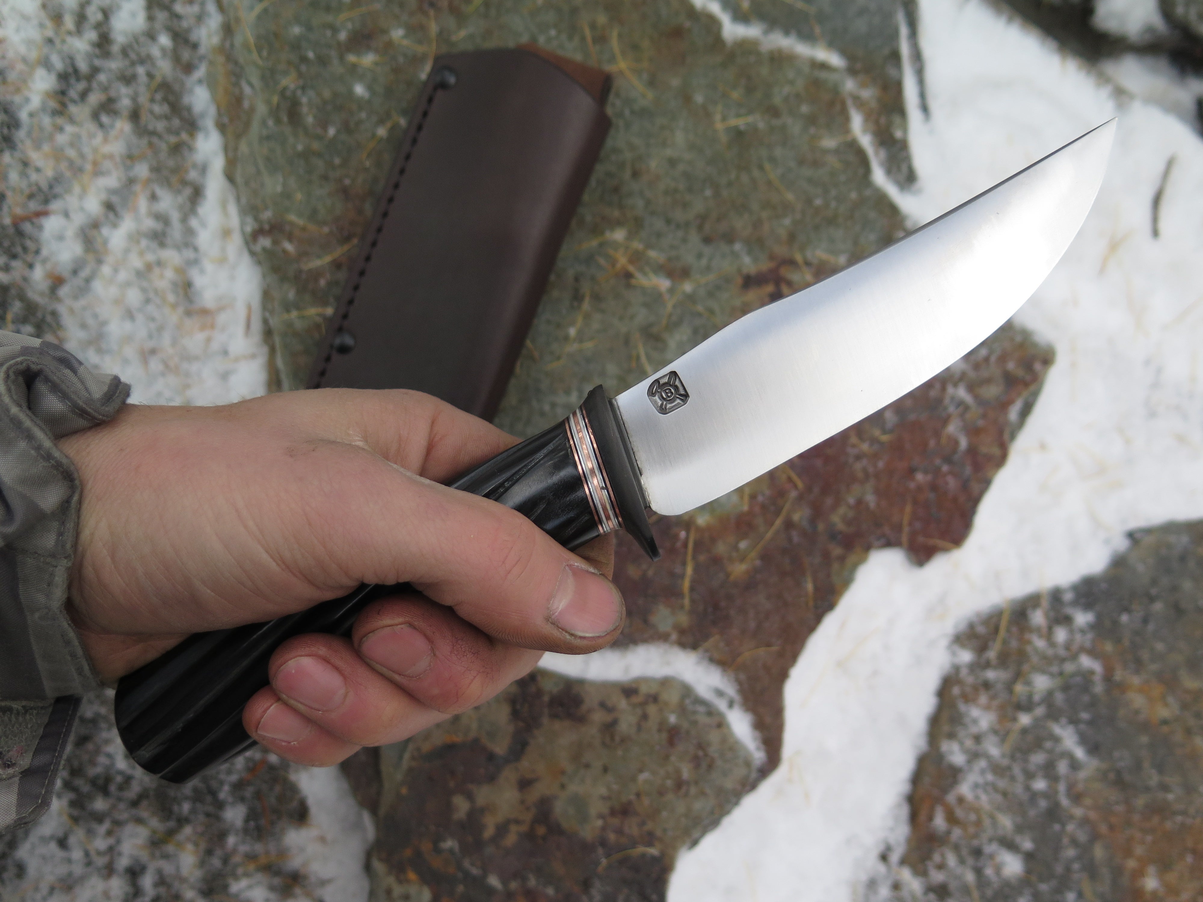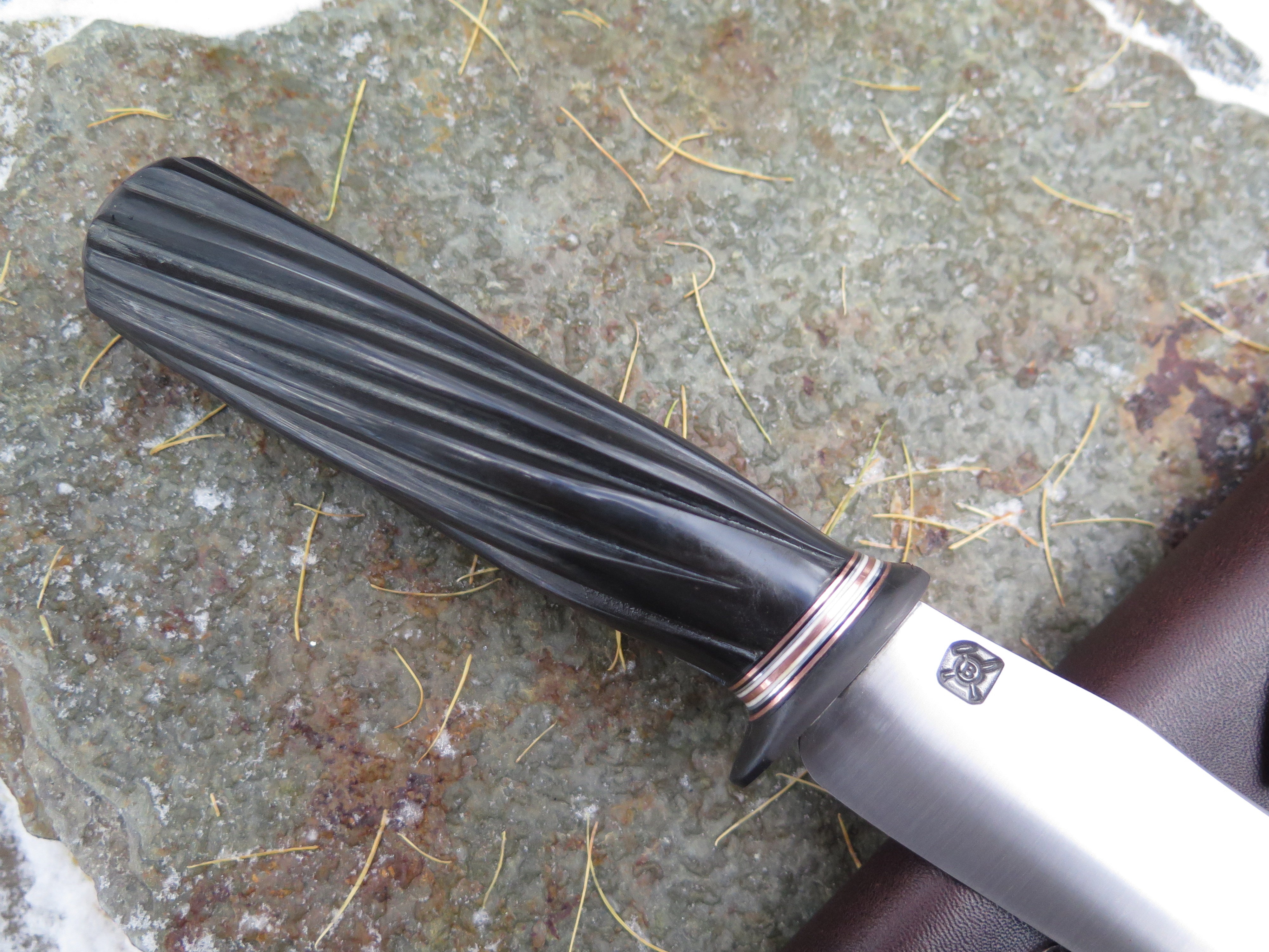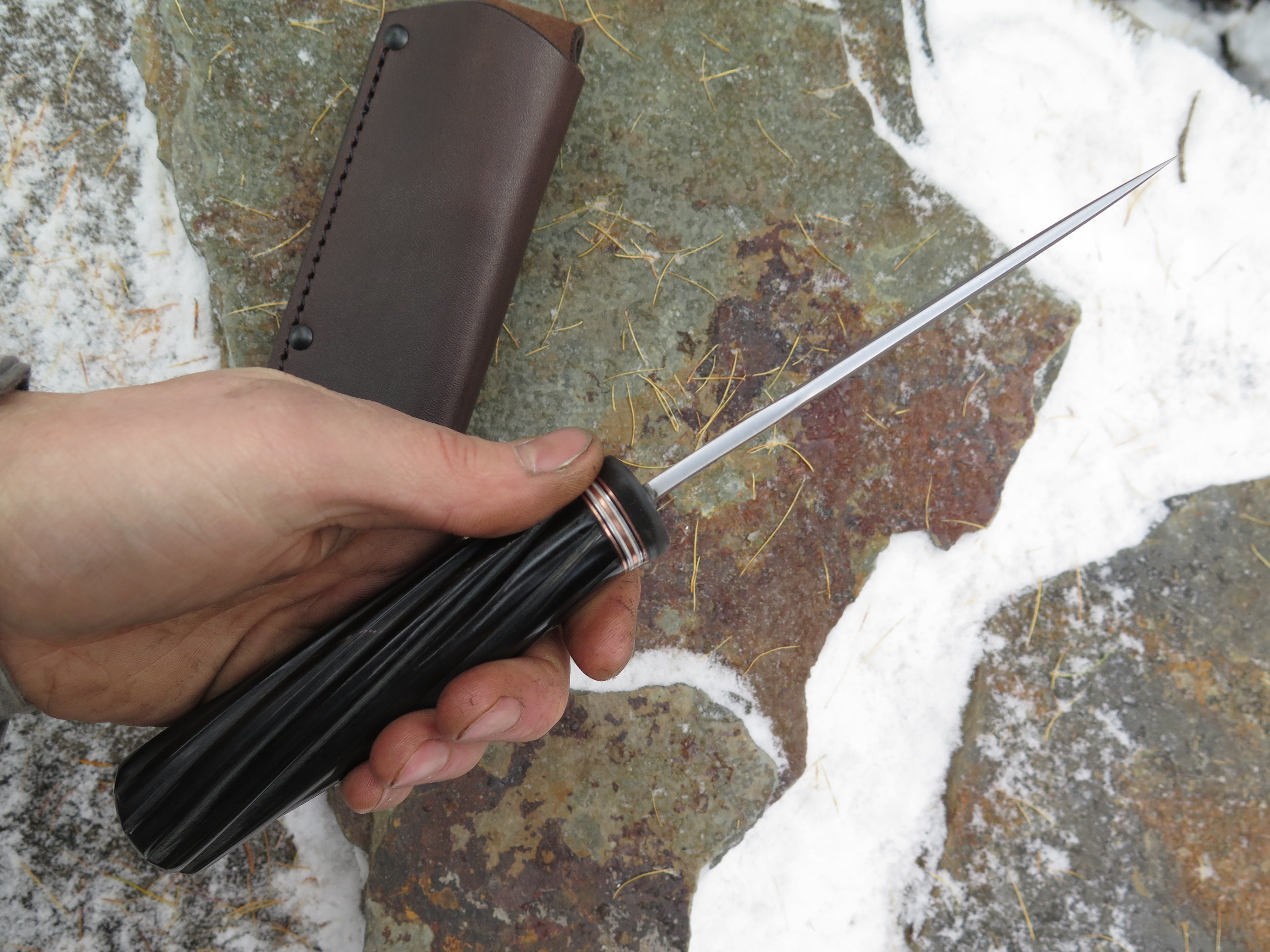 This beautiful new Hunter from Behring Made© is hand forged from 3/16" thick high carbon 01 tool steel and measures 5" from tip to guard with a razor sharp convex grind. The blued steel guard is soldered in place above black and white, aluminum and copper spacers as well as a jigged buffalo handle that feels incredible in the hand! The overall length measures just over 10" and it comes in the shown leather belt pouch sheath, though substitutions are available upon request.