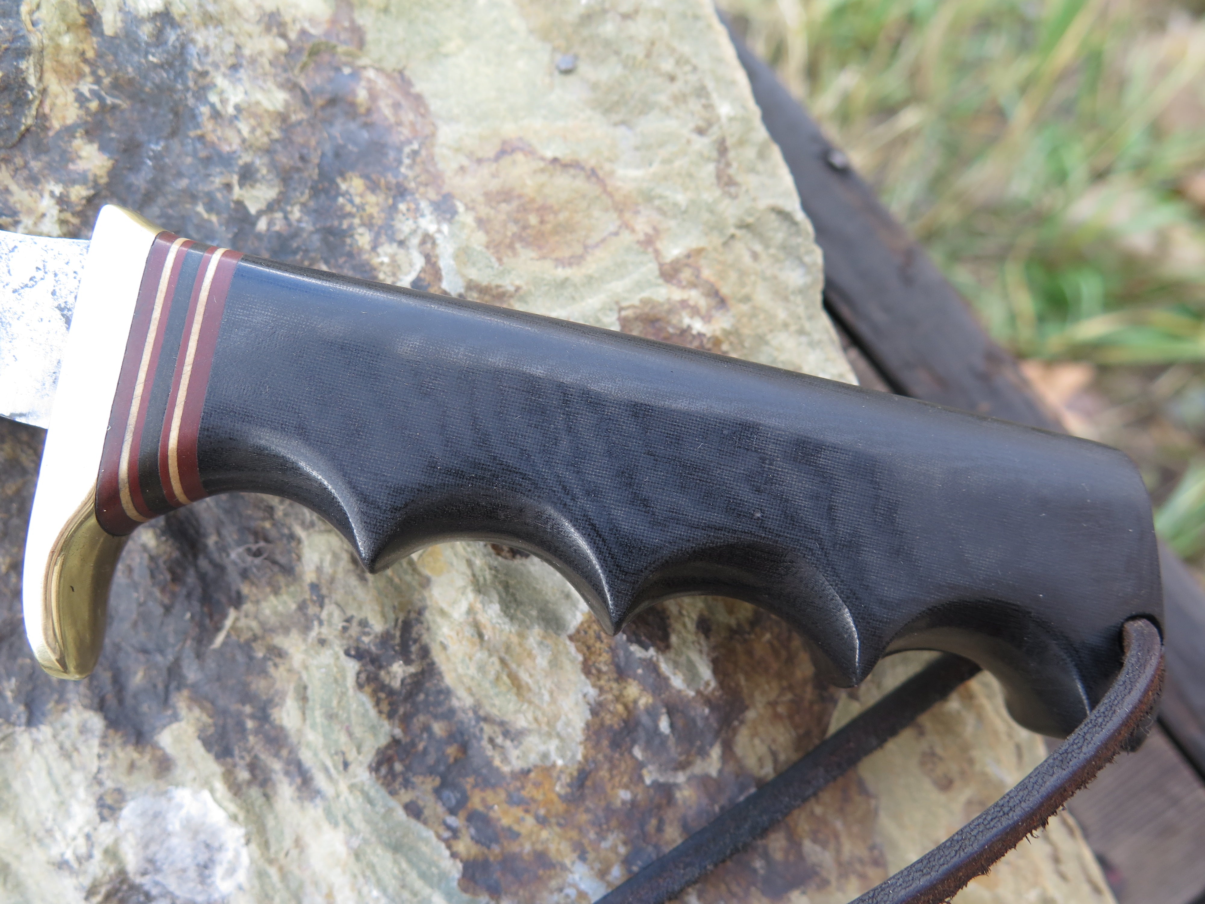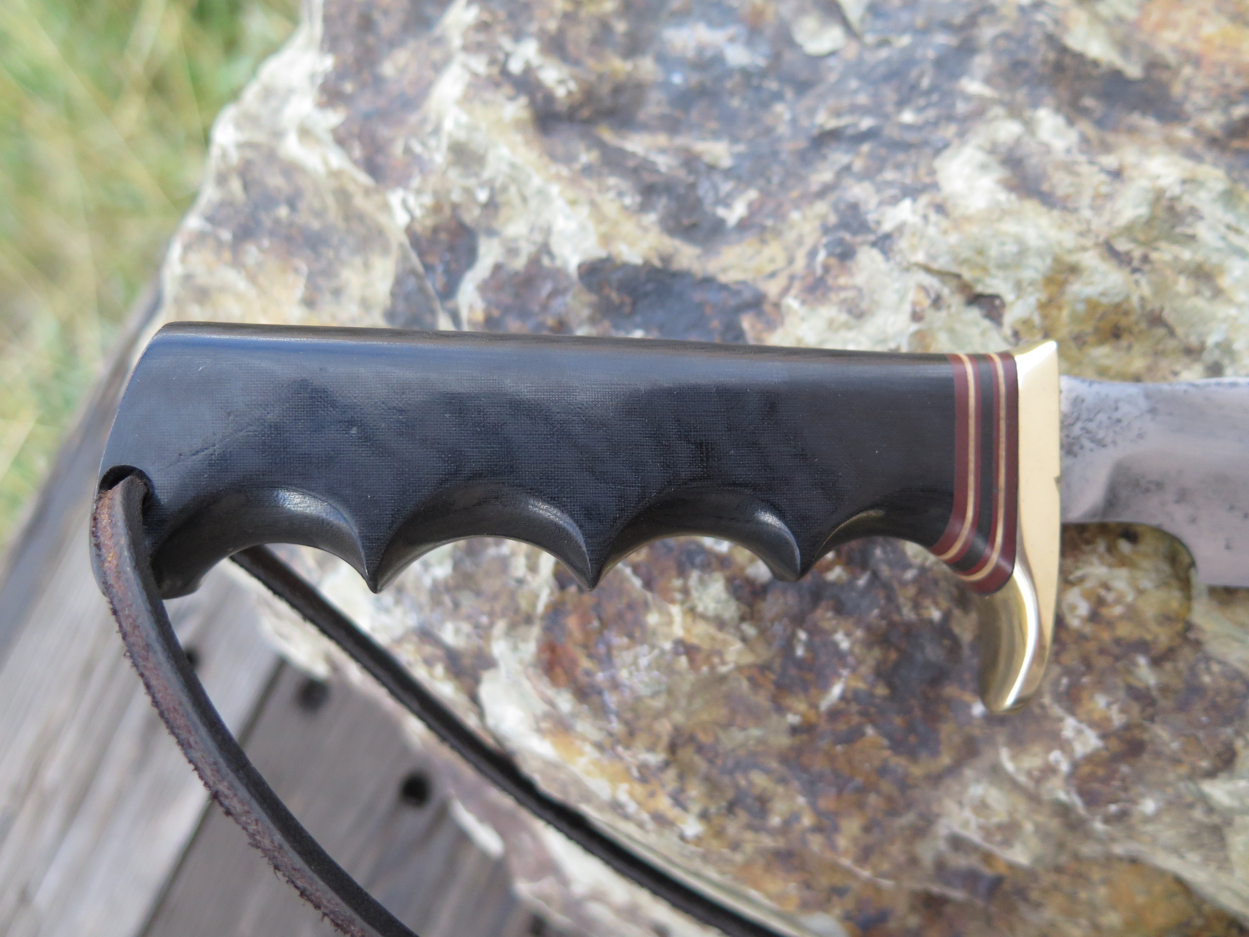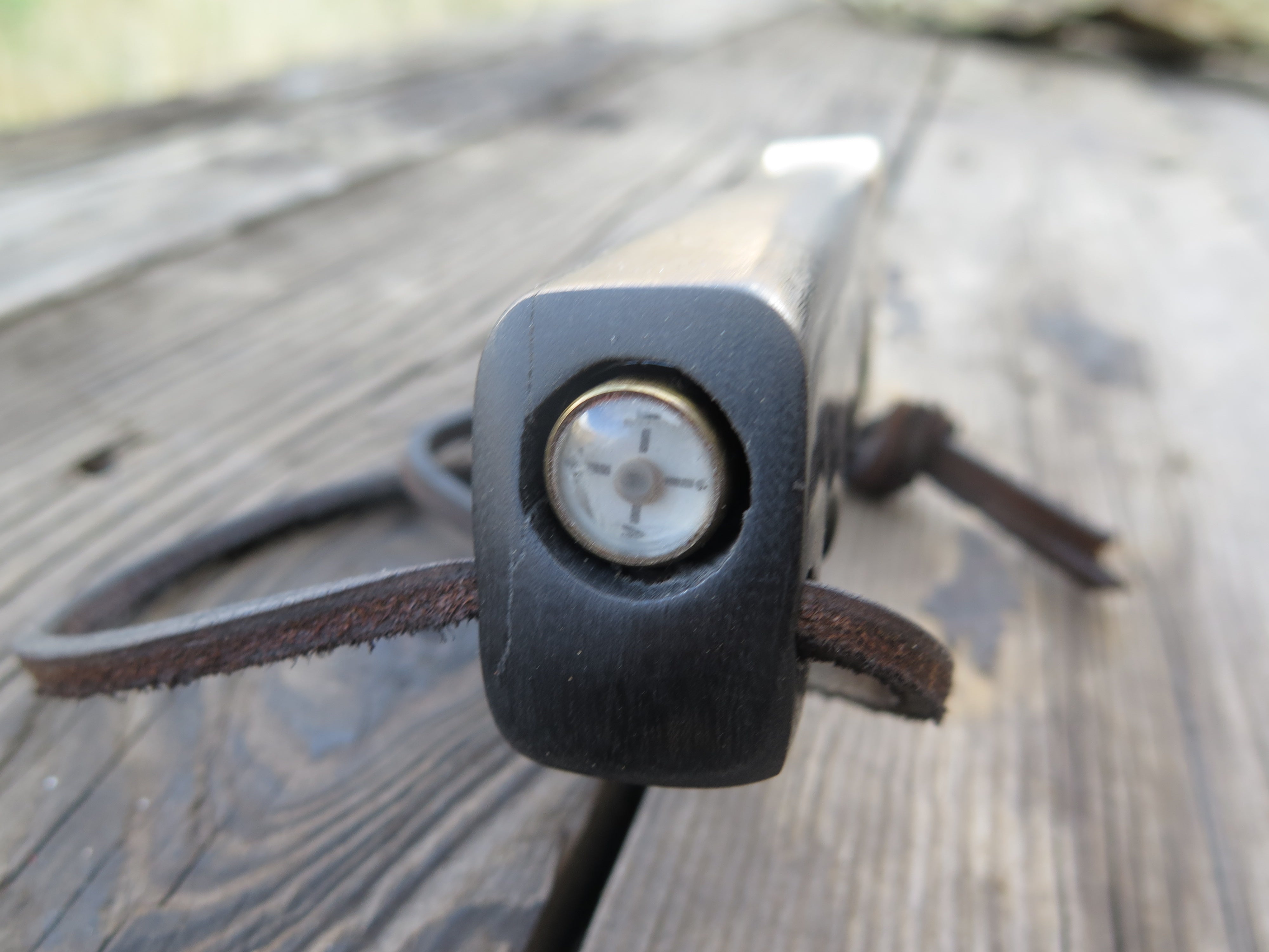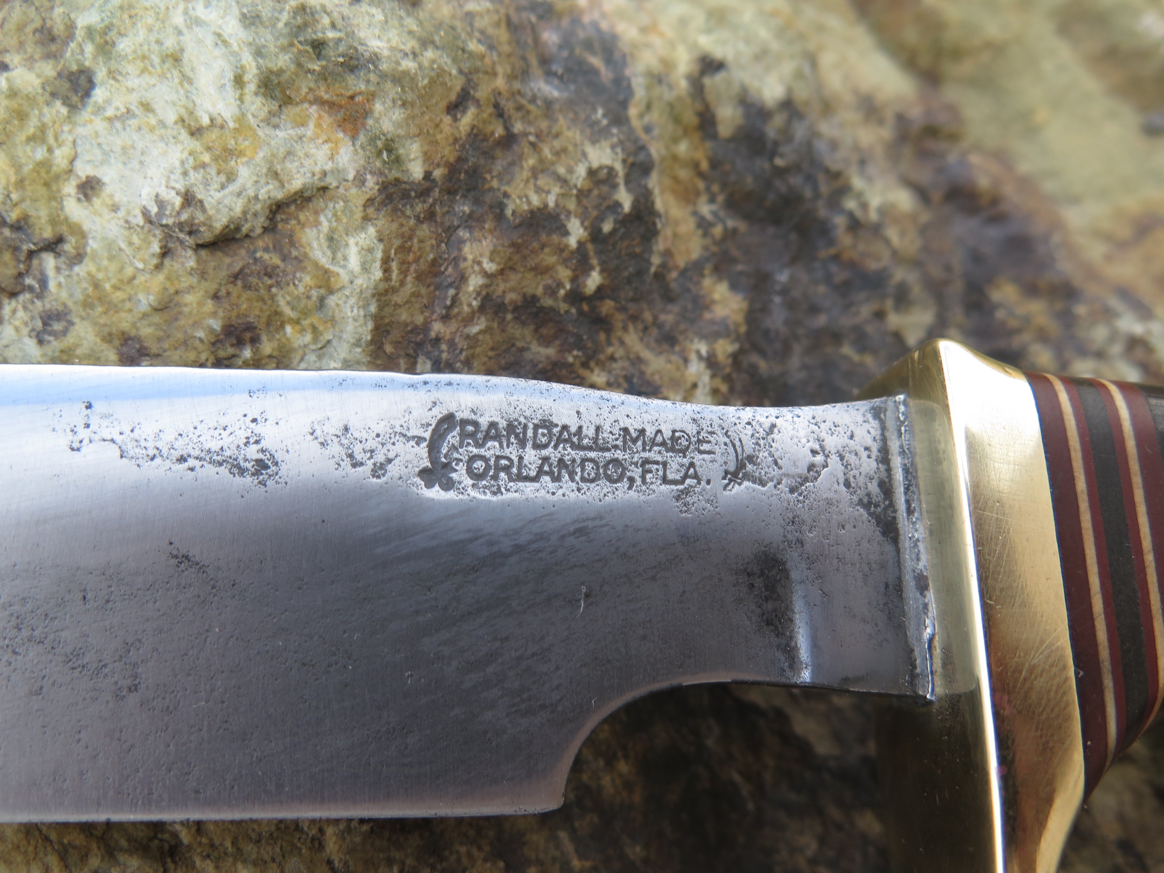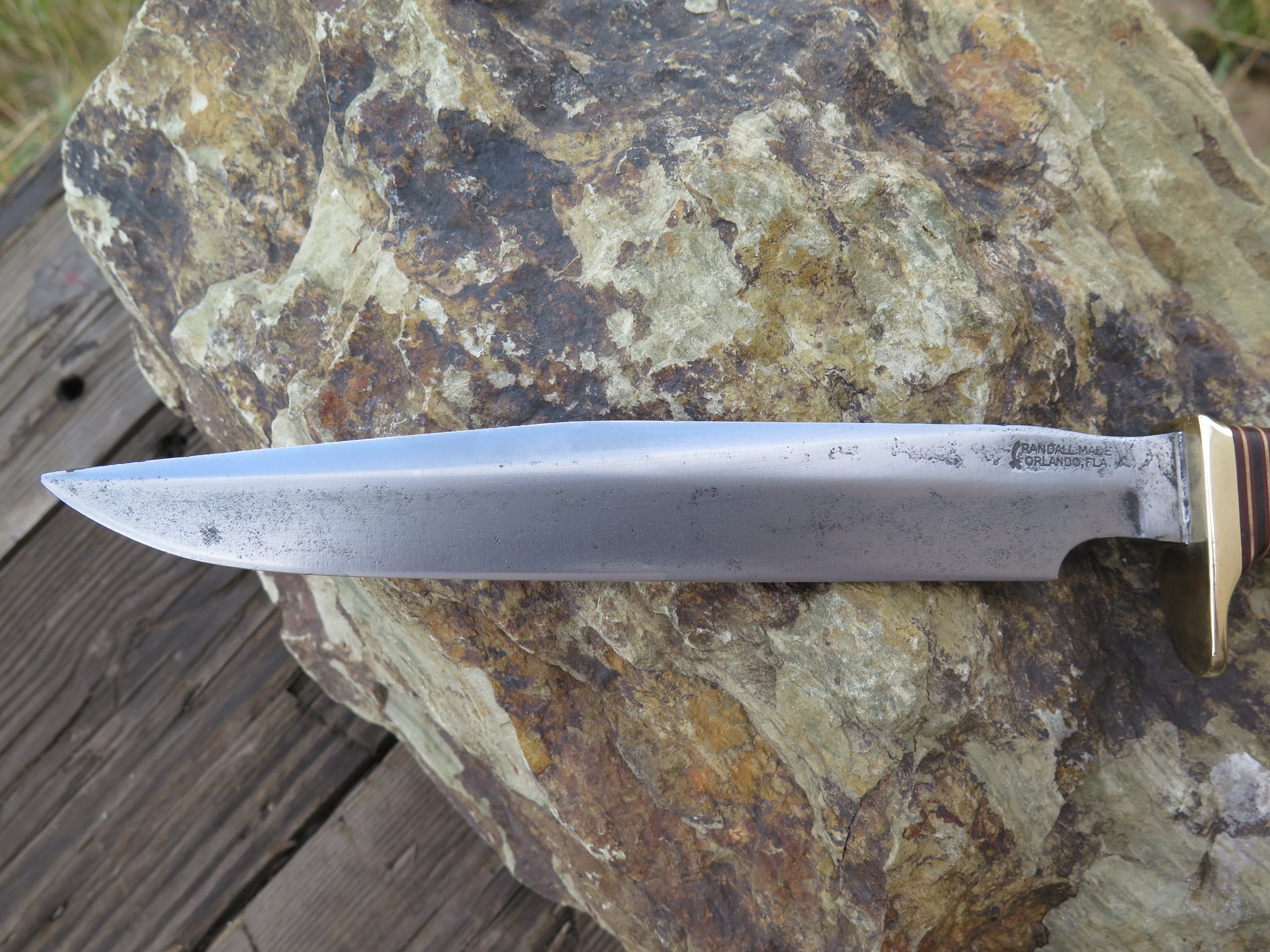 This is a fun one, and pretty rare too. A gentleman offered us a "rough shape" Randall Knives model 1-8 in trade that was in much need of some TLC- it must have seen some hell in Vietnam ( it was made between 1964-1972), but our clean up yielded a nice revival. The blade is hand forged high carbon 01 tool steel and it measures 8" from tip to guard with a nice sharp hollow grind. It does appear that the tip has been slightly modified, and Randall confirmed that this had not been done in-house. The flat-top brass guard is soldered in place above the classic 7 spacer variant as well as a finger grip green micarta handle that also features an unlined thonghole. At some point down the line, someone drilled out the original compass, but we sourced an era appropriate RMK compass and set it in place. Overall length measures just over 12", and unfortunately this one does not come with a sheath.
