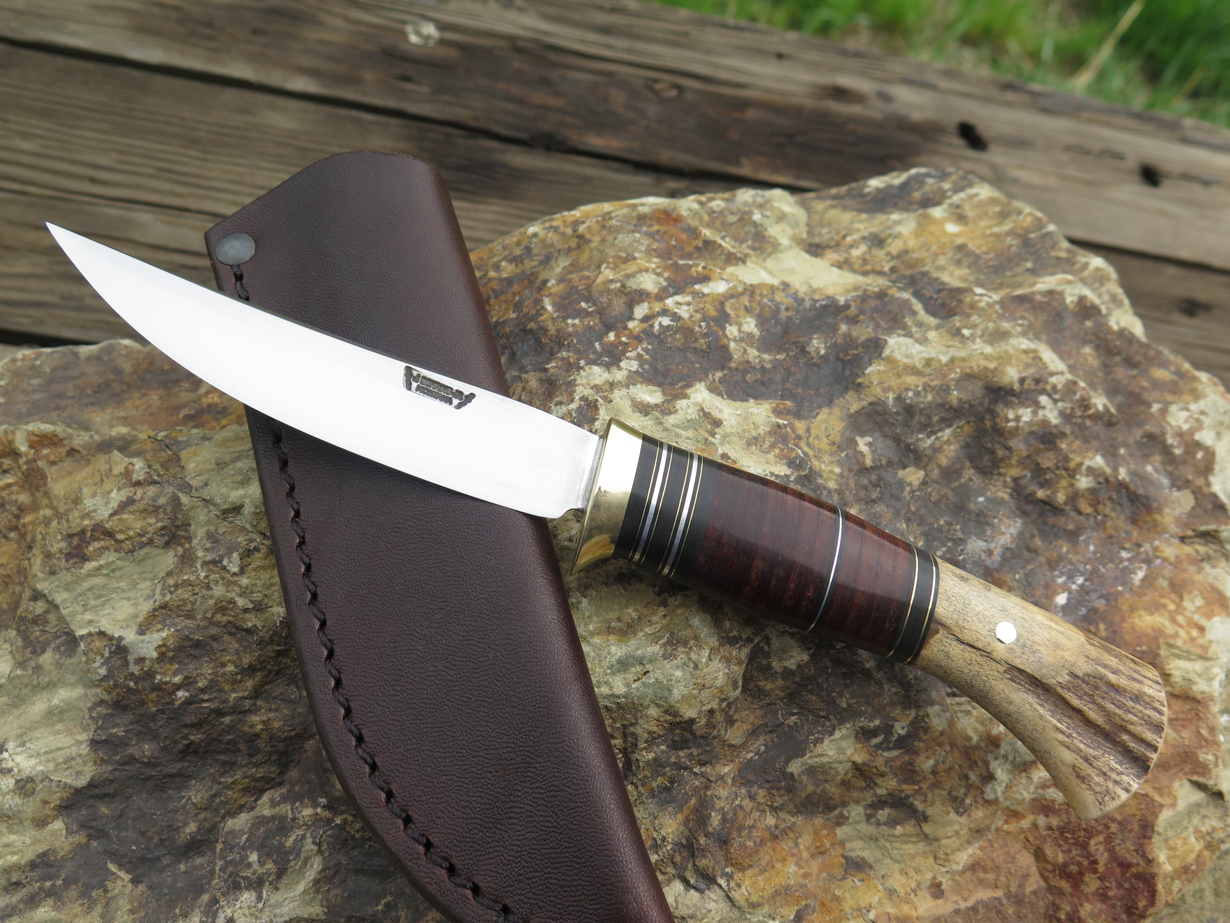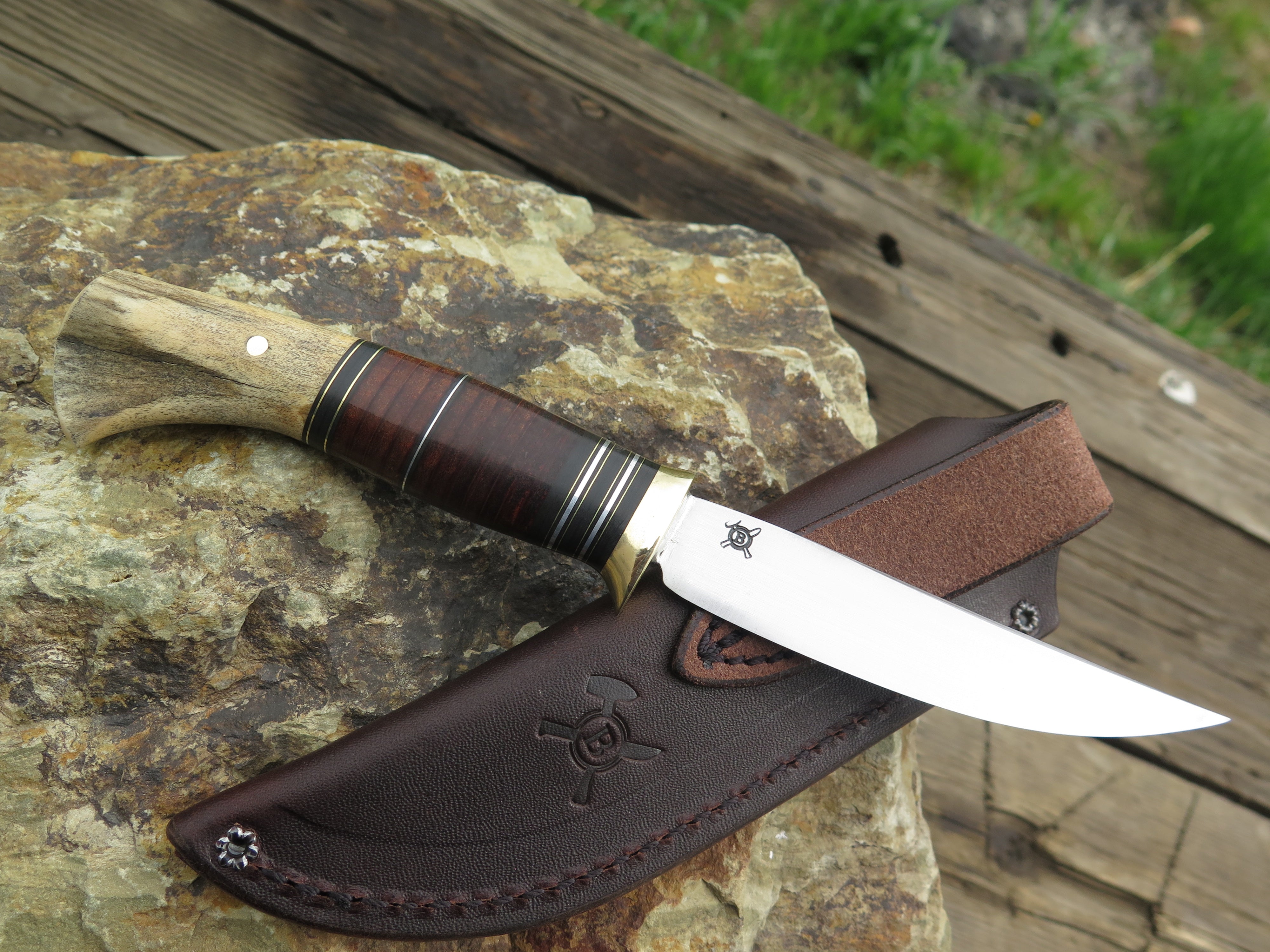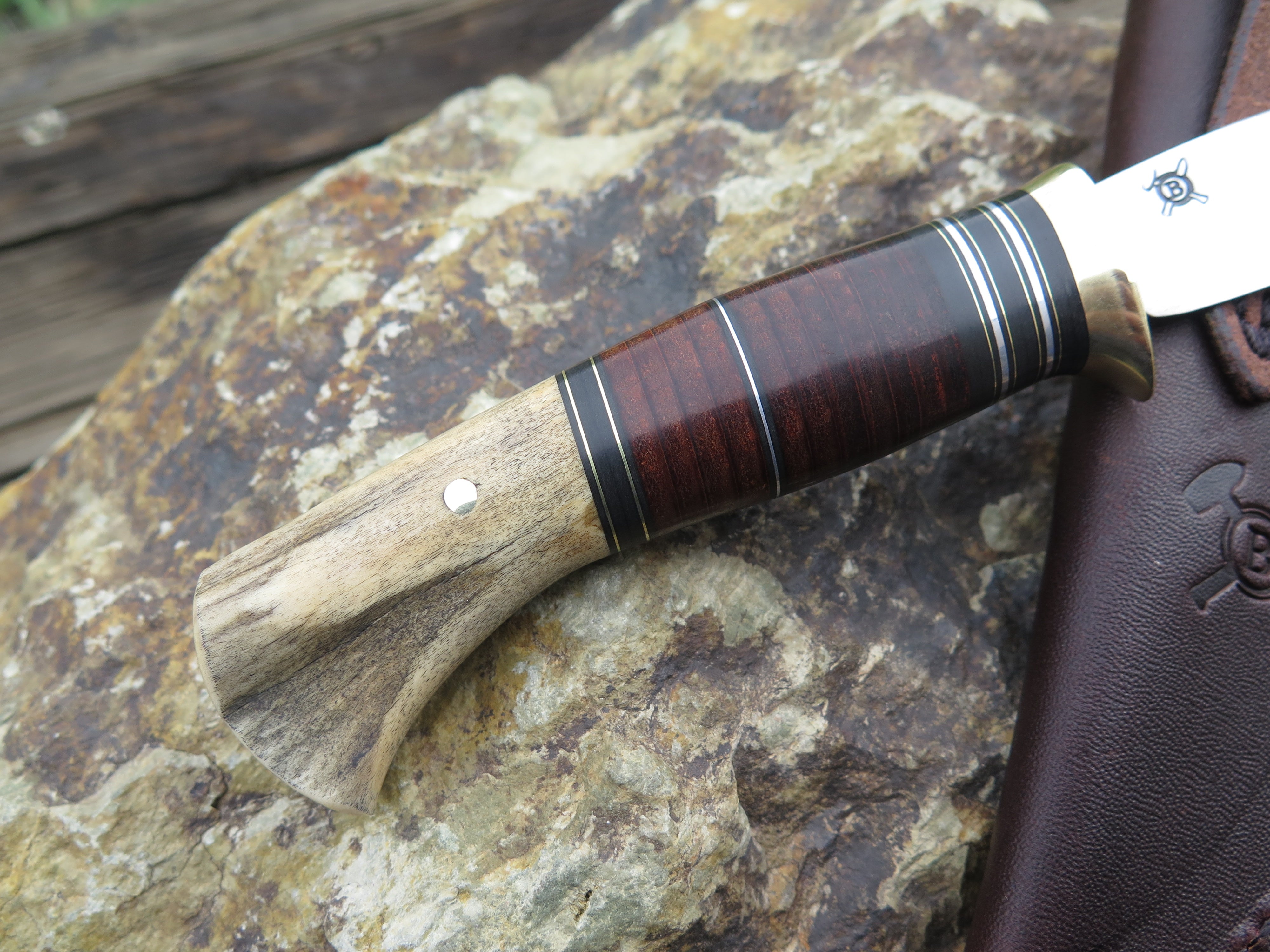This beautiful new Pintail from Behring Made© is hand forged from 1/8" thick high carbon 01 tool steel and it measures 3 3/4" from tip to guard with a razor sharp convex grind. The brass guard is soldered in place above black, brass, aluminum and horsehide leather spacers. The butt is made from a moose paddle and we've pinned it through the tang with brass. The overall length measures just over 7 3/4" and it comes in a classic belt pouch sheath.
