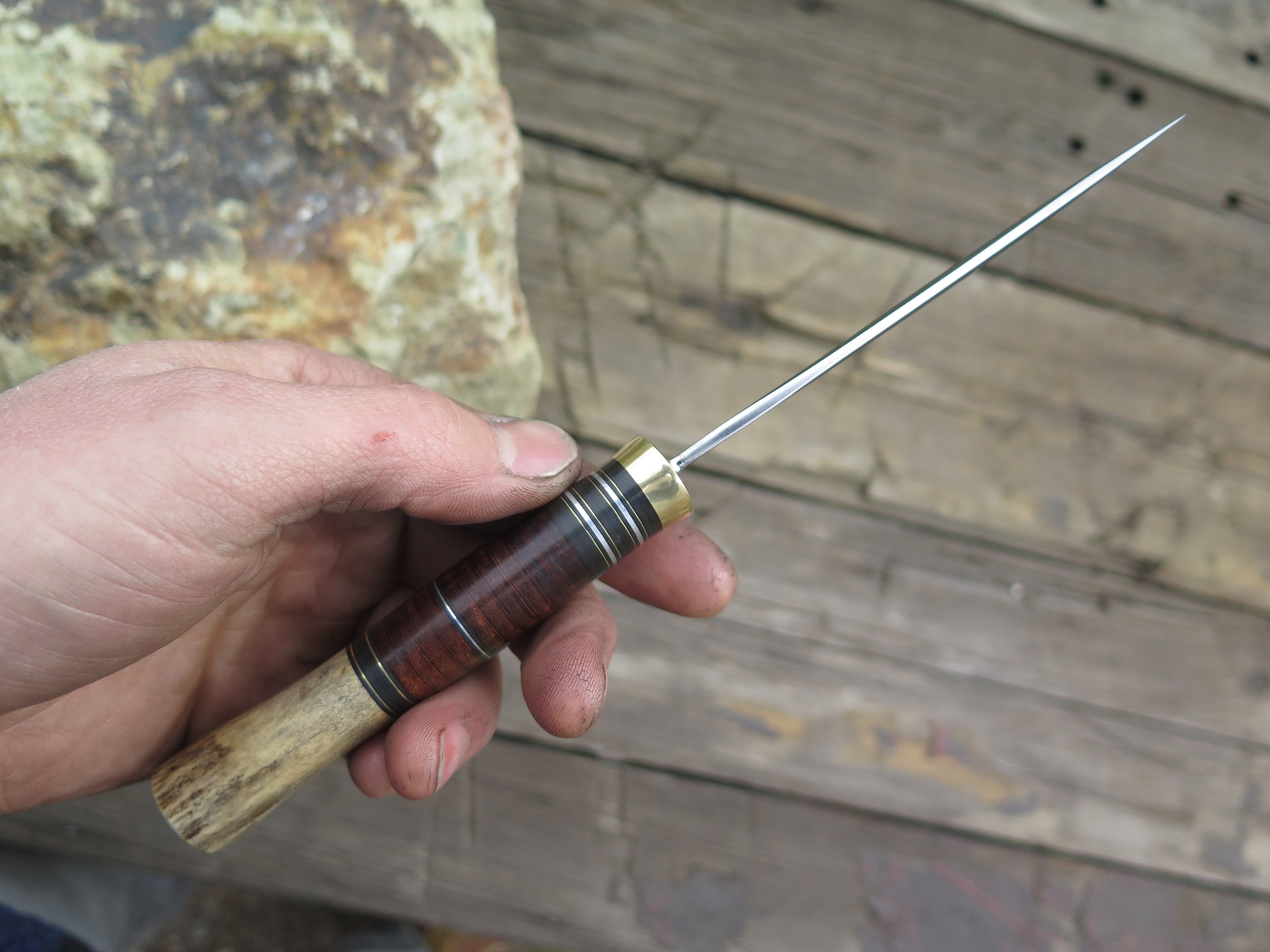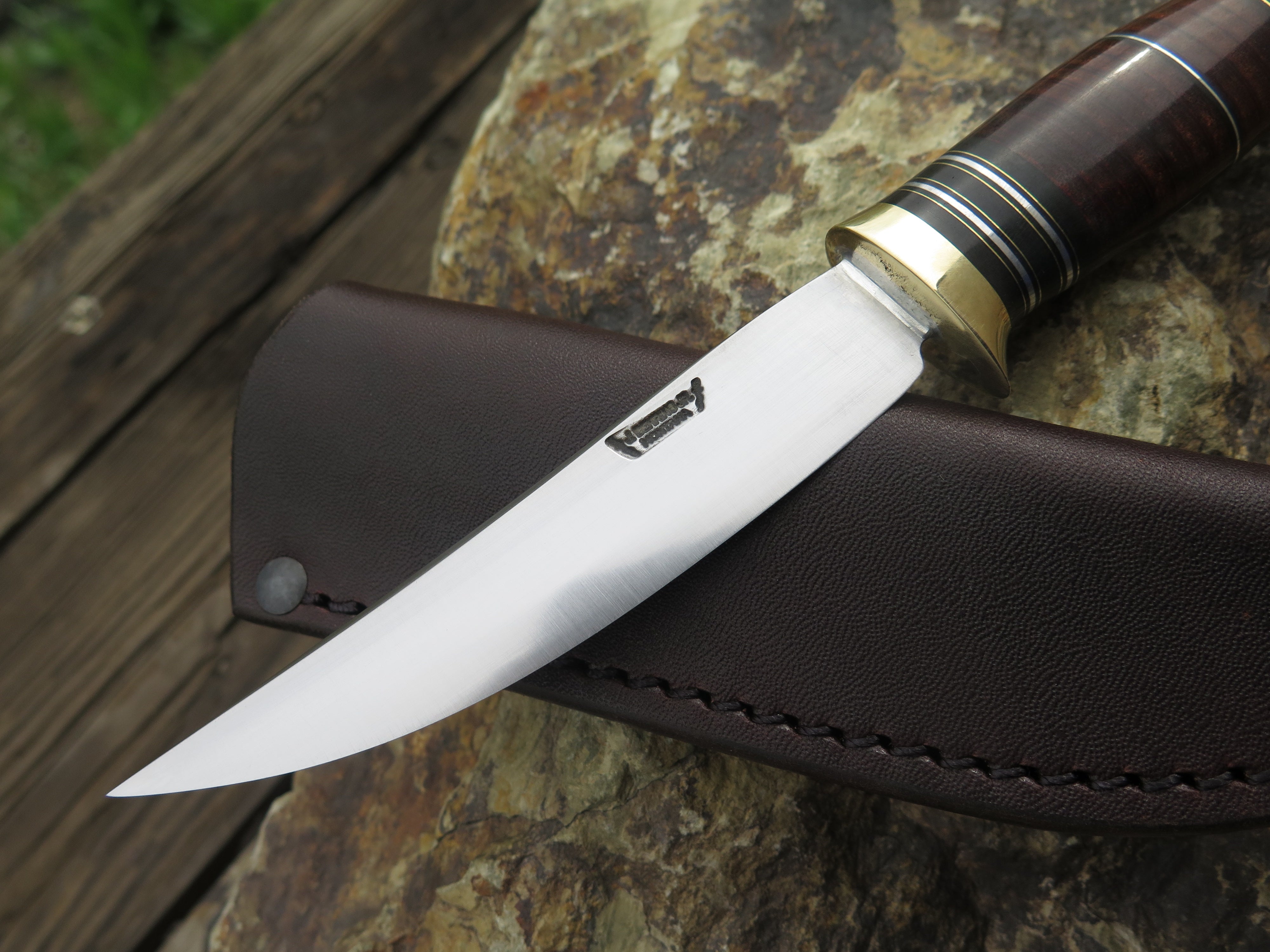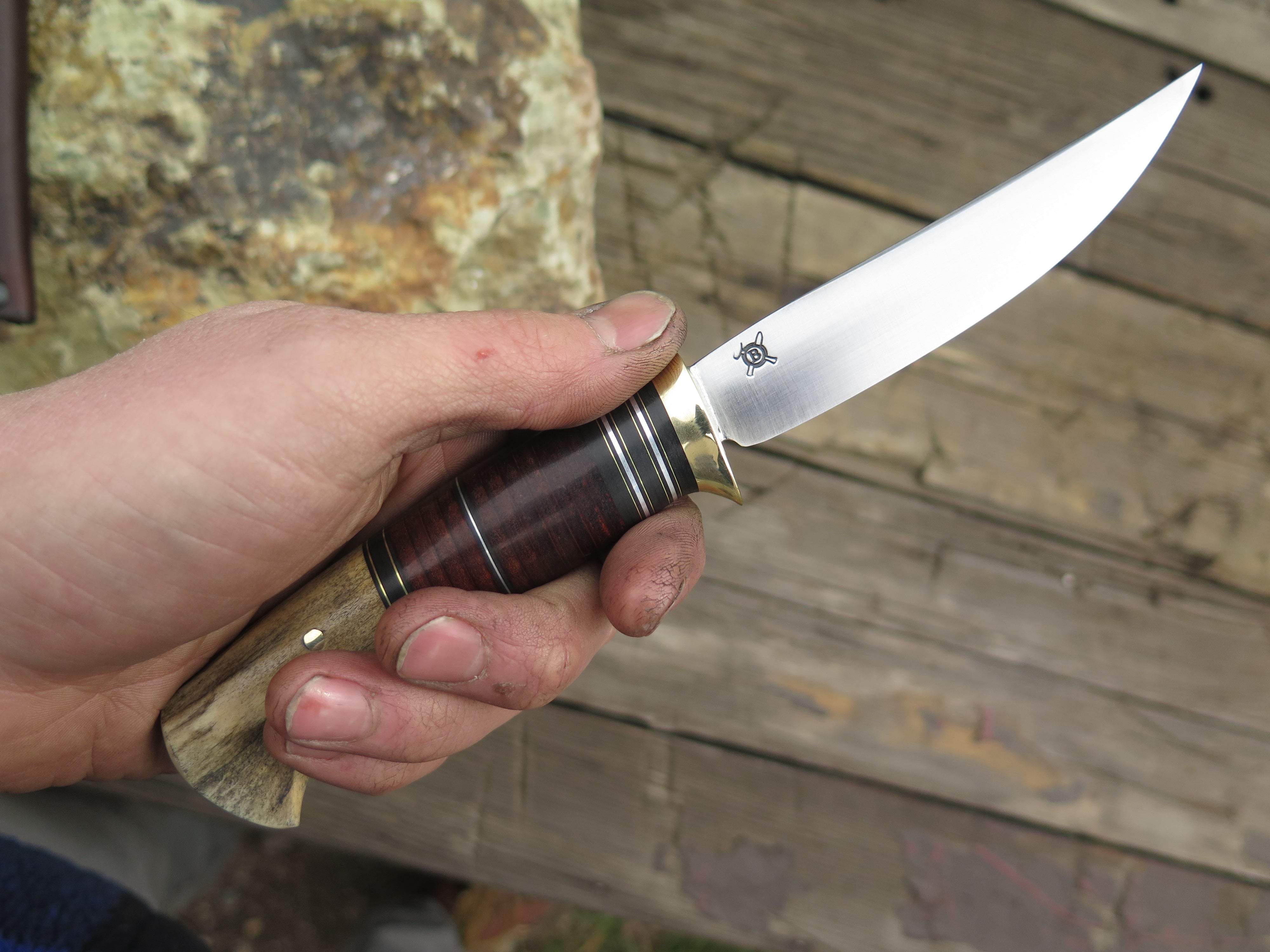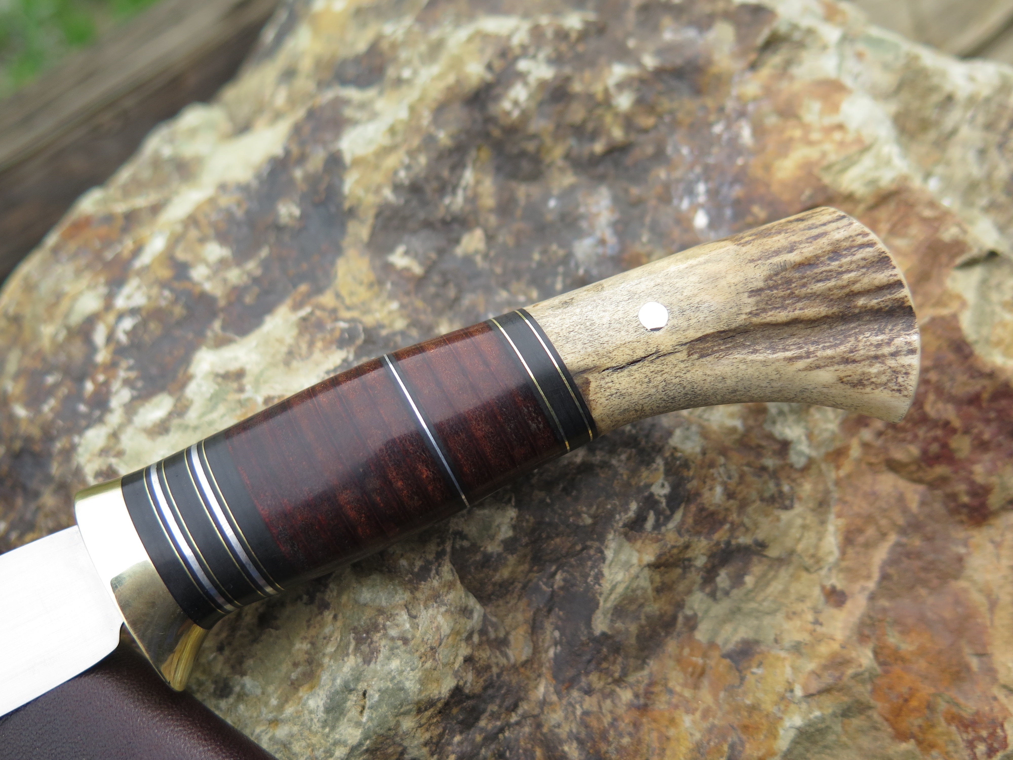 This beautiful new Pintail from Behring Made© is hand forged from 1/8" thick high carbon 01 tool steel and it measures 3 3/4" from tip to guard with a razor sharp convex grind. The brass guard is soldered in place above black, brass, aluminum and horsehide leather spacers. The butt is made from a moose paddle and we've pinned it through the tang with brass. The overall length measures just over 7 3/4" and it comes in a classic belt pouch sheath.
